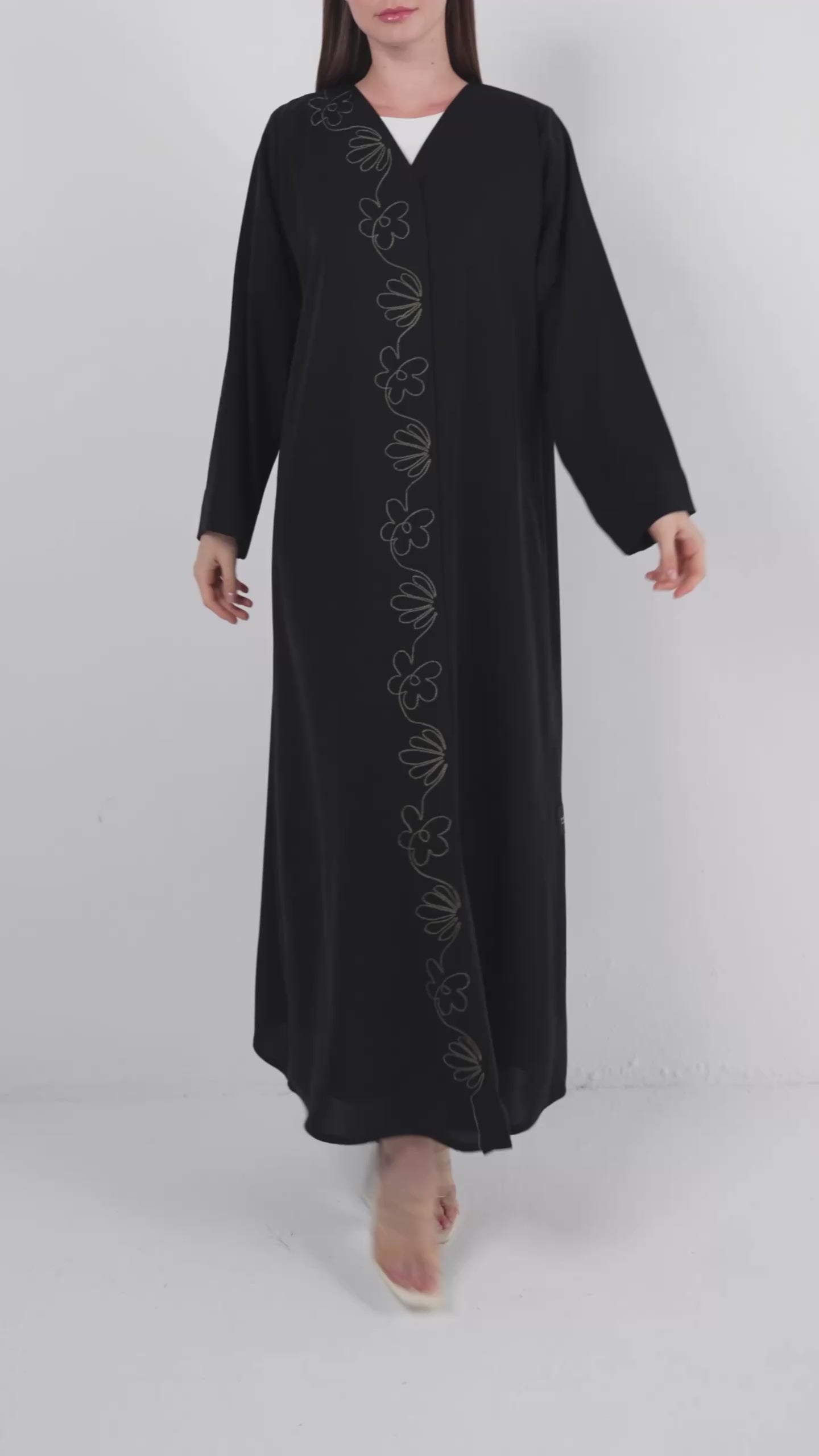 عباية فراشة كريب سوداء بتطريز خطي زهري من الأمام