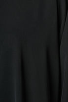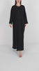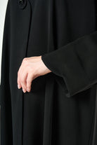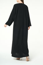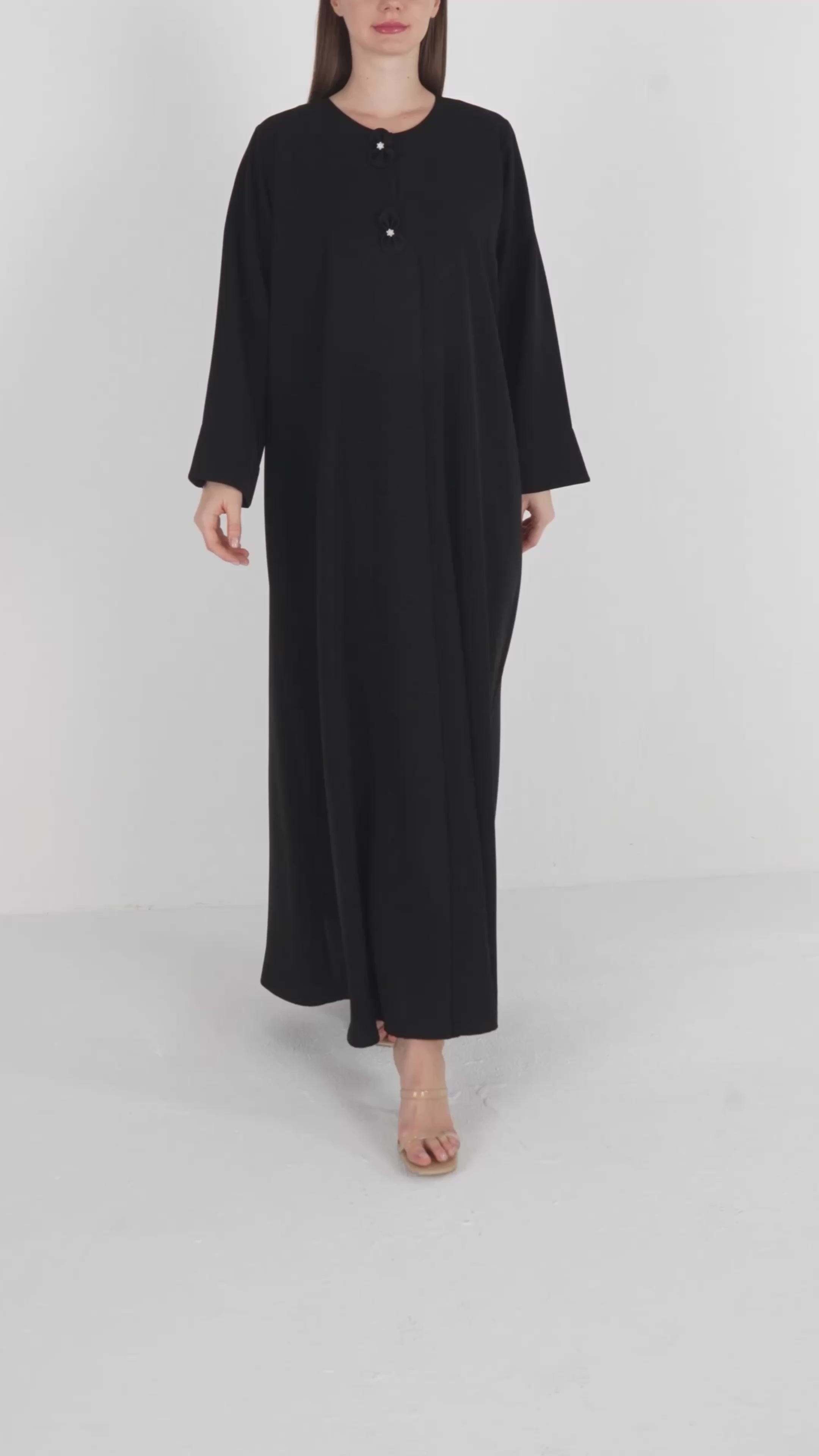 A versatile black abaya tailored in Reya Crepe, shaped into a flowing KLOSH silhouette for all-day ease. The neckline is finished with a clean round cut and a concealed snap placket, complemented by decorative bow-shaped buttons along the upper front. These subtle accents add feminine charm without overpowering the minimalist structure.