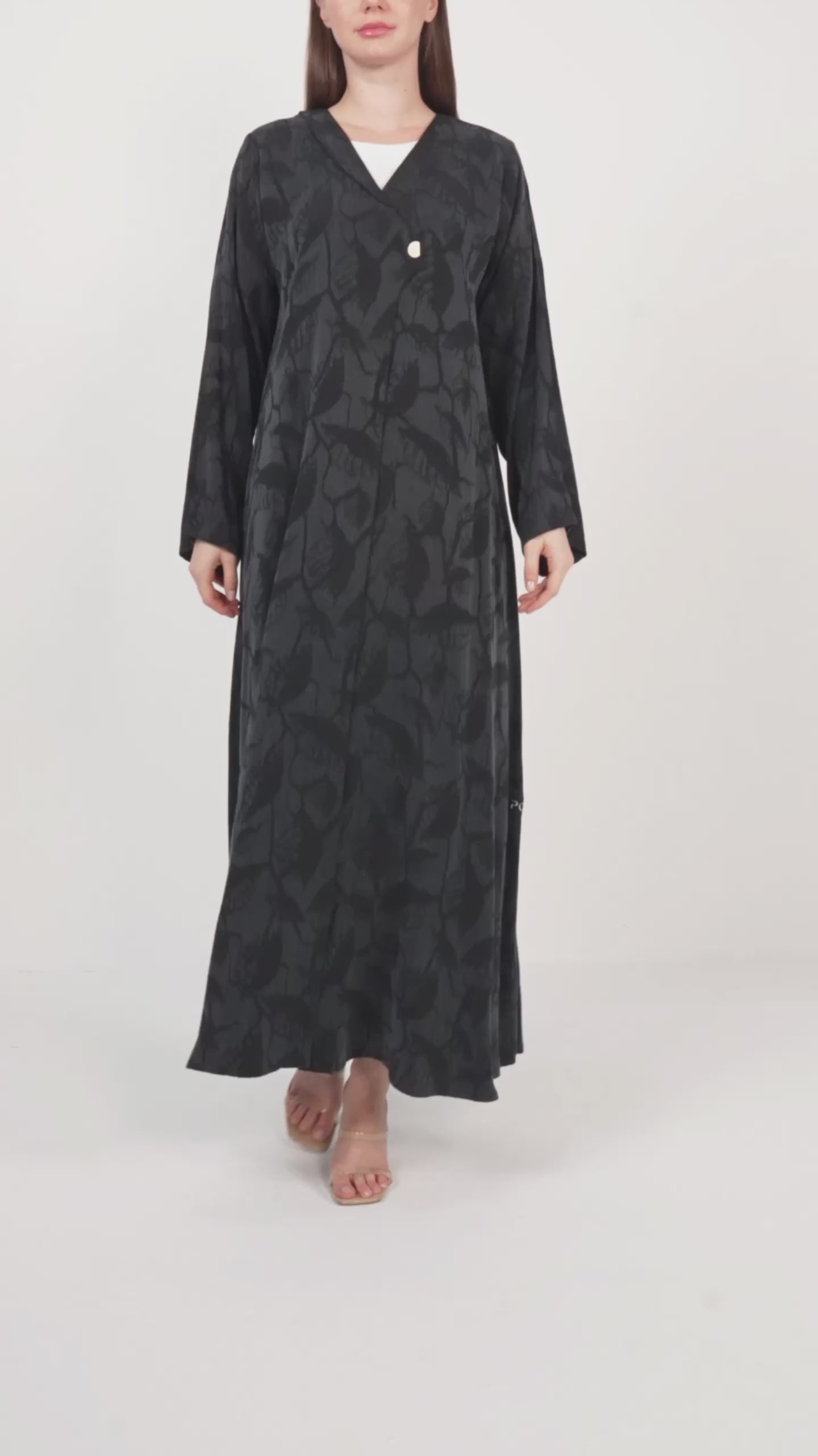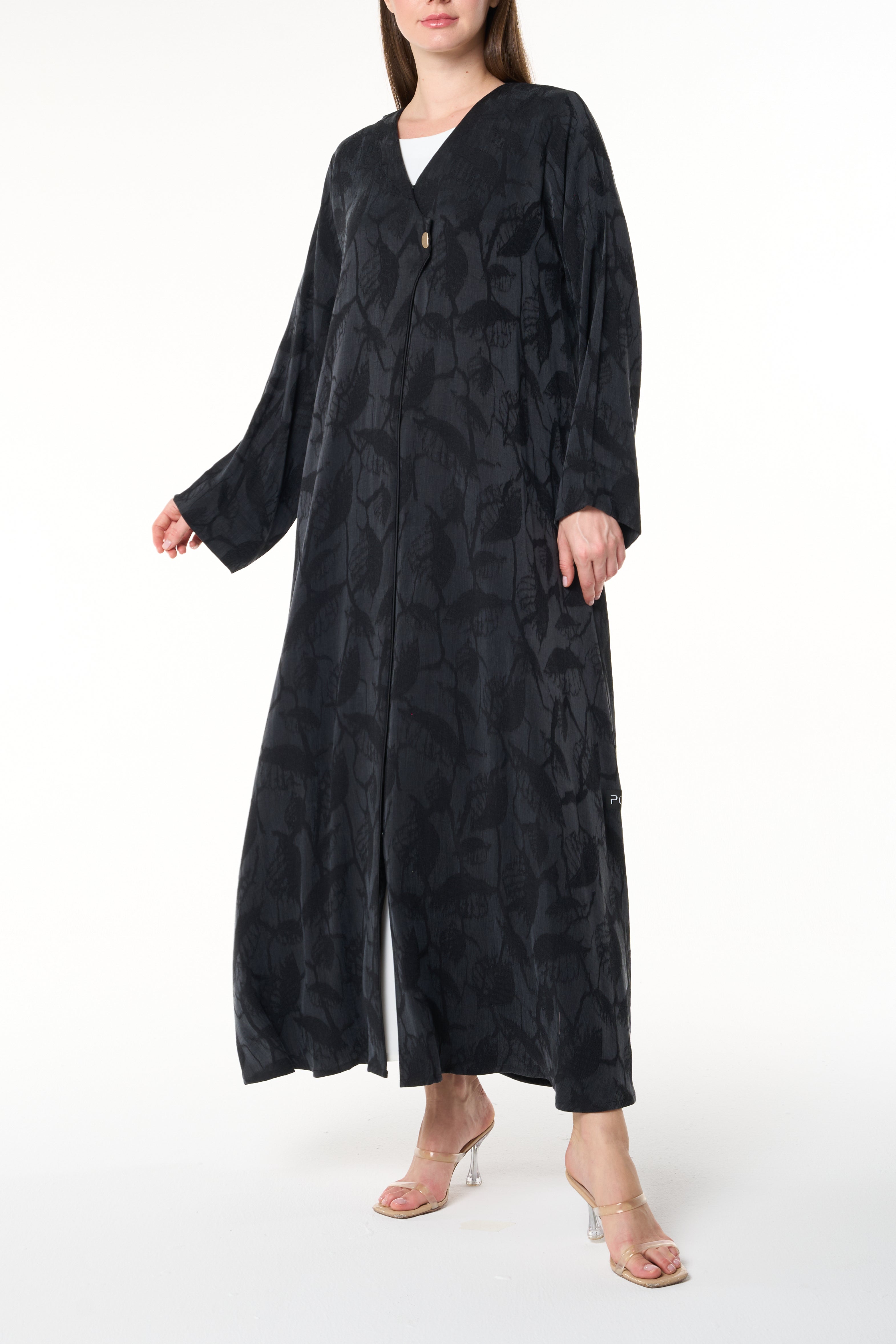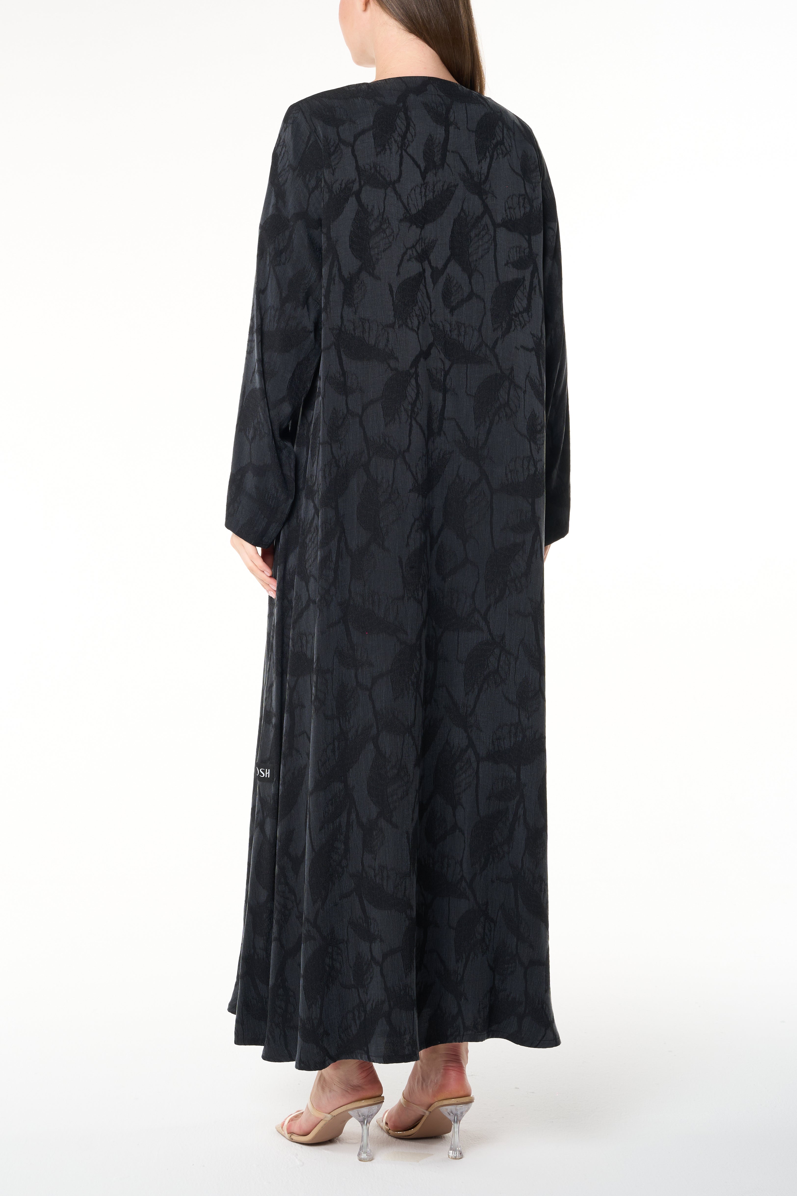 This abaya is cut in a flowing KLOSH silhouette from premium Circle Cupro, a fabric known for its distinctive semi-circle jacquard texture. The surface design creates subtle dimension, setting it apart from plain crepes while maintaining elegance.