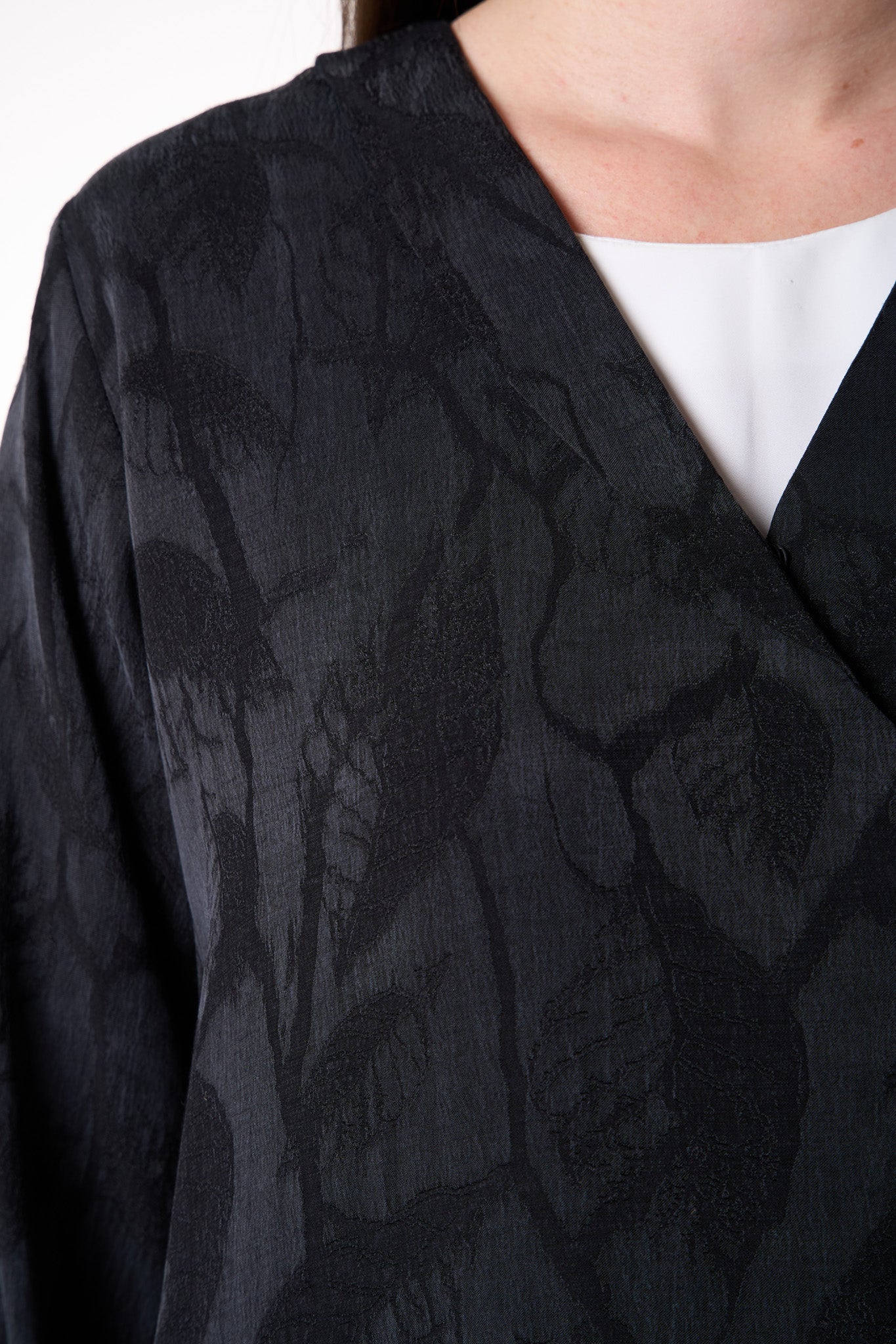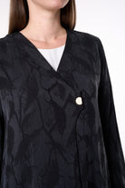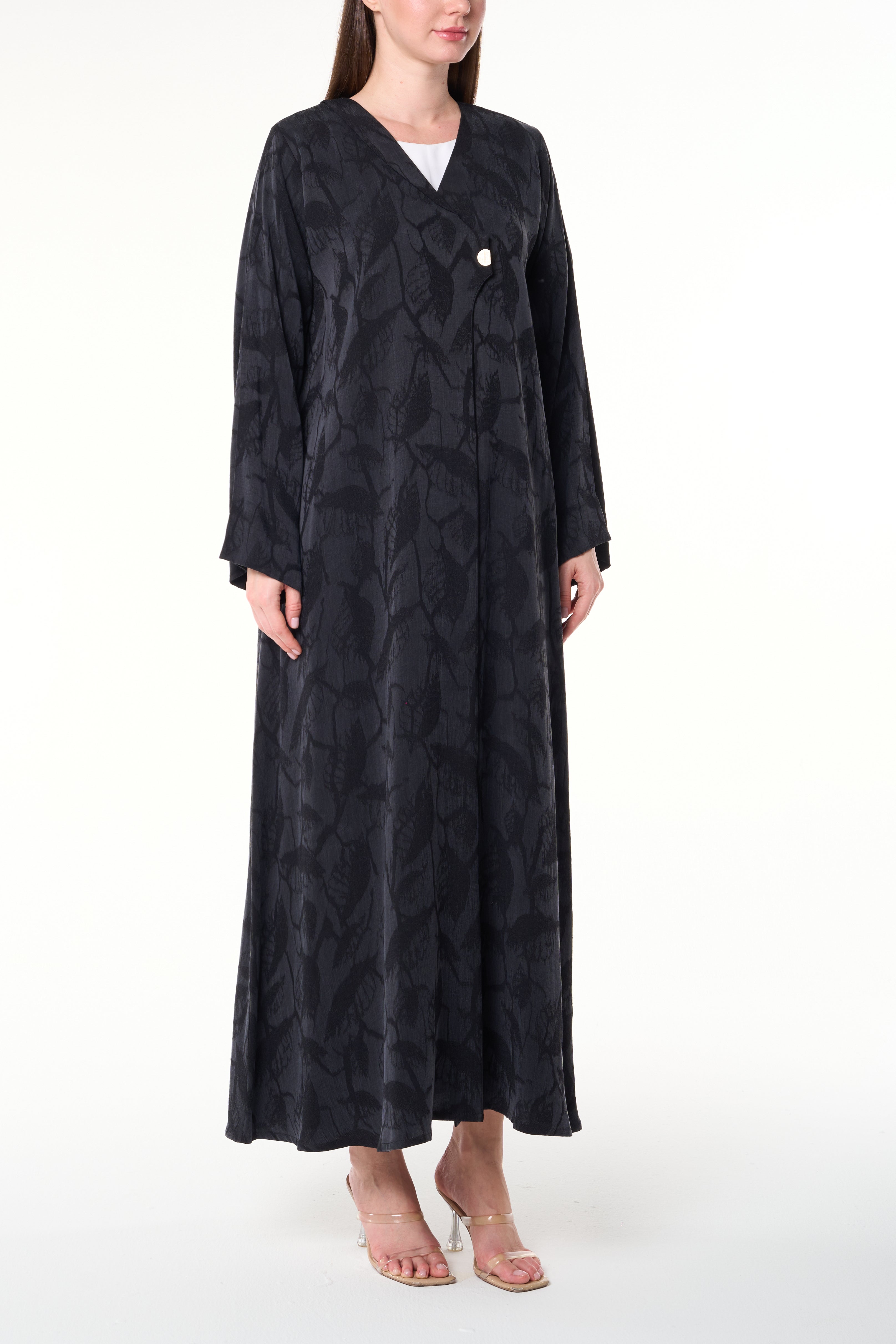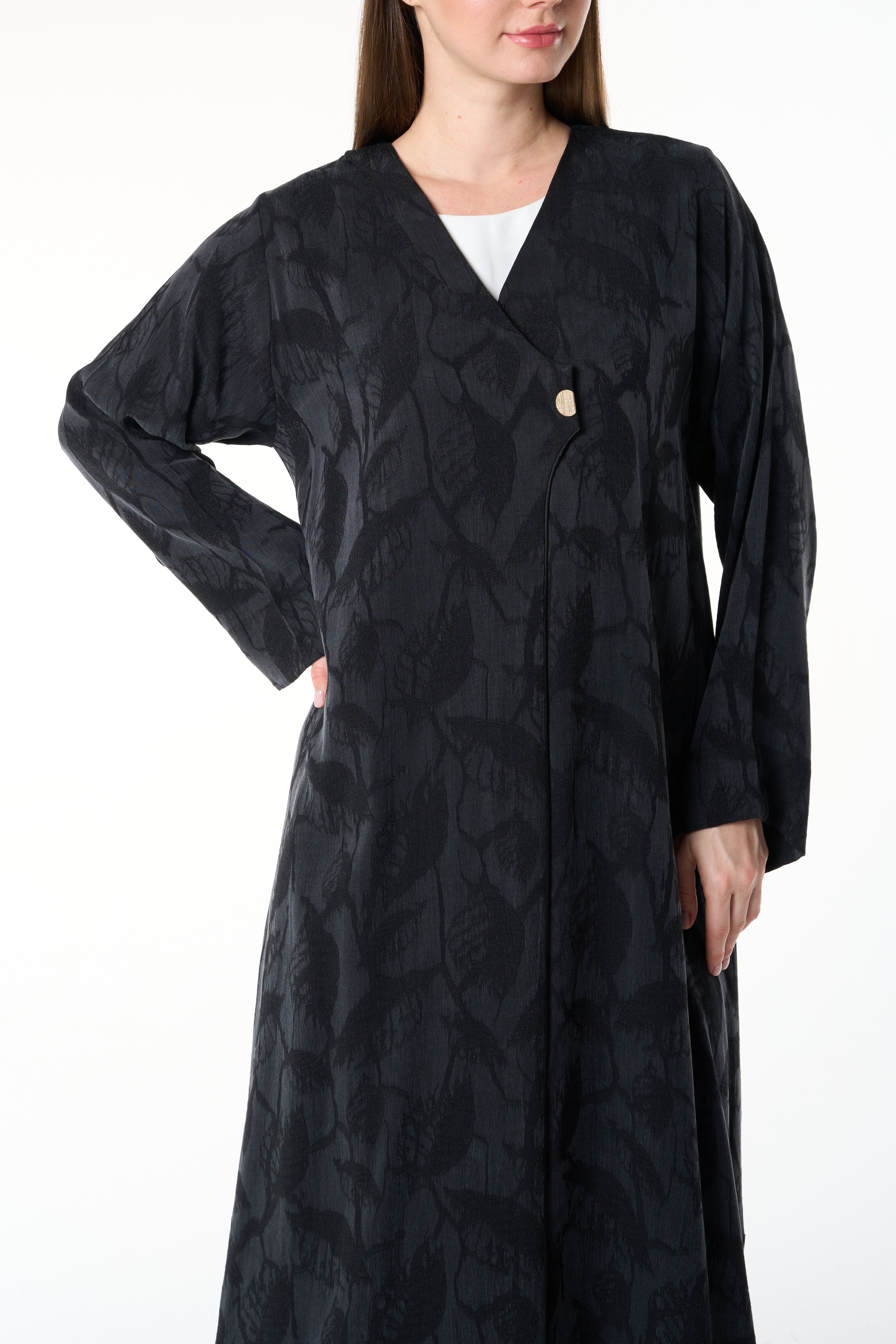 This abaya is cut in a flowing KLOSH silhouette from premium Circle Cupro, a fabric known for its distinctive semi-circle jacquard texture. The surface design creates subtle dimension, setting it apart from plain crepes while maintaining elegance.