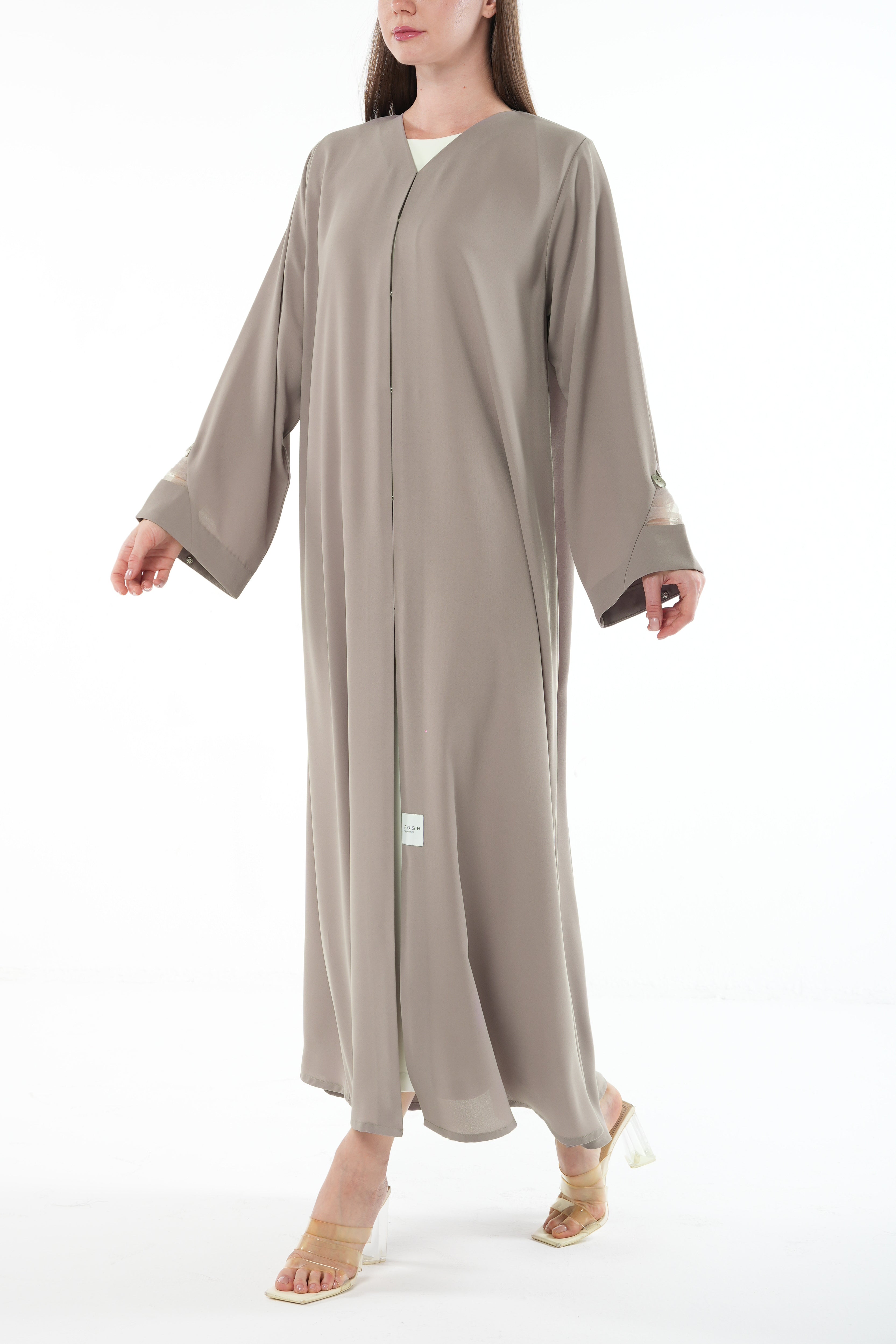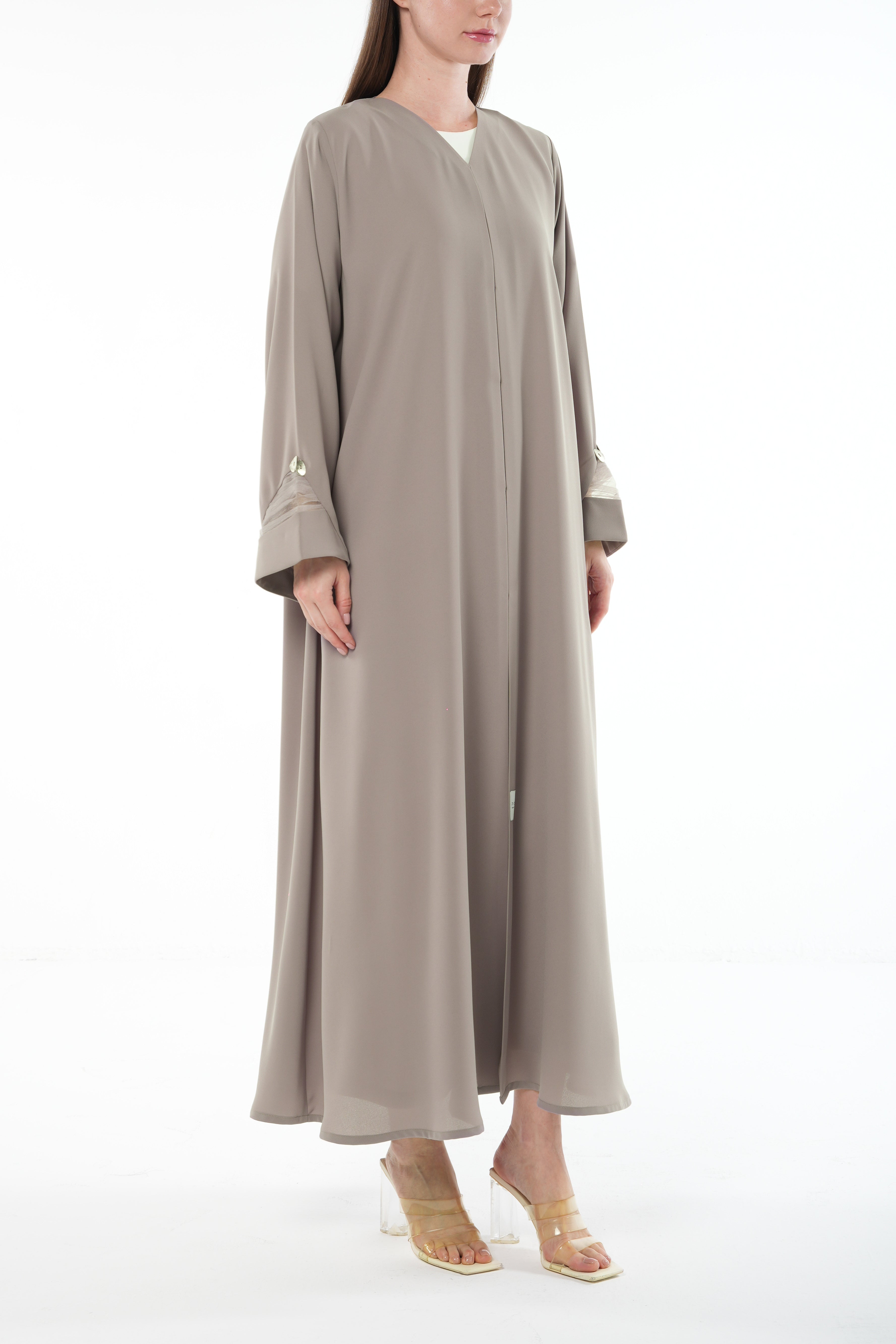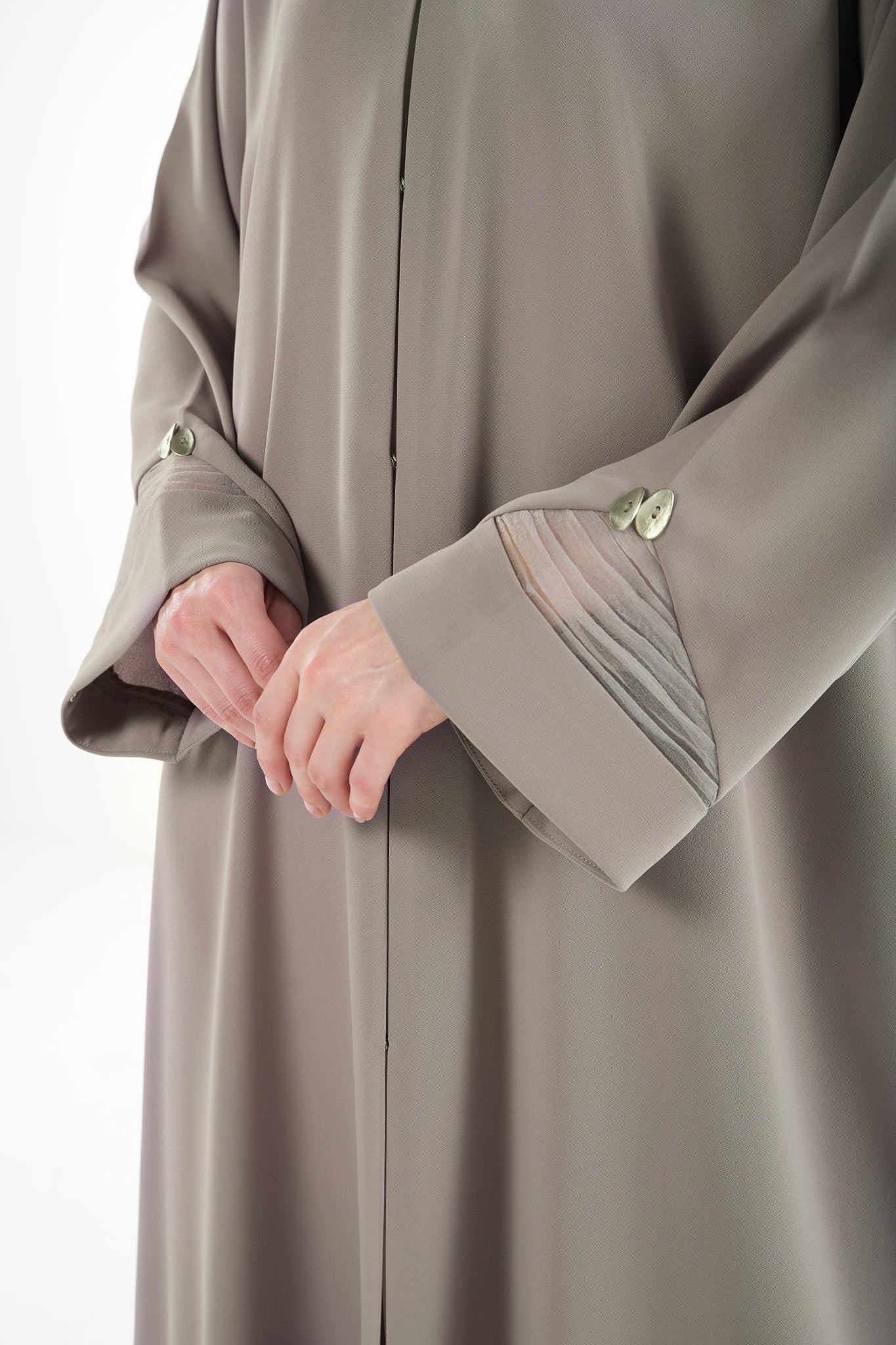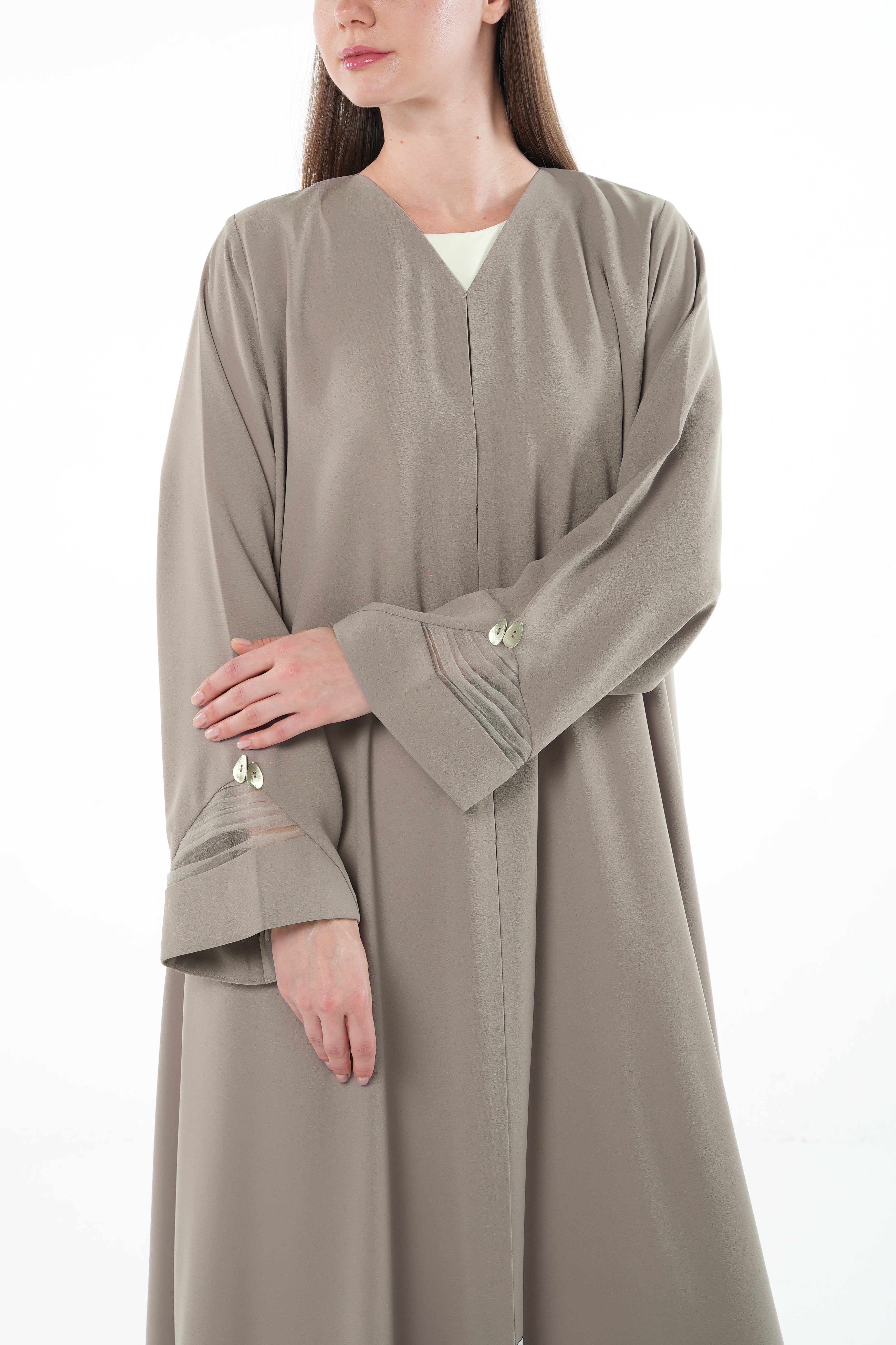Beige Claire Crepe Abaya with Organza Sleeve Detail and Clean Finish