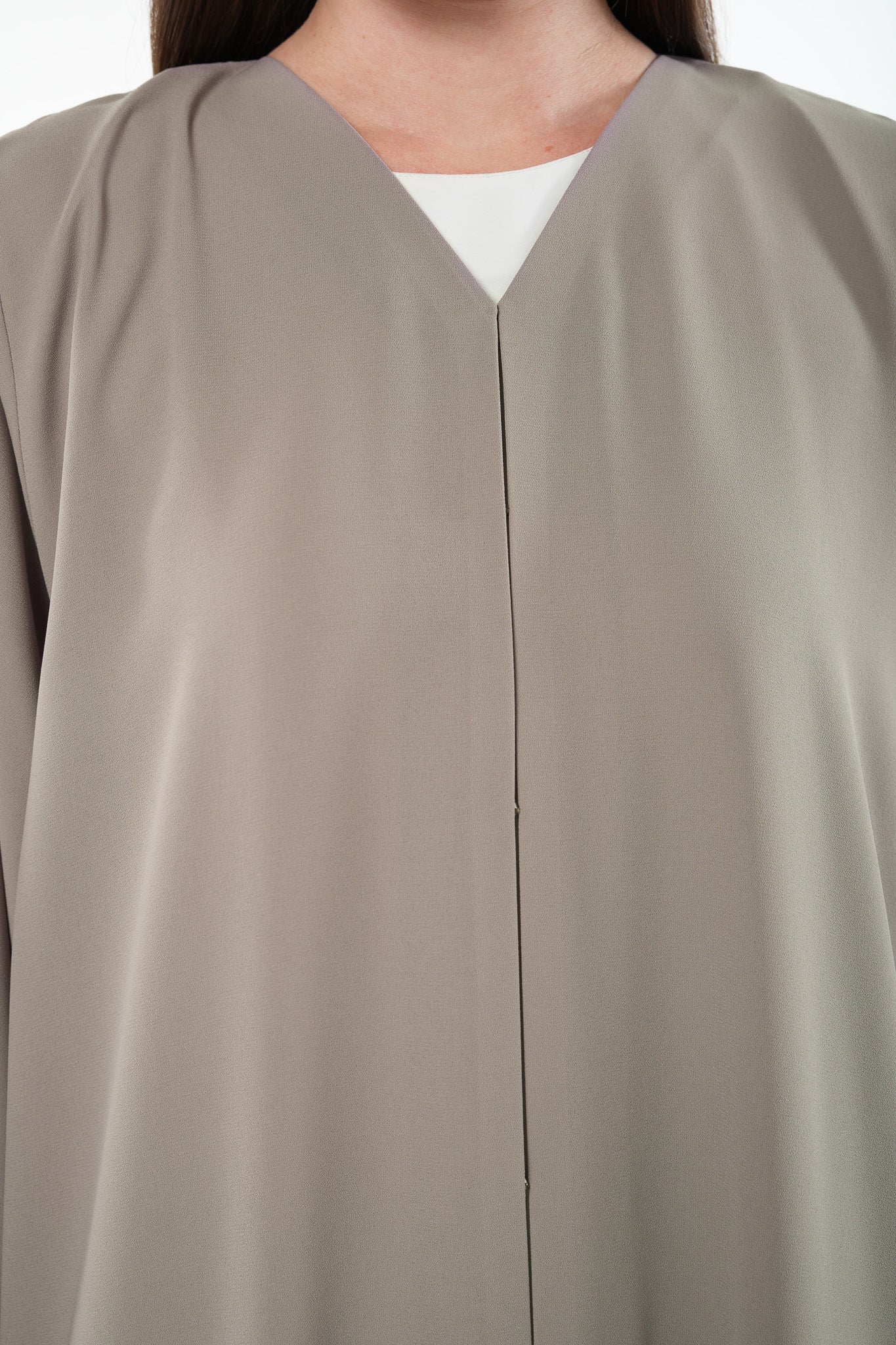 A matching sheila in the same tone and fabric is included, with rolled edges for a clean look. This luxury abaya is ideal for women who value soft tailoring, quiet detail, and timeless modesty.