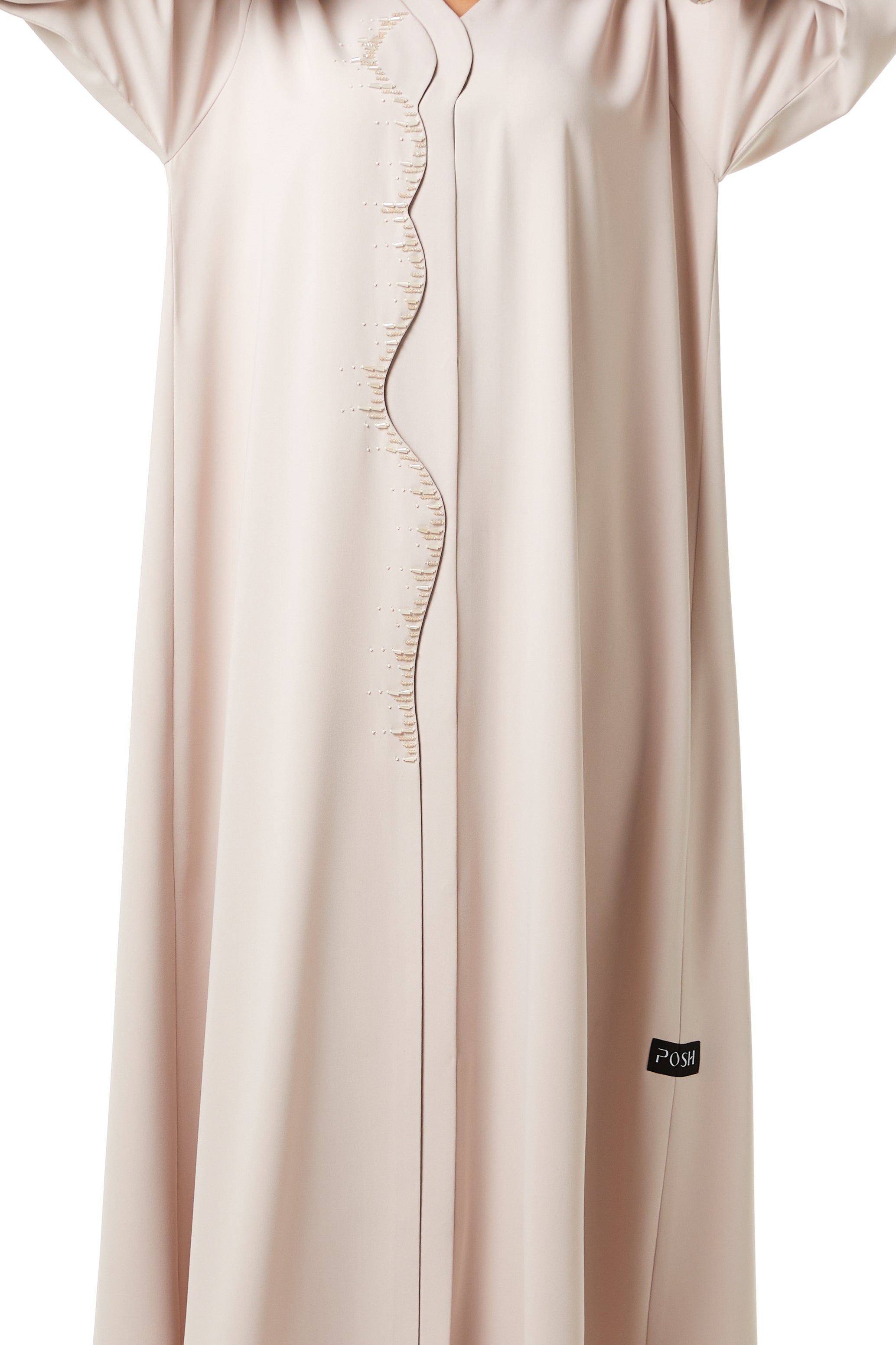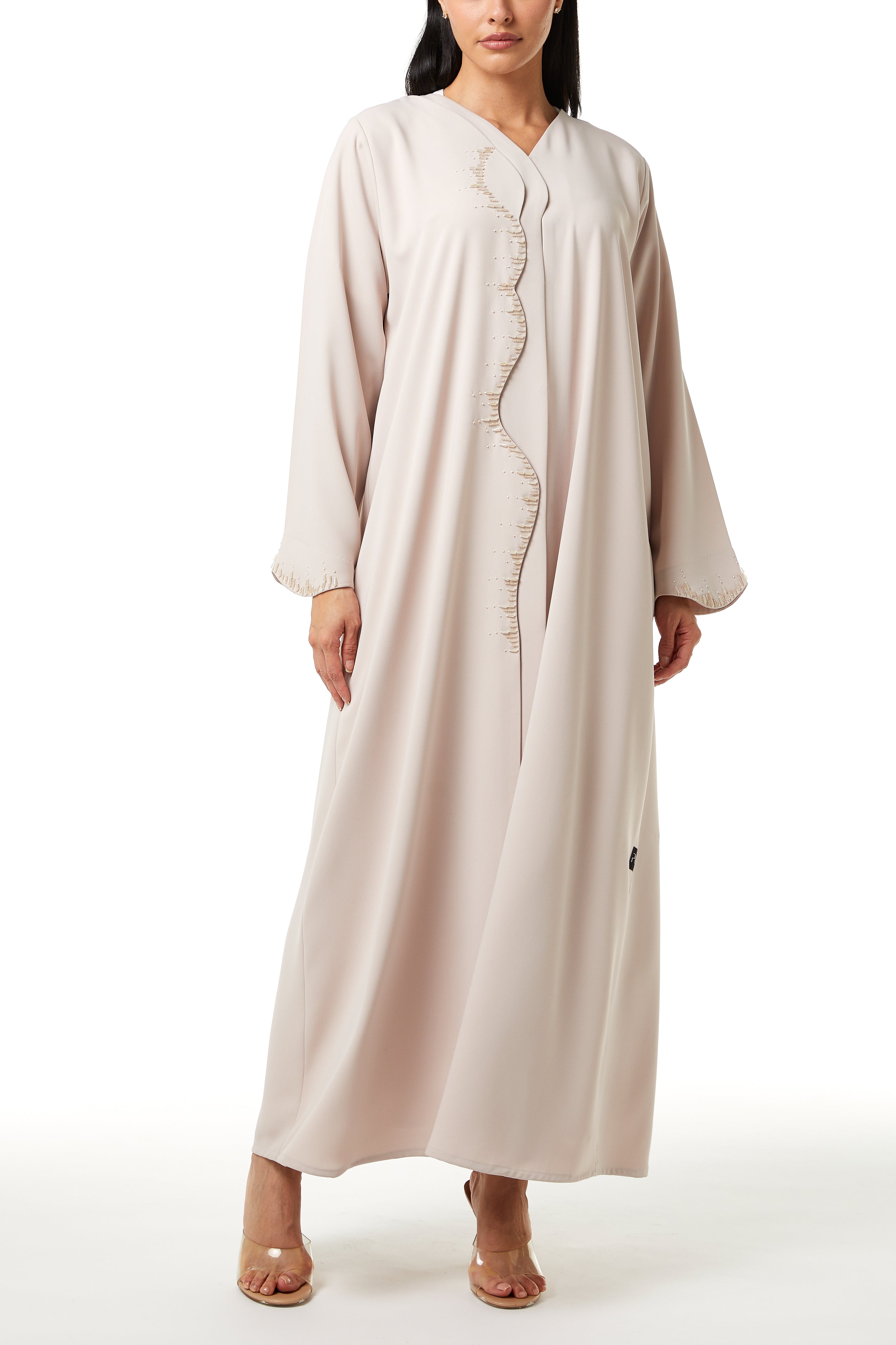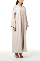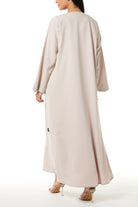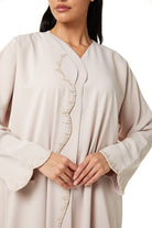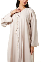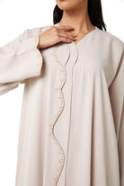 zoe crepe offers a smooth and lightweight feel that supports comfort during extended wear. The fabric sits neatly on the body and maintains a clean and structured appearance throughout the day and evening. The beige color gives a soft and refined look, making it suitable for Eid Al Adha, Ramadan gatherings, and social occasions.