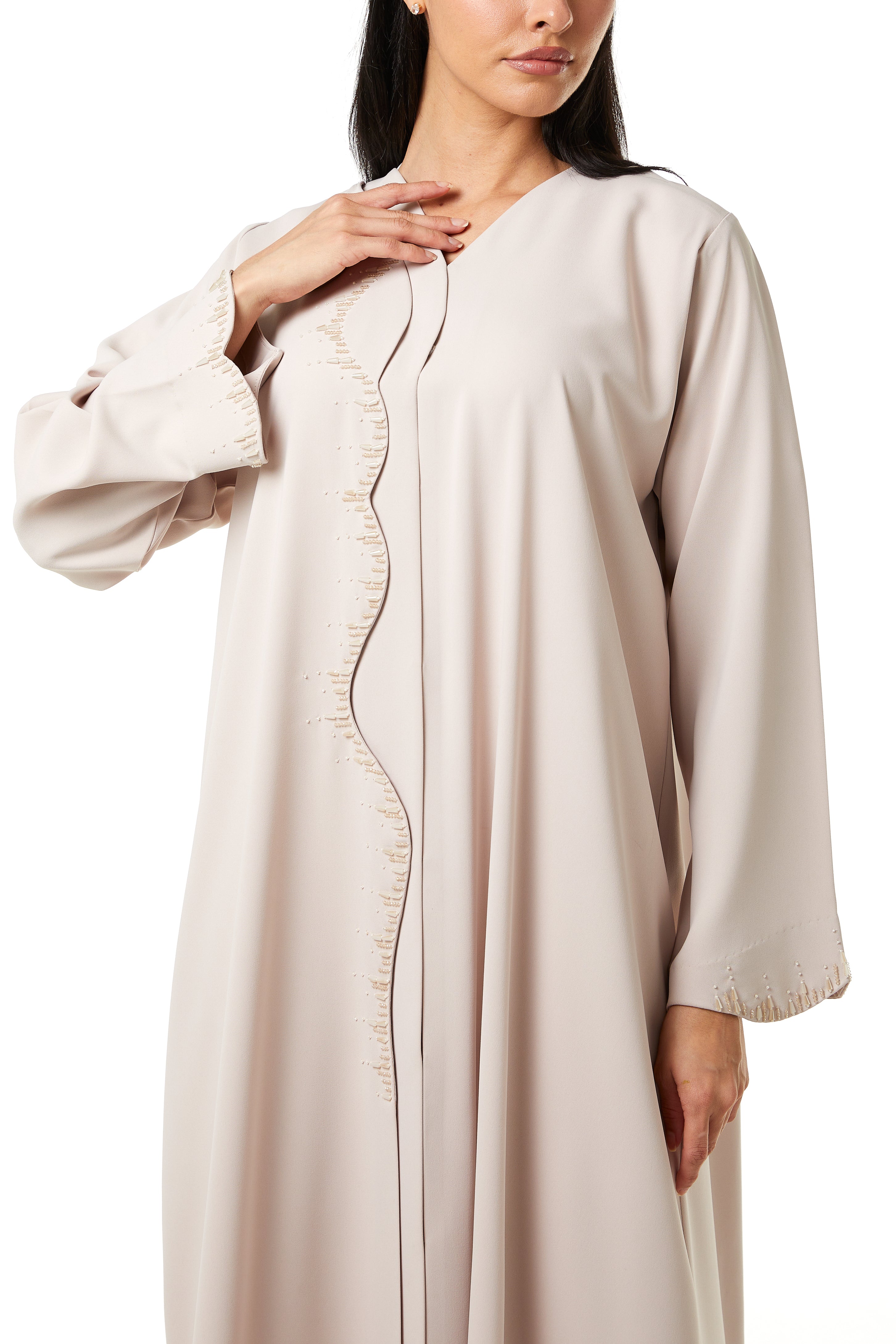 Beadwork detailing is placed along the curved overlap front panel in a vertical flowing arrangement. The handwork follows the contour of the overlap, forming a defined decorative line from the upper chest downward. Additional beadwork is applied at the sleeve hems, creating a coordinated and refined finish. The placement remains controlled and elegant, enhancing the structure without overwhelming the design.