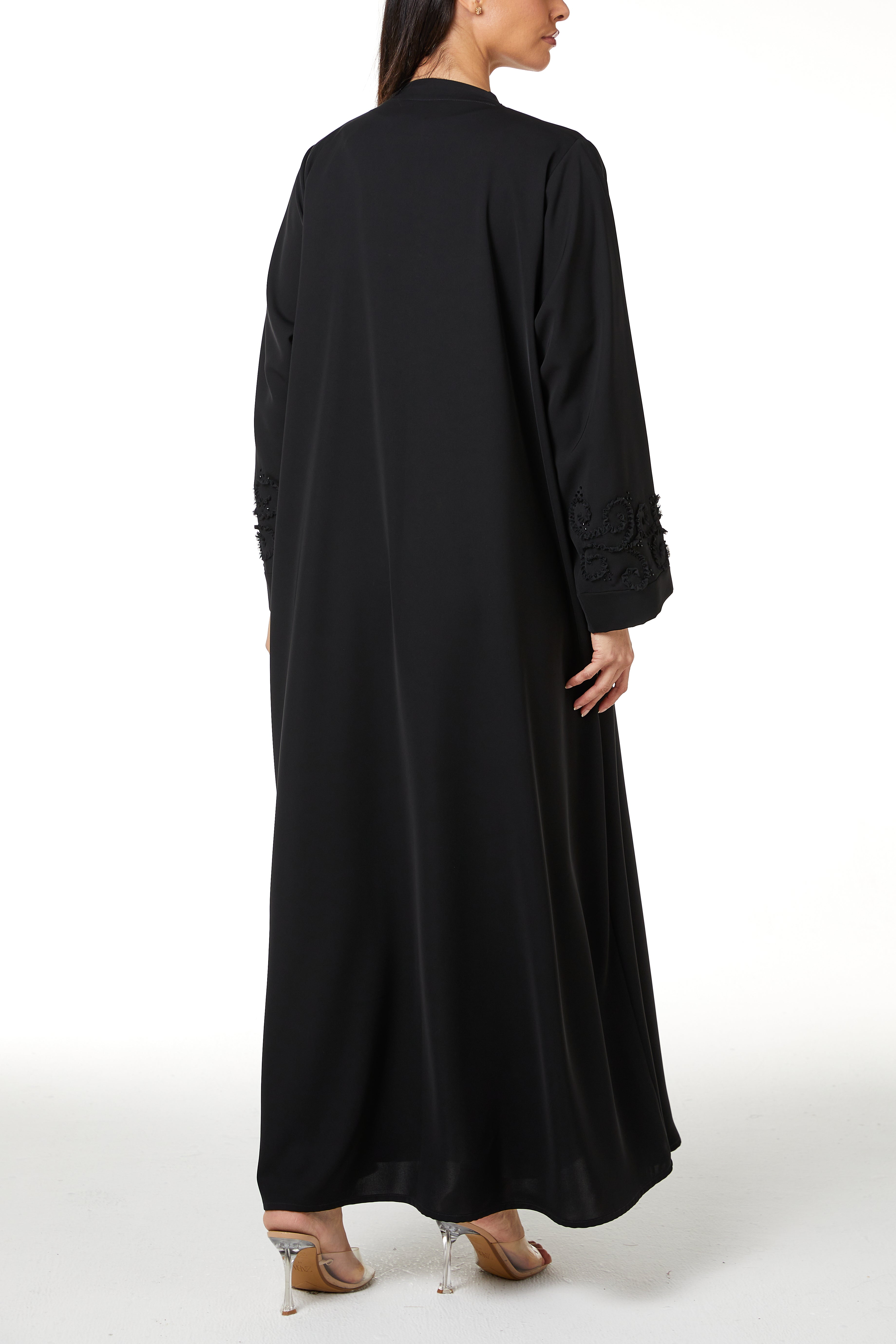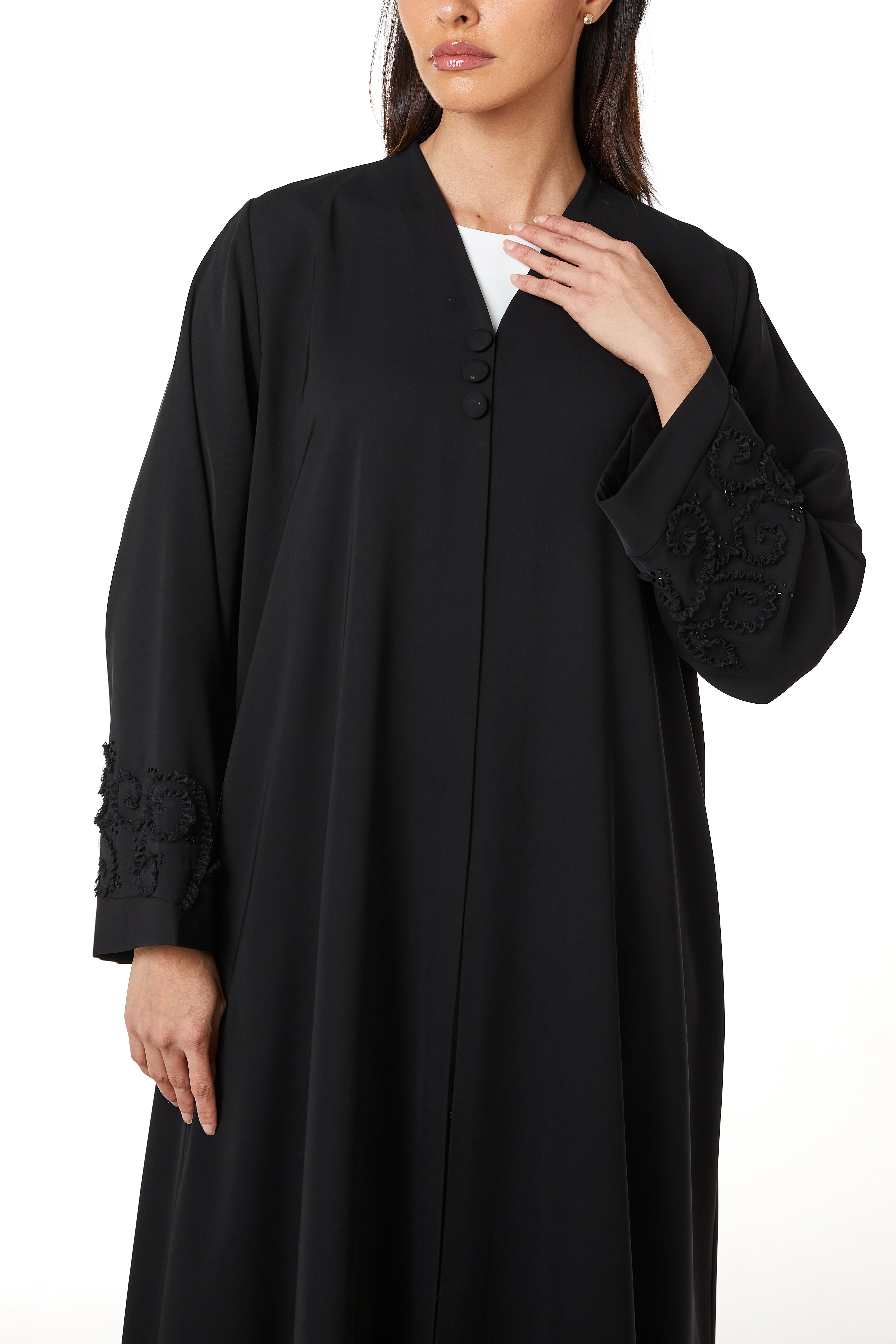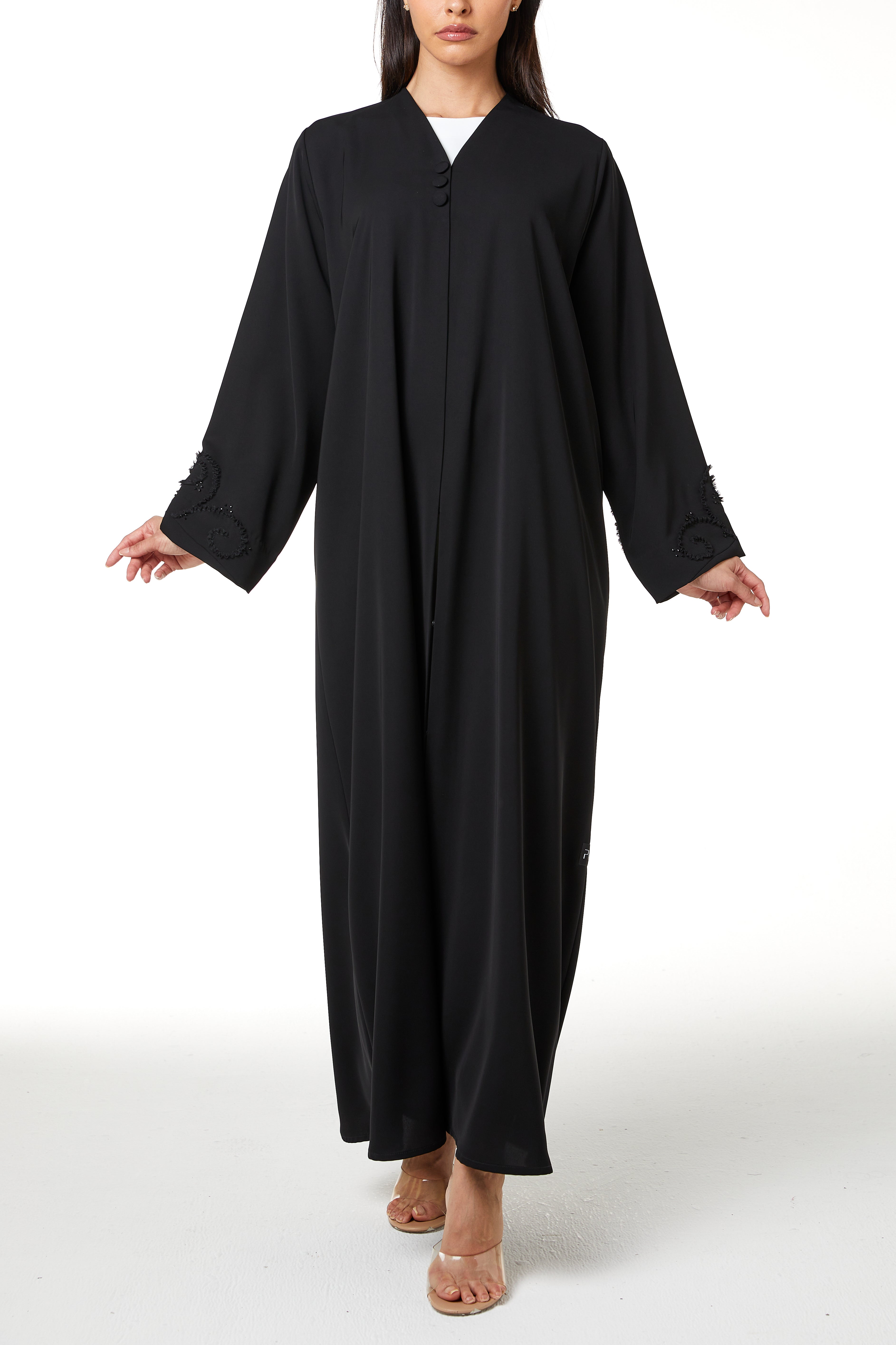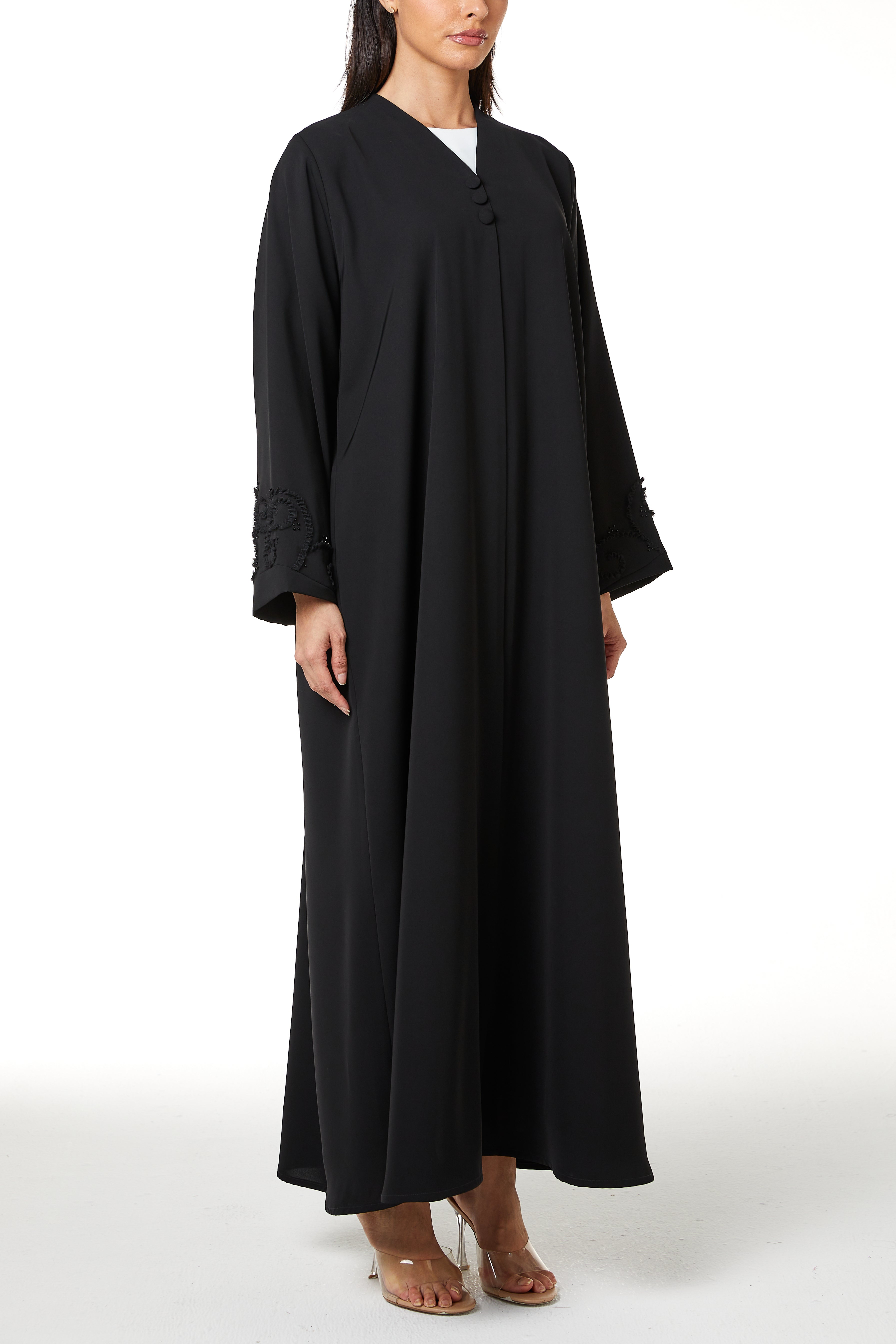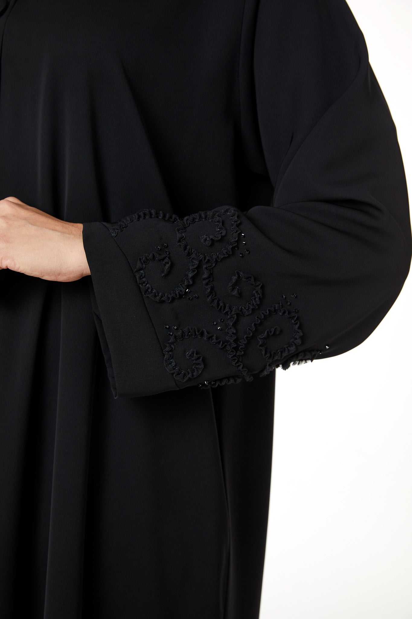 The klosh cut supports ease of movement and creates a comfortable silhouette without compromising structure. Designed for fall, winter, and year-round wear, this abaya combines decorative detailing with practical comfort, making it a versatile choice for customers seeking refined handwork with everyday wearability.