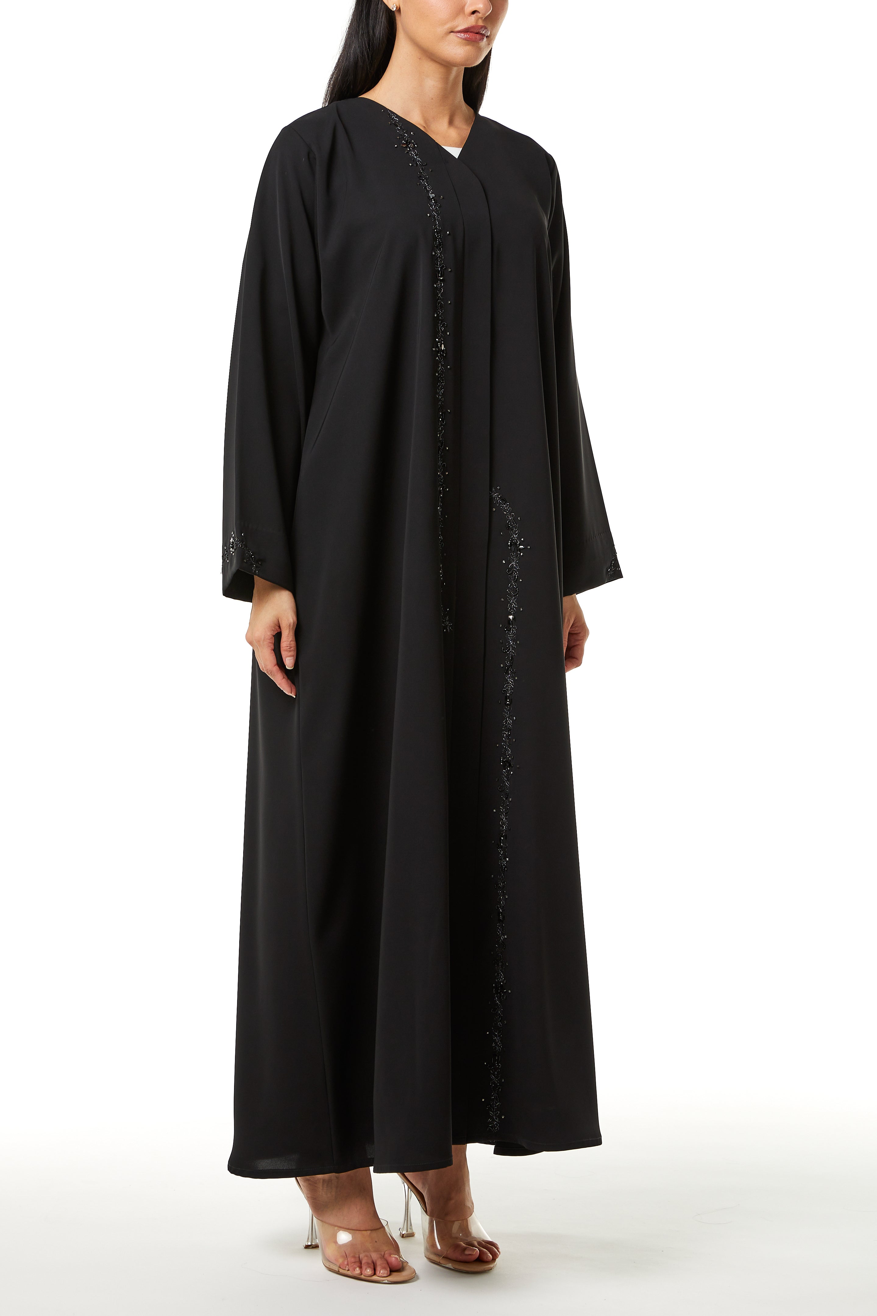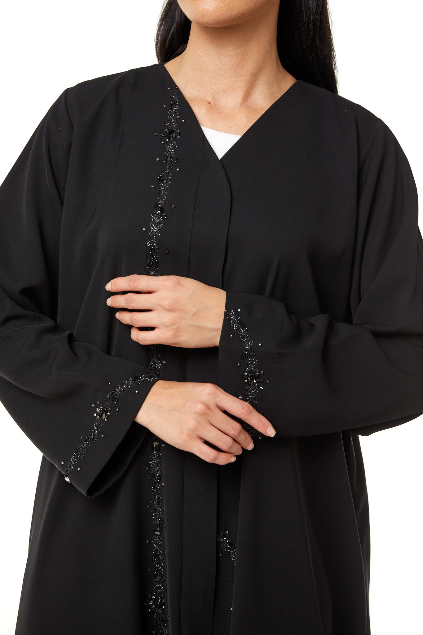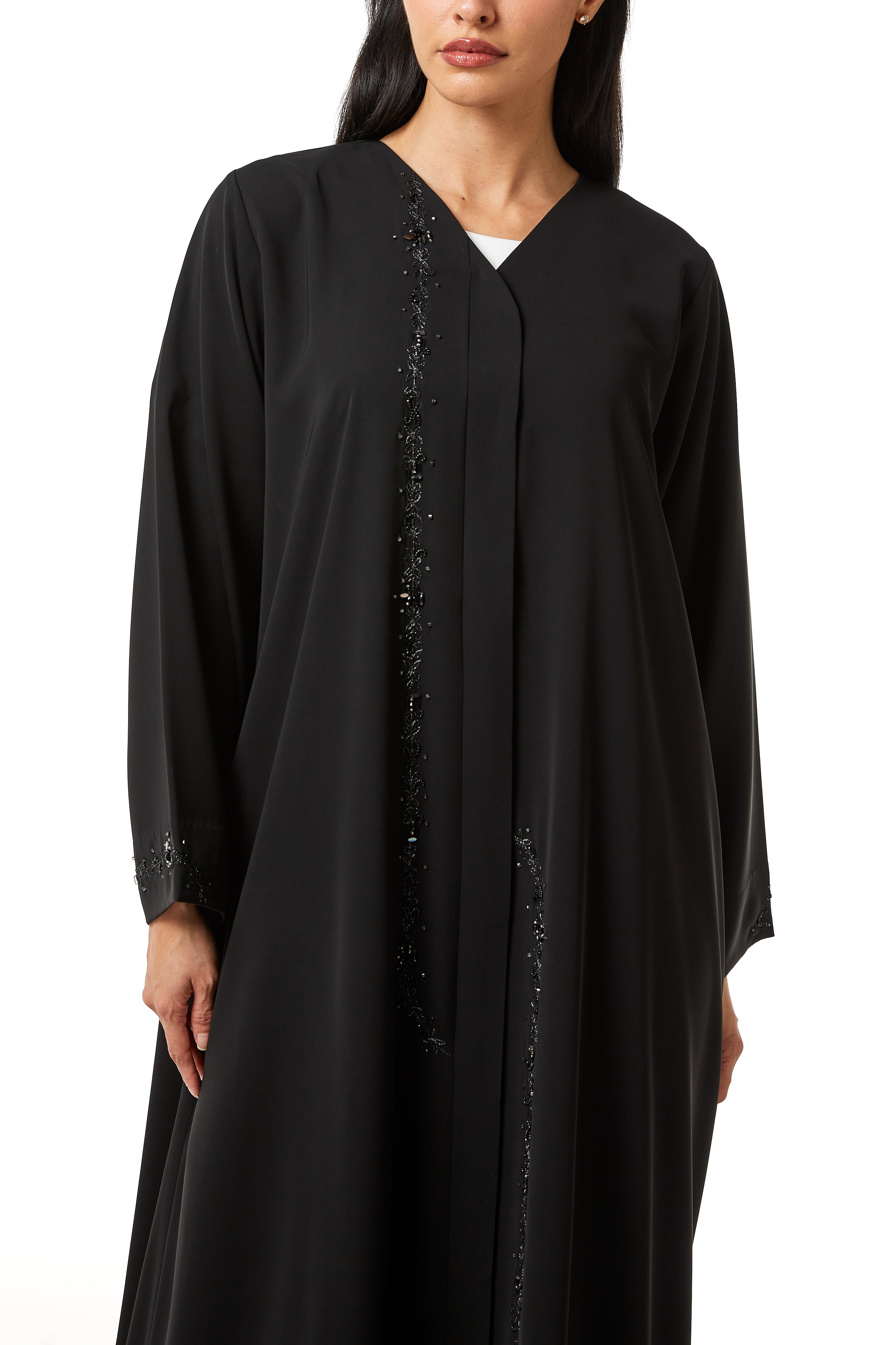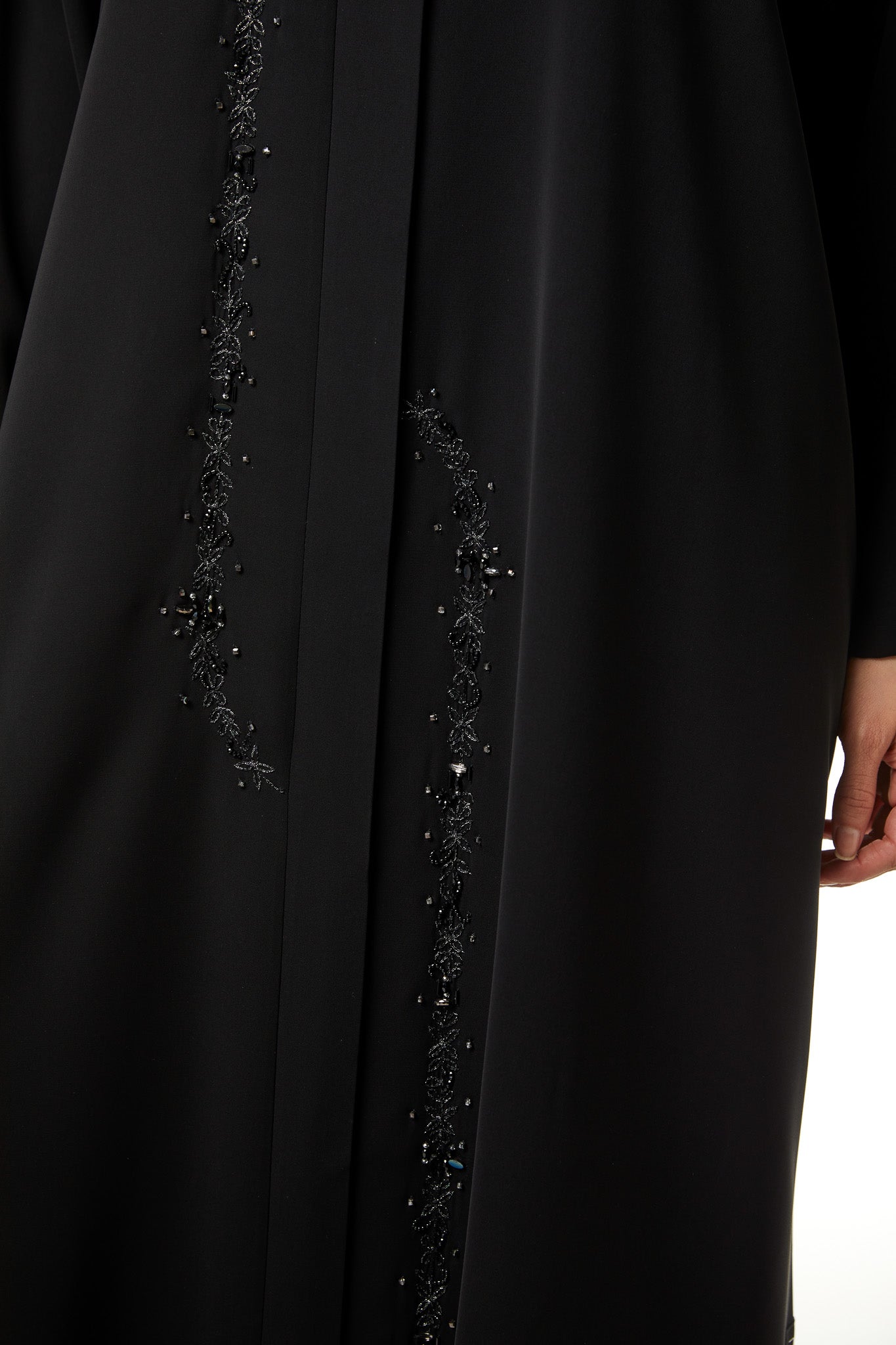 Hand-applied beadwork is arranged along the left front panel in a vertical layout that begins near the neckline and continues downward following the panel line. The beadwork then curves toward the lower section of the abaya, creating a flowing decorative path that adds texture and dimension. Additional beadwork is placed along the sleeve edge, providing a subtle accent that complements the main front design.