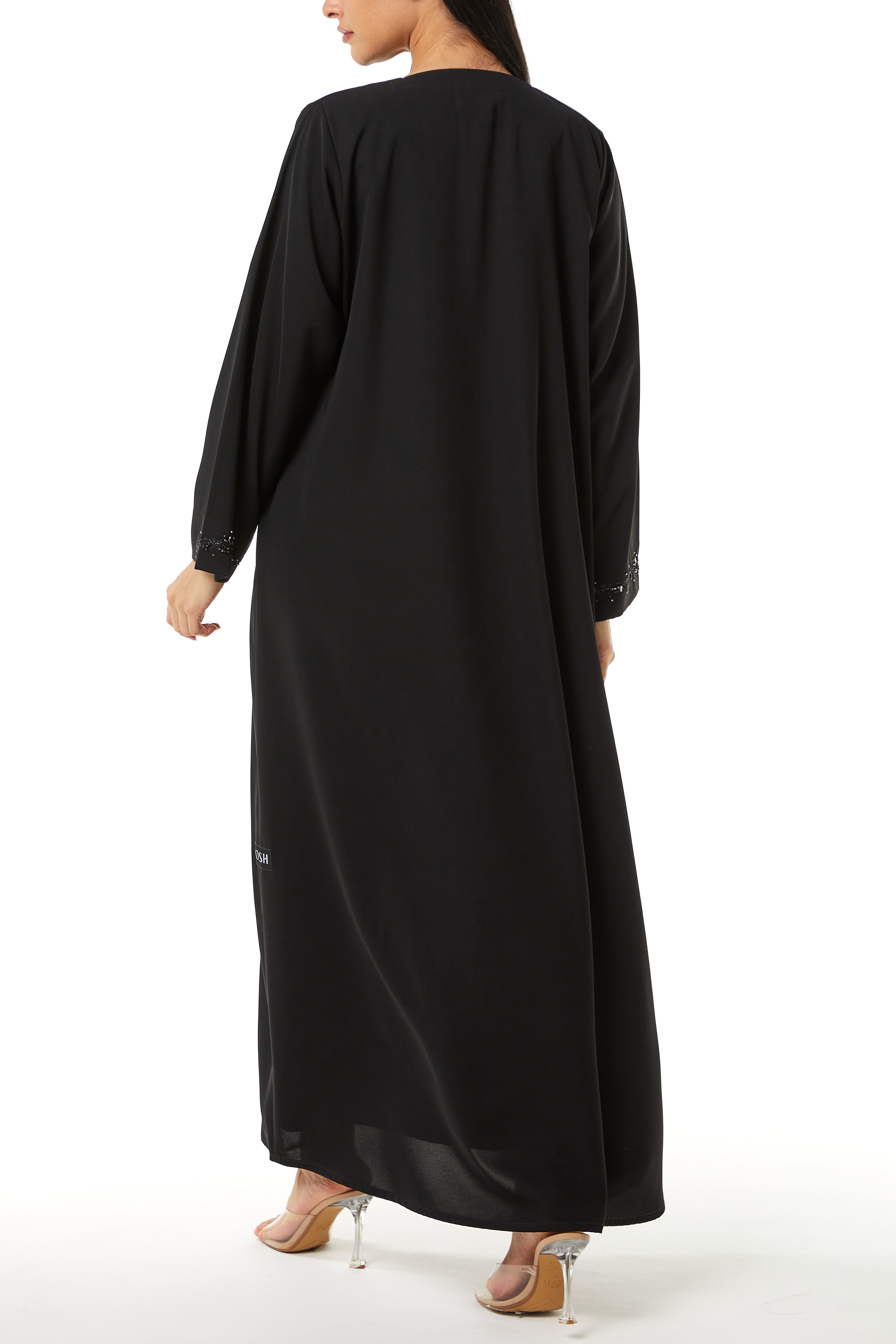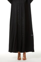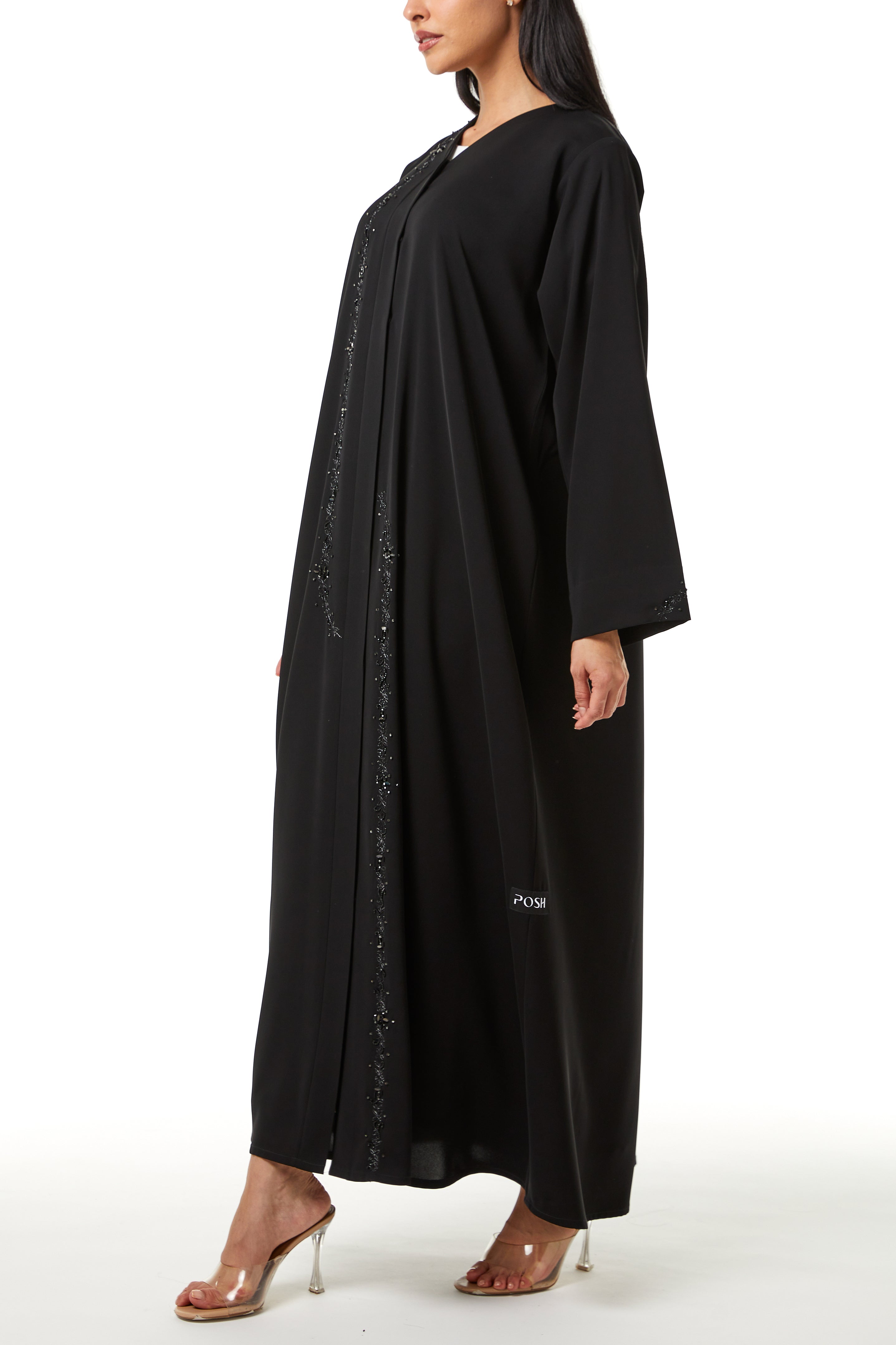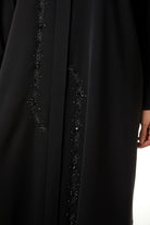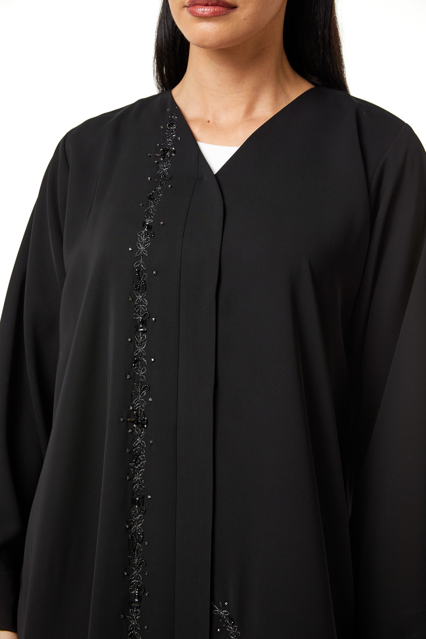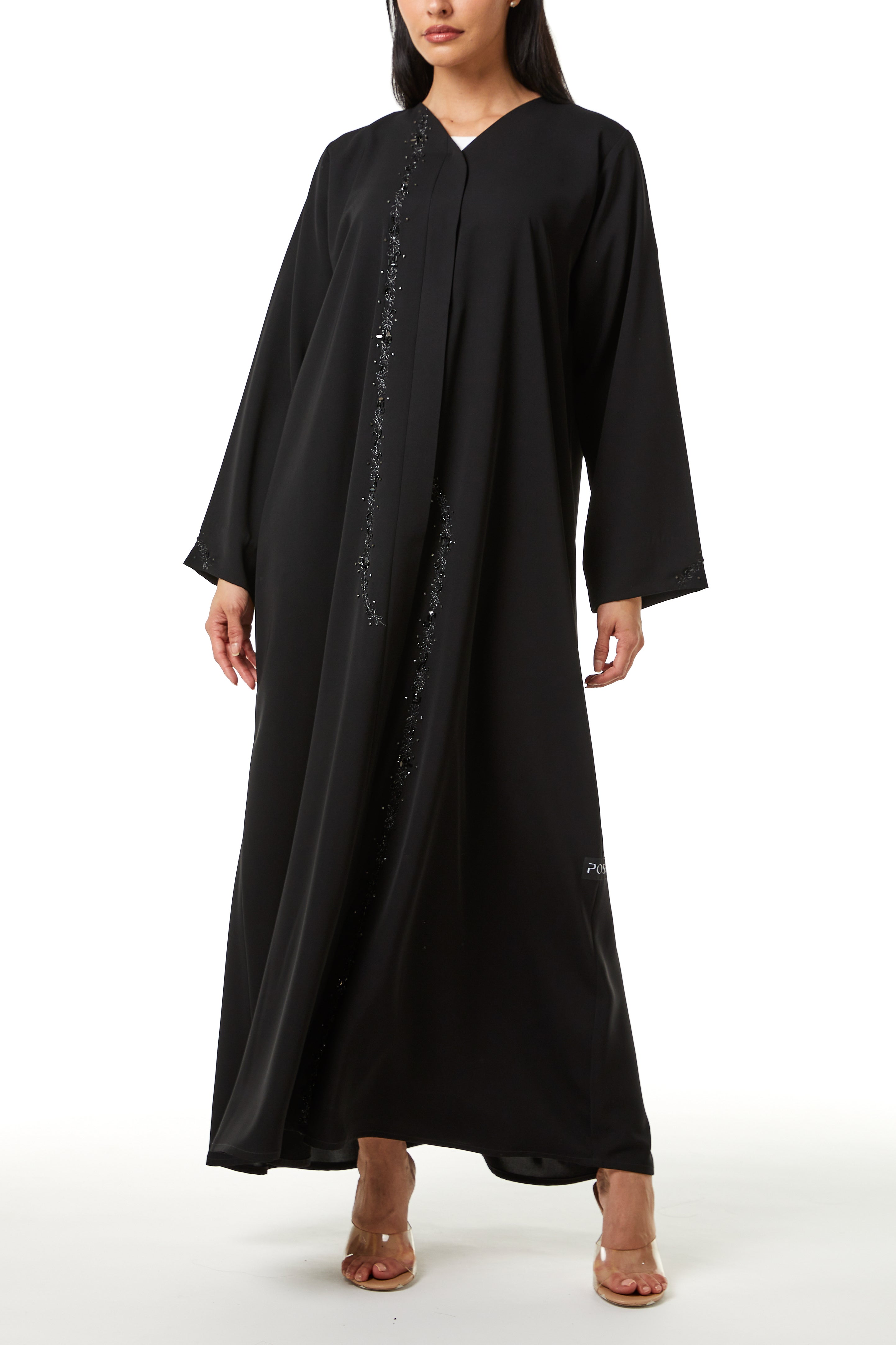 Hand-applied beadwork is arranged along the left front panel in a vertical layout that begins near the neckline and continues downward following the panel line. The beadwork then curves toward the lower section of the abaya, creating a flowing decorative path that adds texture and dimension. Additional beadwork is placed along the sleeve edge, providing a subtle accent that complements the main front design.