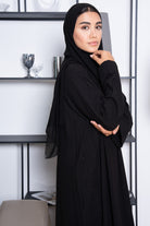 This black abaya is crafted from Claire Crepe, a light and breathable fabric ideal for year-round wear. The abaya features a clean straight cut that gives it a timeless silhouette, perfect for both professional and social settings.