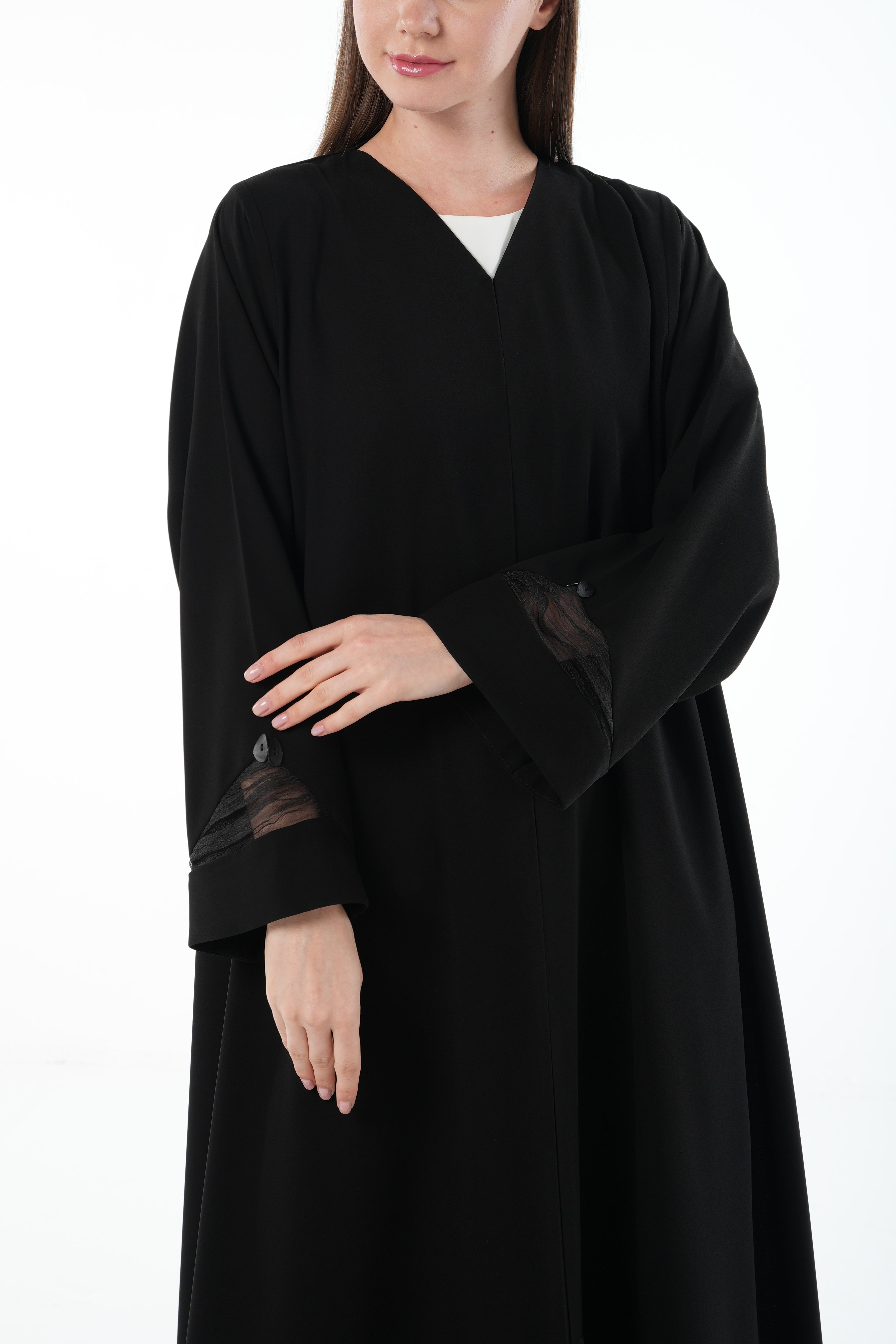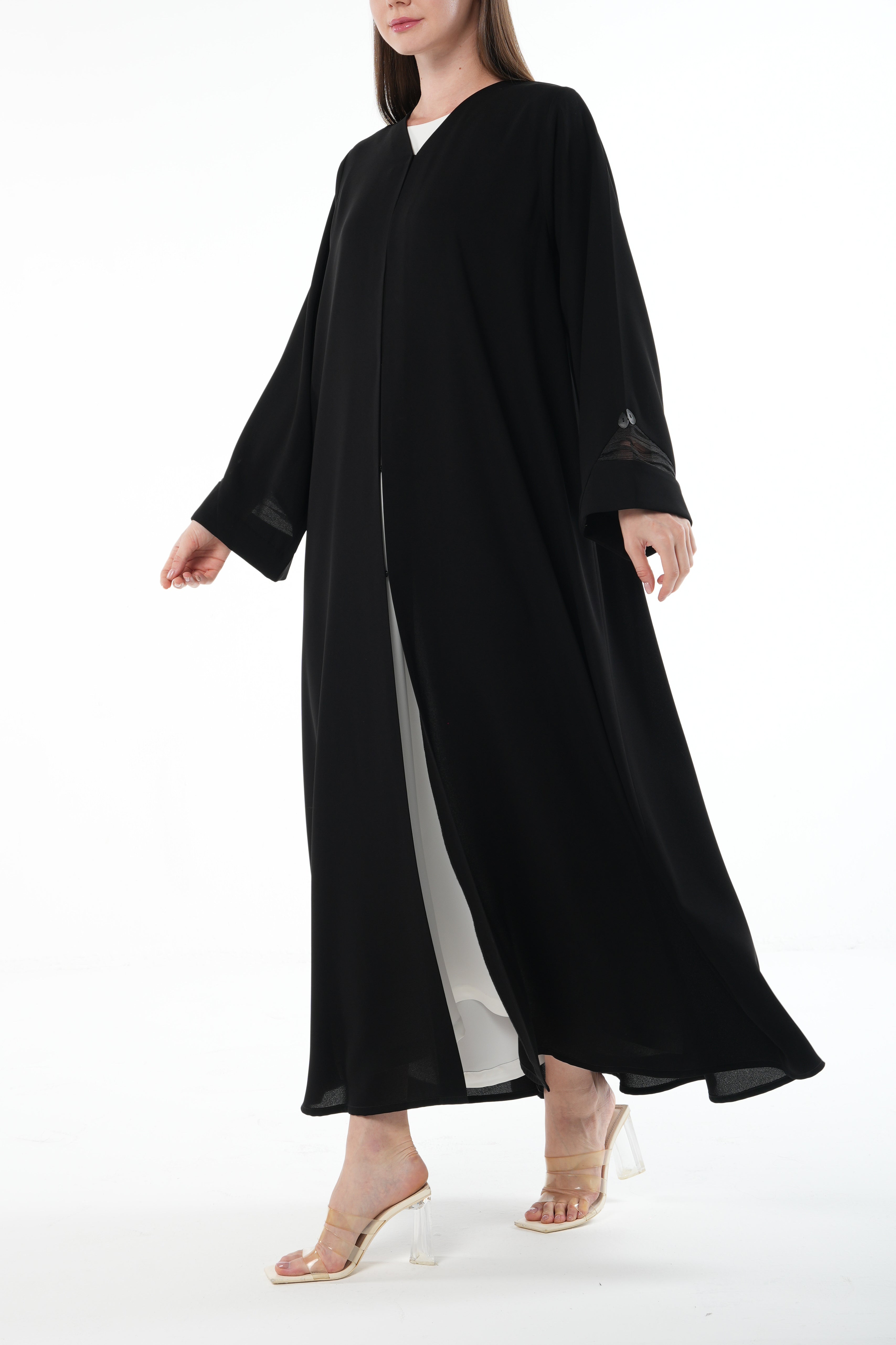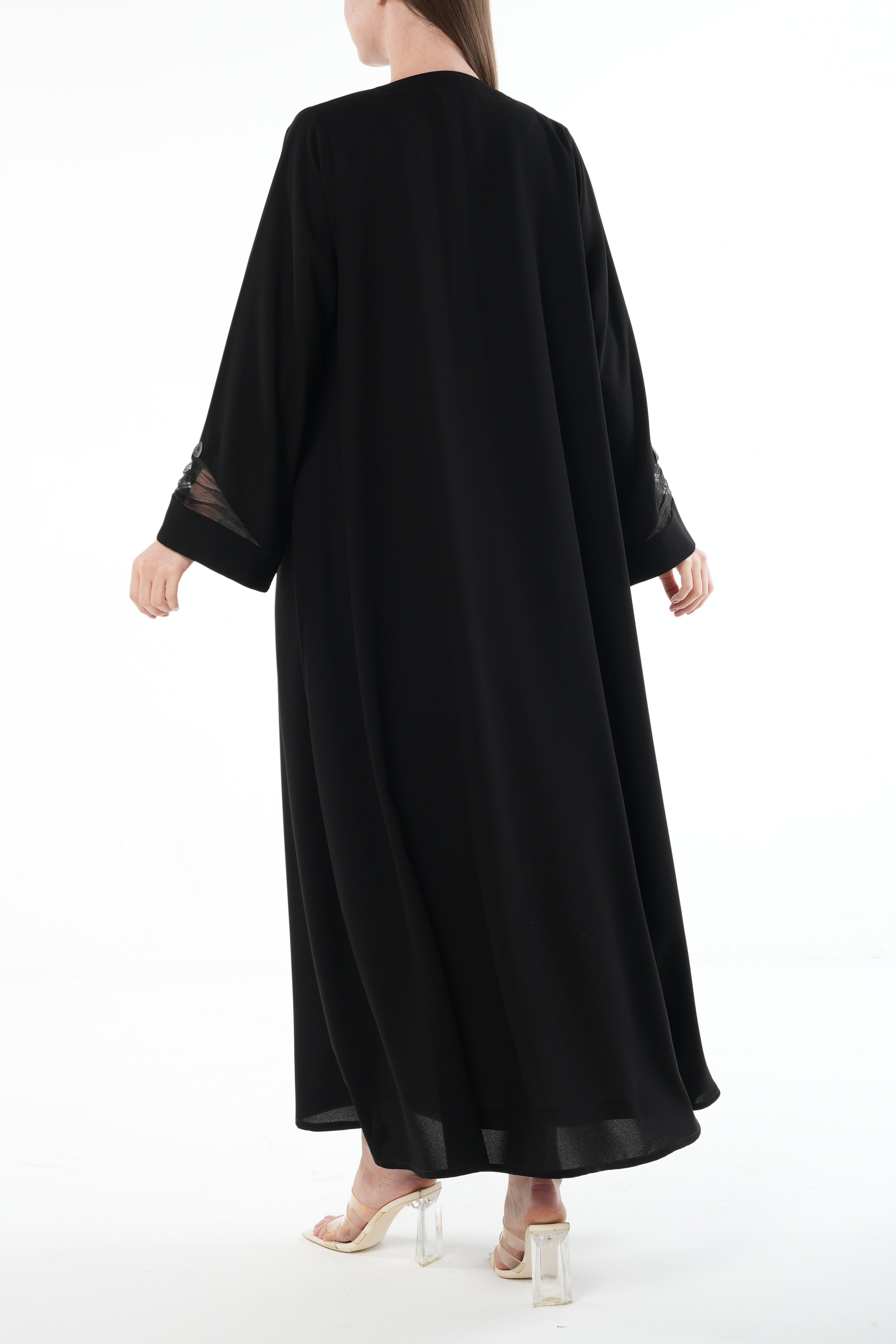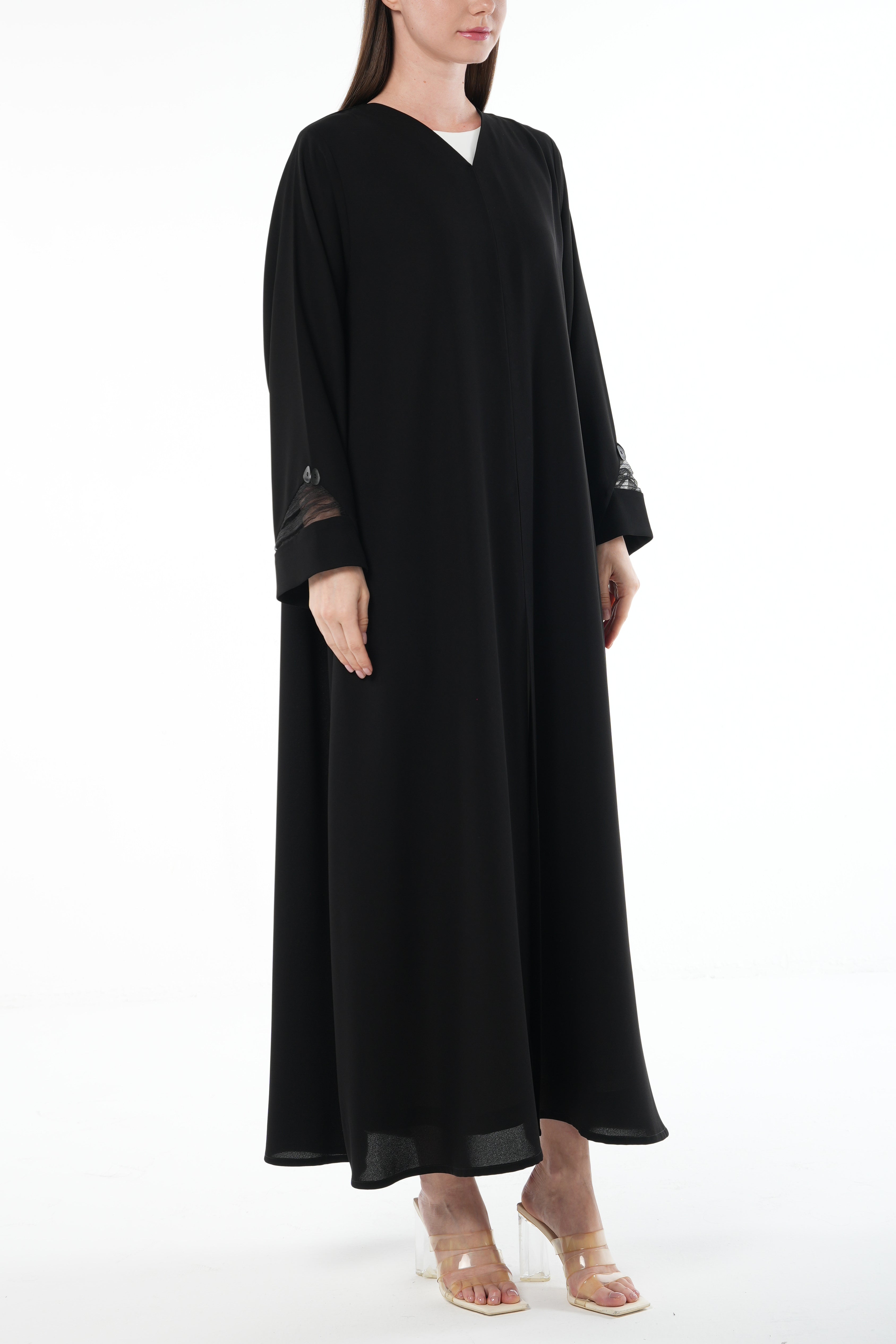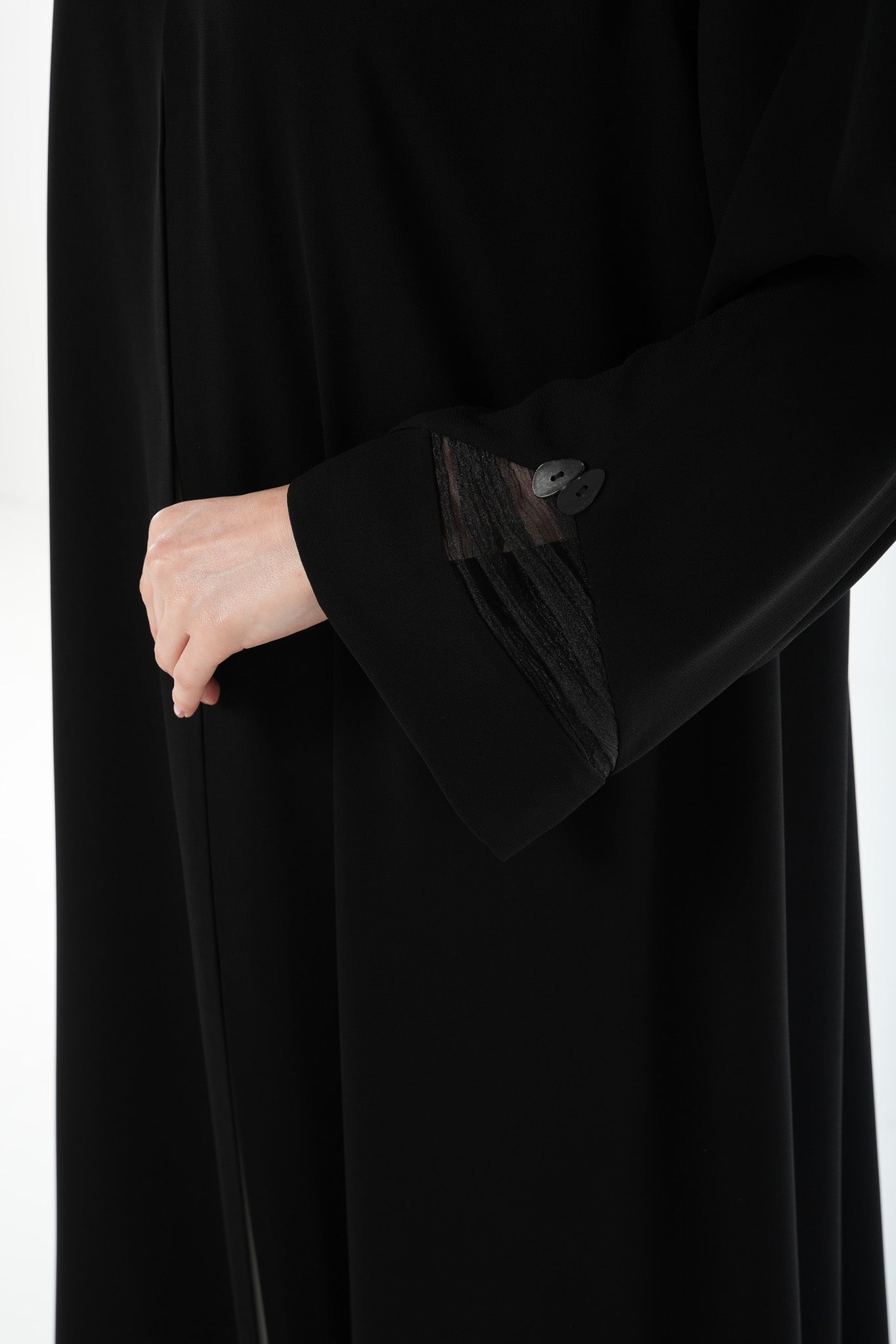 Black Claire Crepe Abaya with Organza Sleeve Detail and Clean Finish