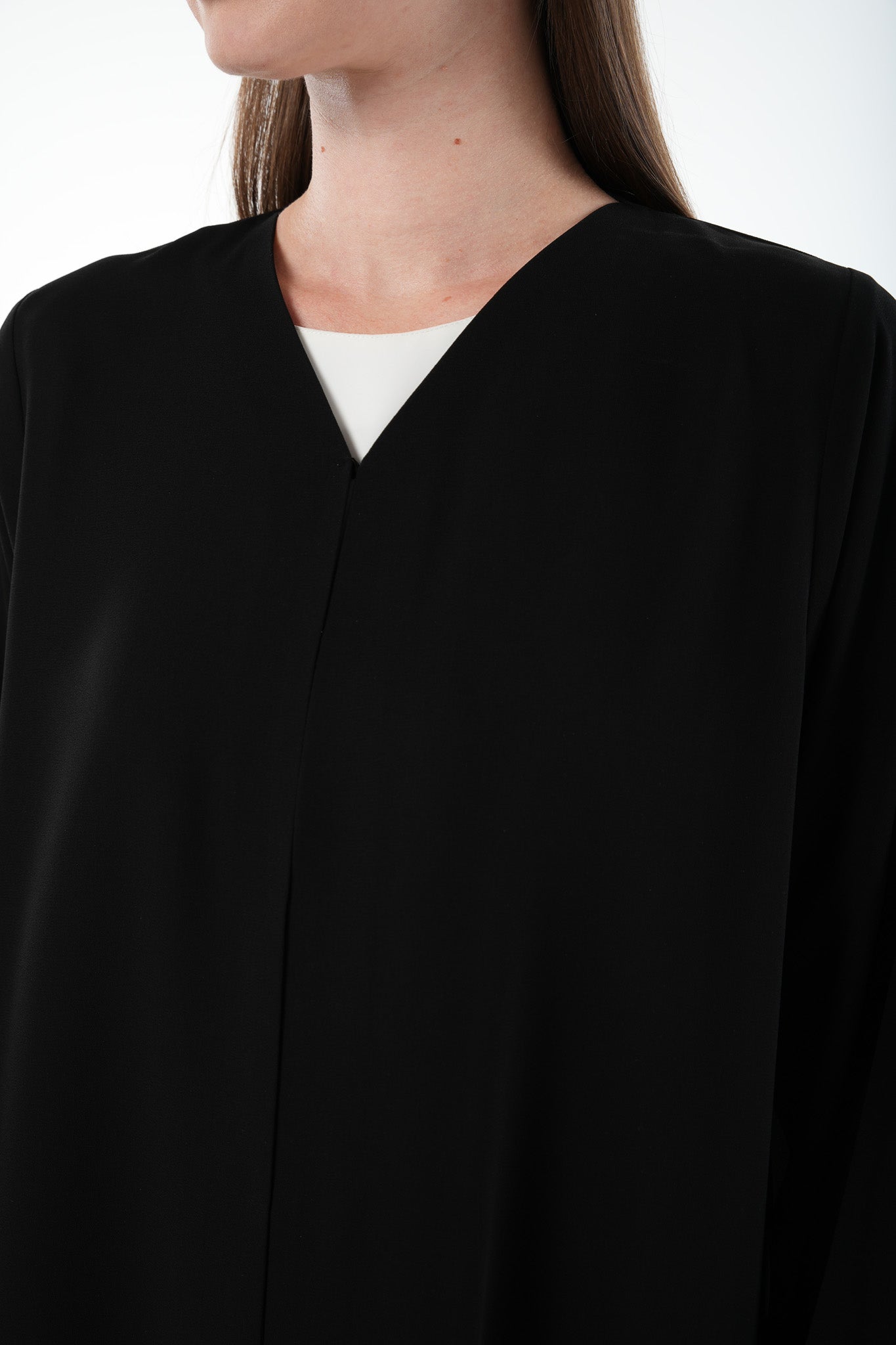 This black abaya is made from Claire Crepe, a soft, medium-weight fabric with a smooth surface and comfortable structure. It offers full coverage with a composed silhouette, perfect for refined daily wear.