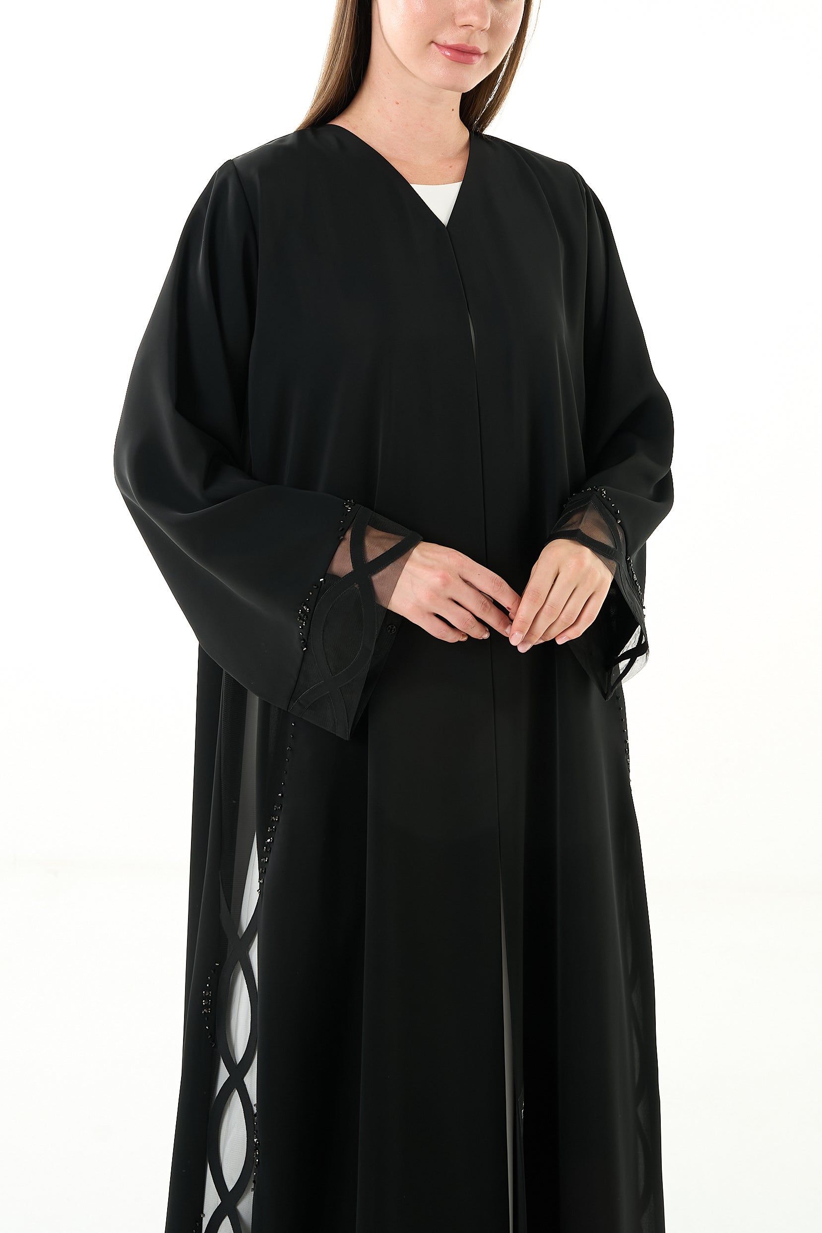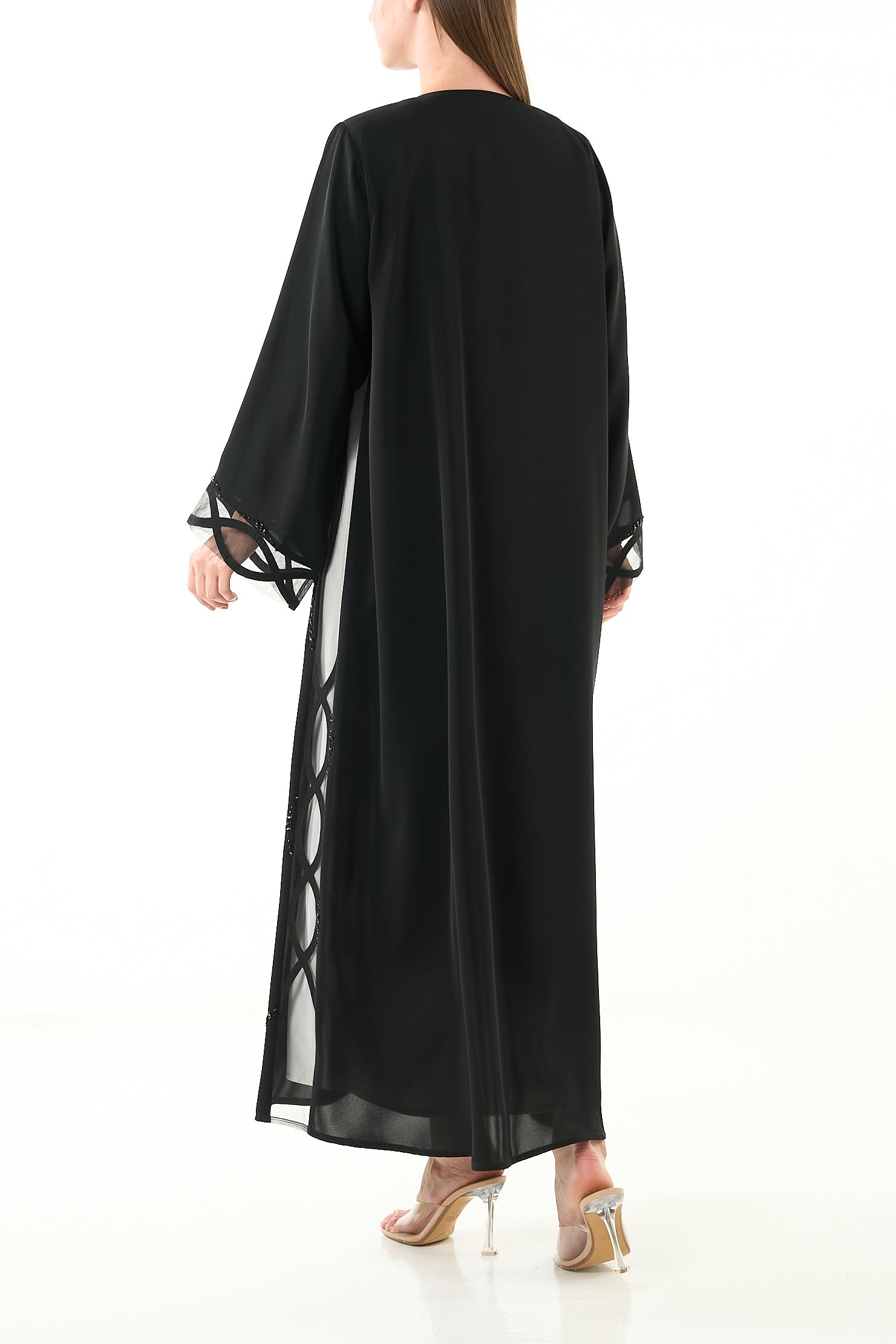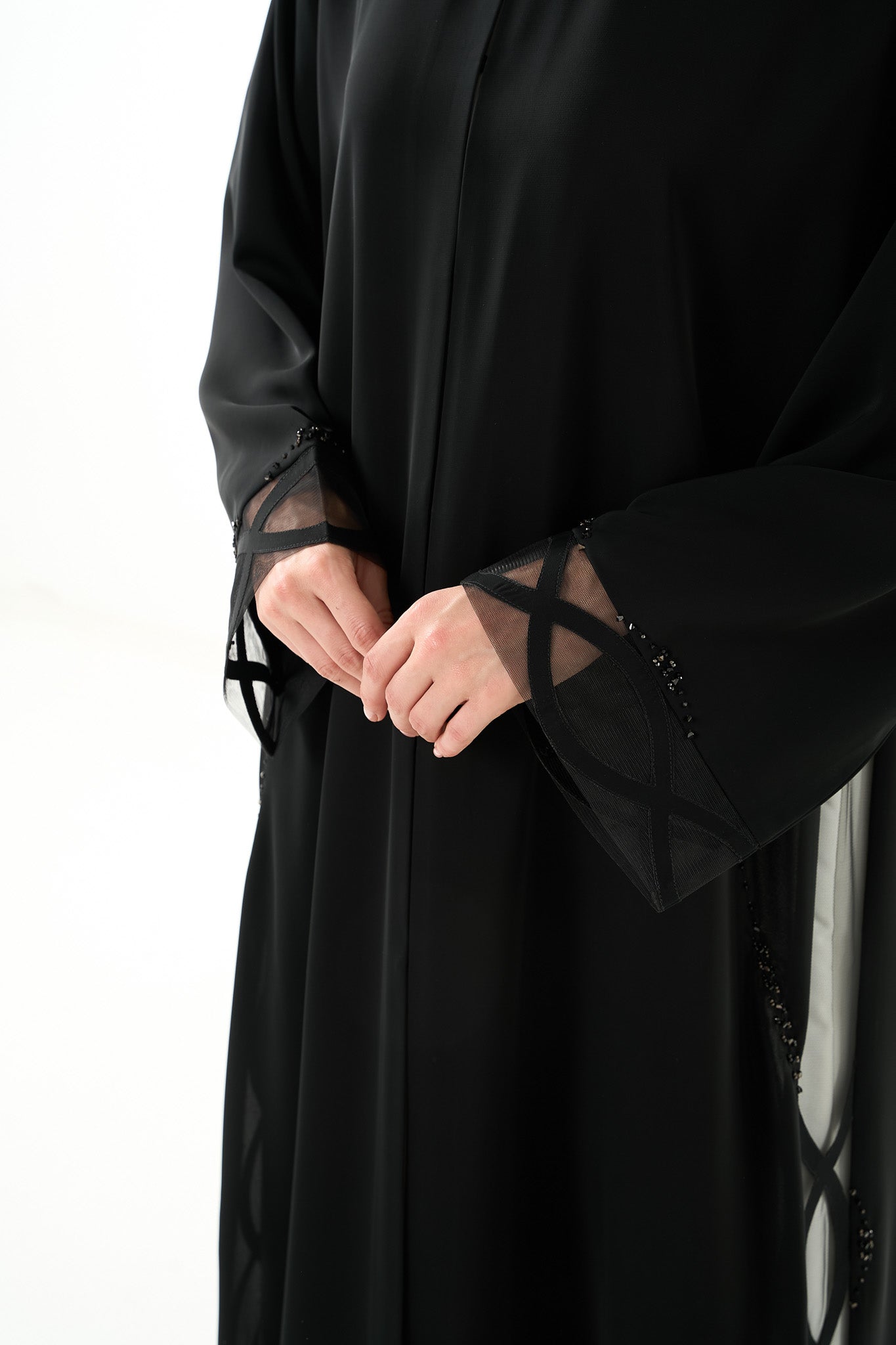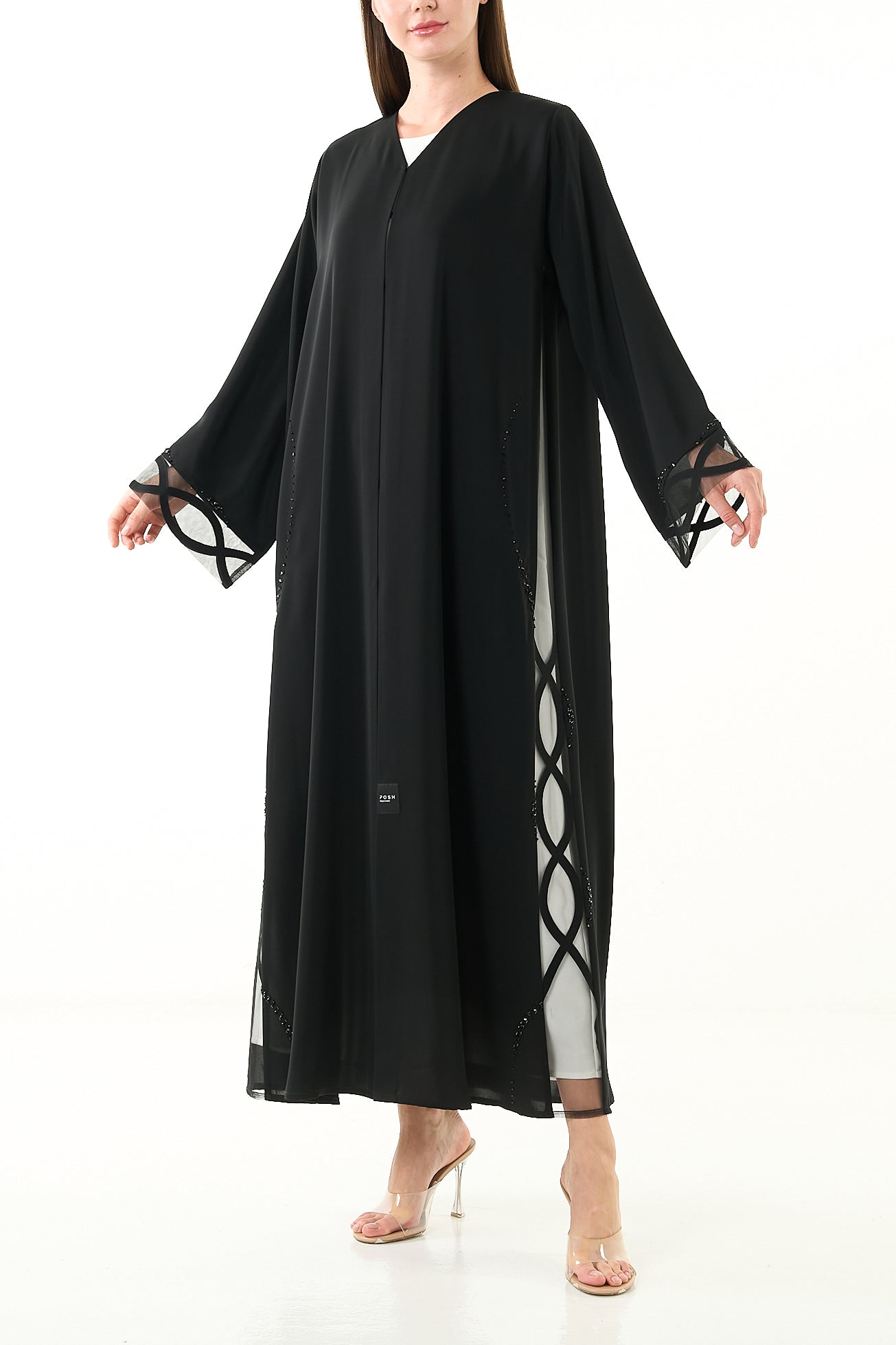 Details like laser-cut edging and structured finishing reflect premium craftsmanship. The beadwork includes black and brown "samoosa" and "tire" elements with subtle elevation, making this abaya ideal for evening events and gatherings. The V-neckline is reinforced with double-folded net, and the hemline carries a polished hand-stitched finish. Snap buttons are neatly placed down the front for practicality.