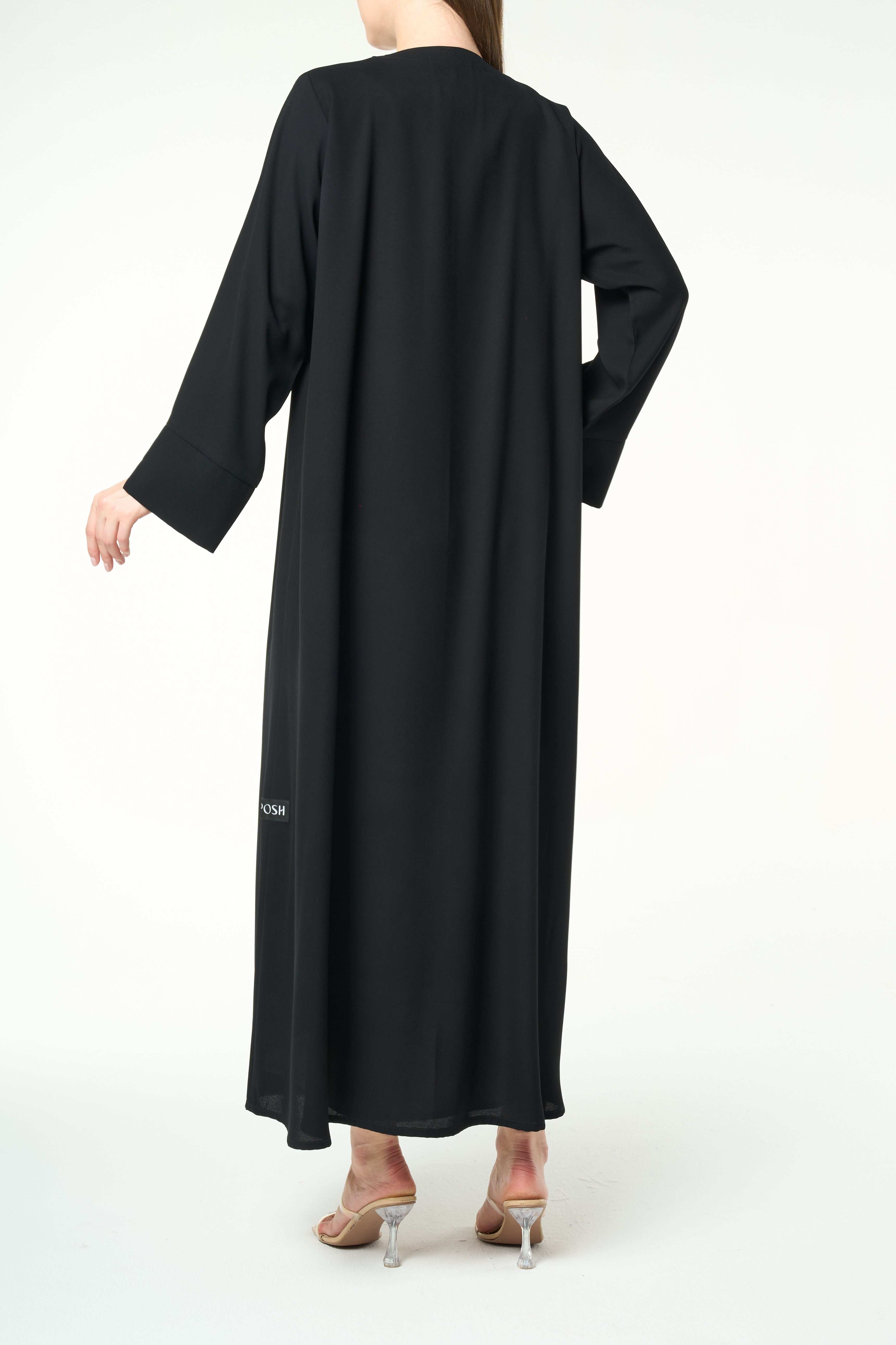 The fabric’s soft drape and matte texture make it ideal for all-day comfort, while the structured overlap cuff adds polish. With precise topstitch detailing and a perfectly balanced cut, this abaya transitions seamlessly between professional and social settings — an understated wardrobe staple for refined, everyday wear.