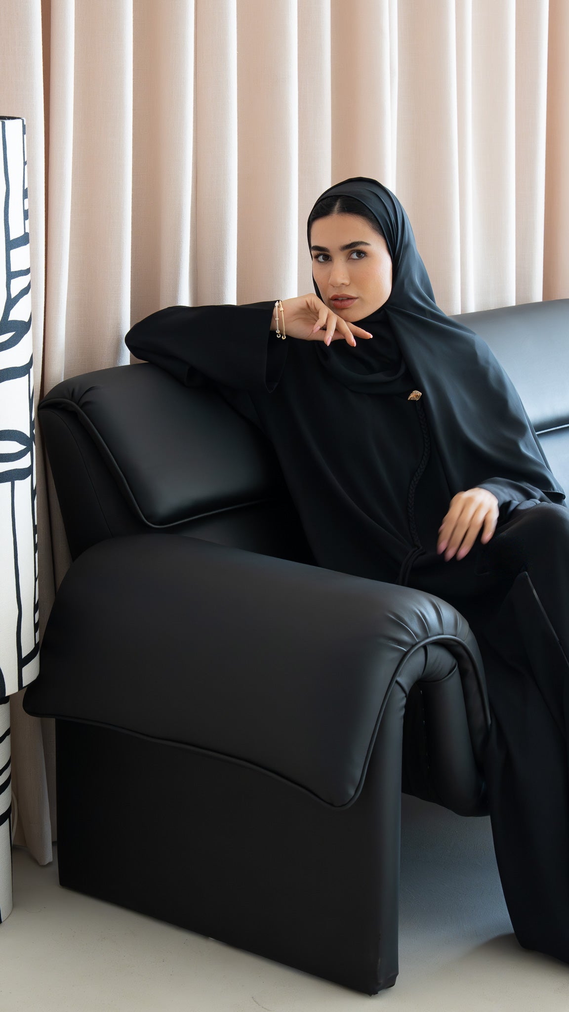 A sleek black abaya tailored in Jaime Crepe, defined by its signature braided dori detail that descends elegantly from the neckline. Cut in a fluid KLOSH silhouette, the piece drapes beautifully while maintaining structure for all-day wear.