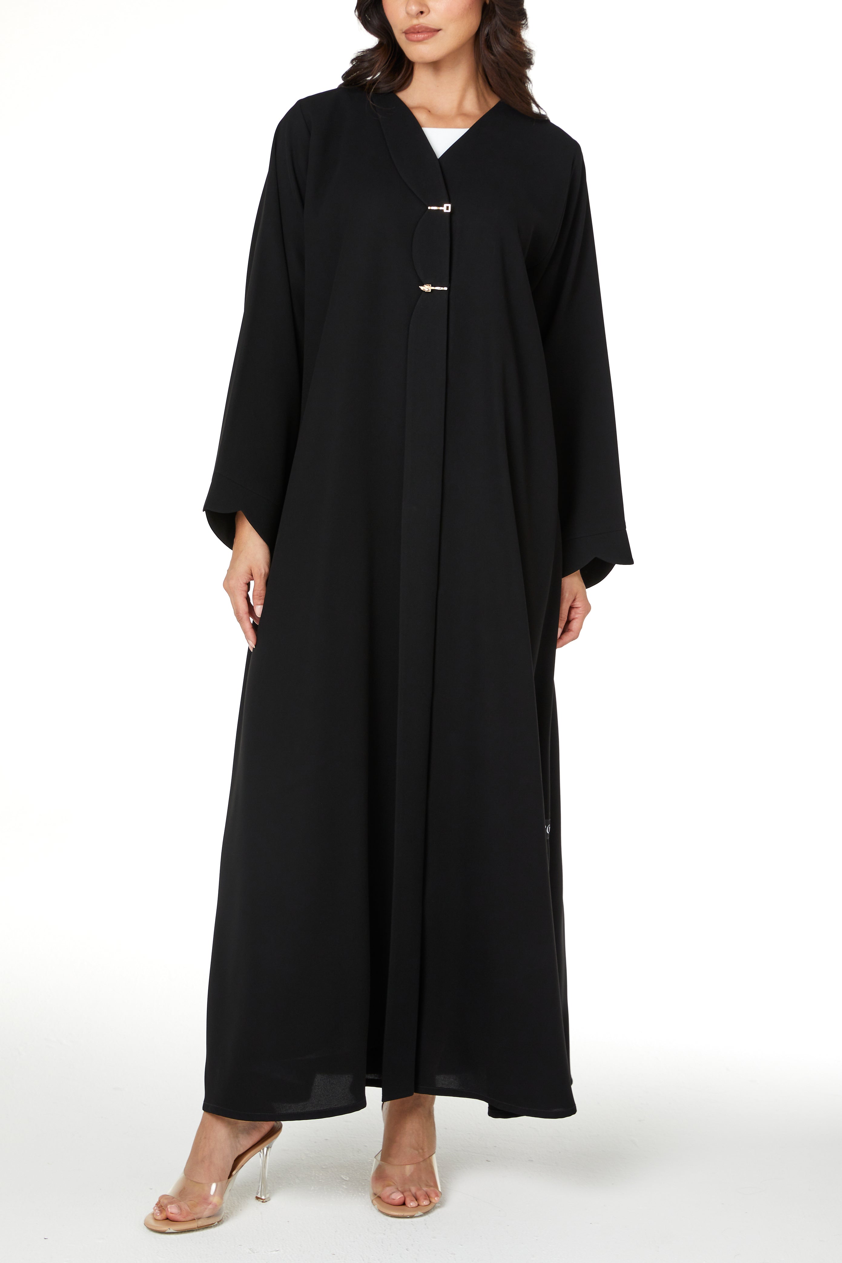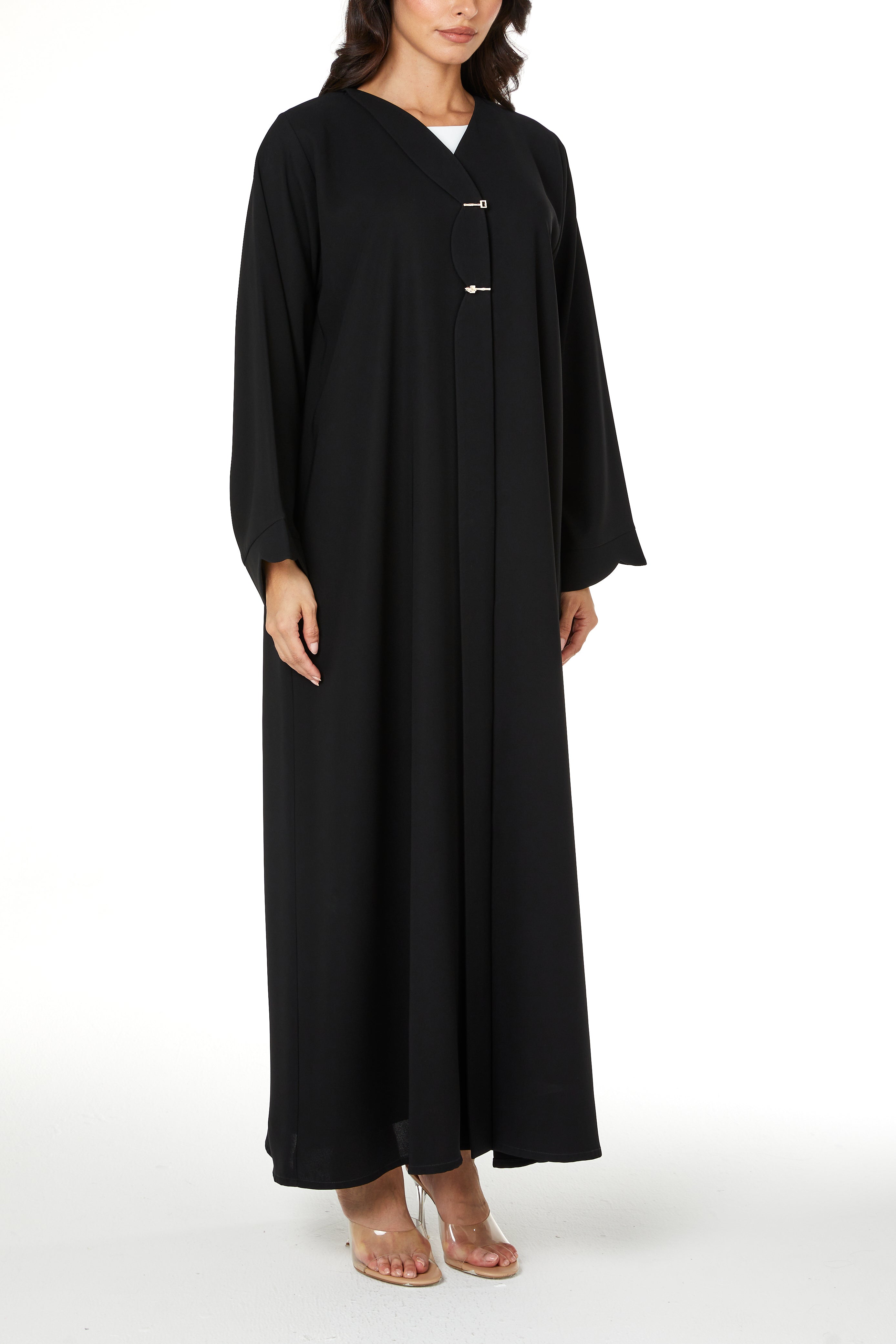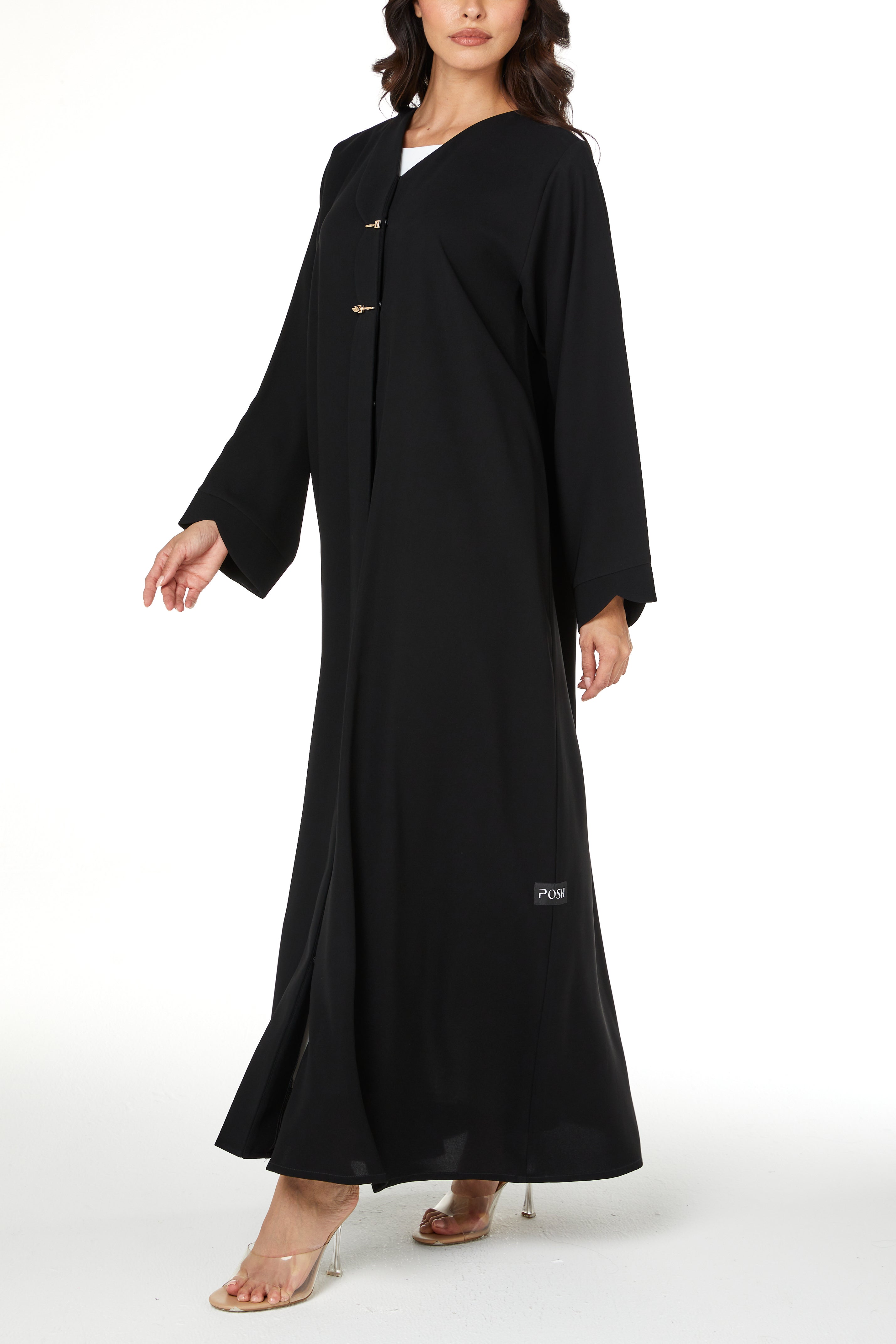 The front is finished with a clean decorative button detail placed at the upper bodice, adding subtle structure and visual interest without moving away from the abaya’s minimal character. The neckline remains simple and balanced, keeping the overall look neat and professional. Sleeves are cleanly finished for comfort and durability throughout the day.