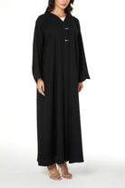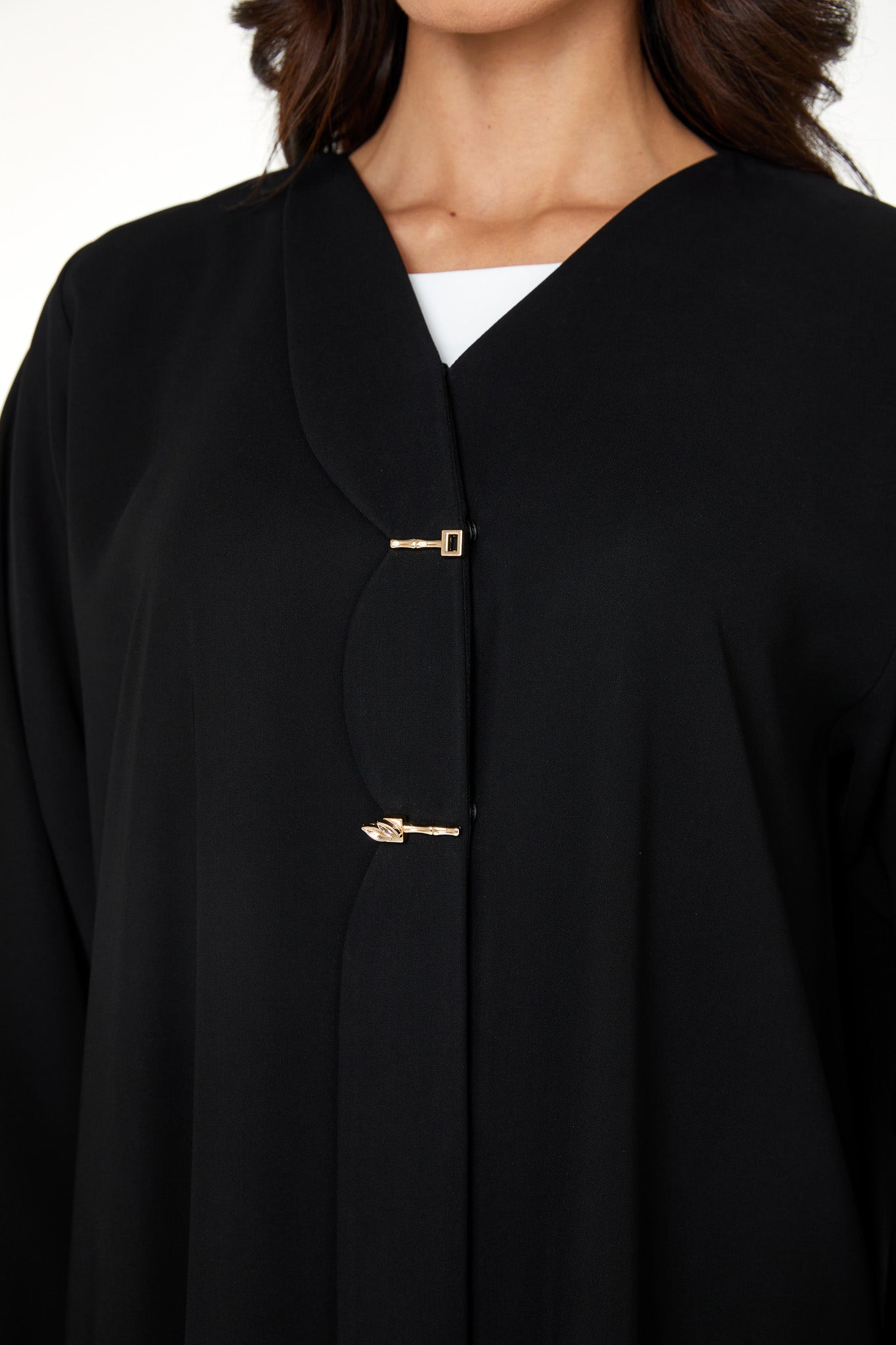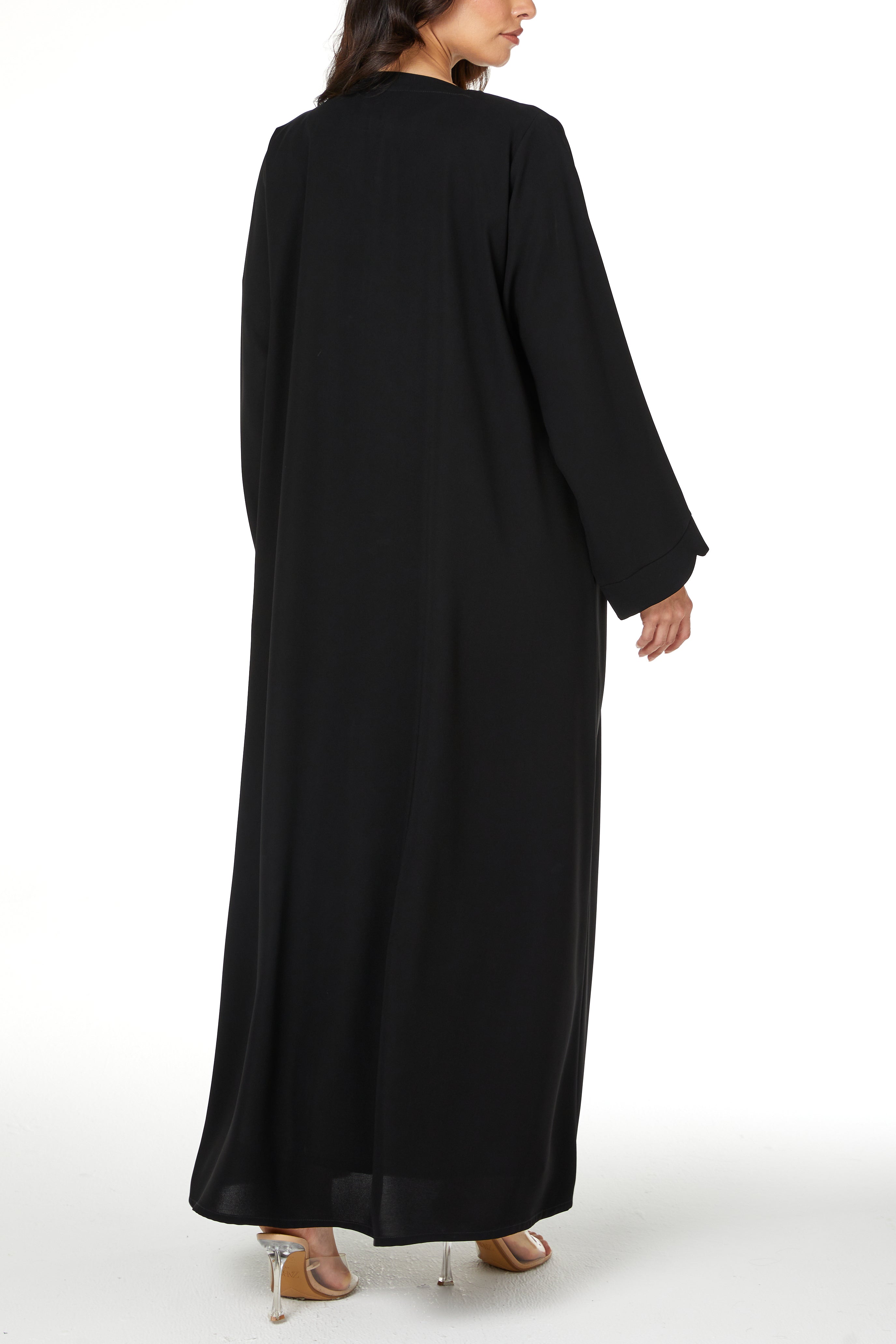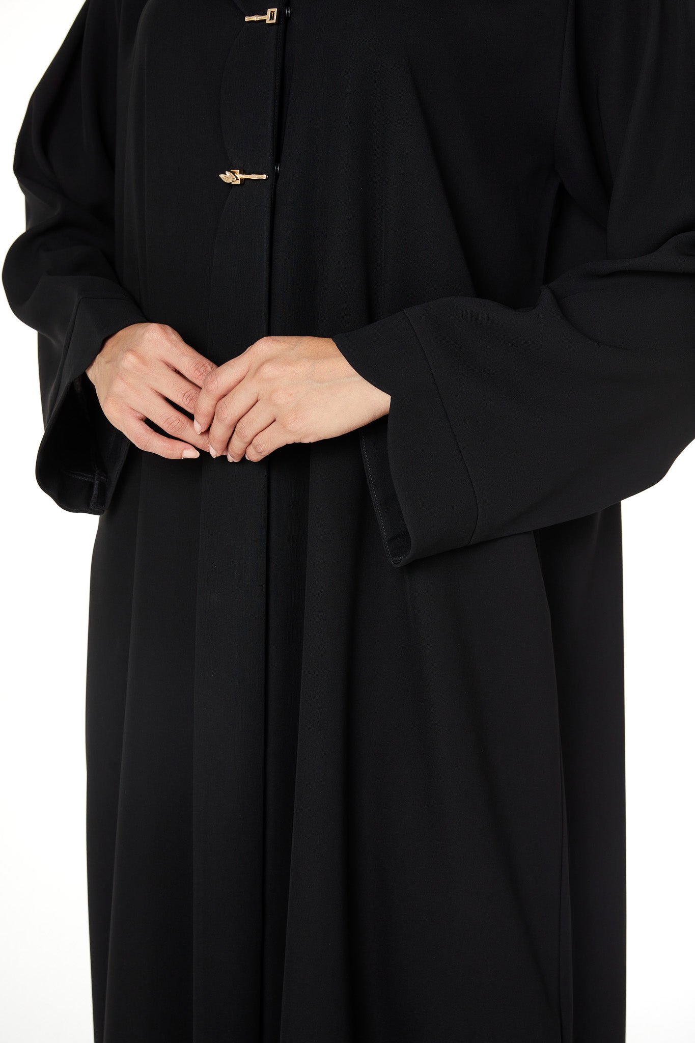 The front is finished with a clean decorative button detail placed at the upper bodice, adding subtle structure and visual interest without moving away from the abaya’s minimal character. The neckline remains simple and balanced, keeping the overall look neat and professional. Sleeves are cleanly finished for comfort and durability throughout the day.