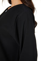 A refined black abaya crafted from lightweight Jaime Crepe, designed for everyday wear with a polished and composed appearance. The KLOSH cut introduces a gentle flare from the waist, allowing comfortable movement while maintaining modest coverage.