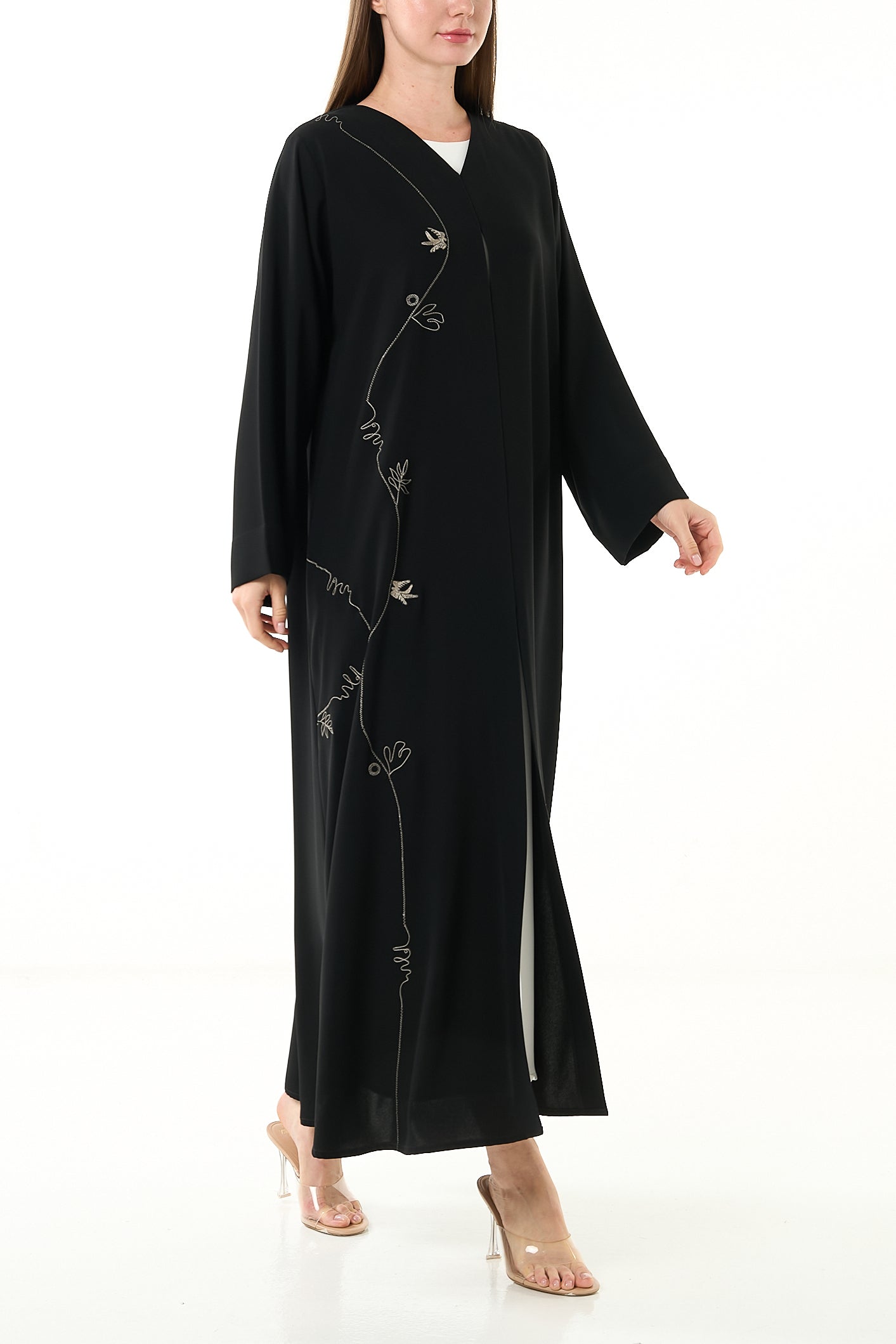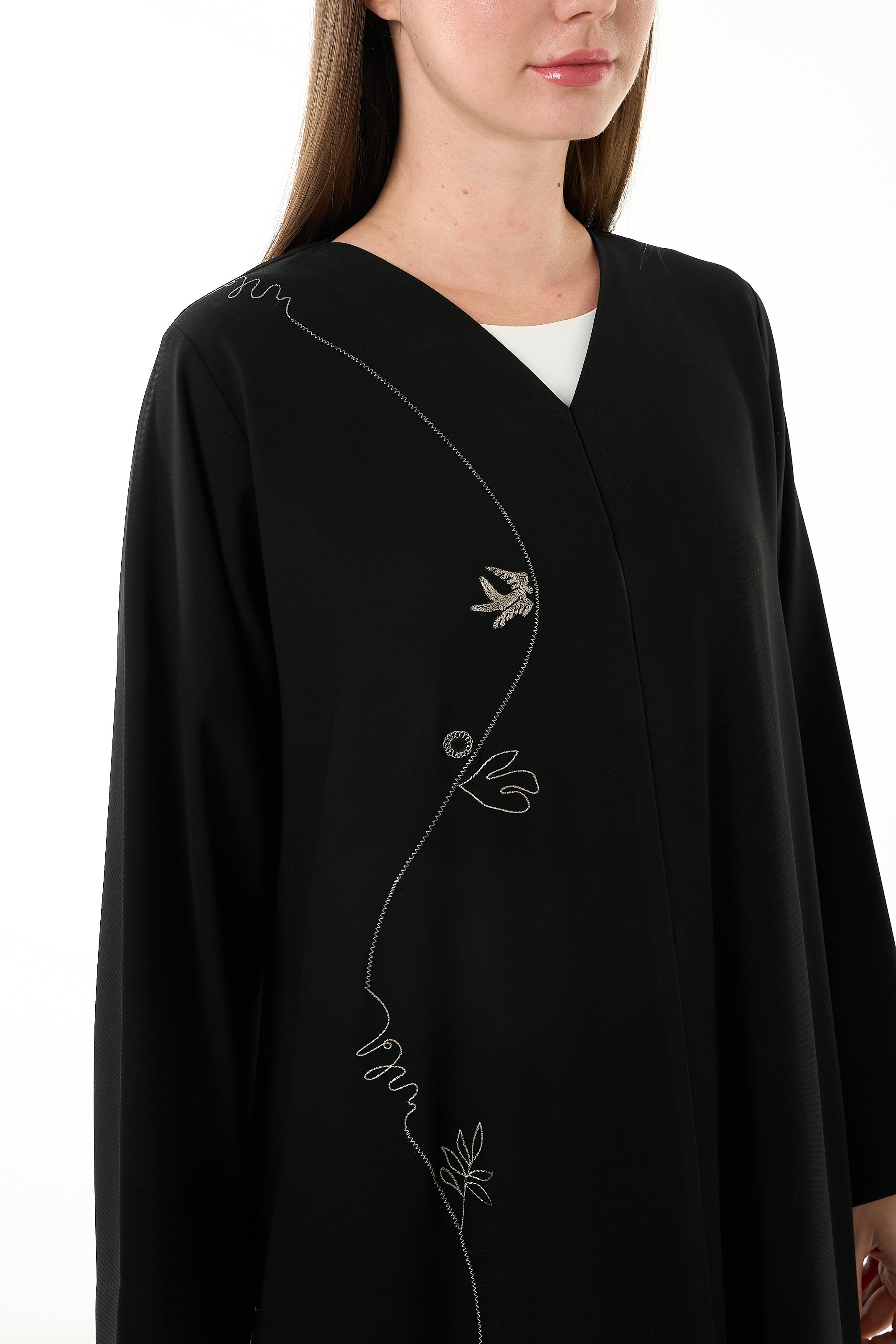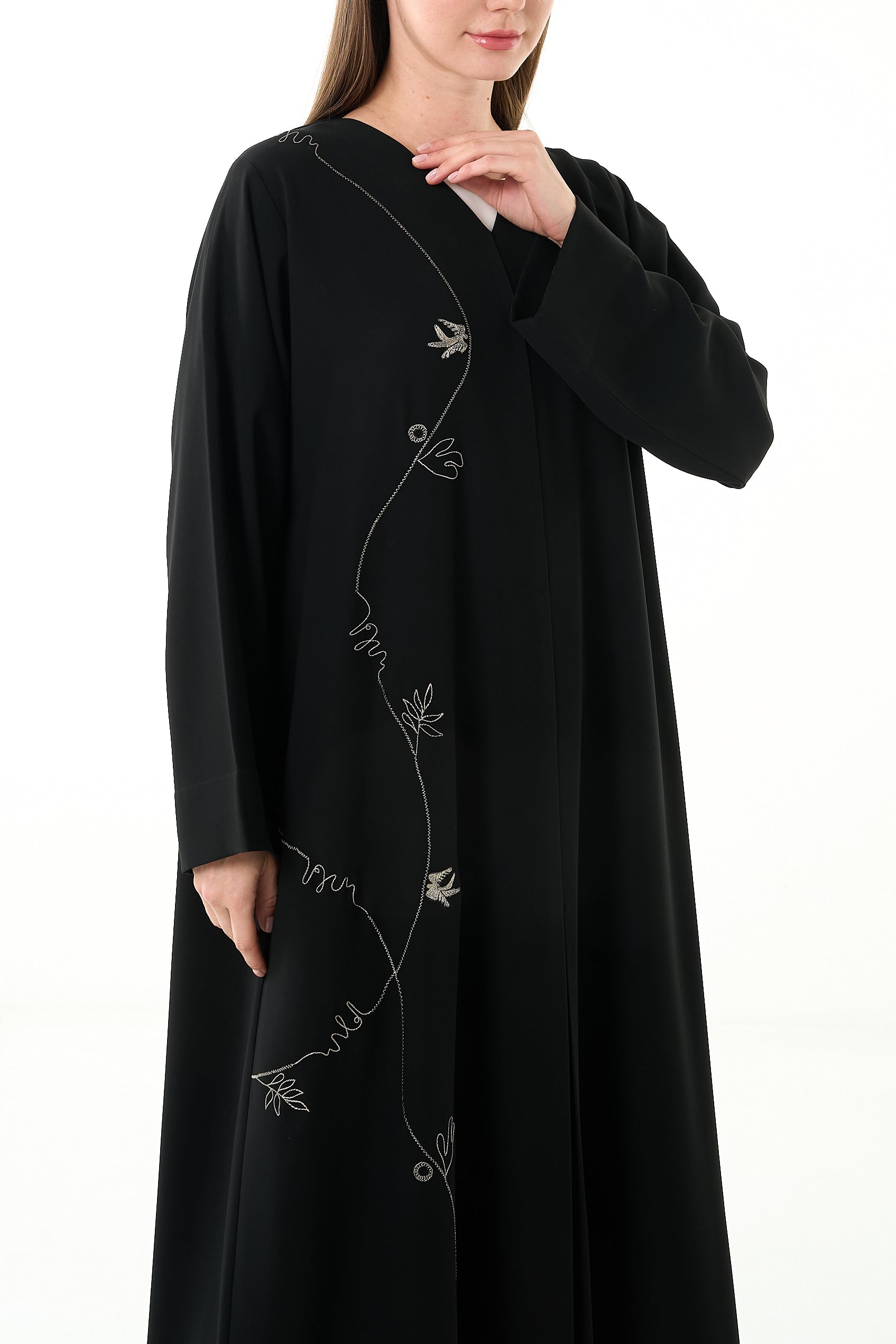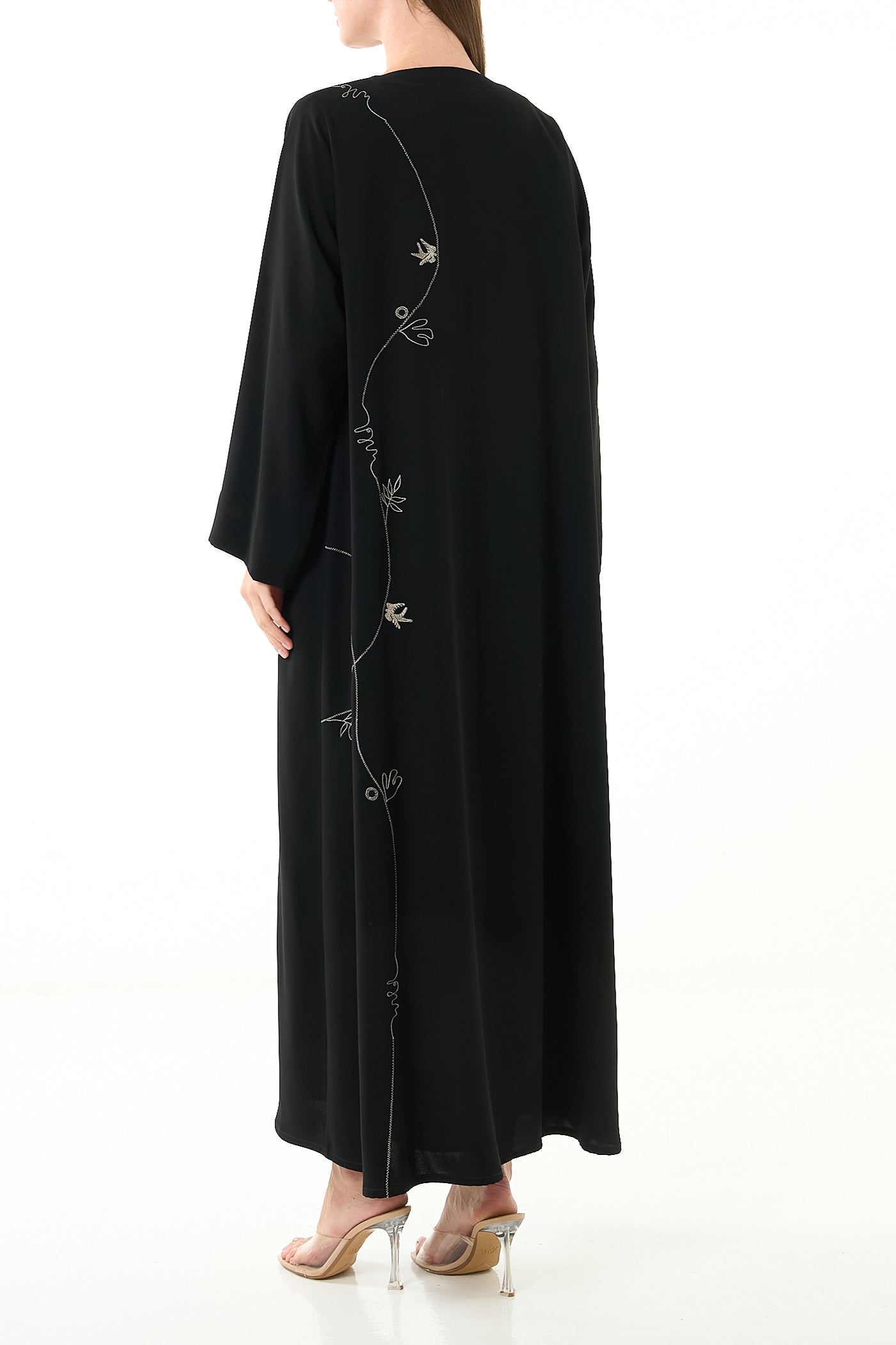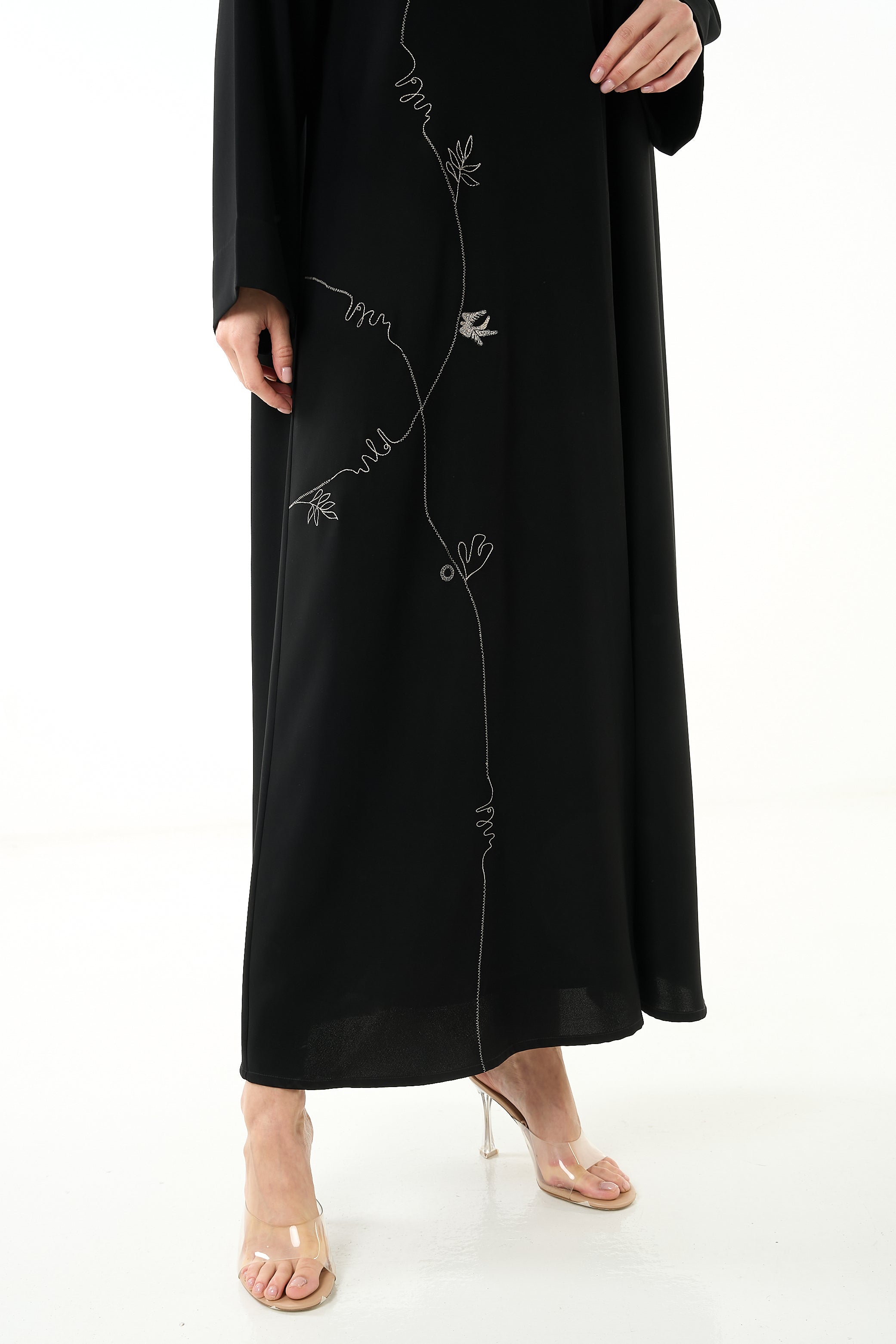 Black Jaime Crepe Abaya with Klosh Cut and Front Embroidery Detail