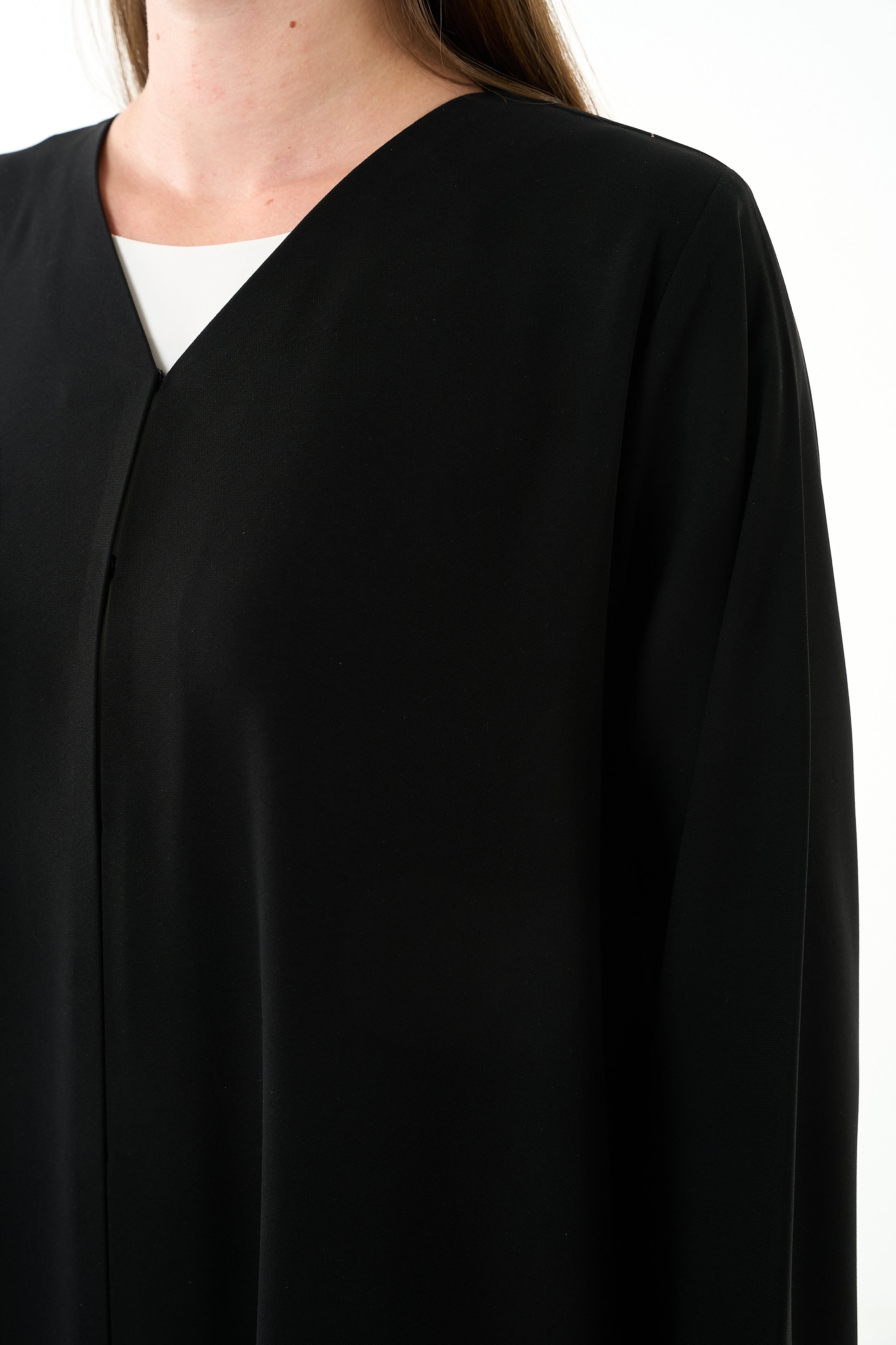 This black abaya is made from Jaime Crepe — a medium-weight fabric known for its soft structure and breathable comfort. It offers full coverage and a smooth silhouette with lasting wearability.