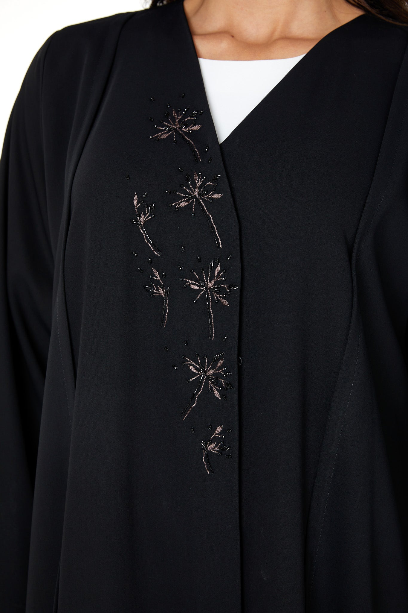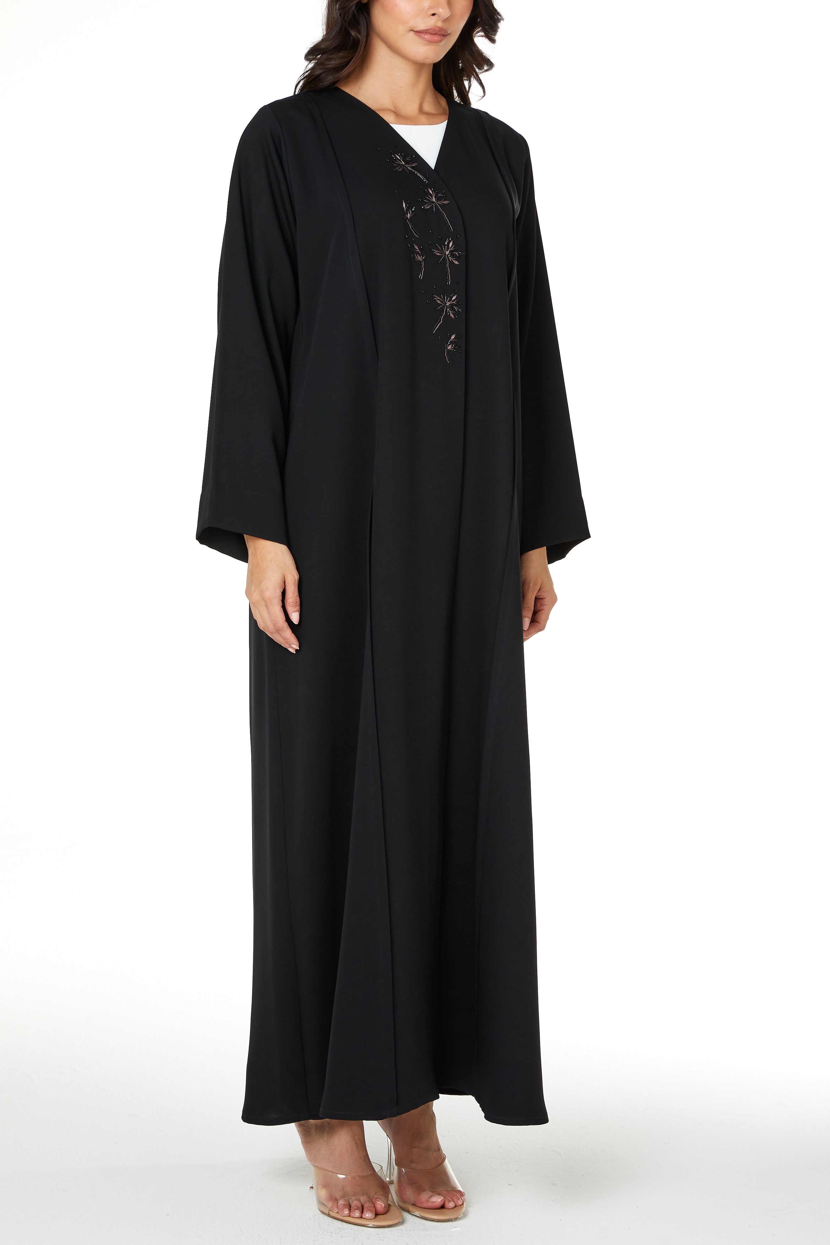 Delicate beadwork is placed along the front panel near the neckline, arranged in a vertical formation. The beadwork adds a refined highlight without overpowering the abaya, keeping the overall look polished and suitable for both daytime and evening occasions.