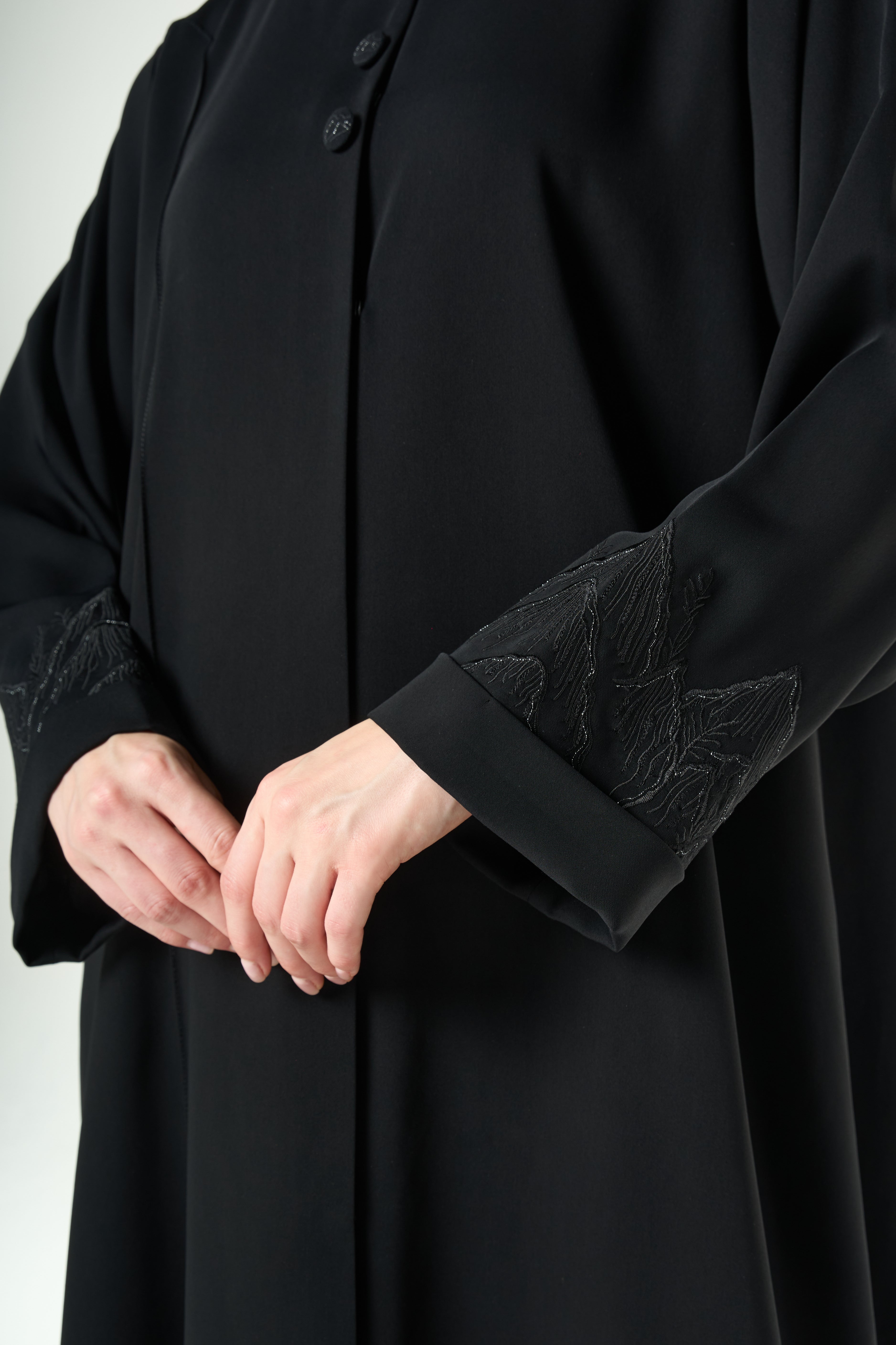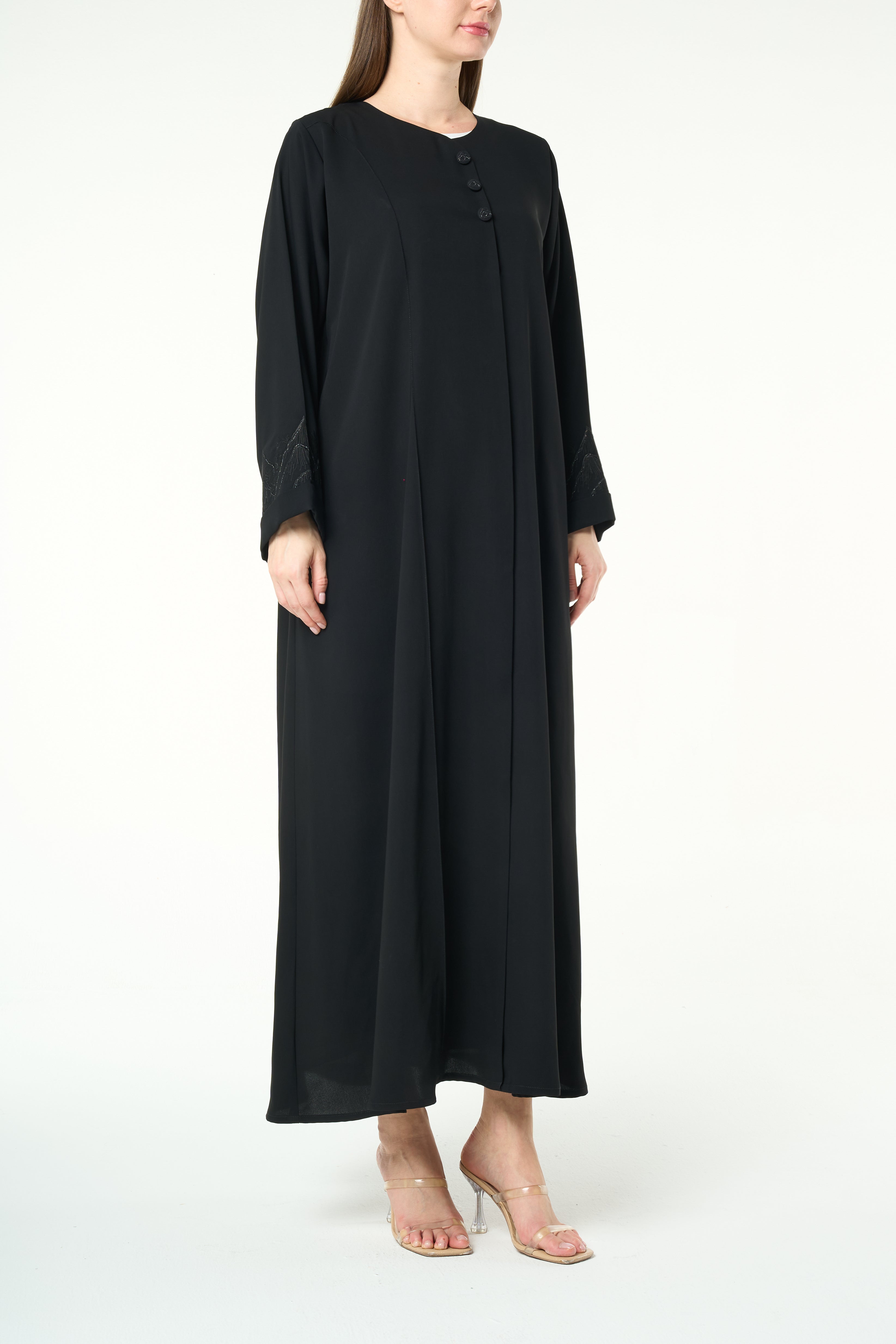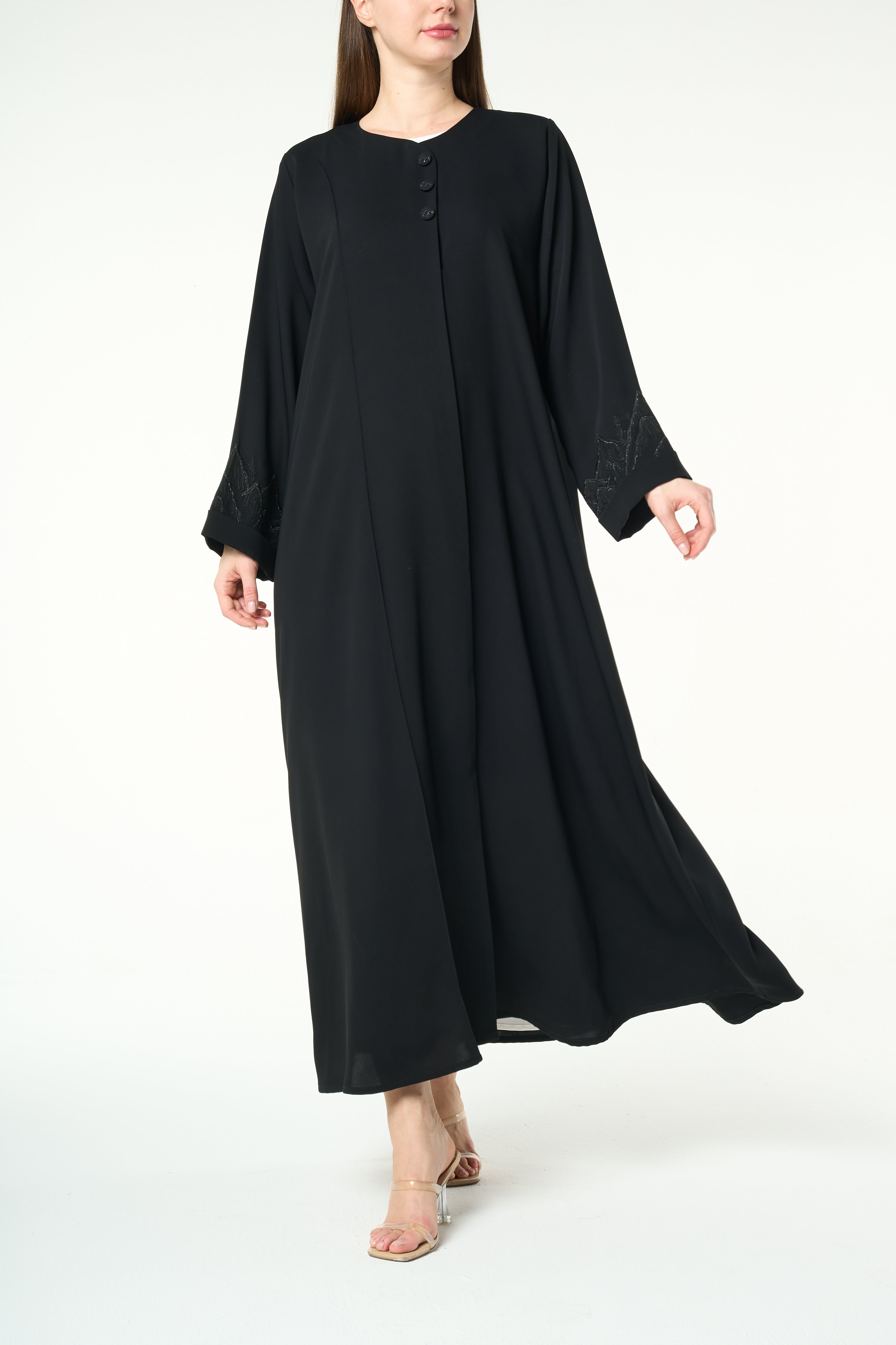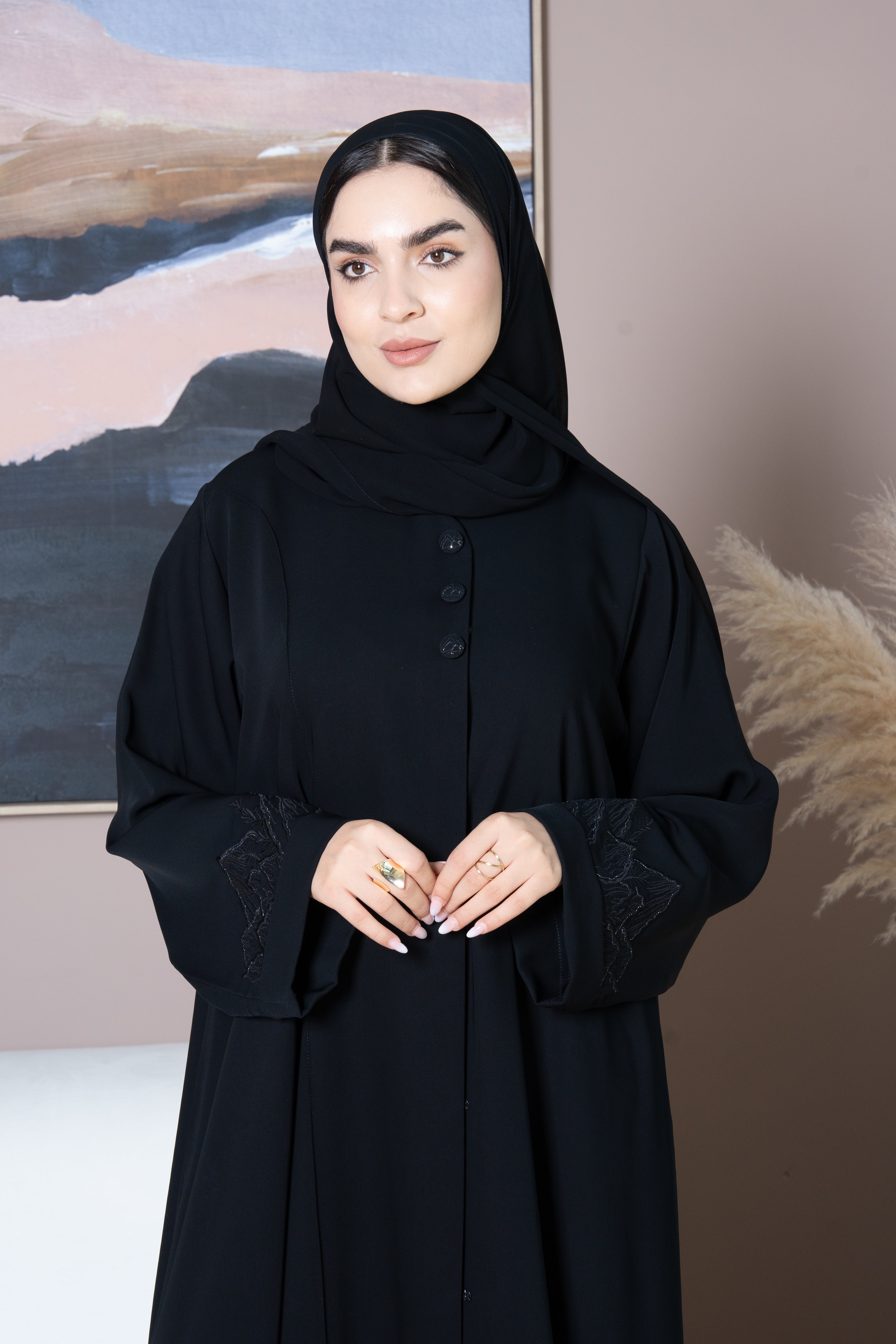 The highlight of this design is the textured tonal embroidery placed along the sleeve hem — a subtle, mountain-inspired pattern that adds depth while keeping the abaya beautifully understated. The front features a row of fabric-covered show buttons, enhancing the refined look without adding weight or shine. Together, these details create a piece that feels modern, elegant, and effortlessly modest.