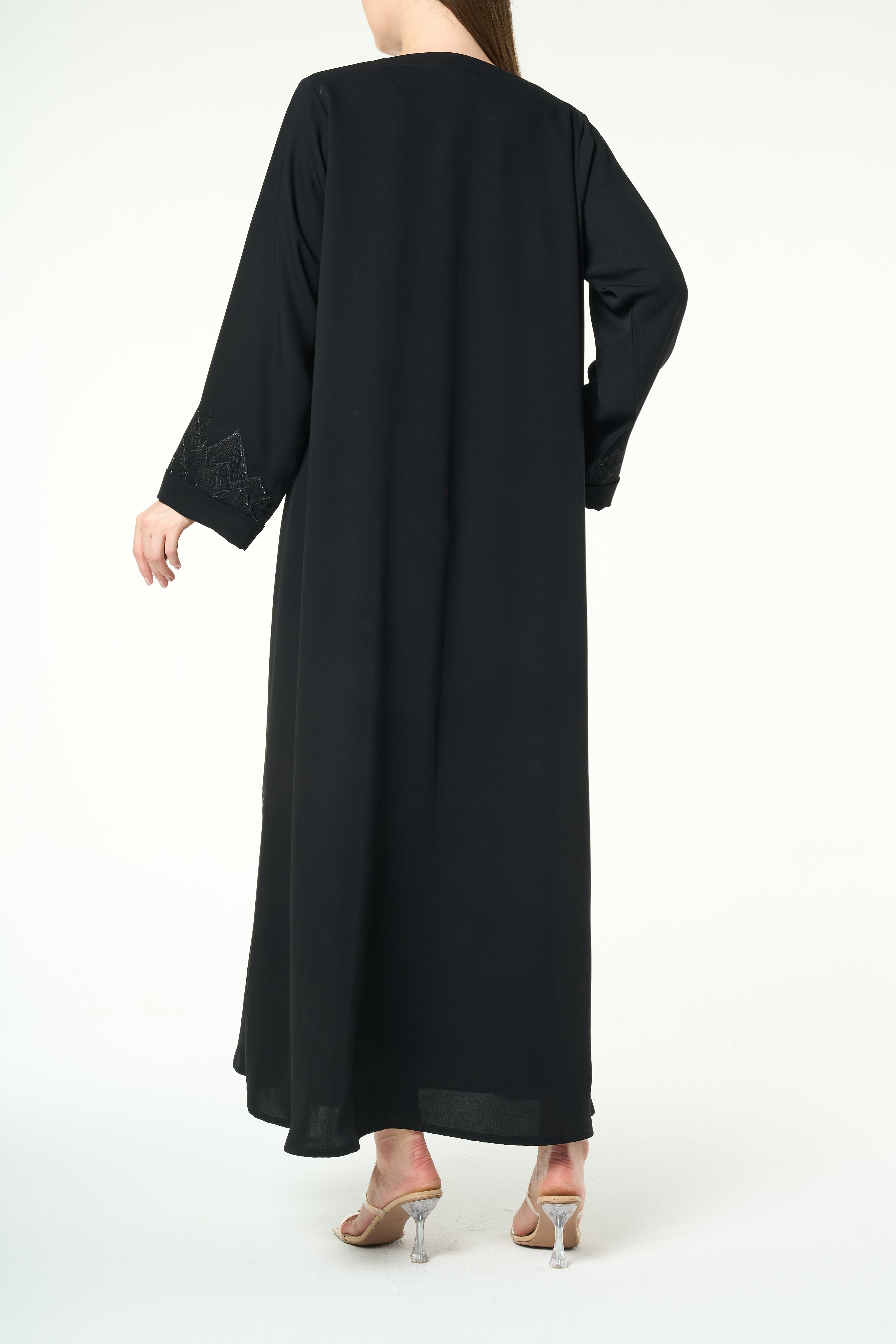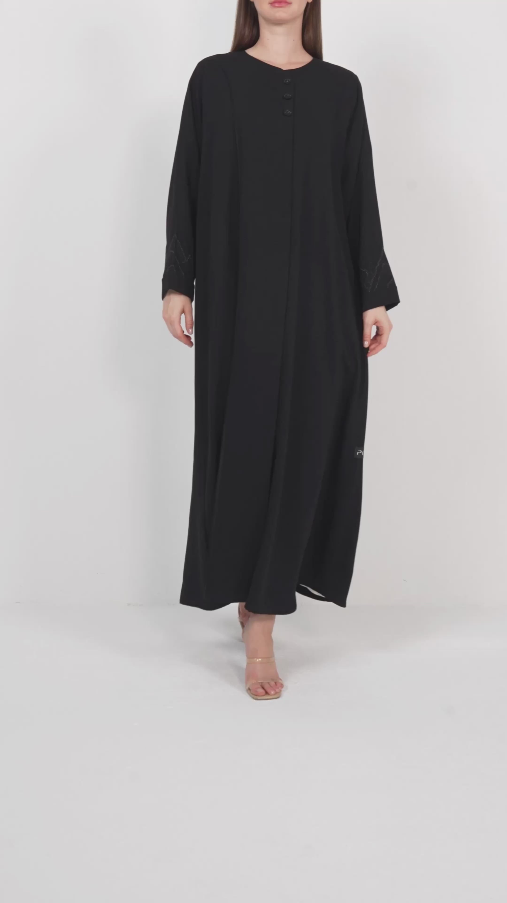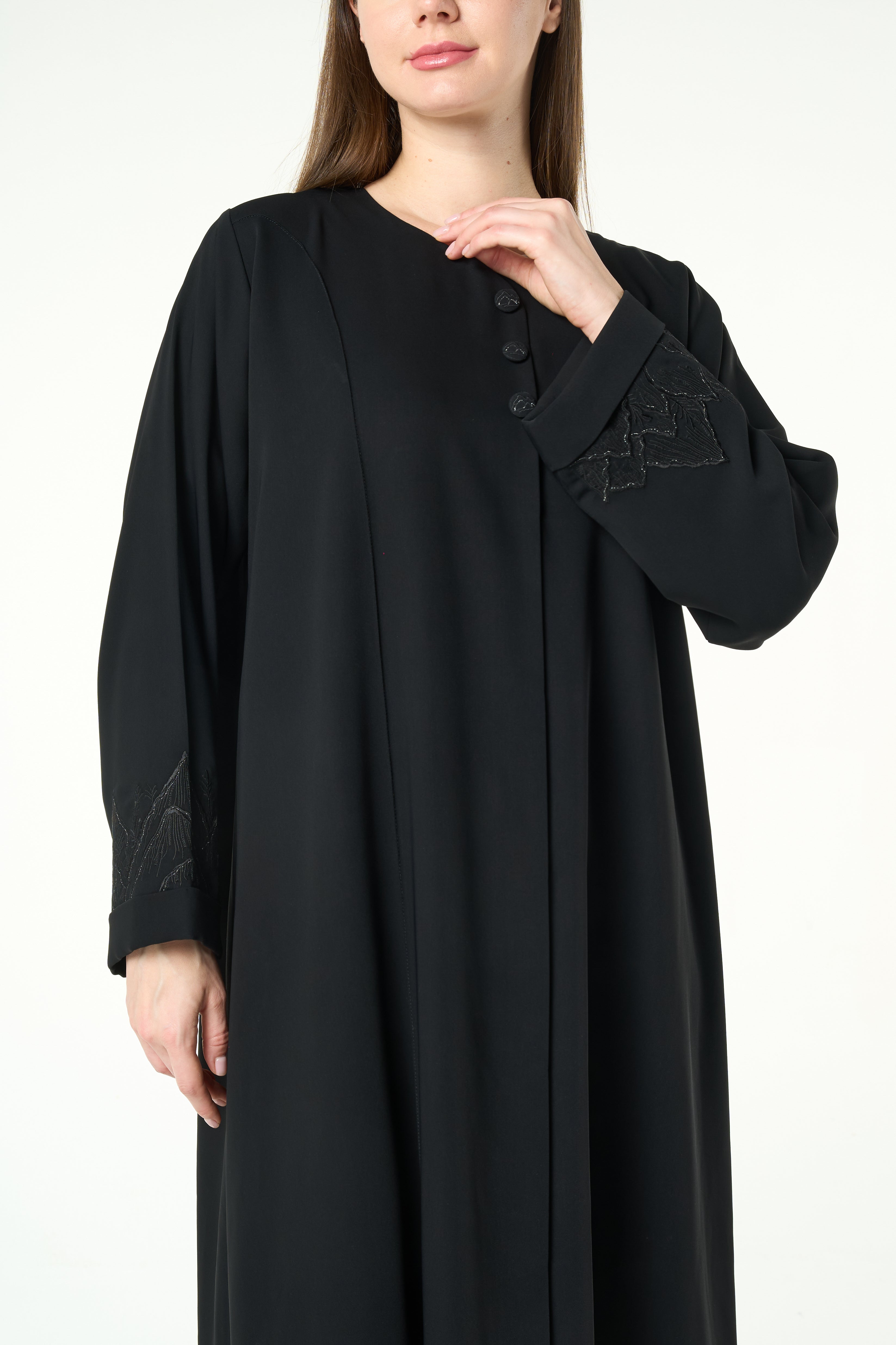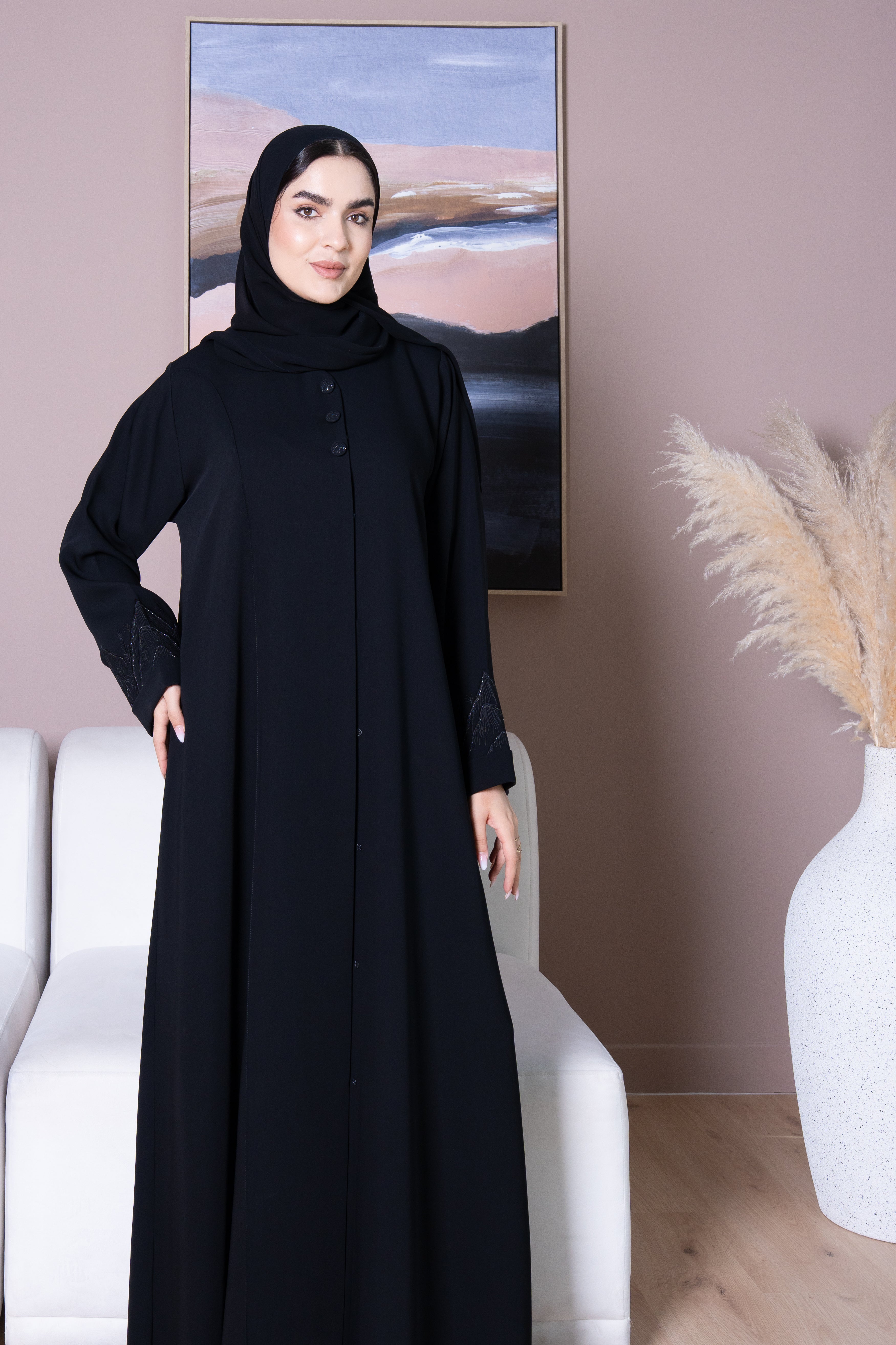 The highlight of this design is the textured tonal embroidery placed along the sleeve hem — a subtle, mountain-inspired pattern that adds depth while keeping the abaya beautifully understated. The front features a row of fabric-covered show buttons, enhancing the refined look without adding weight or shine. Together, these details create a piece that feels modern, elegant, and effortlessly modest.