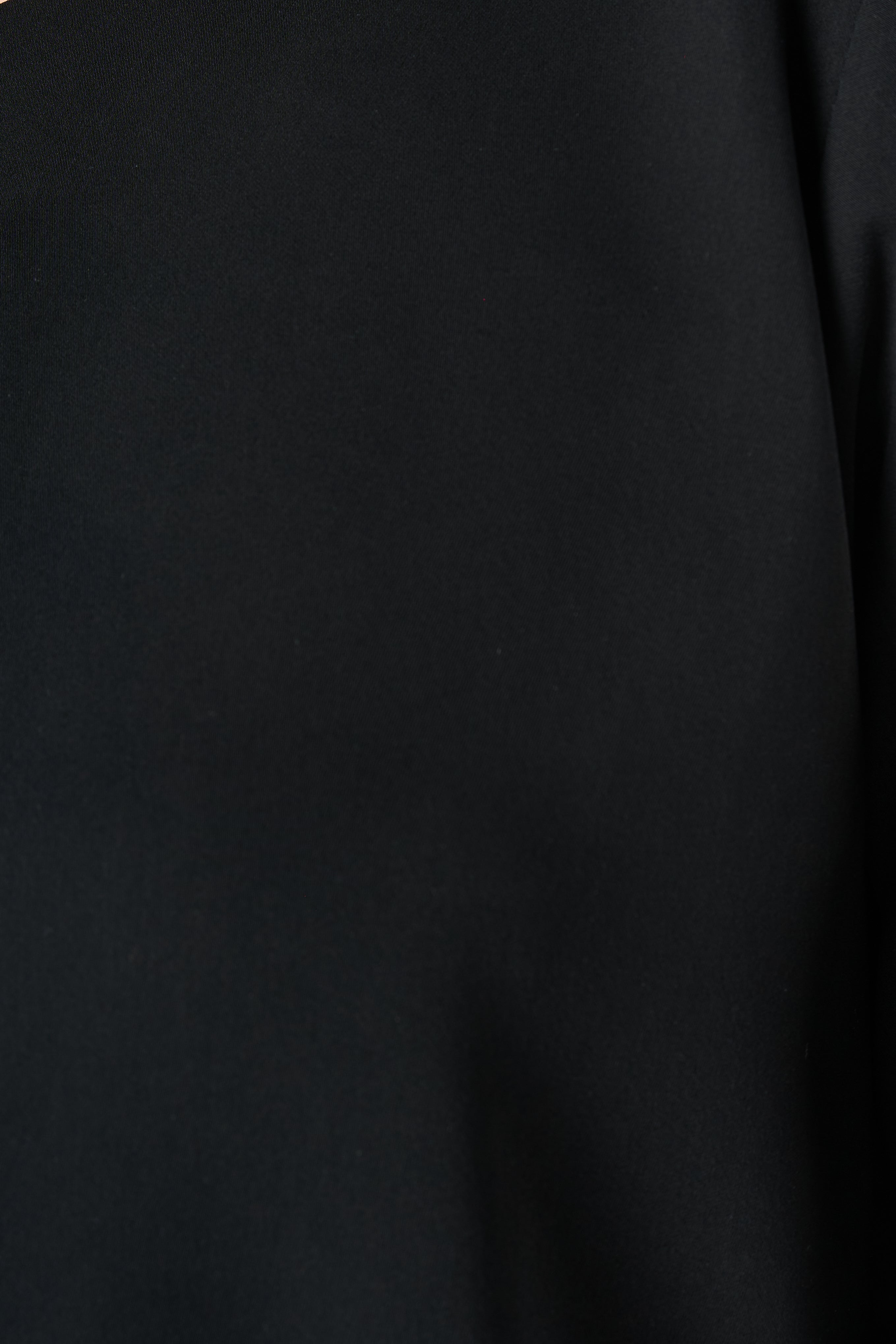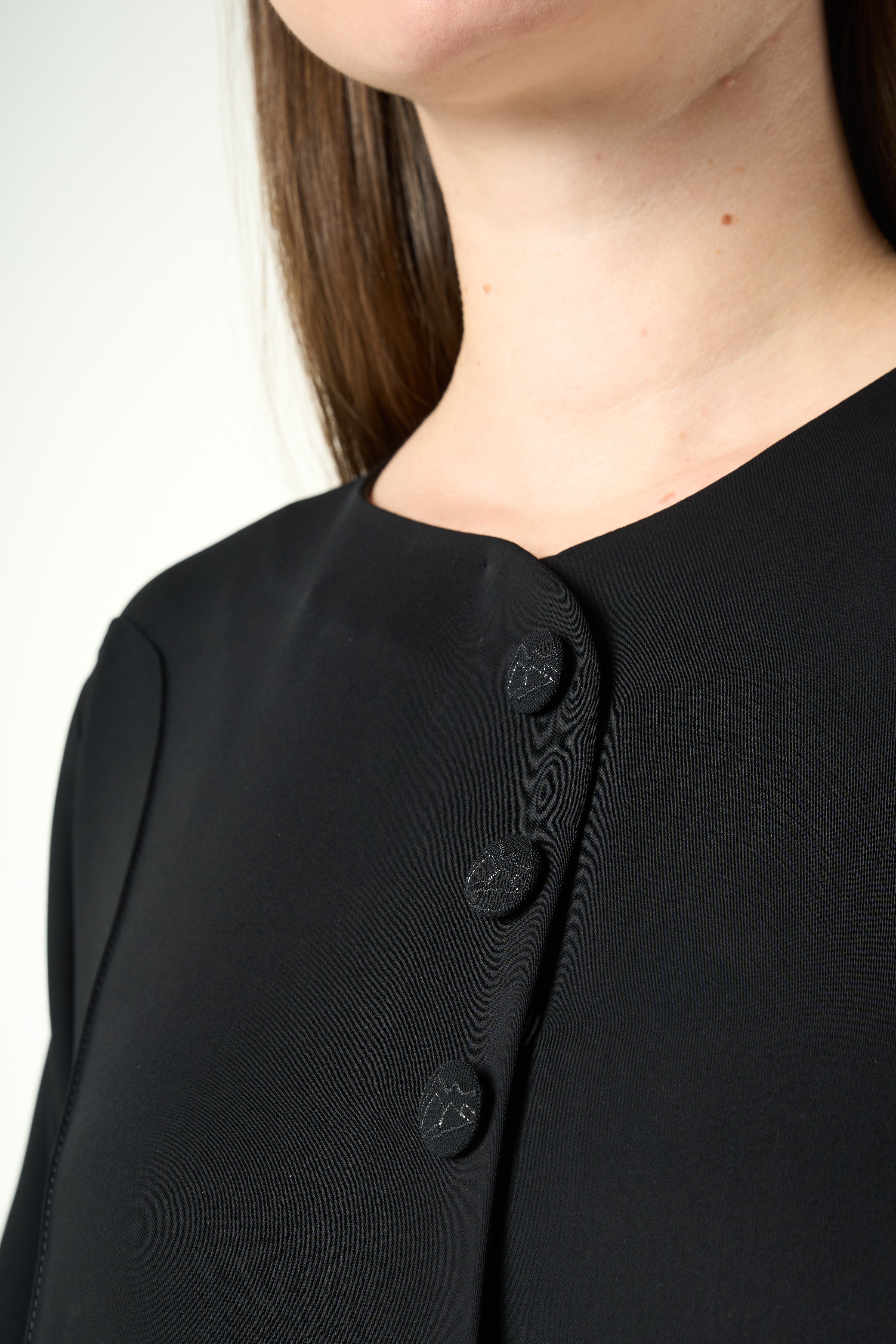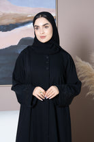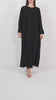 A sophisticated black abaya crafted from soft and breathable Layan Crepe, designed in a graceful KLOSH silhouette for a fluid, flattering drape. The round neckline and clean front give it a minimal and polished appearance suitable for both daily wear and professional settings.