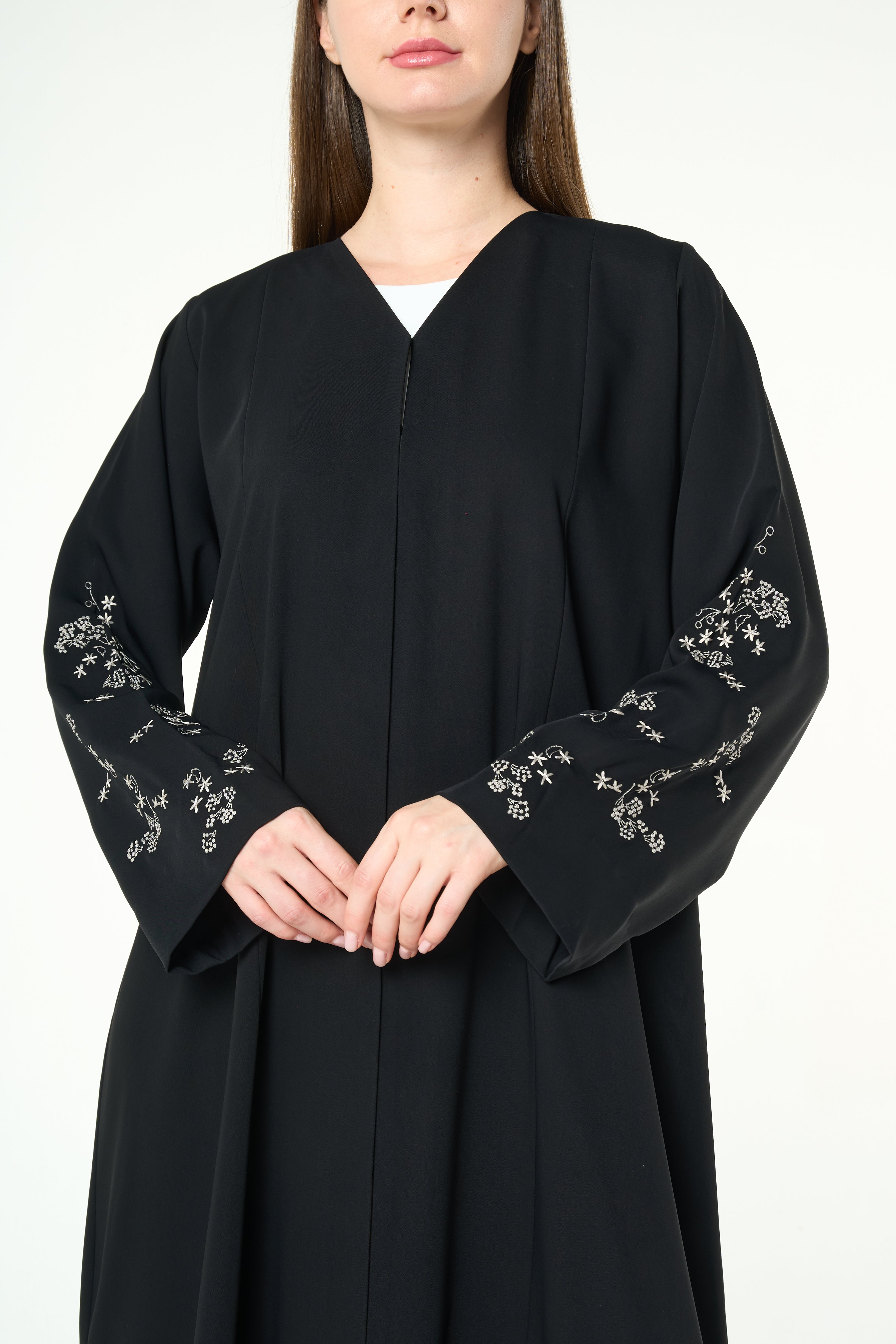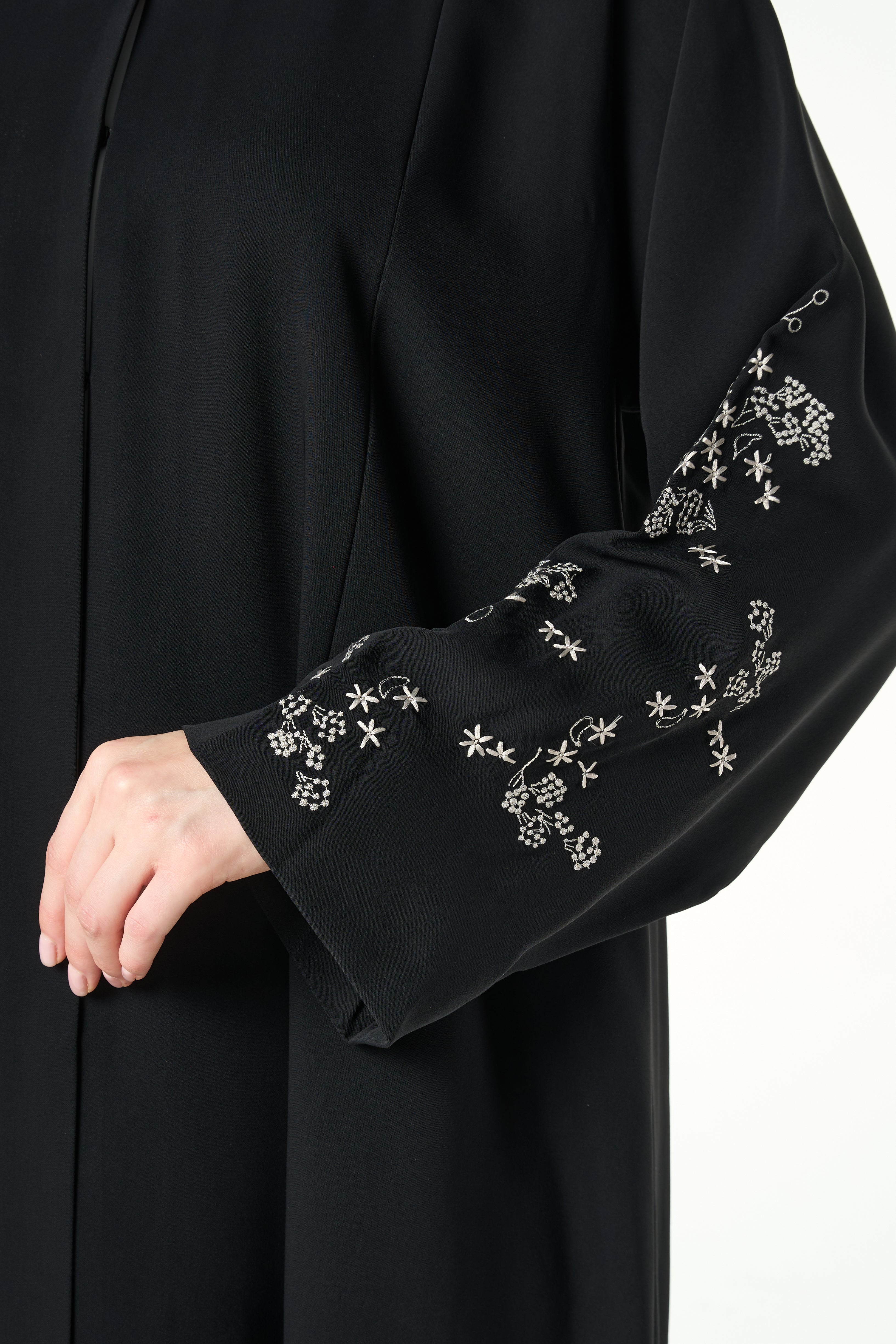 Tonal embroidery is arranged across the lower sleeves in a delicate scattered pattern that adds depth and texture. The artwork sits lightly on the fabric and creates a soft visual interest without adding weight. A neat top stitch at the hem and clean inner finishing maintain a polished look from every angle.