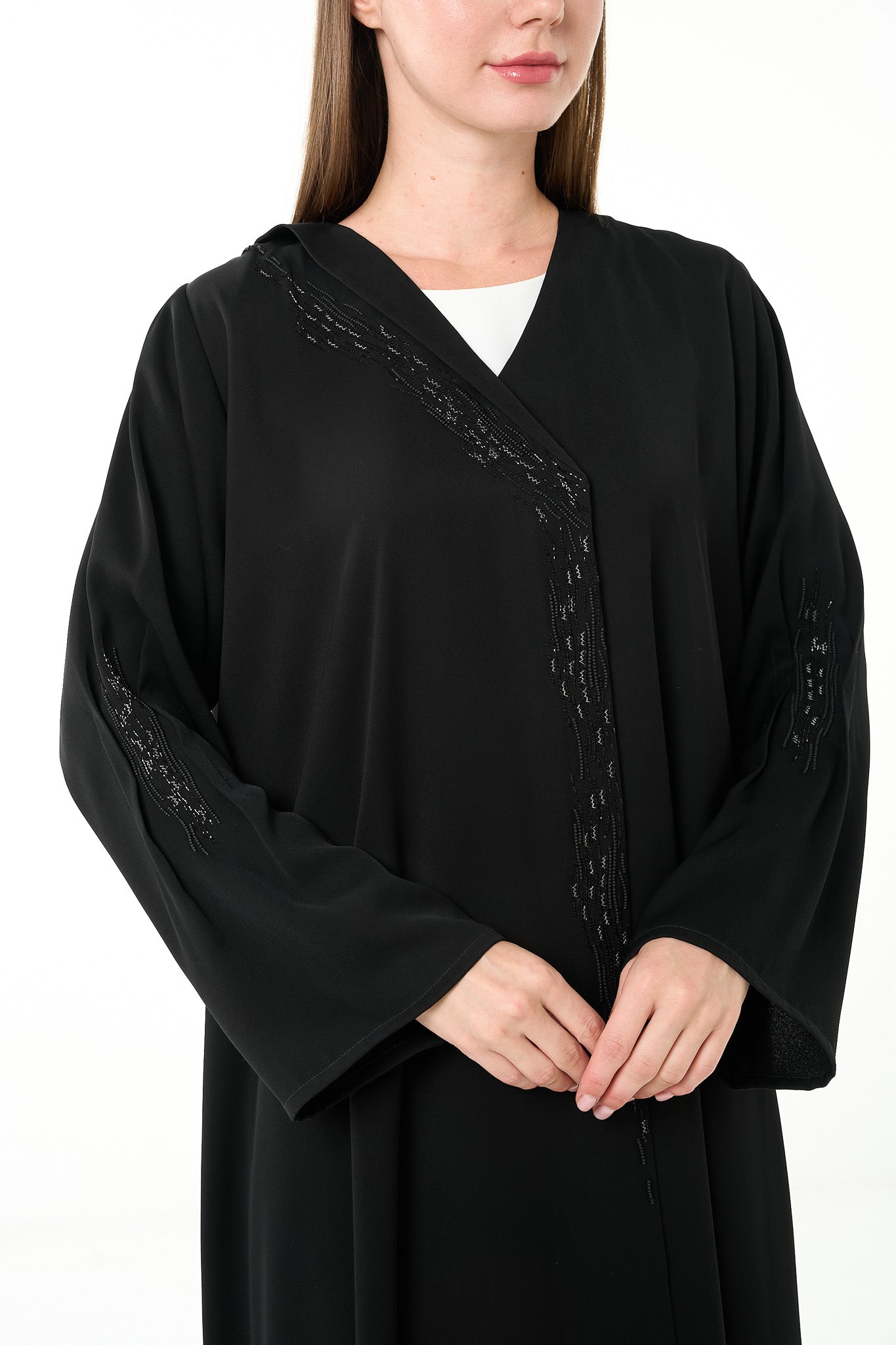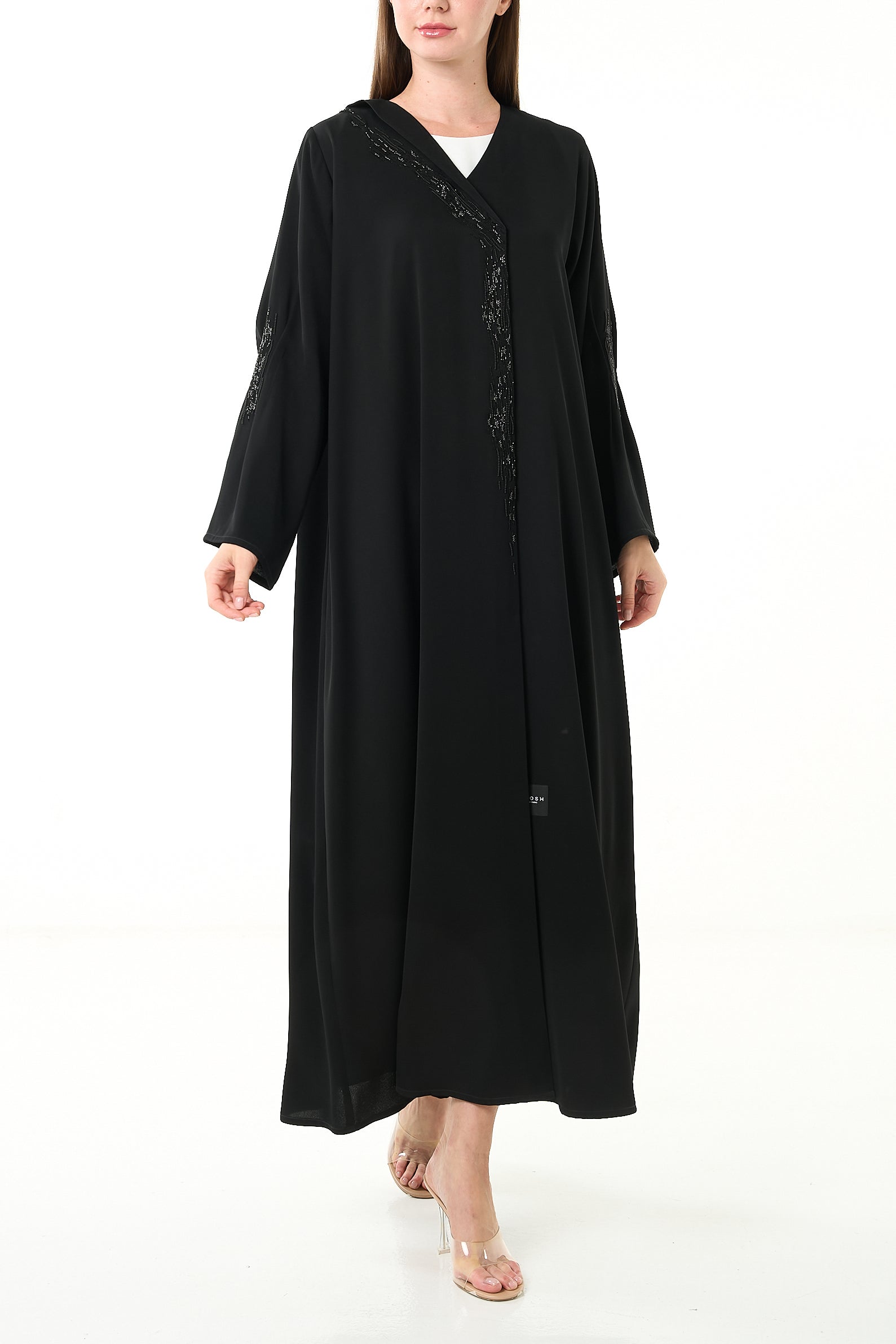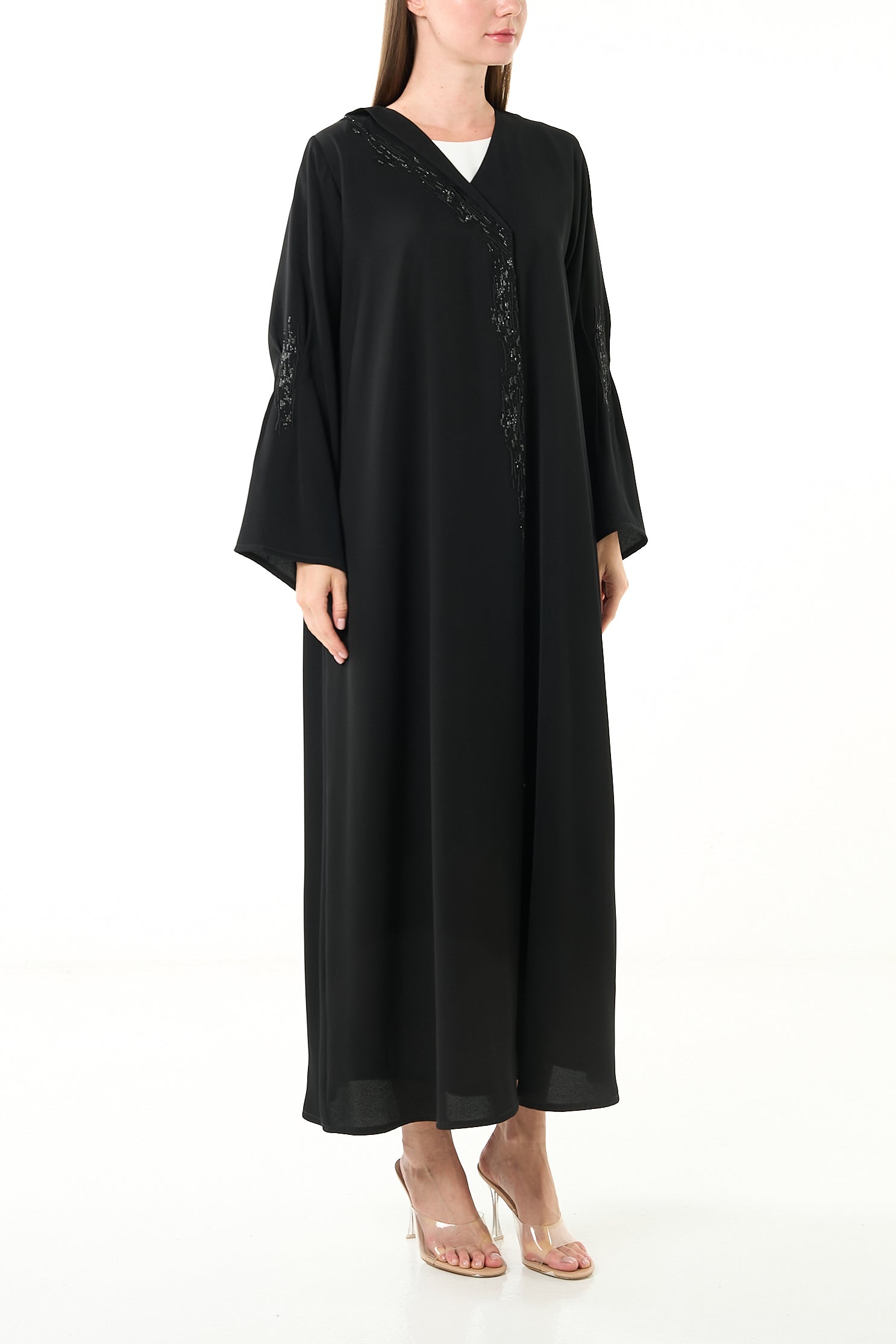 Black Luma Crepe Abaya with Klosh Cut and Front Beadwork Detail