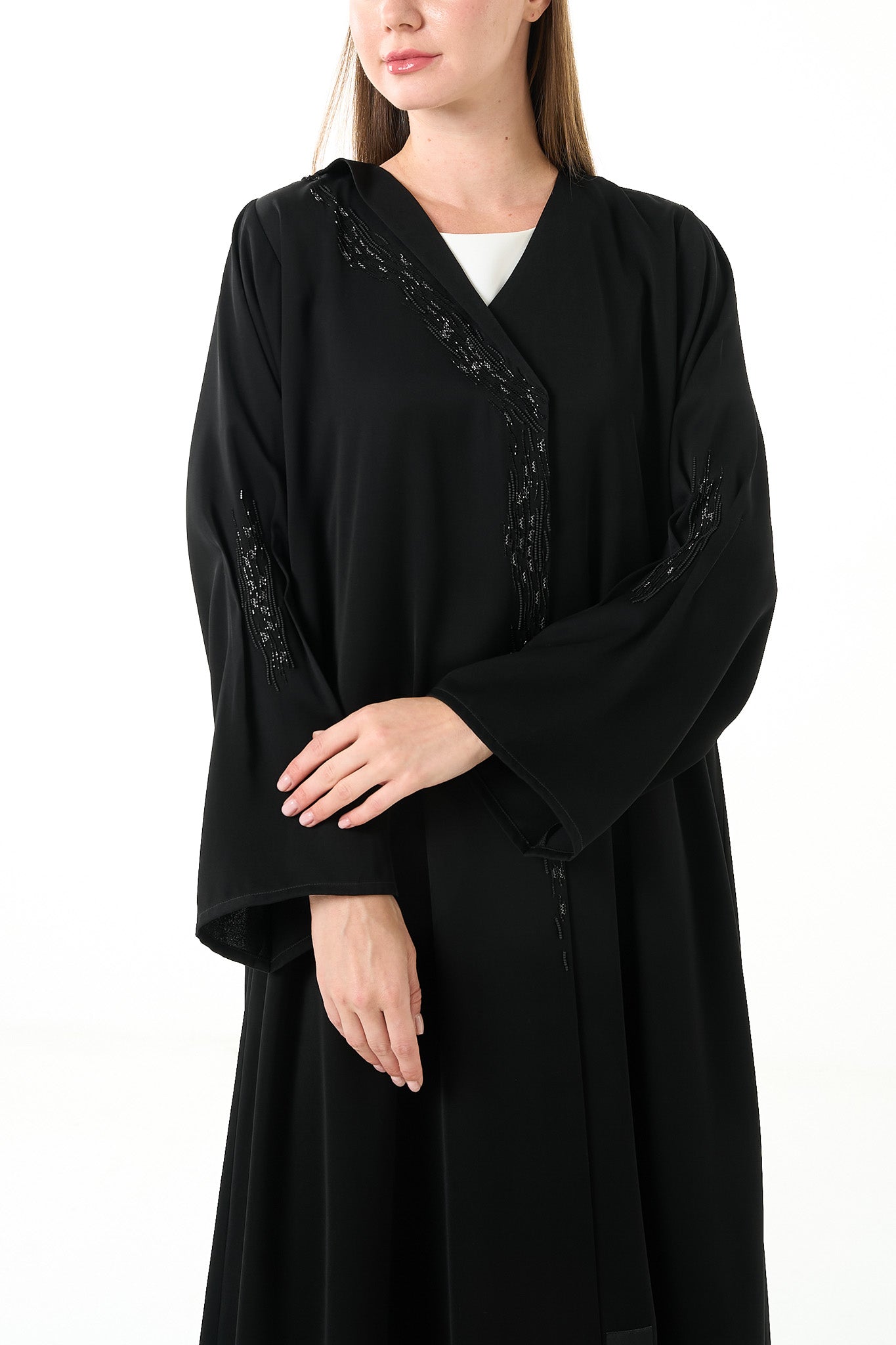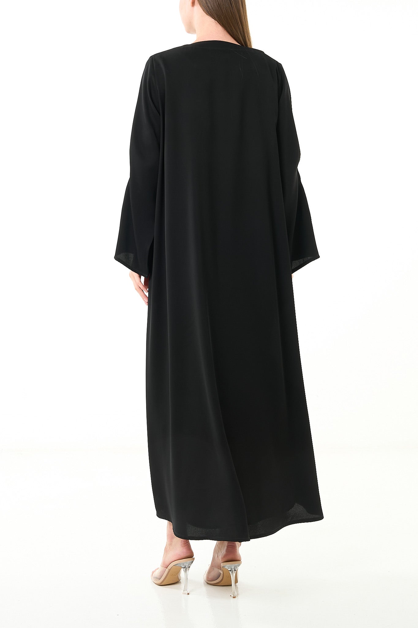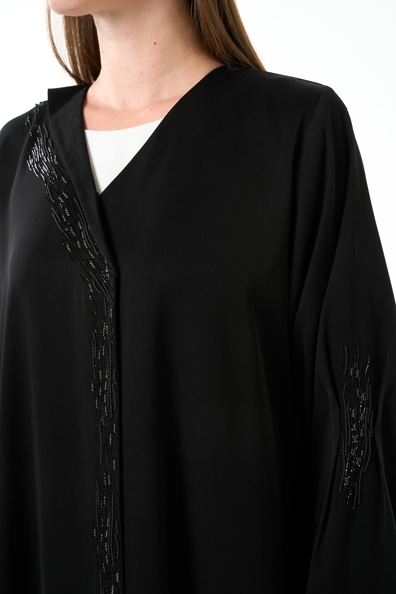 Black Luma Crepe Abaya with Klosh Cut and Front Beadwork Detail