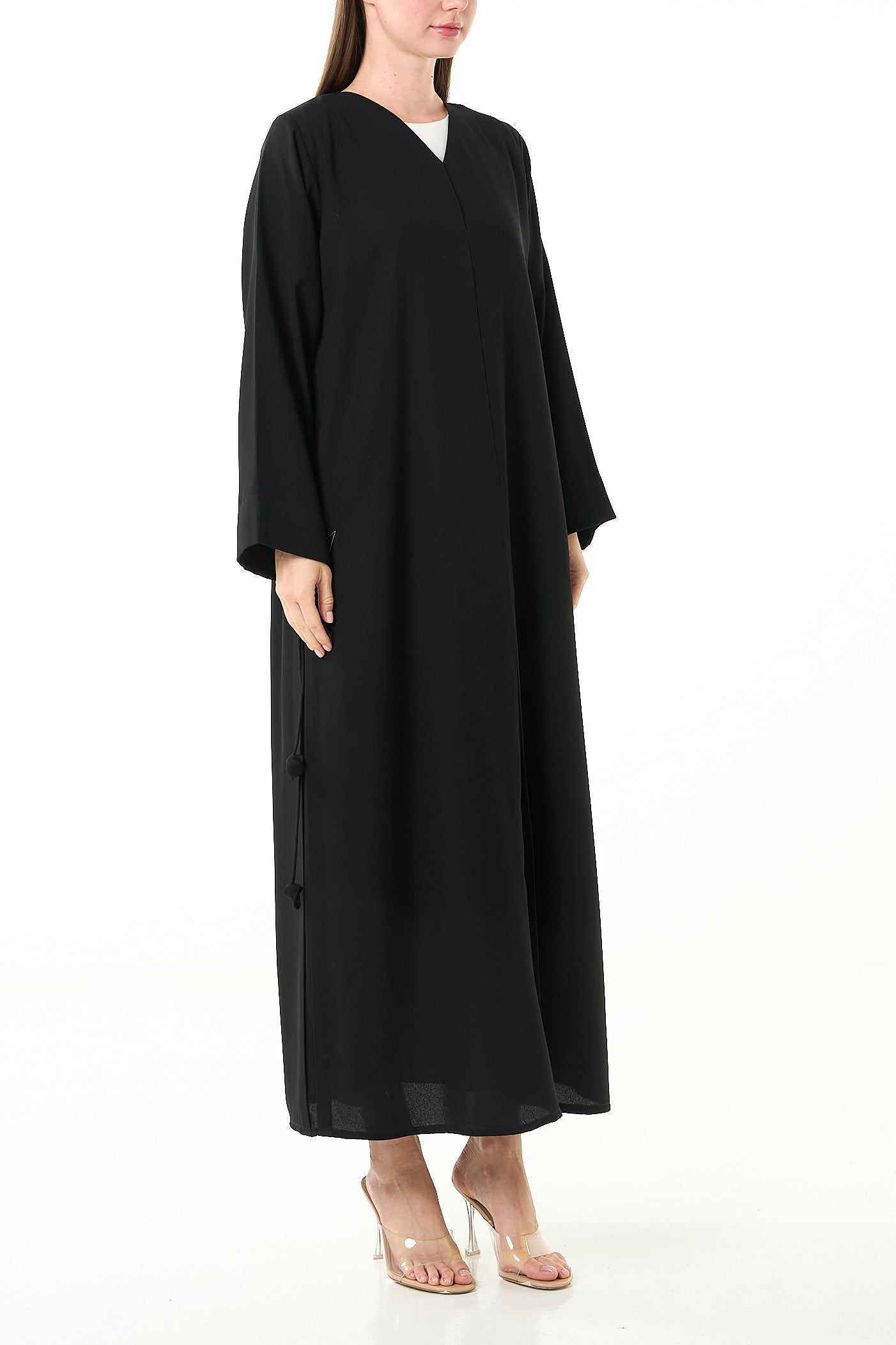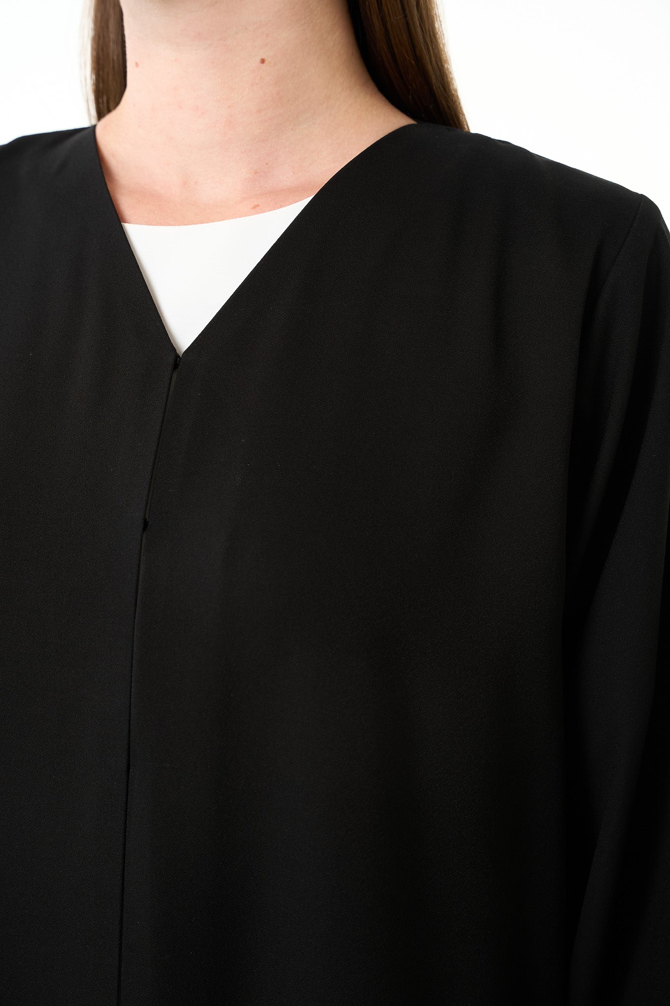 Crafted from soft and lightweight Luma Crepe, this black abaya is a minimal essential designed for effortless elegance during travel or long workdays. The piece features clean tailoring and a V-neckline, enhanced by symmetrical side pleats finished with structured fusing for form and durability. These pleats add subtle dimension while maintaining modest coverage.