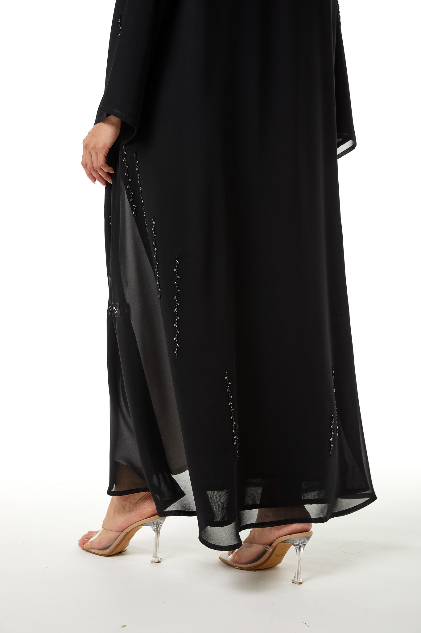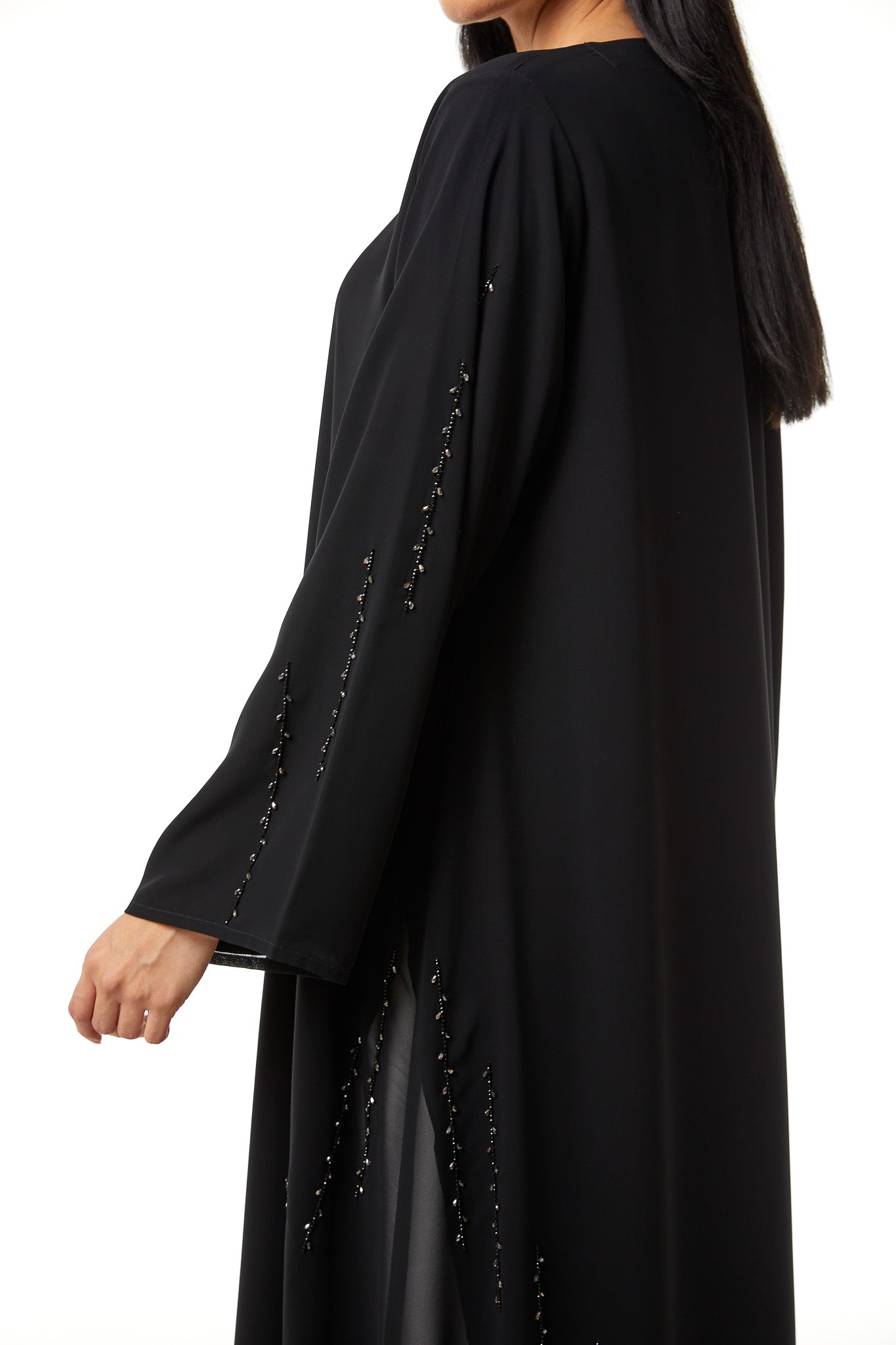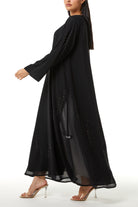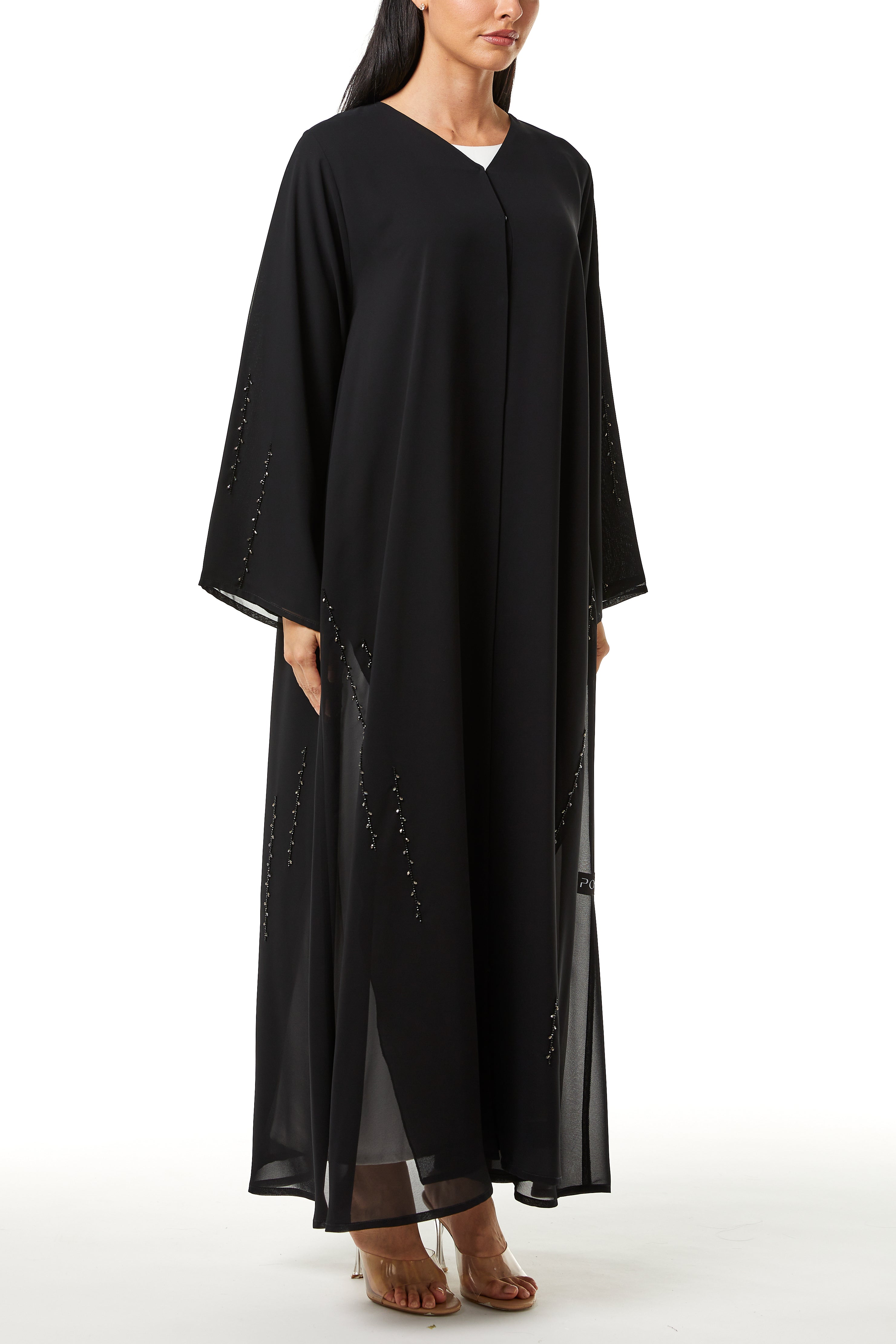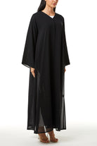 This abaya is designed to balance decorative detail with a modest and composed silhouette. The structure feels light and fluid, allowing ease of movement while keeping a well-proportioned shape. The overall appearance remains polished, making it appropriate for extended social occasions and formal settings.