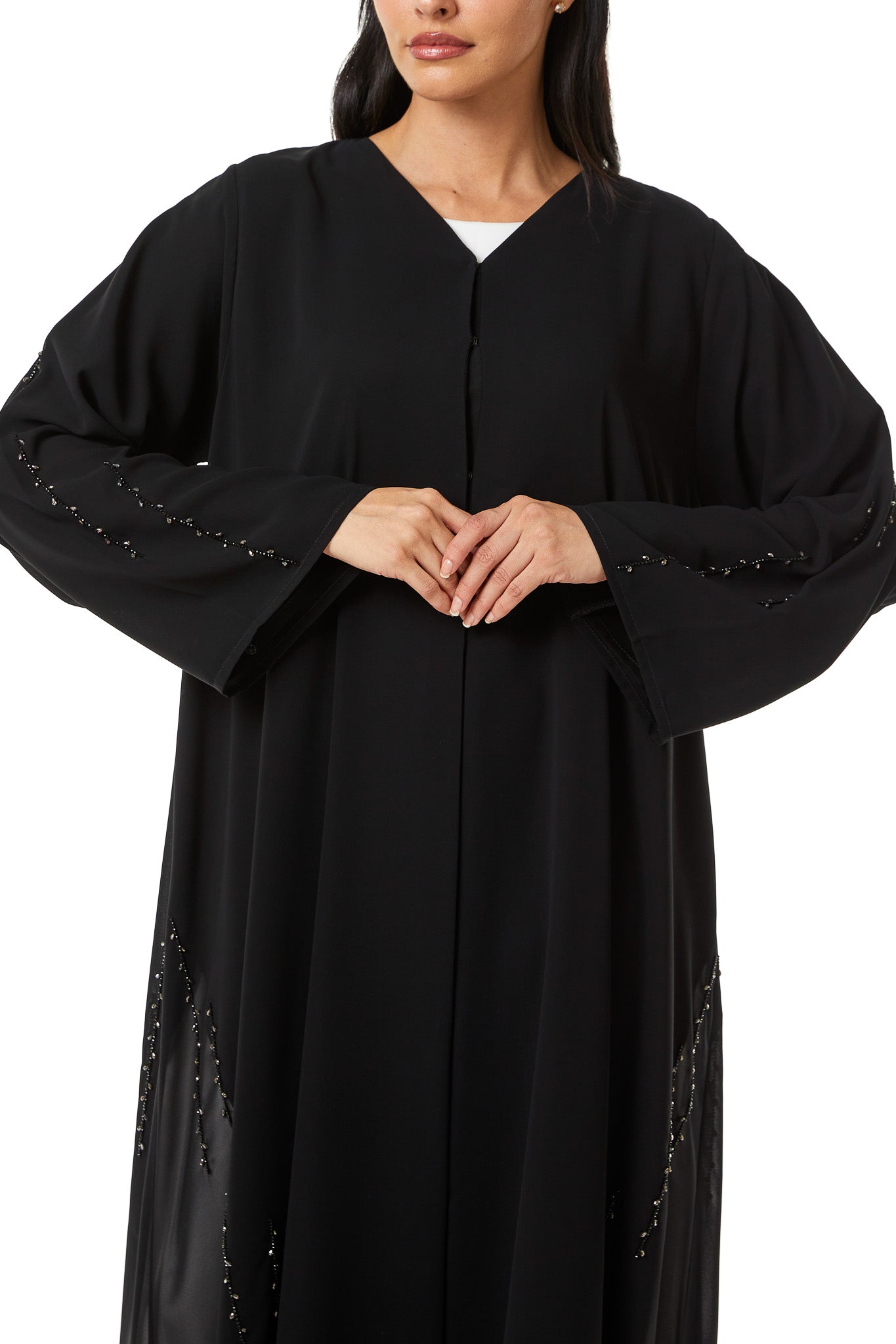 Beadwork detailing is placed on the lower front panels in a scattered vertical arrangement and continued along the sleeves. The placement adds refined visual interest while keeping the center front clean and uncluttered. The detailing is balanced and controlled, enhancing the design without overpowering the lightweight fabric.