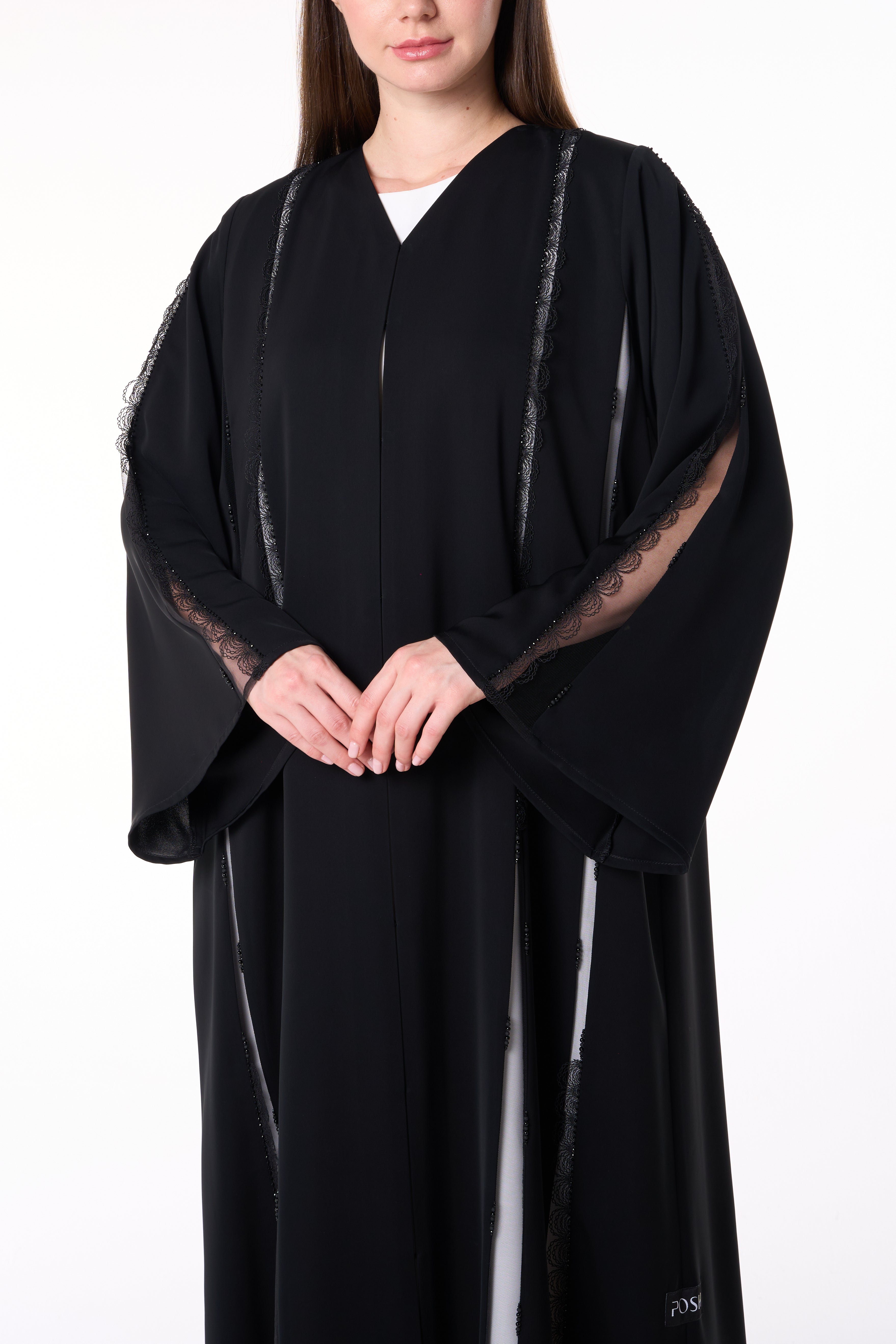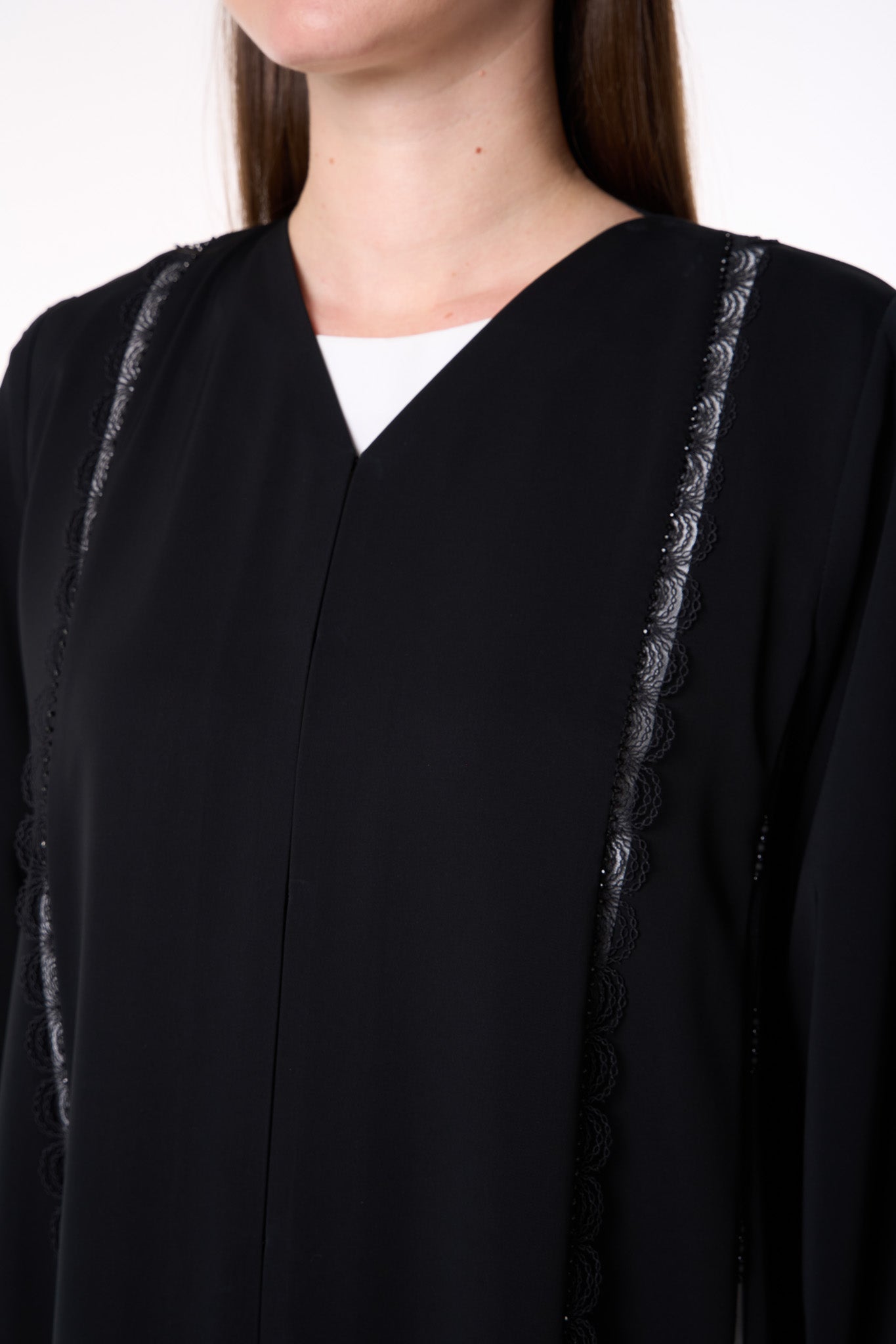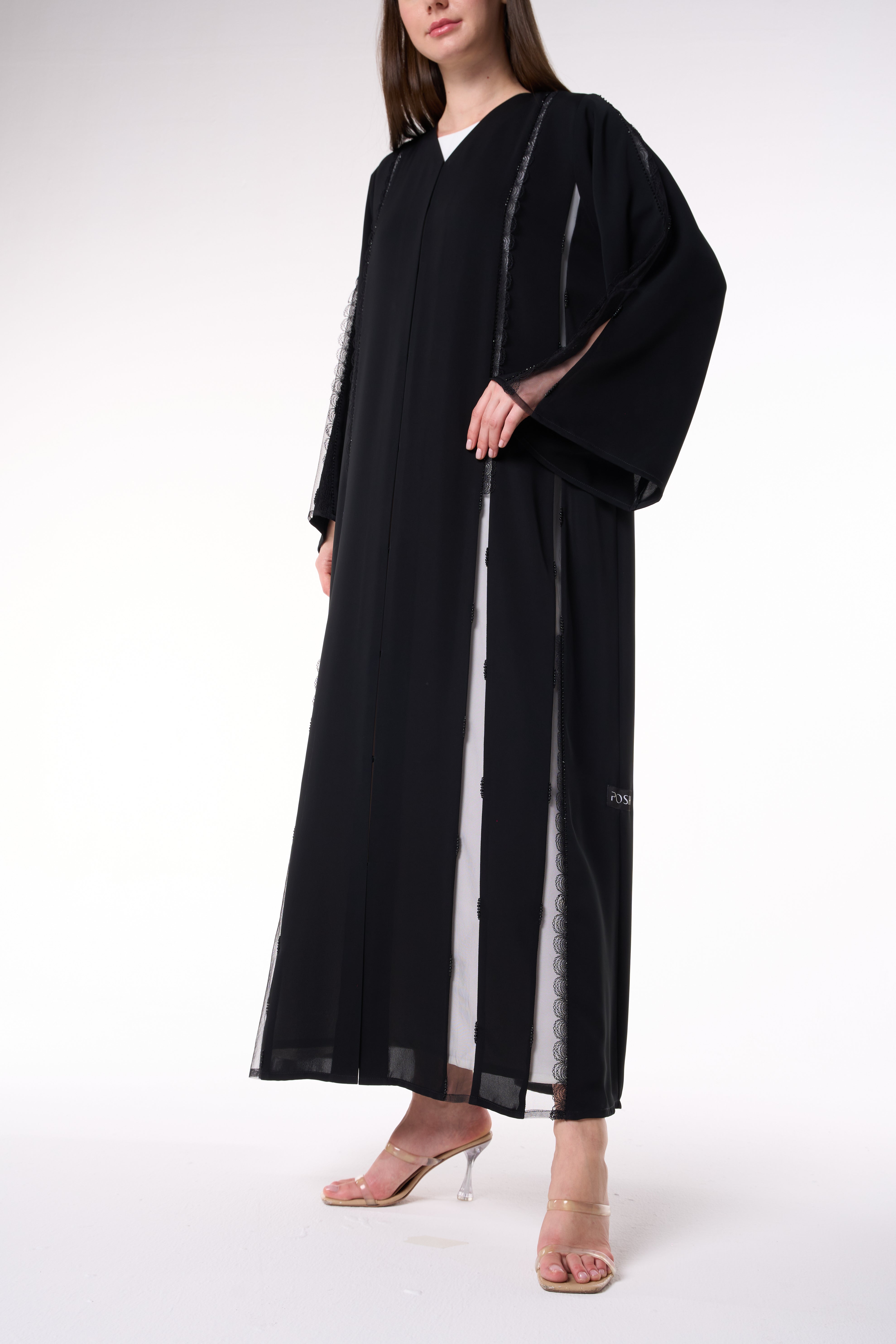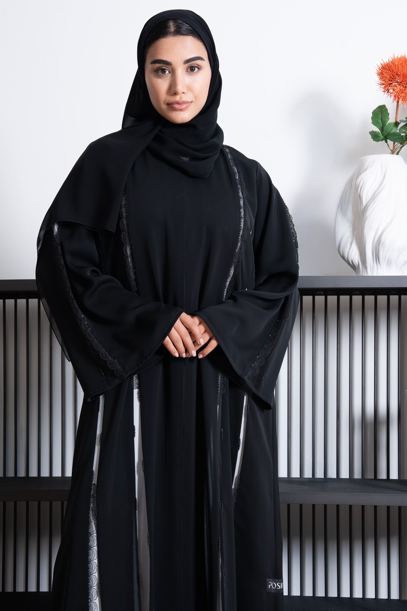 Crafted from lightweight Reem Nada Crepe, this abaya embodies quiet elegance through its clean silhouette and intricate detailing. Cut in a flowing KLOSH shape, the piece features a soft V-neckline and concealed snap-button placket for a refined front finish.