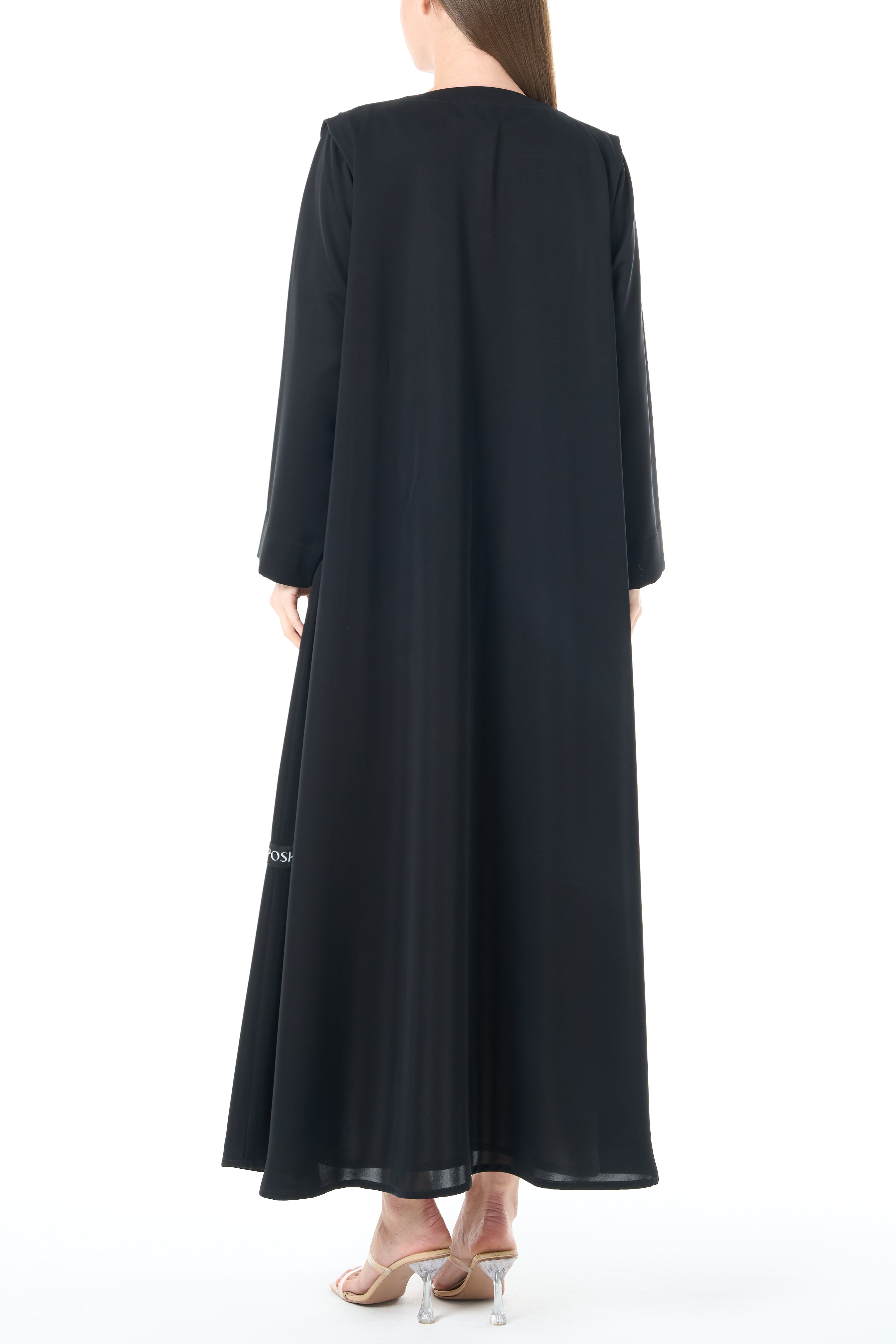 Each seam and fold follows the brand’s commitment to minimal perfection — from the topstitched hem and finished sleeve edges to the center-front snap closures that ensure both function and polish. The inner construction includes woven fusing for stability at the collar and neckline, and the abaya is finished with screen-printed branding at the inner side seam.
