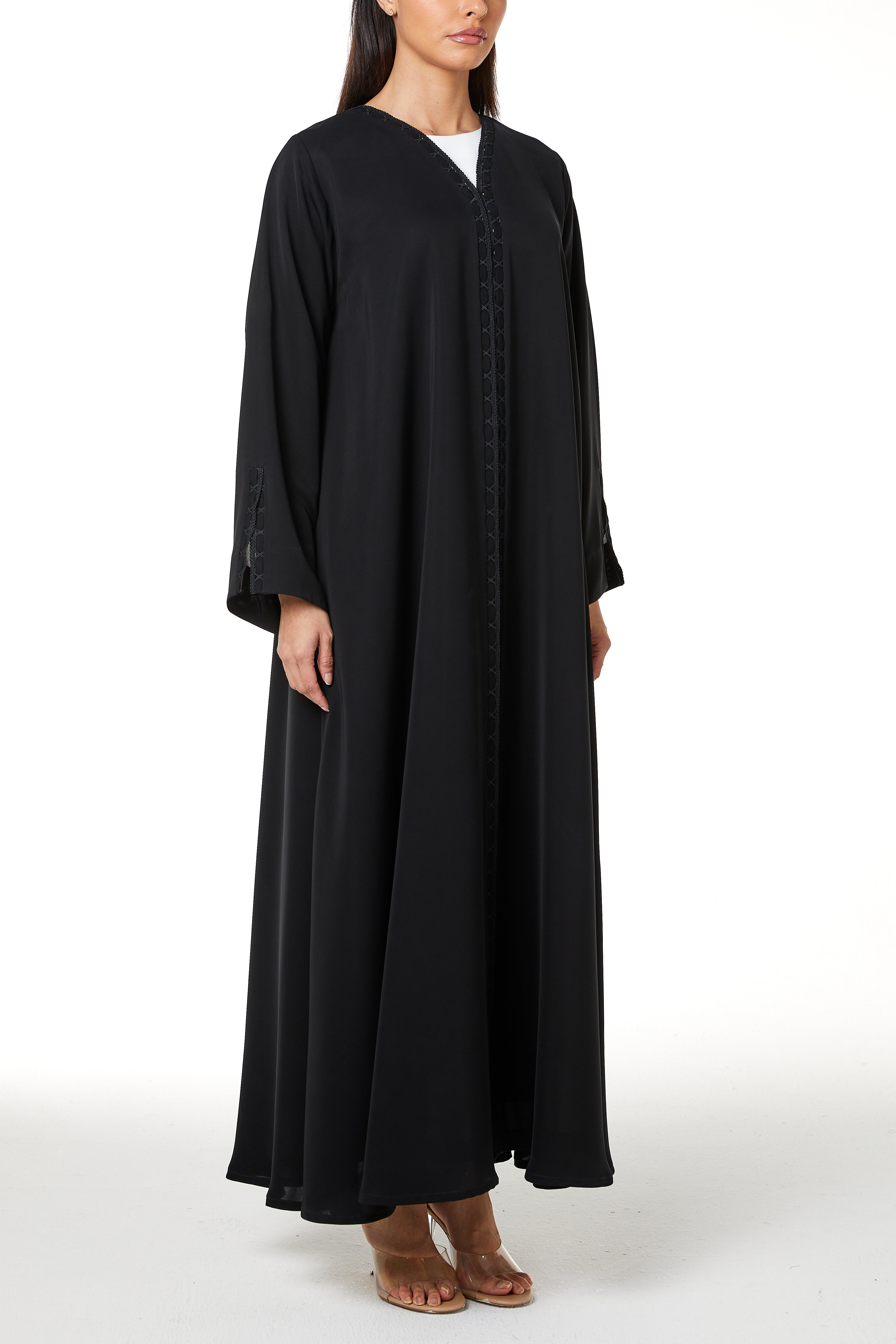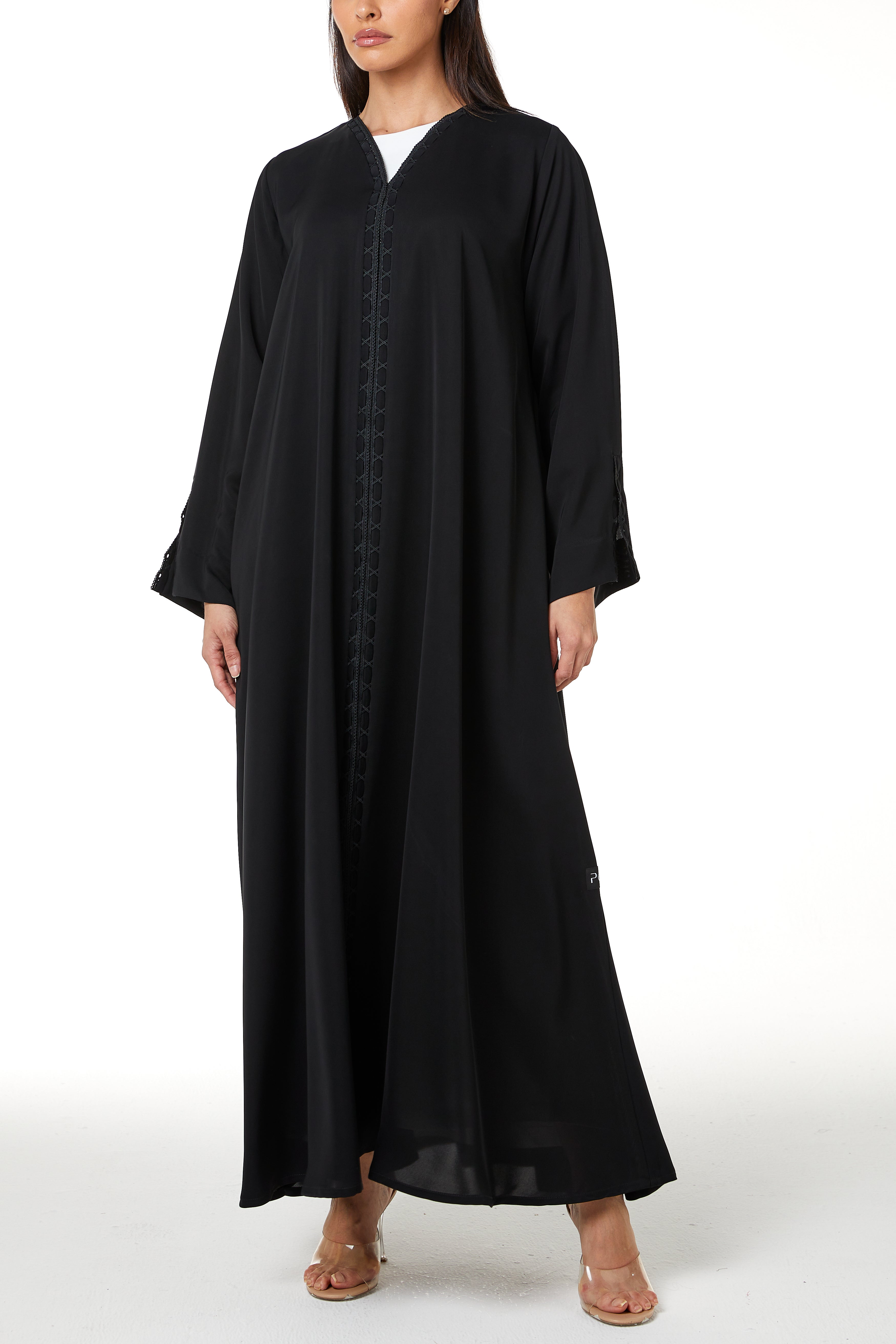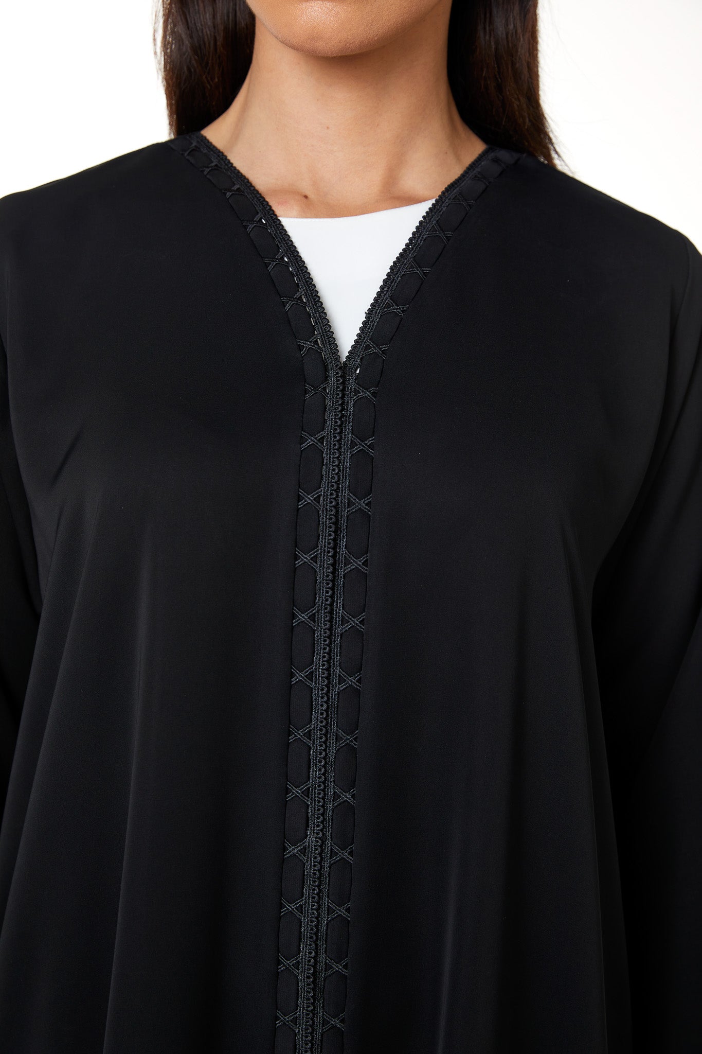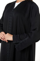 The abaya features a shaped V neckline with lace detailing that continues vertically along both sides of the front opening. The lace is combined with subtle fabric manipulation, creating a structured decorative line that frames the centre front from neckline to hem. The placement remains balanced and modest, adding texture without heaviness.