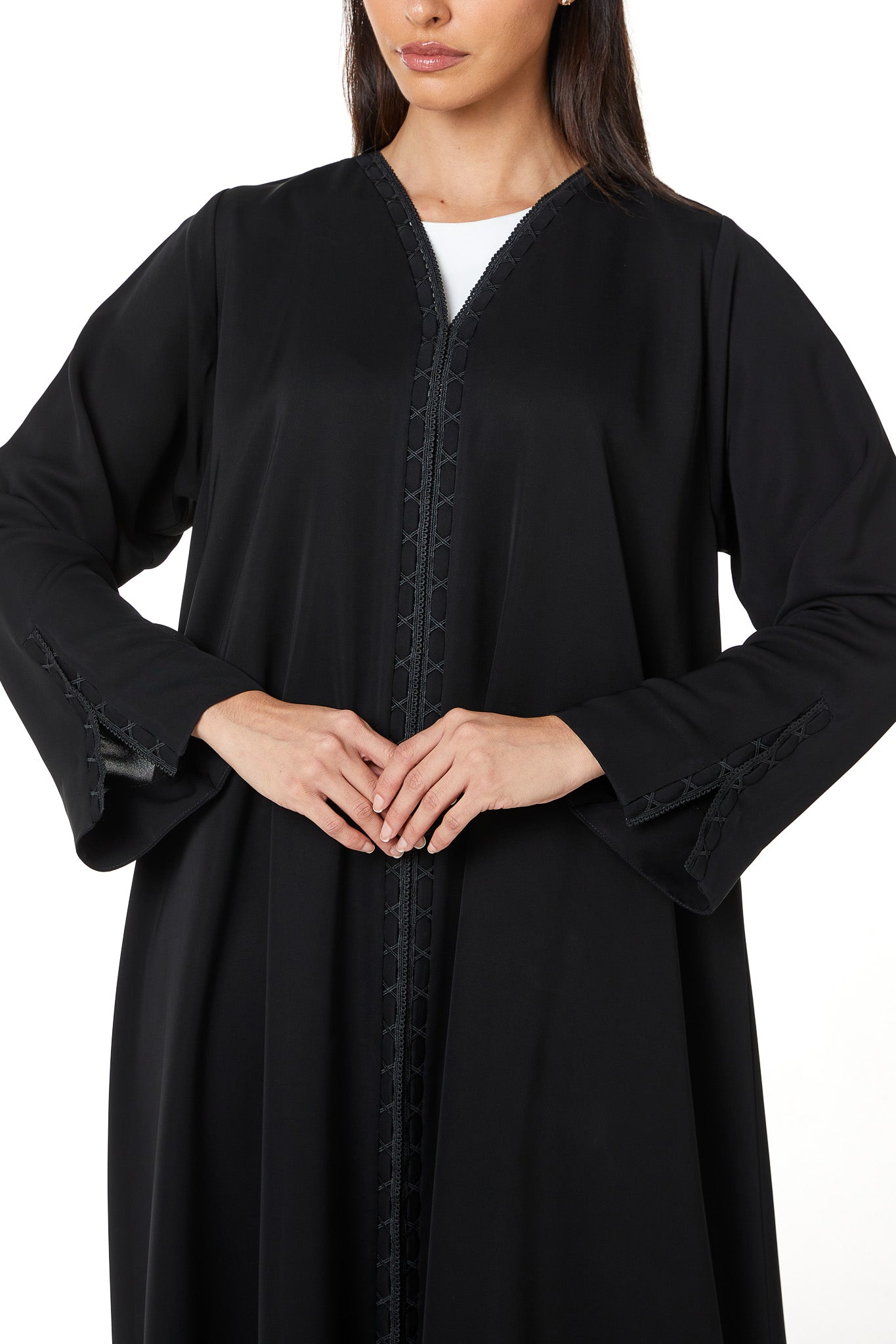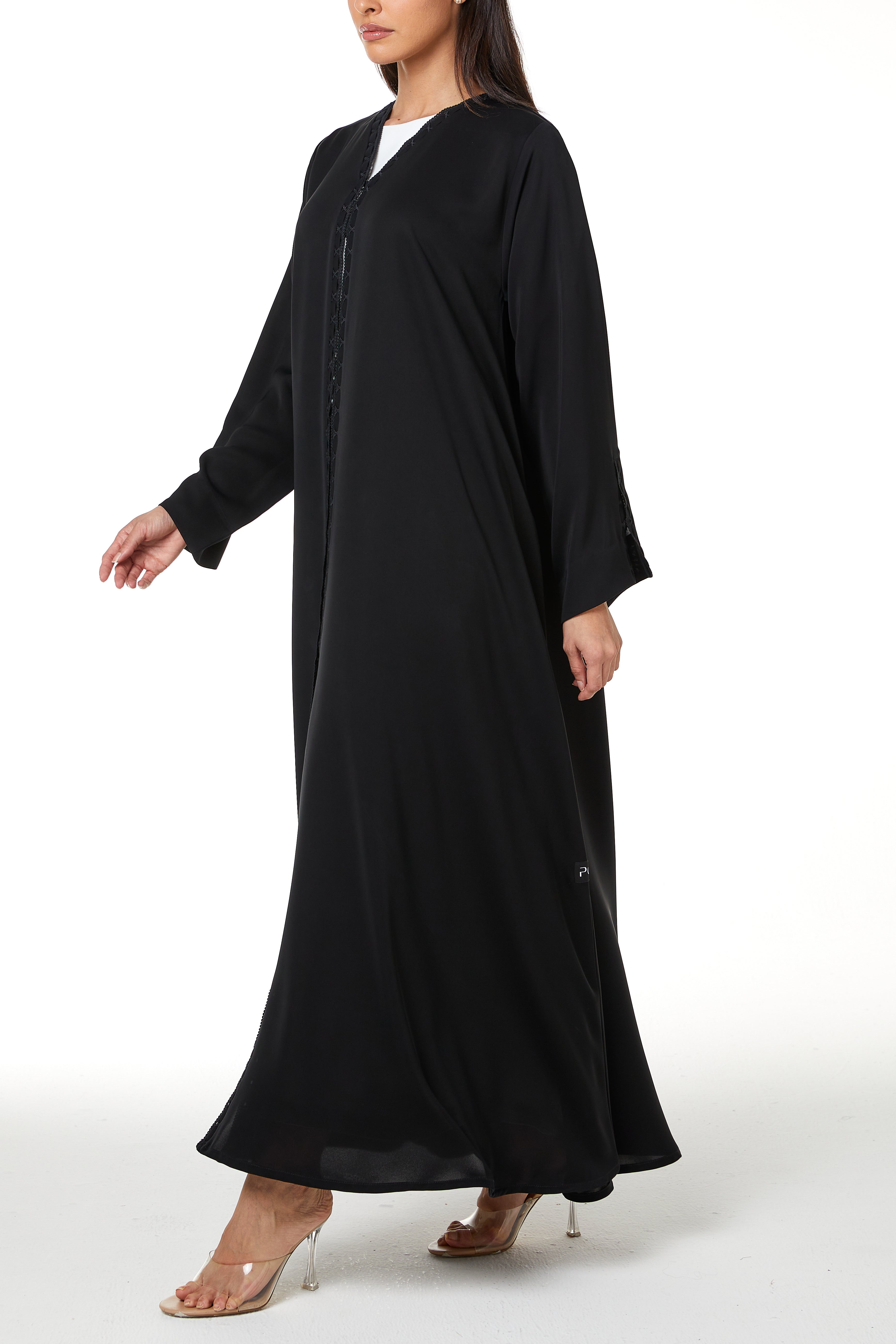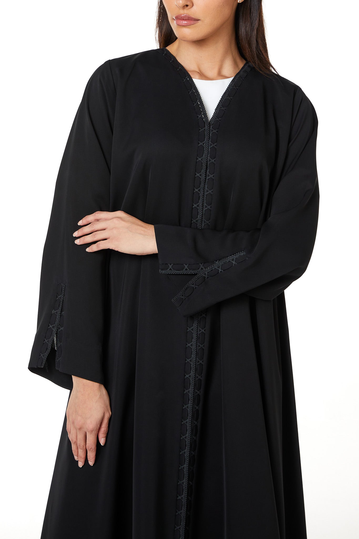 The abaya features a shaped V neckline with lace detailing that continues vertically along both sides of the front opening. The lace is combined with subtle fabric manipulation, creating a structured decorative line that frames the centre front from neckline to hem. The placement remains balanced and modest, adding texture without heaviness.