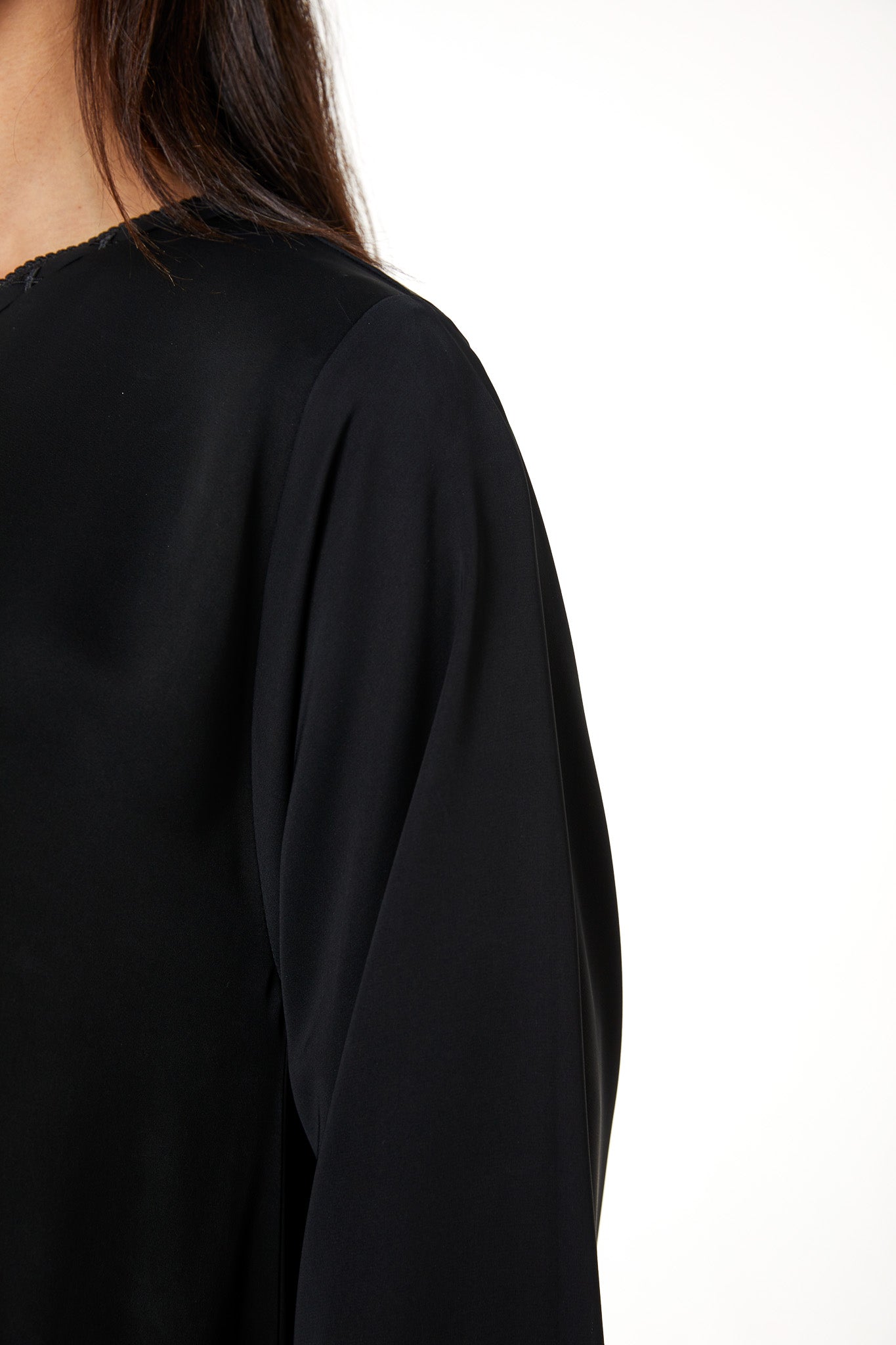 reem nada offers a smooth and soft surface with a refined structure suitable for daily and work wear. The fabric feels lightweight while maintaining a neat and composed silhouette. The black color enhances the clean finish, making it appropriate for professional settings, fall and winter gatherings, and all-year use.