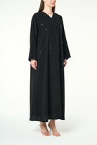 An elegant abaya designed in lightweight Reya Crepe, shaped into a fluid KLOSH silhouette that offers movement and poise. The neckline is tailored into a clean V, with a concealed snap-button placket to maintain a refined and uninterrupted front.