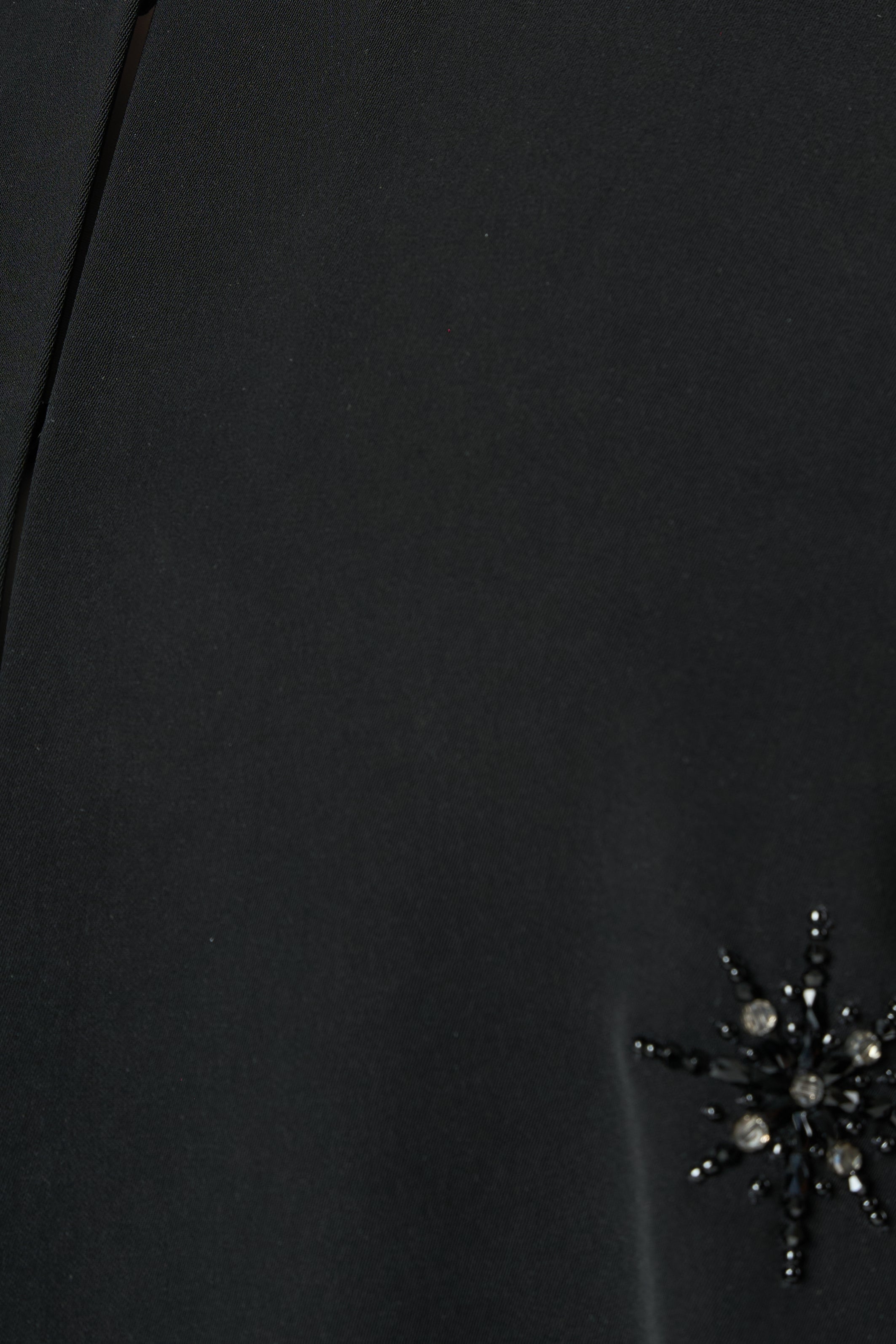 The highlight of the design lies in its celestial-inspired beadwork — hand-applied crystal and sequin clusters arranged across the front panel and sleeves in starburst formations. These embellishments catch light subtly, creating a luminous yet sophisticated finish that transitions effortlessly from day to evening wear.