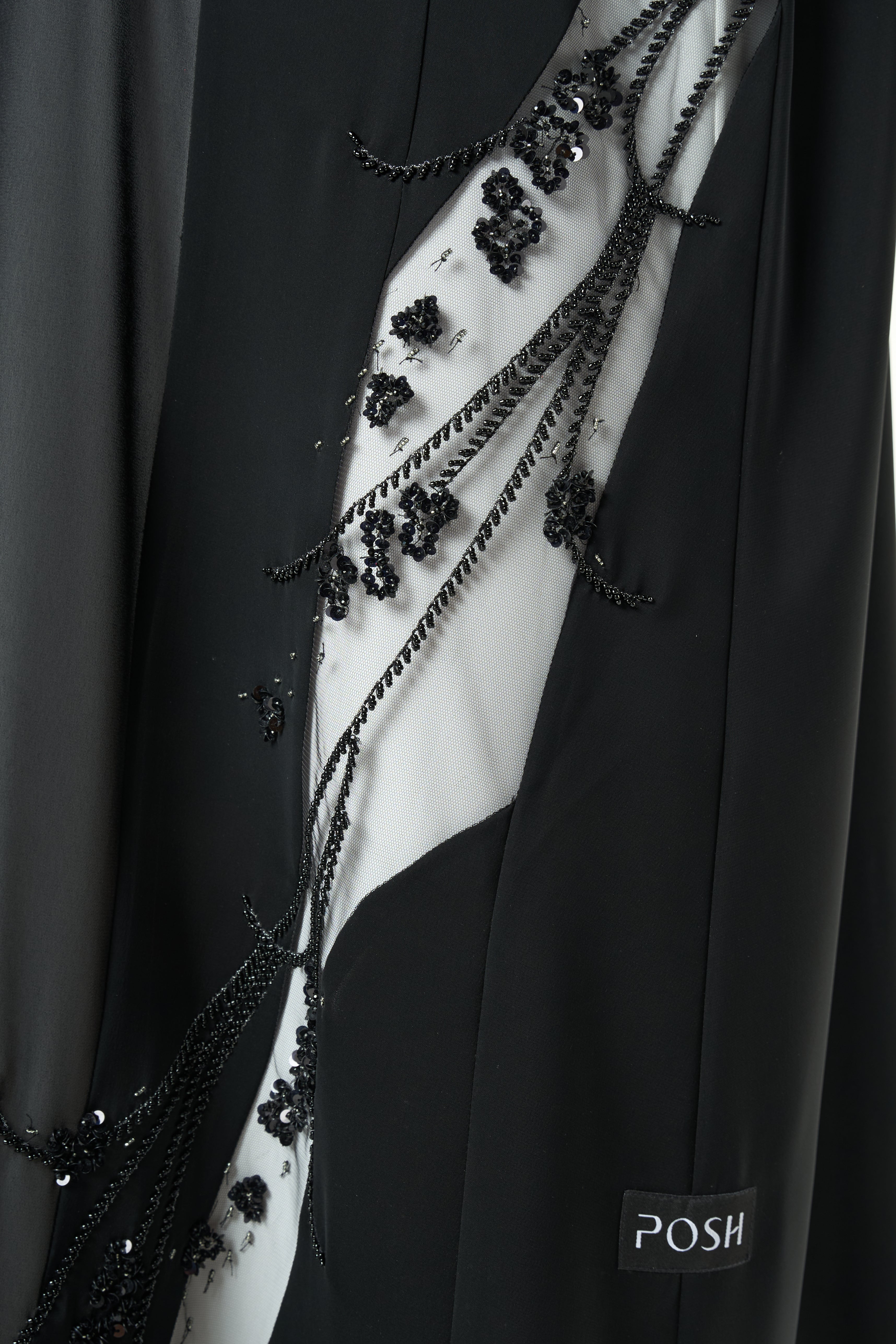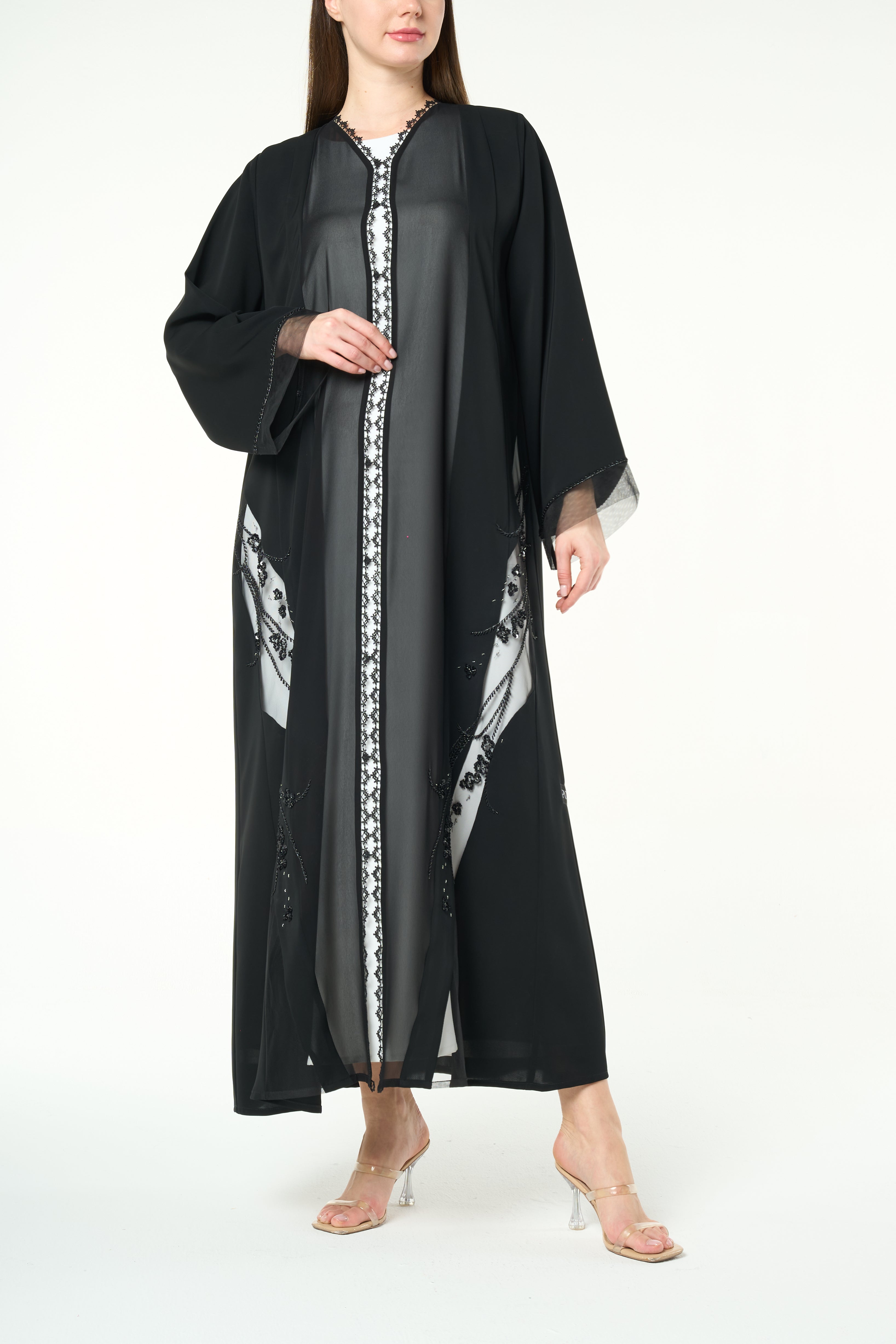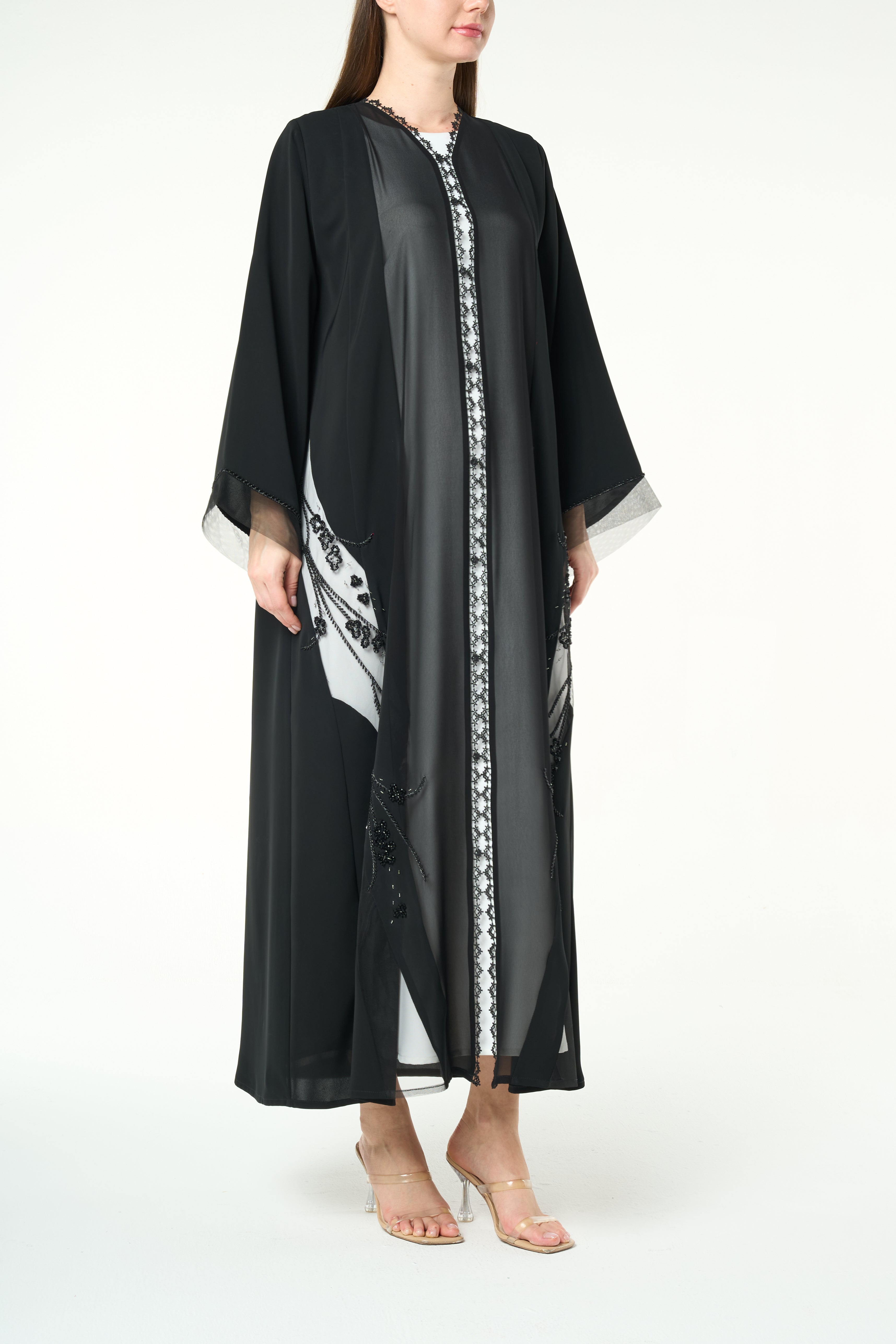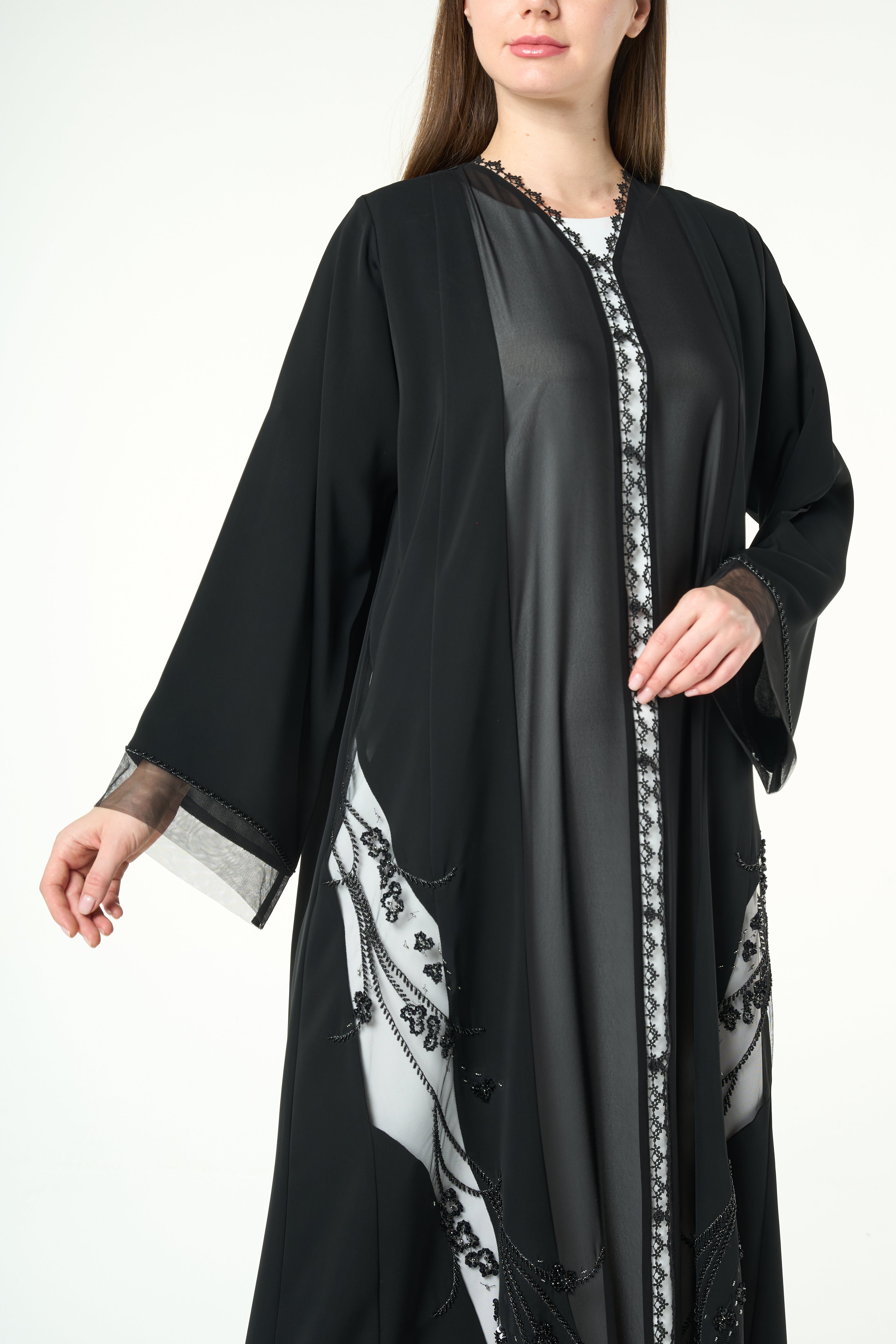 Beadwork is applied along both sides of the front opening in a vertical formation, running from the neckline toward the hem. The bead placement creates a striking yet balanced frame that highlights the front of the abaya. Additional beadwork detailing is applied near the sleeve cuffs, adding a refined finish without overwhelming the design.