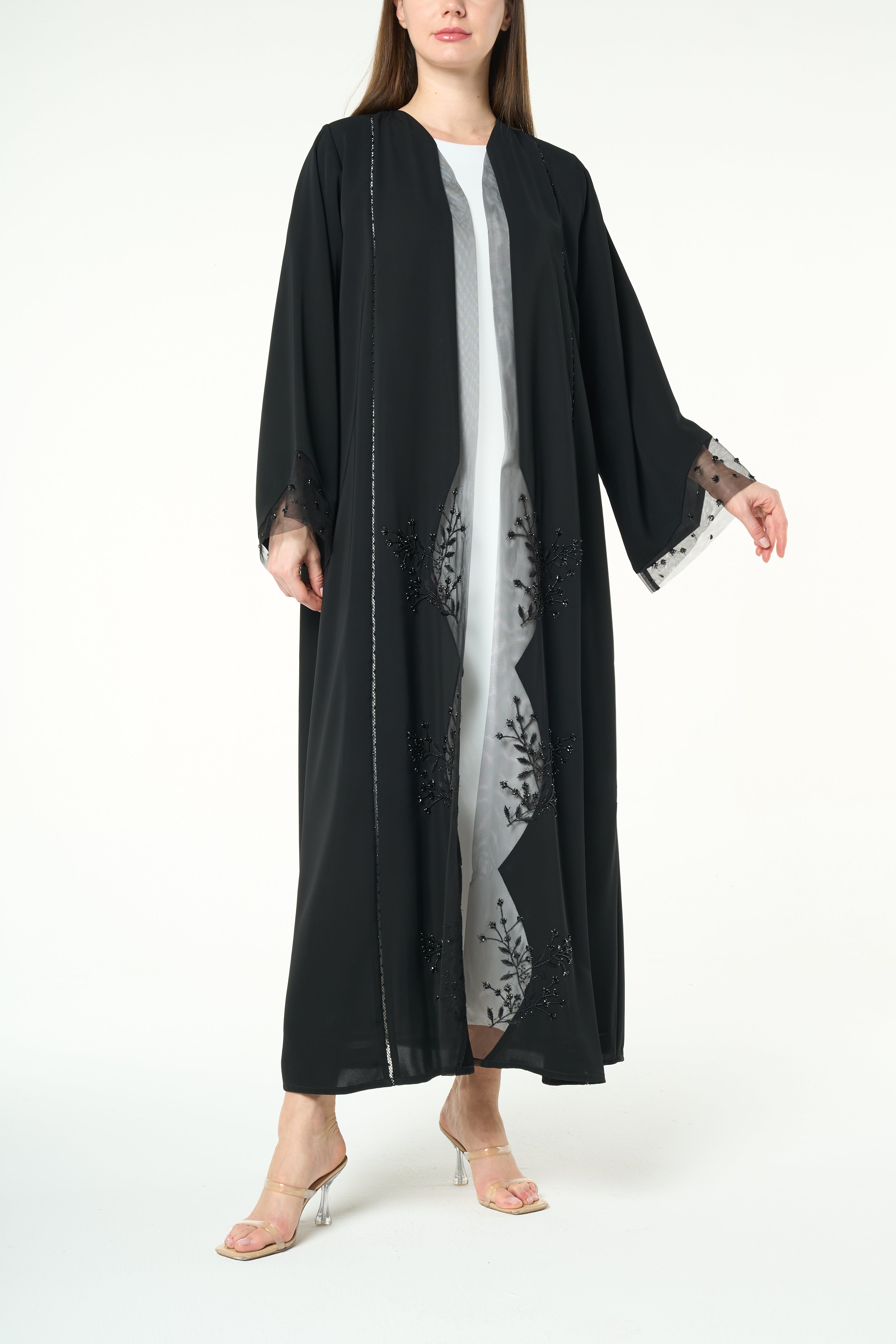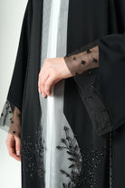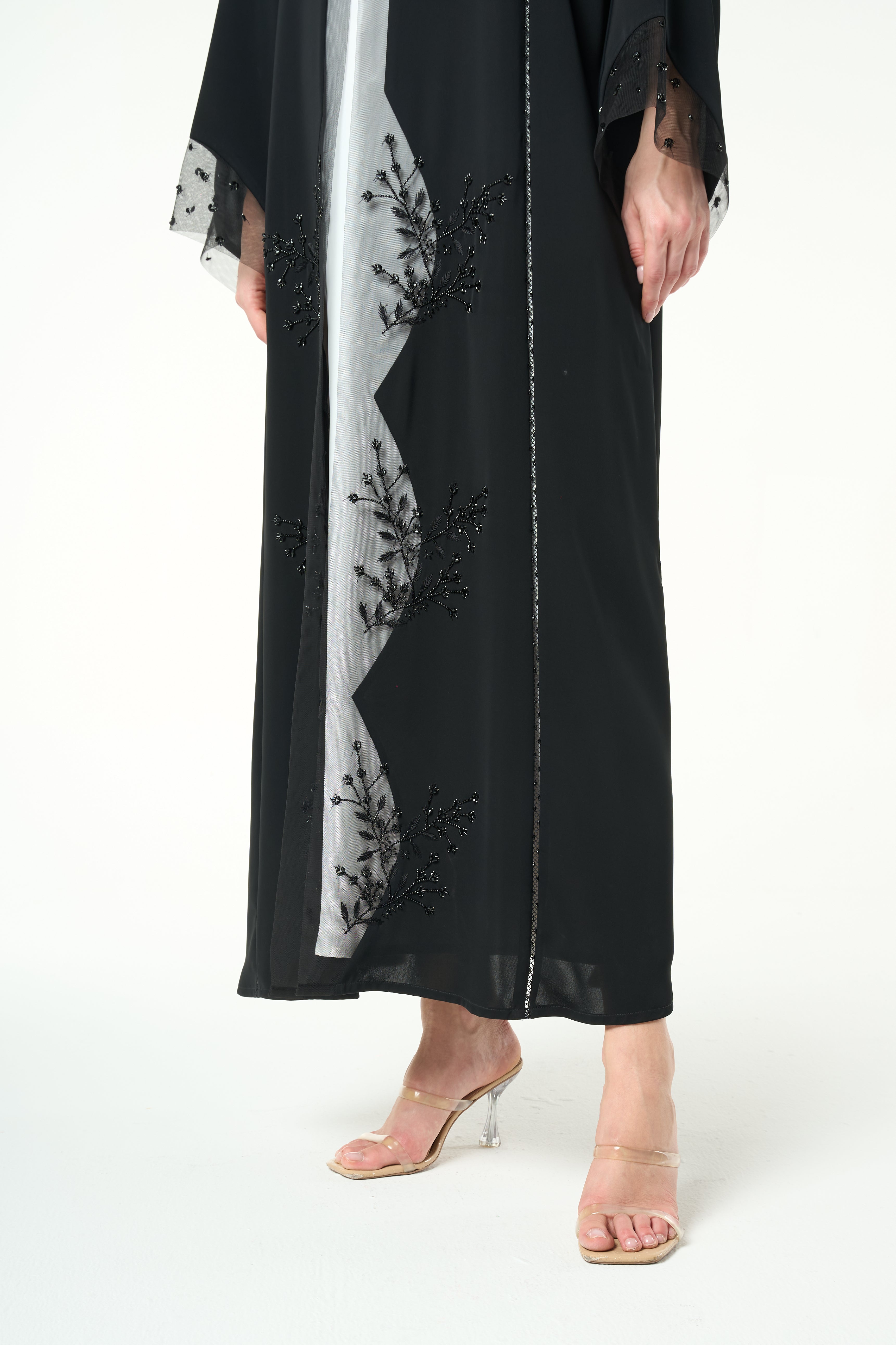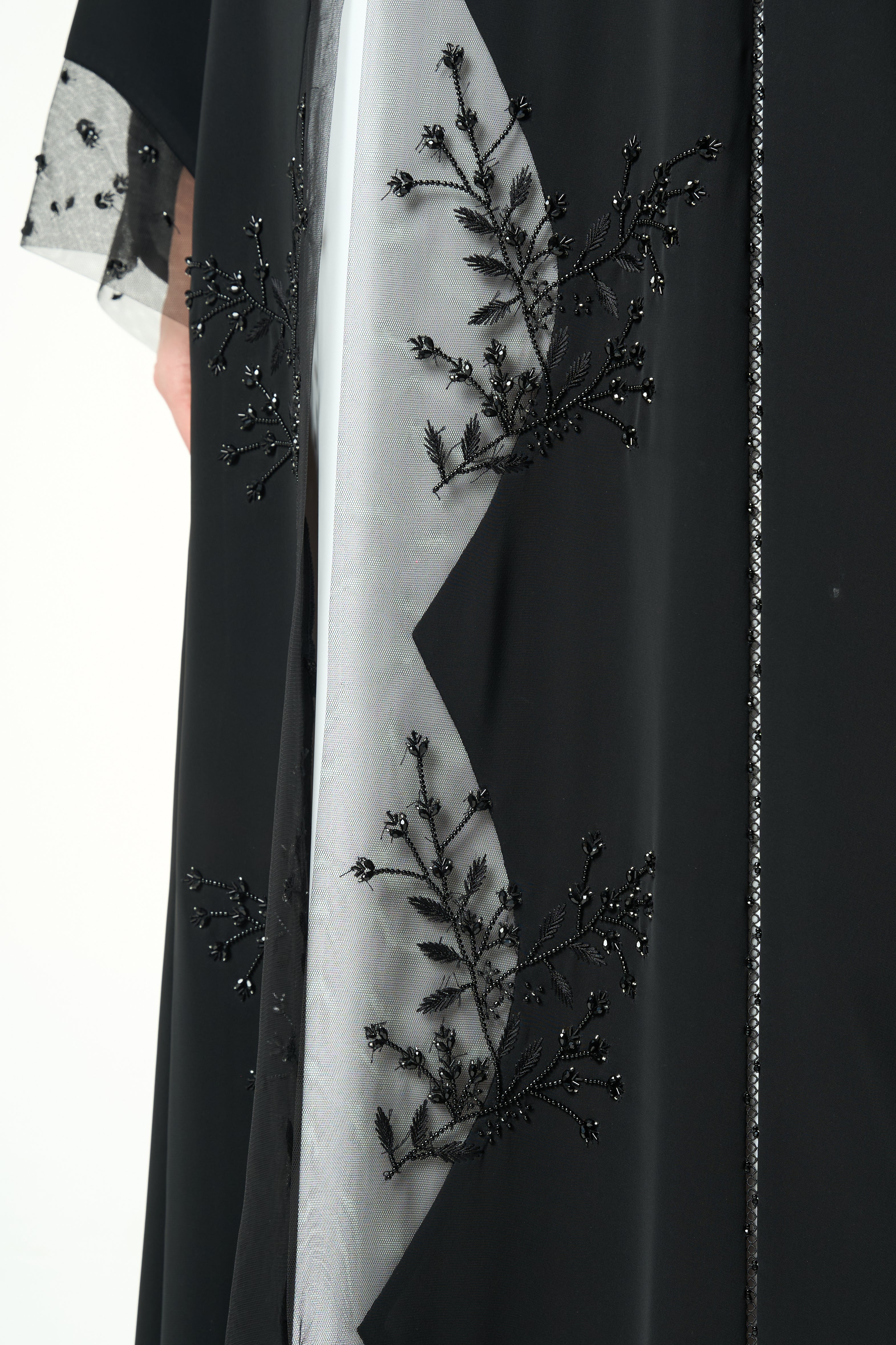 Beadwork is applied along the lower front panels on both sides, forming a delicate vertical pattern that rises from the hem. The placement adds visual depth and refined texture without overwhelming the abaya. Subtle net detailing at the sleeve cuffs complements the front work and adds a soft finish.
