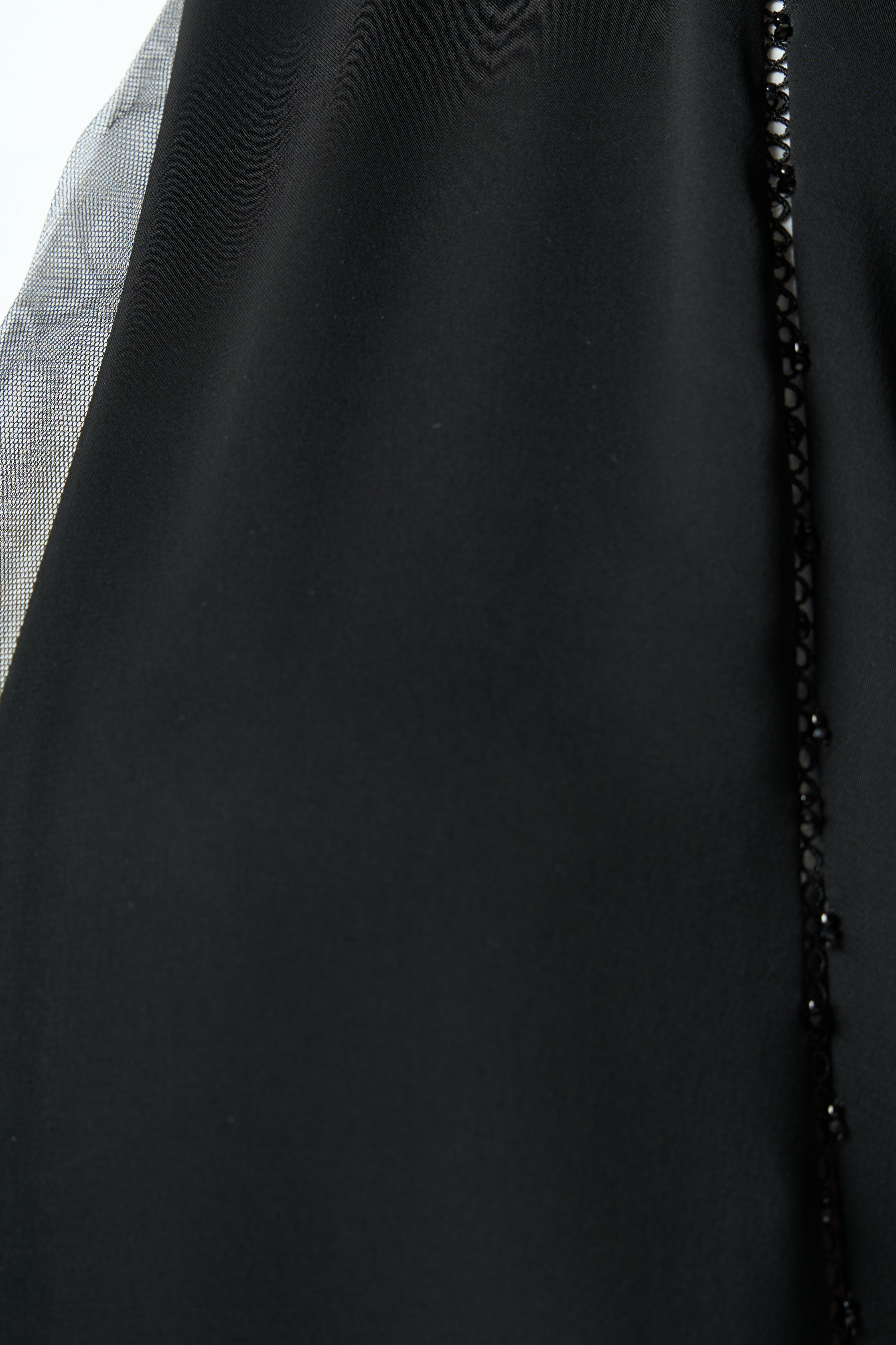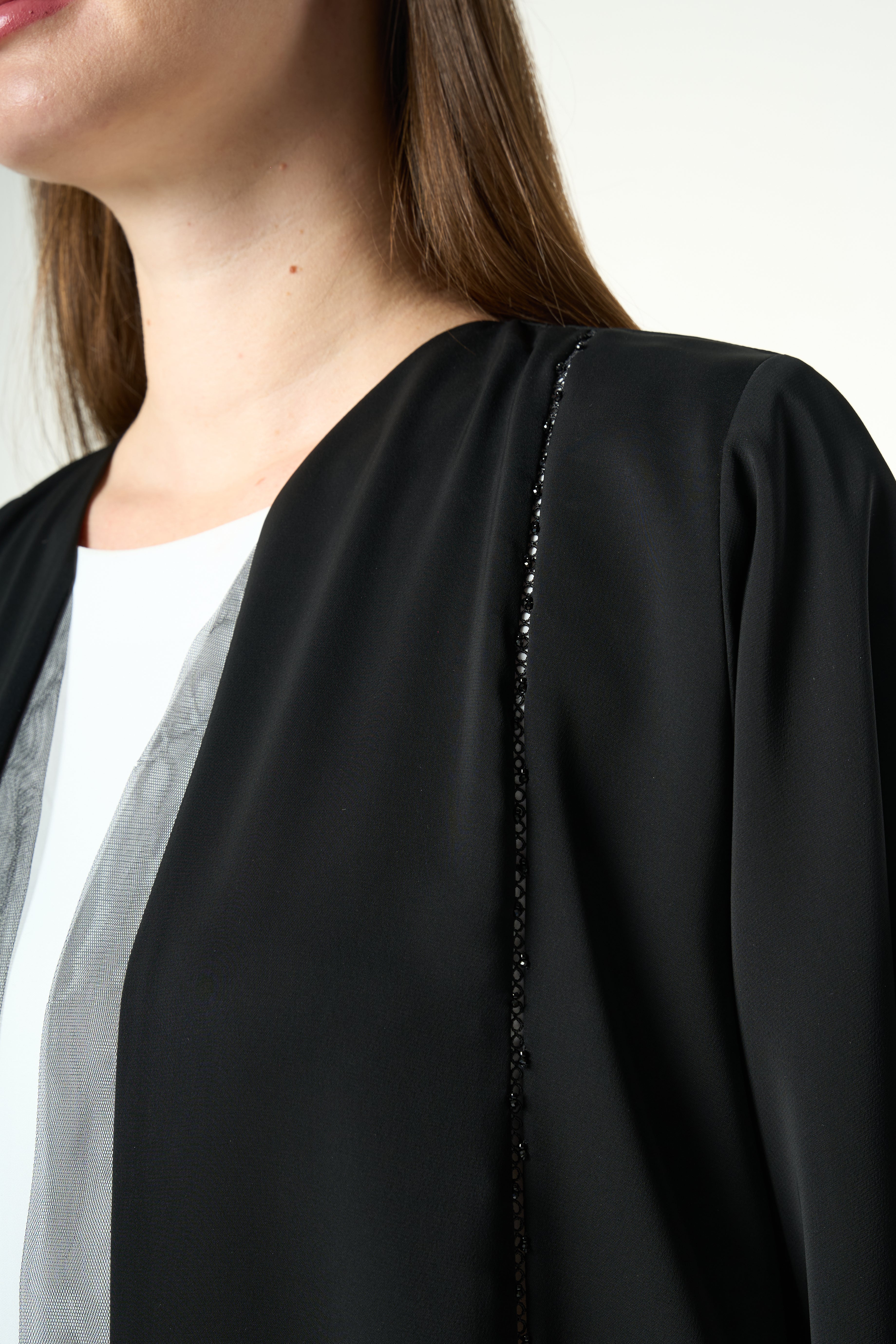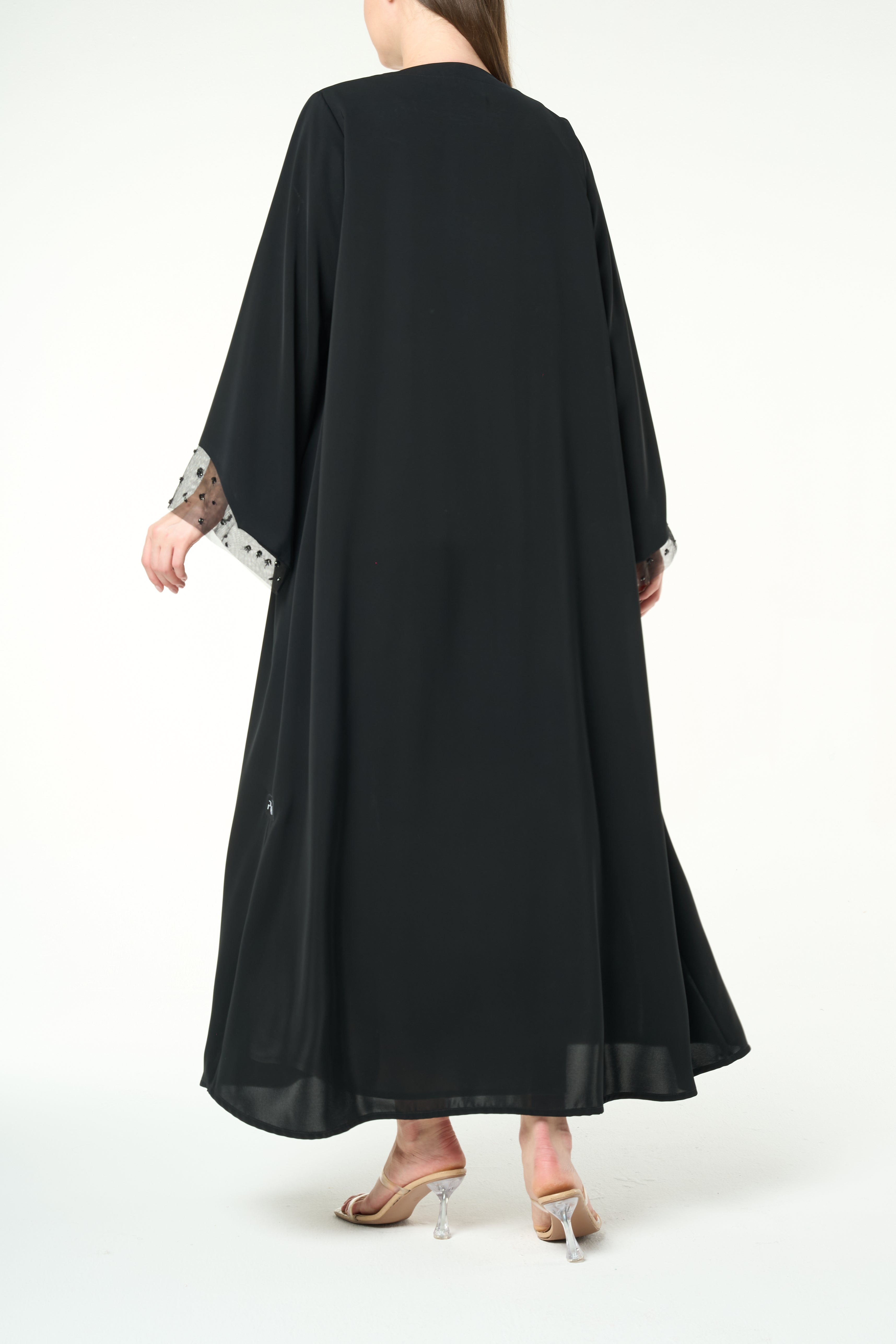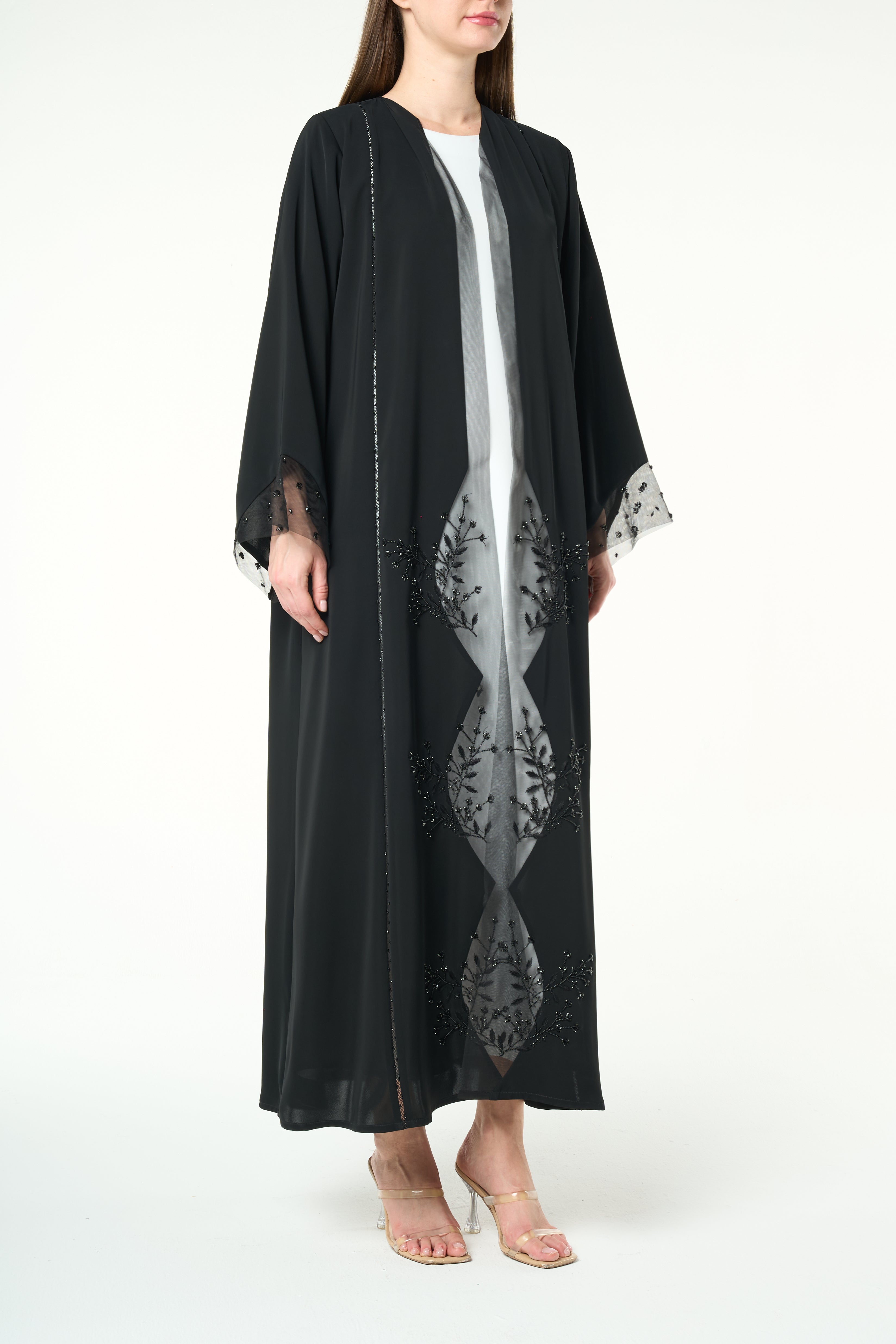 Beadwork is applied along the lower front panels on both sides, forming a delicate vertical pattern that rises from the hem. The placement adds visual depth and refined texture without overwhelming the abaya. Subtle net detailing at the sleeve cuffs complements the front work and adds a soft finish.