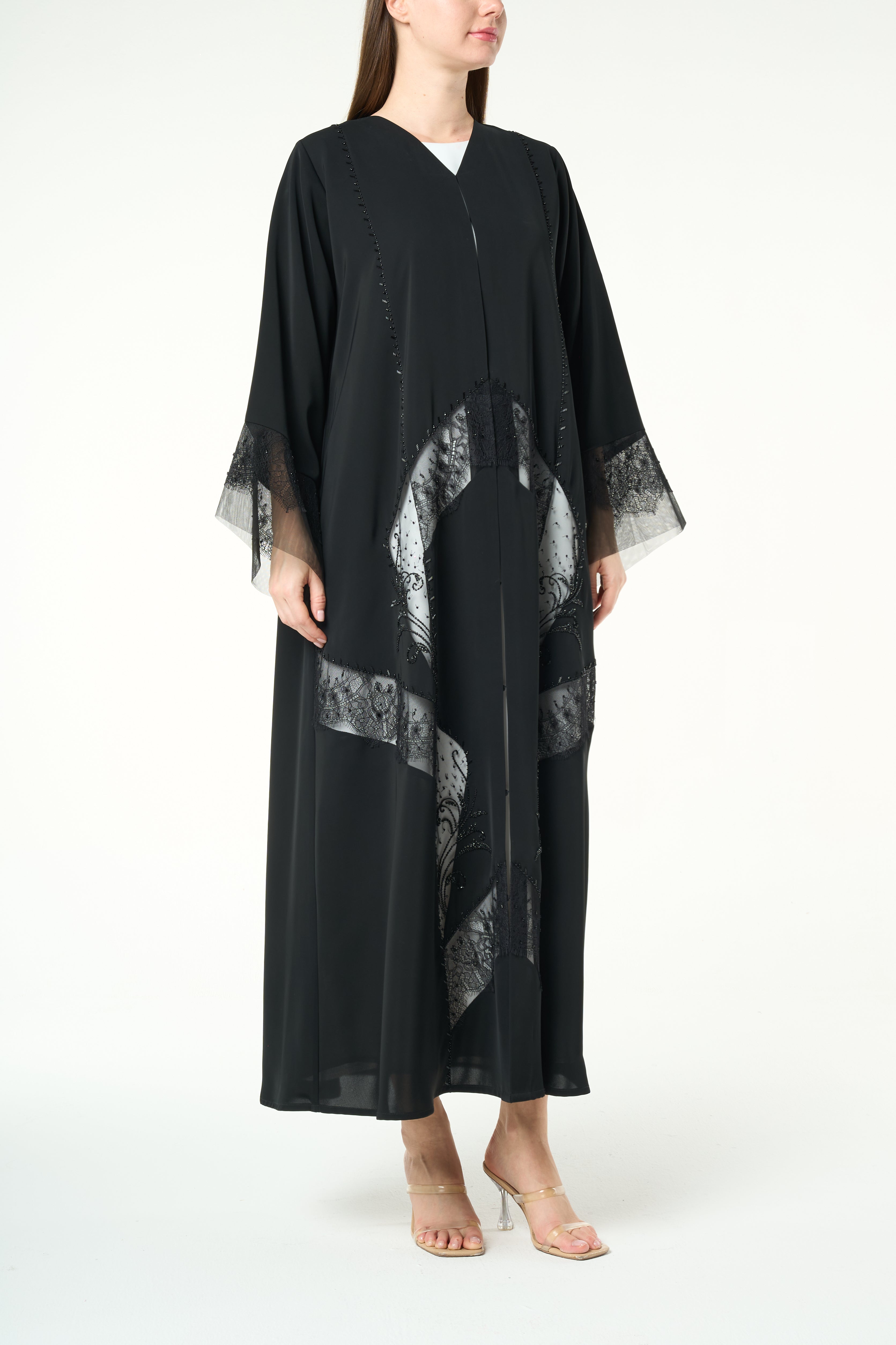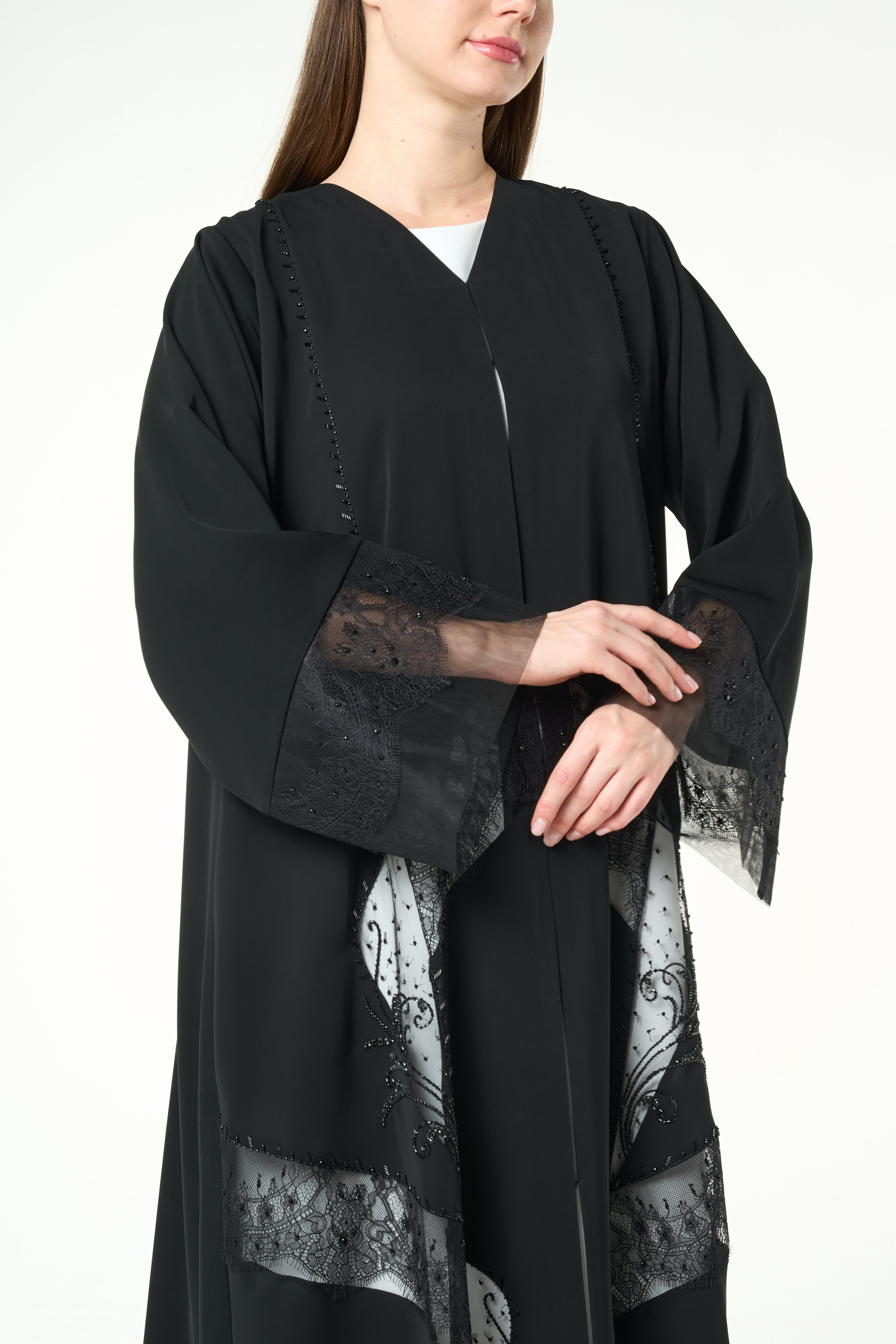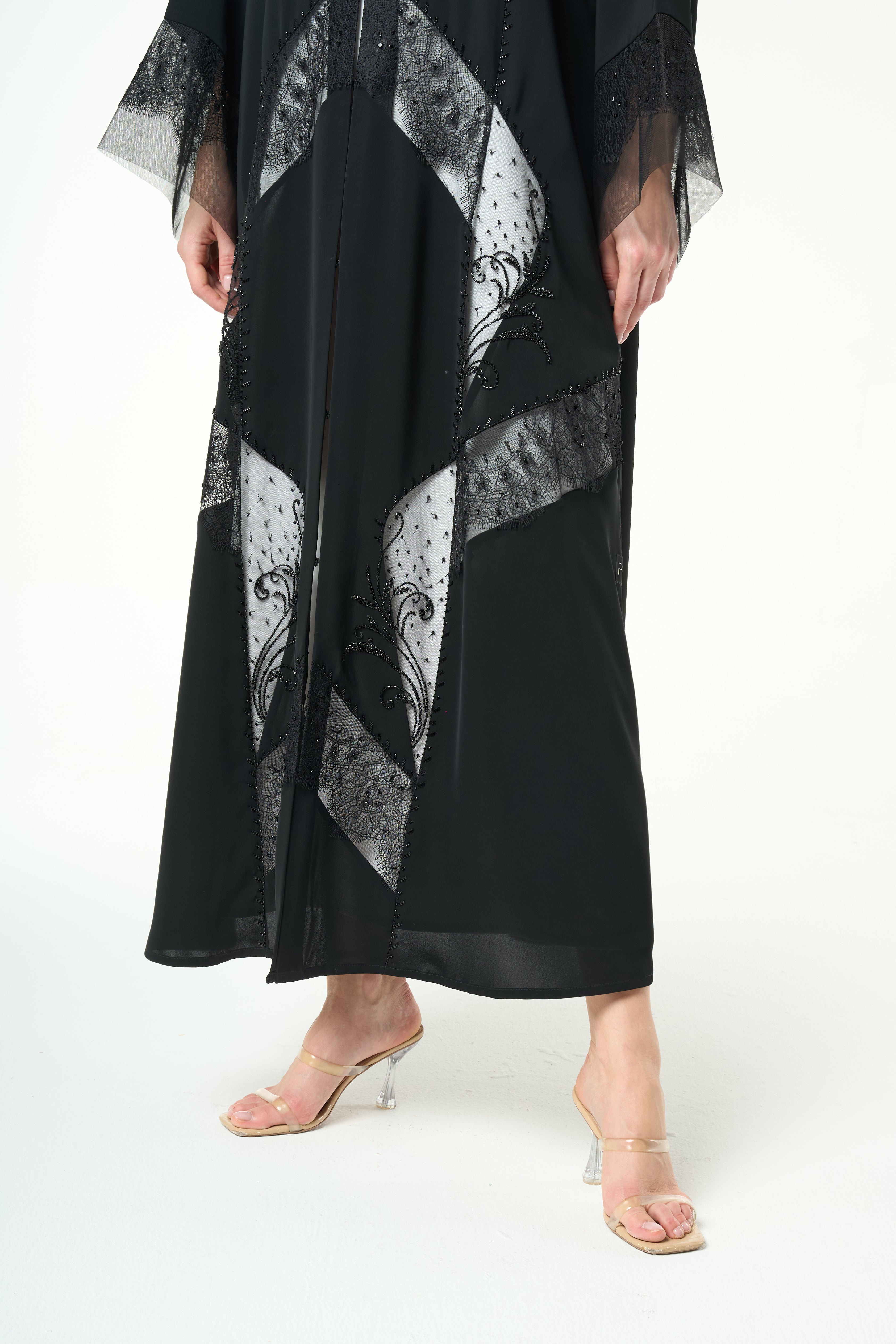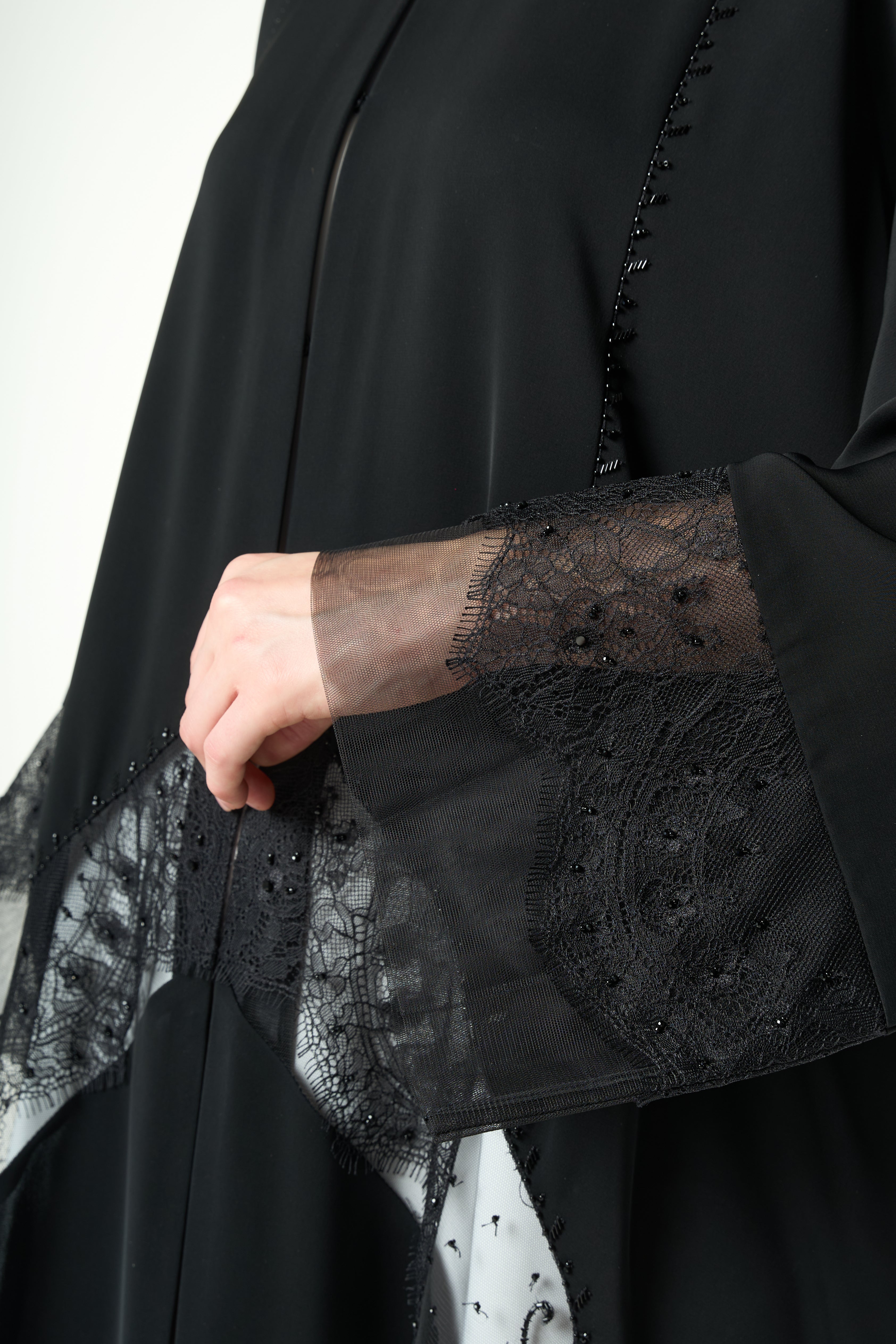 Lace panels run across the lower body and sleeves in a graceful curved formation. The lace is highlighted with delicate hand-applied beadwork that adds a soft shimmer without overwhelming the garment. The combination of lace texture and tonal beads creates depth and movement, giving the abaya a sophisticated and feminine character. A fine top stitch along the hem keeps the finish neat and elevated.