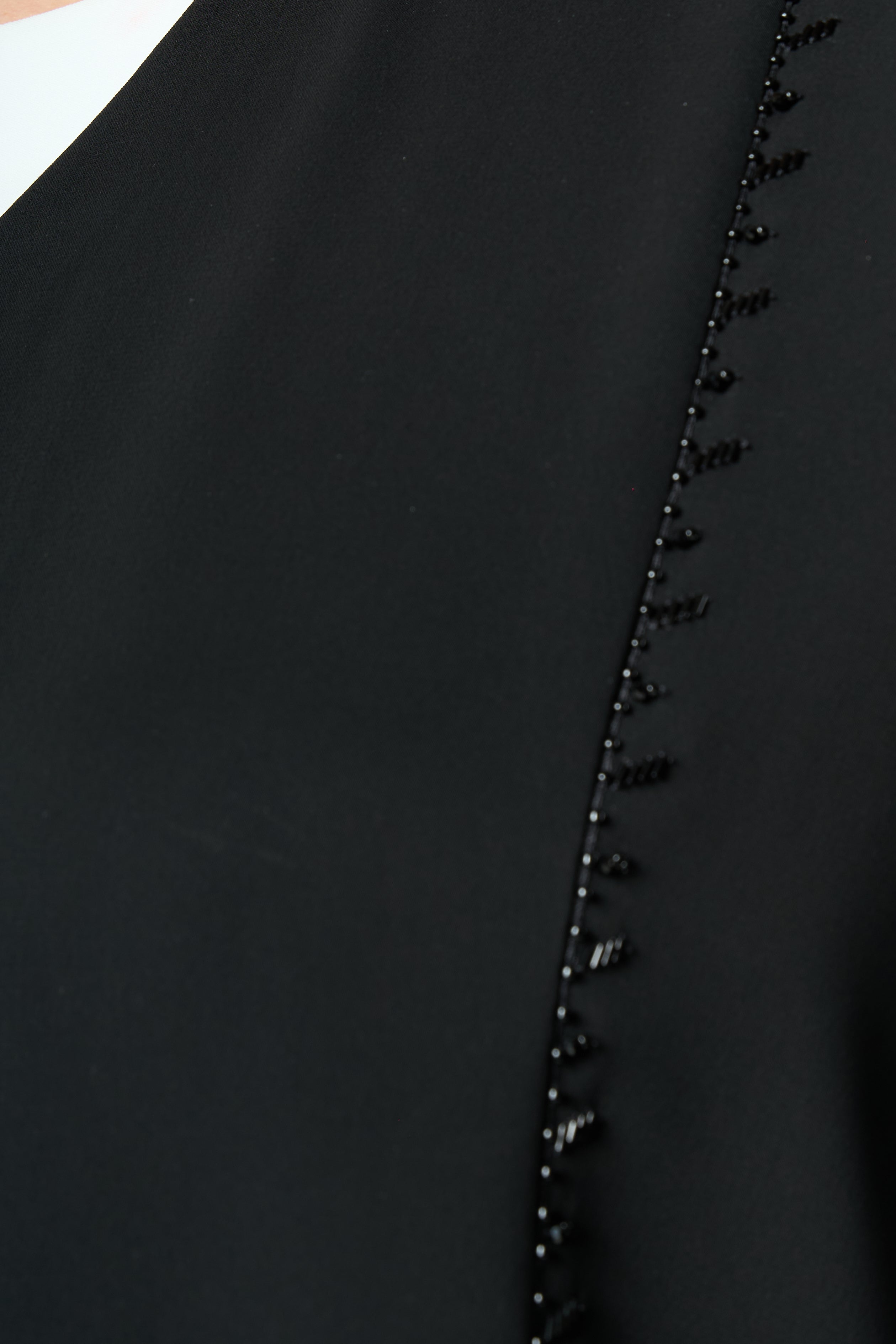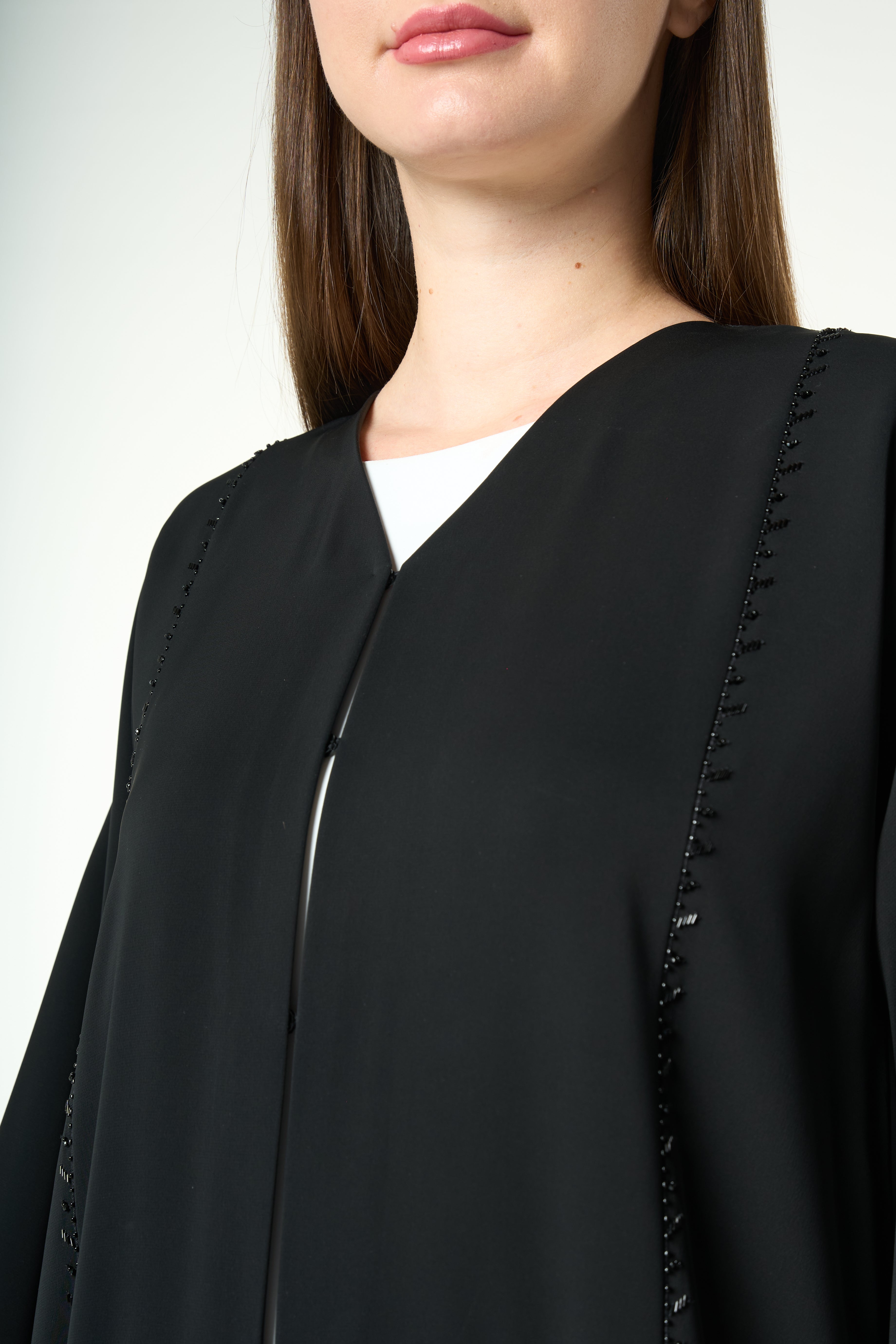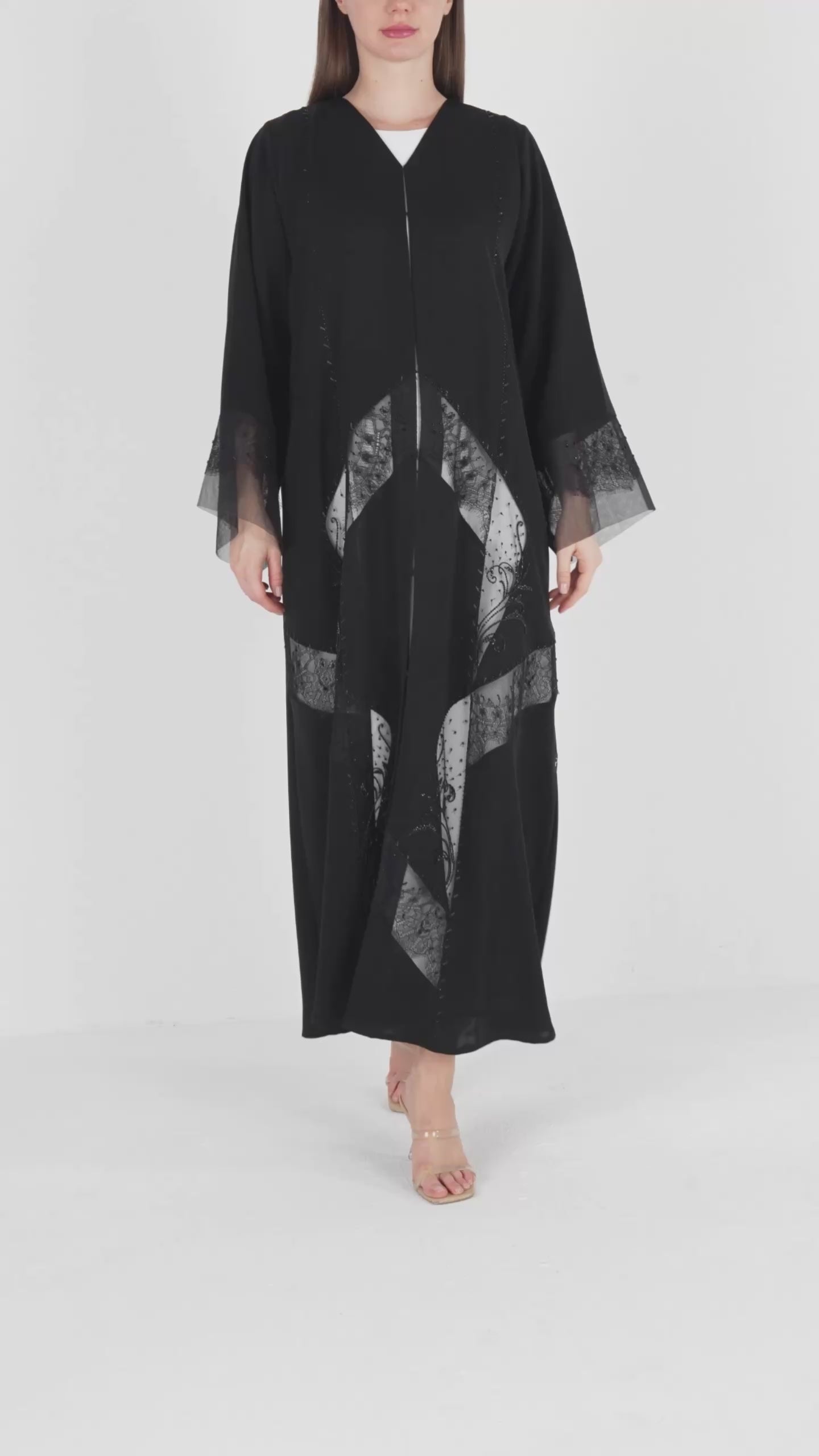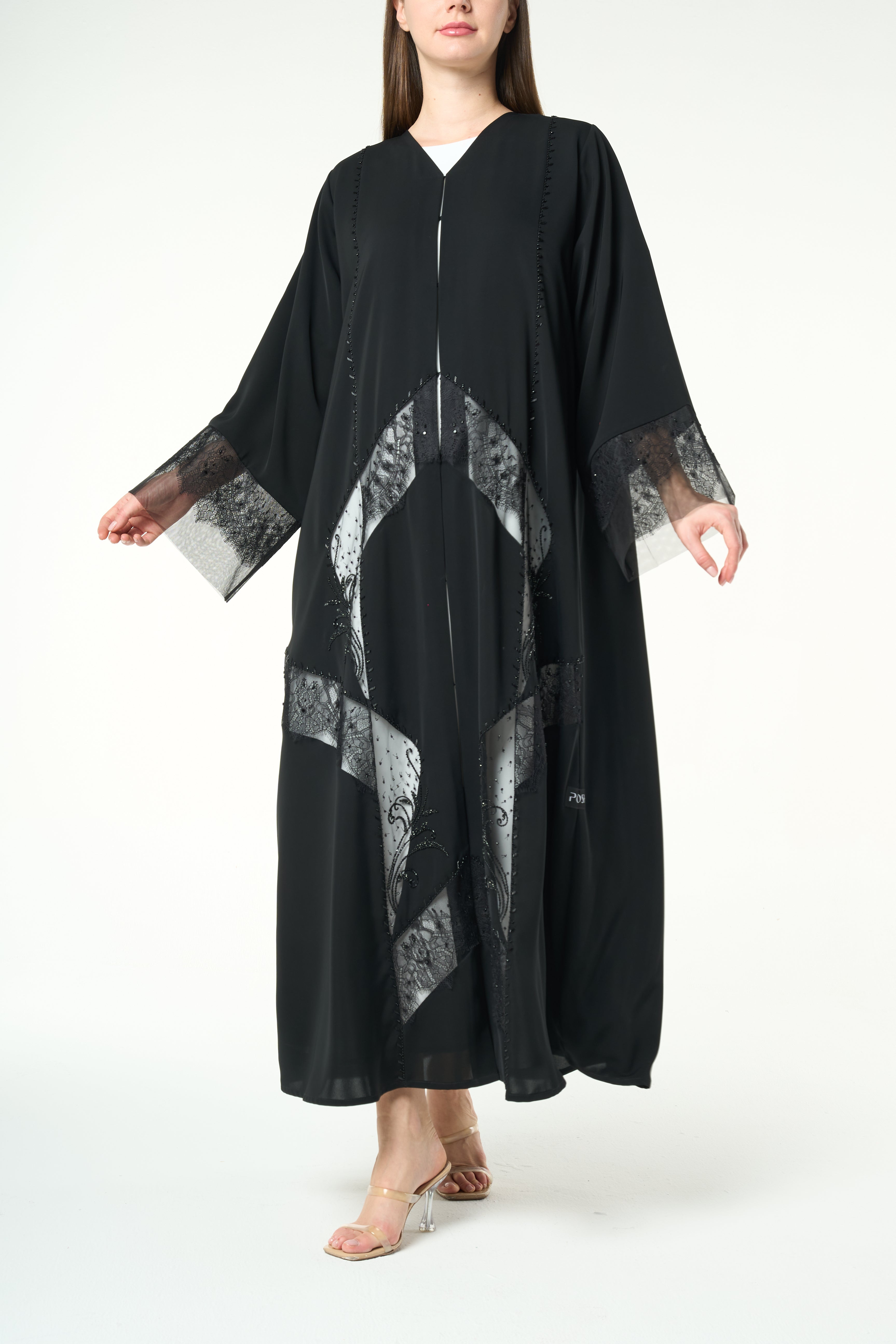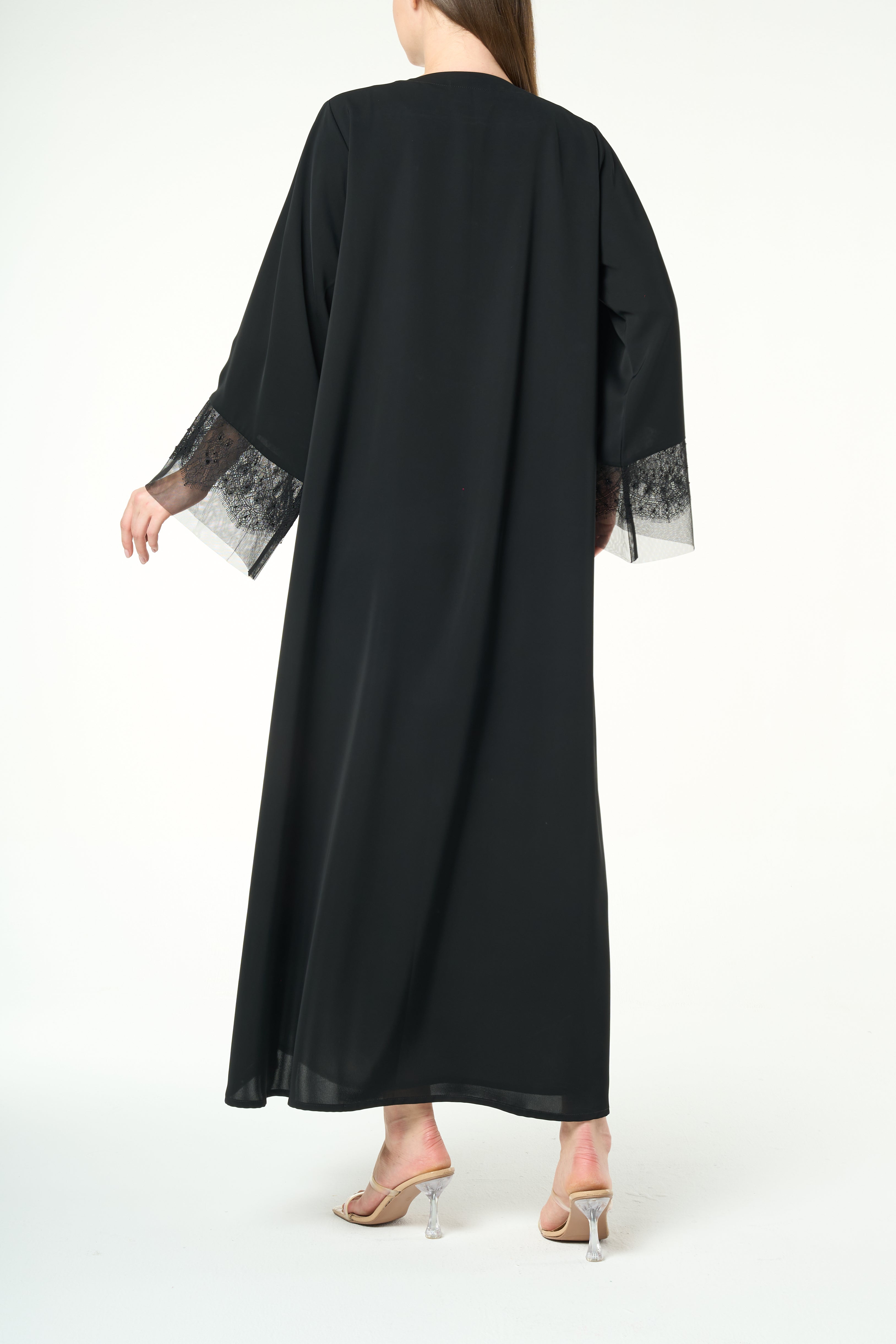 Lace panels run across the lower body and sleeves in a graceful curved formation. The lace is highlighted with delicate hand-applied beadwork that adds a soft shimmer without overwhelming the garment. The combination of lace texture and tonal beads creates depth and movement, giving the abaya a sophisticated and feminine character. A fine top stitch along the hem keeps the finish neat and elevated.