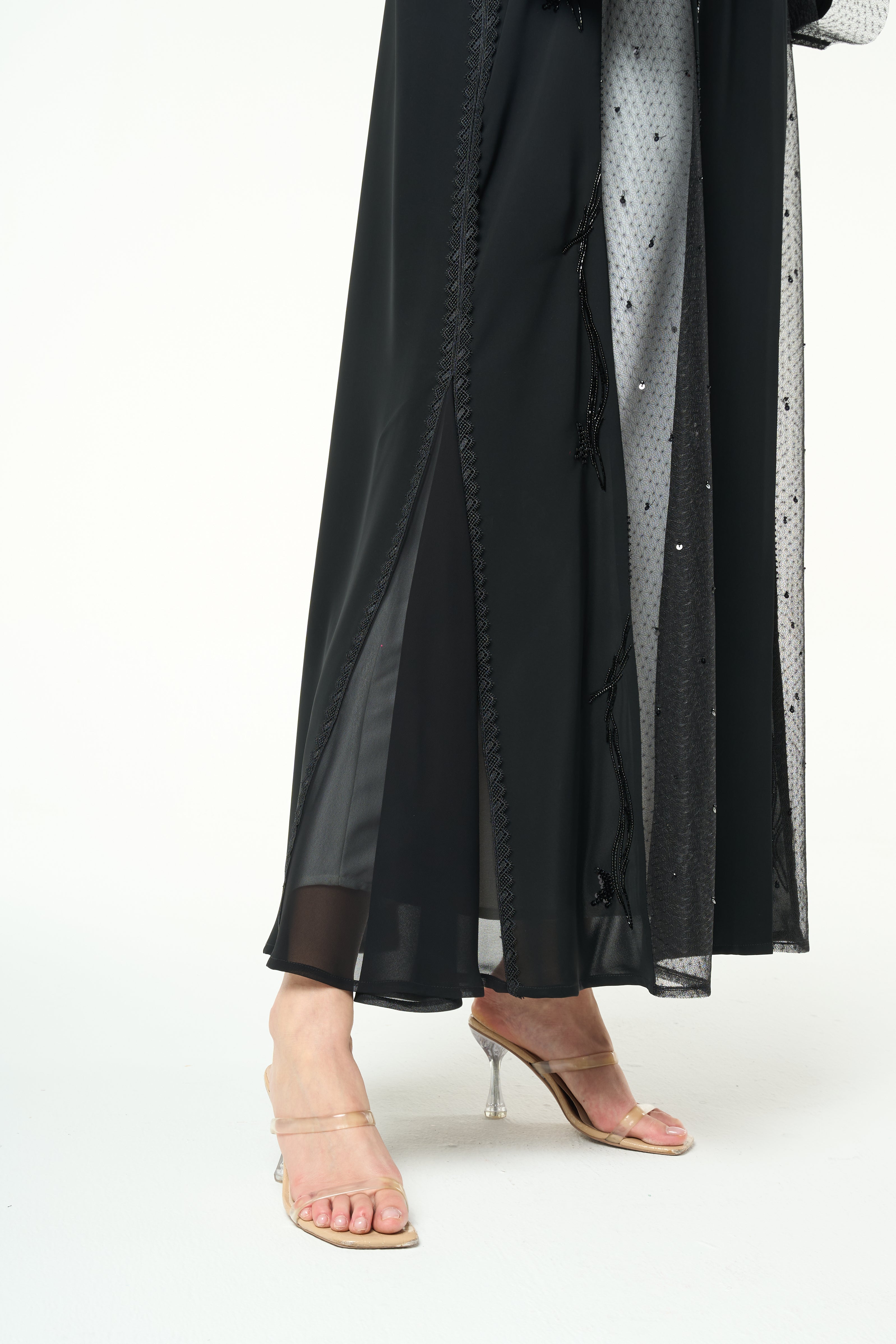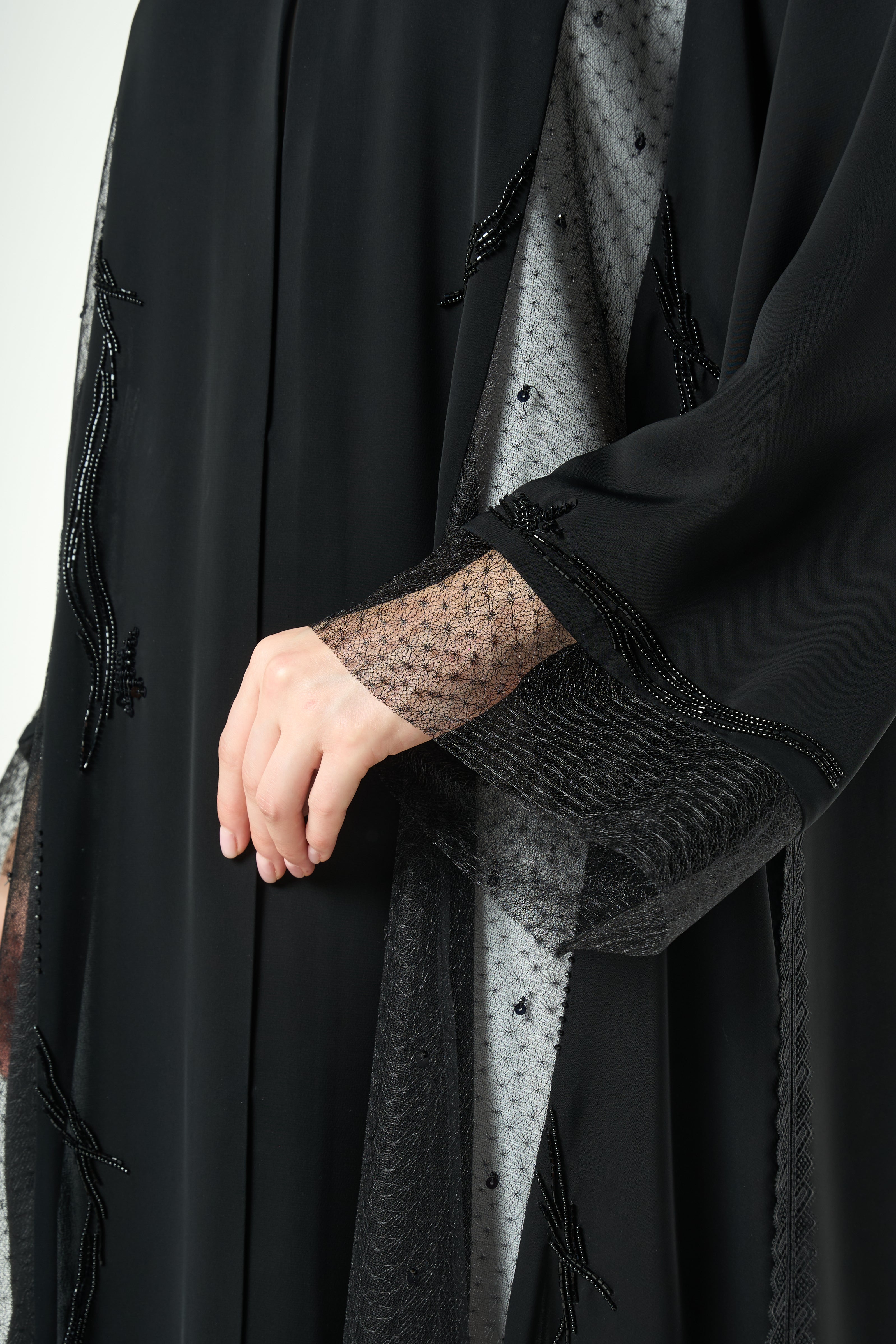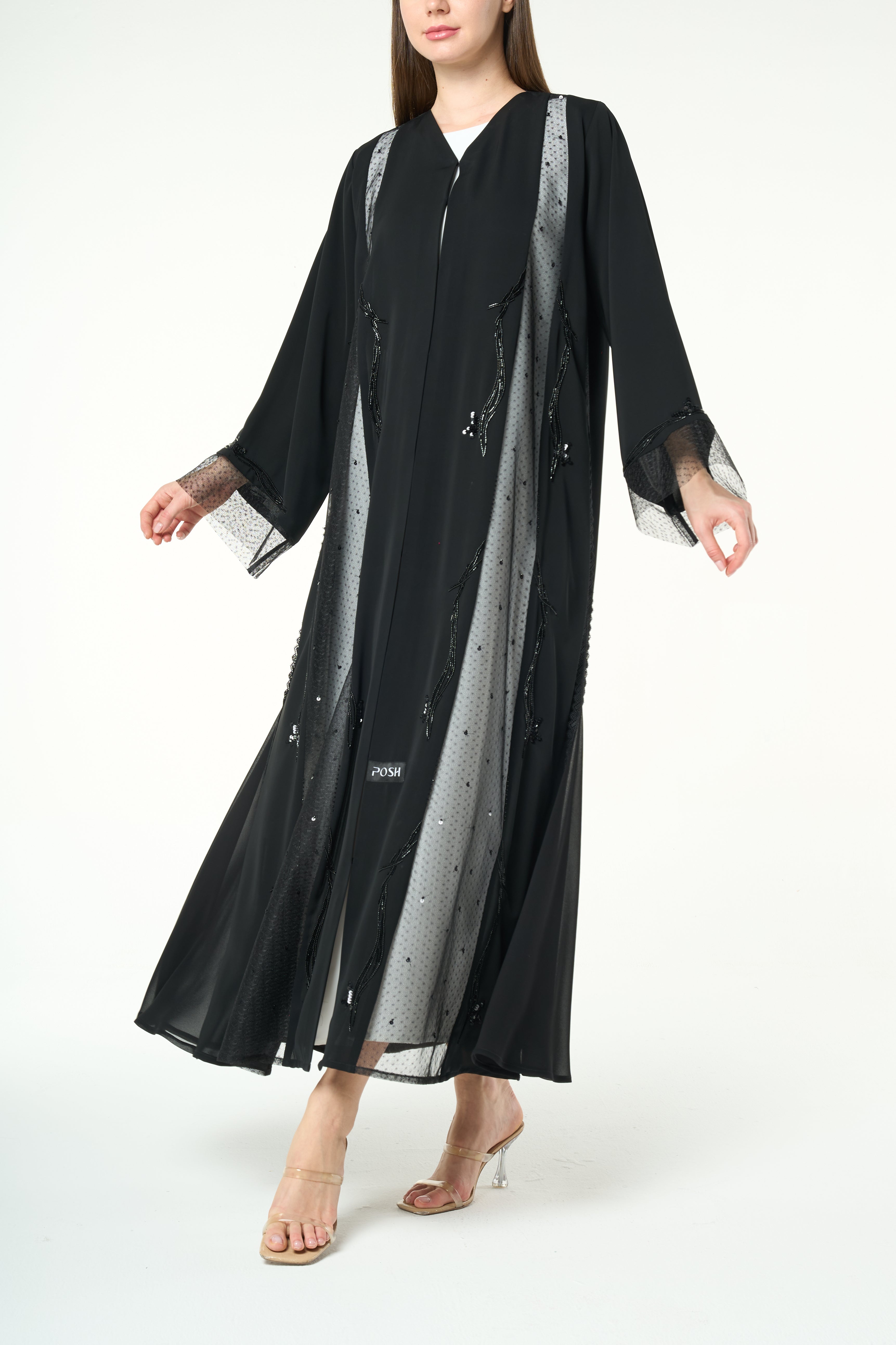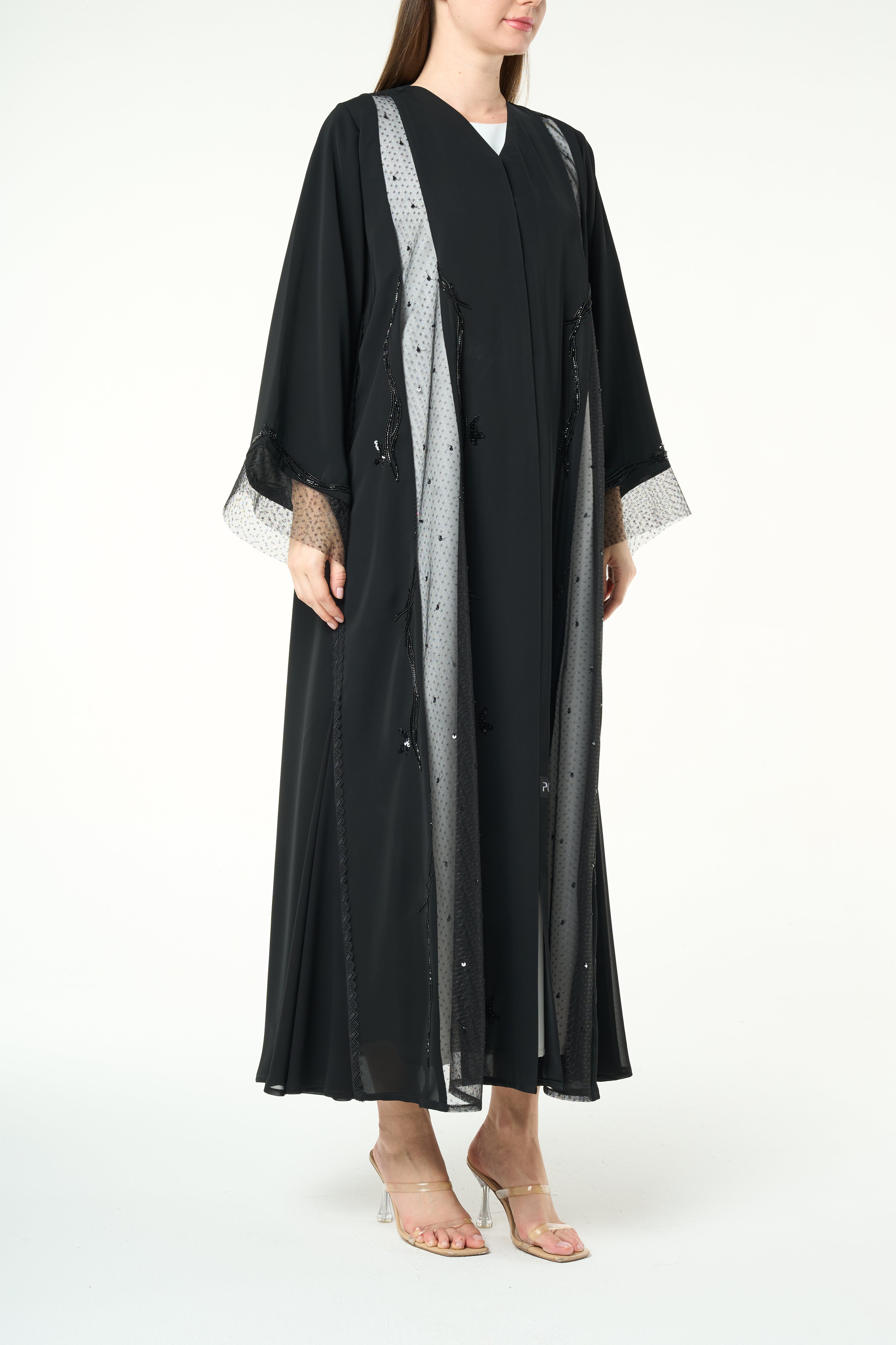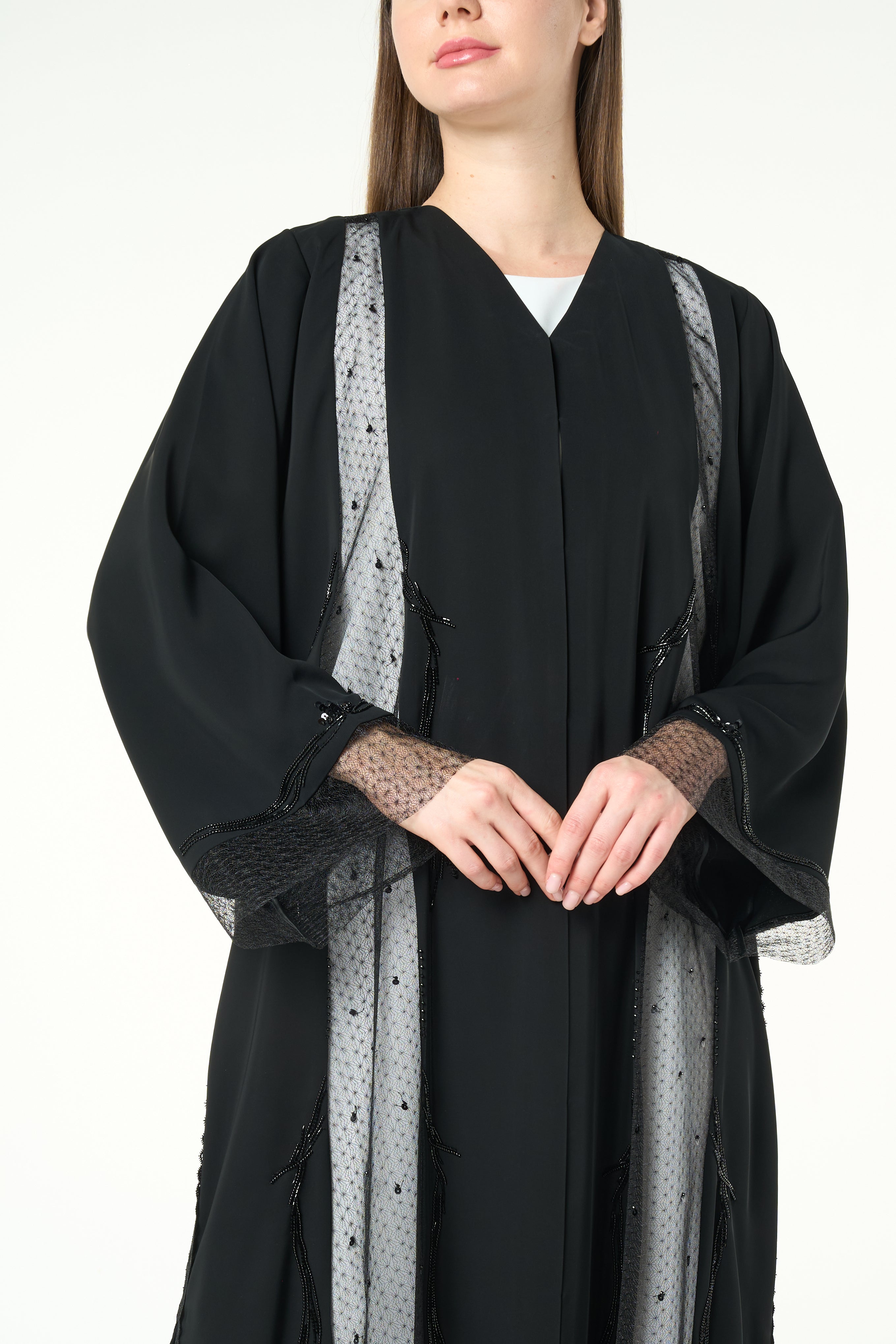 The body features long vertical panels with delicate beadwork placed in a repeated linear pattern. The lines run from the shoulder to the hem which adds length and a graceful structured feel to the design. The placement is balanced and subtle which gives the abaya a touch of sparkle without making it heavy. The sleeves carry matching beadwork and a soft net finish that adds texture and a light layered effect.