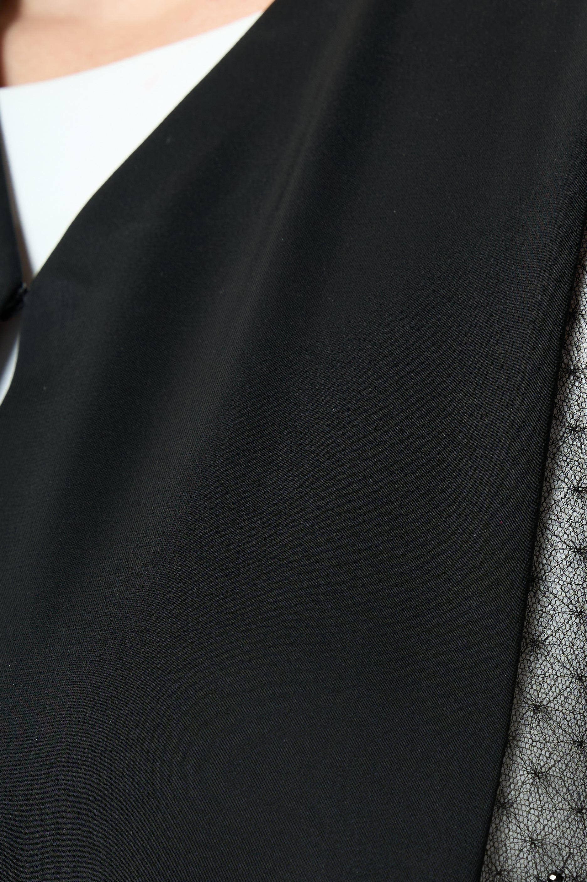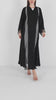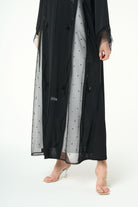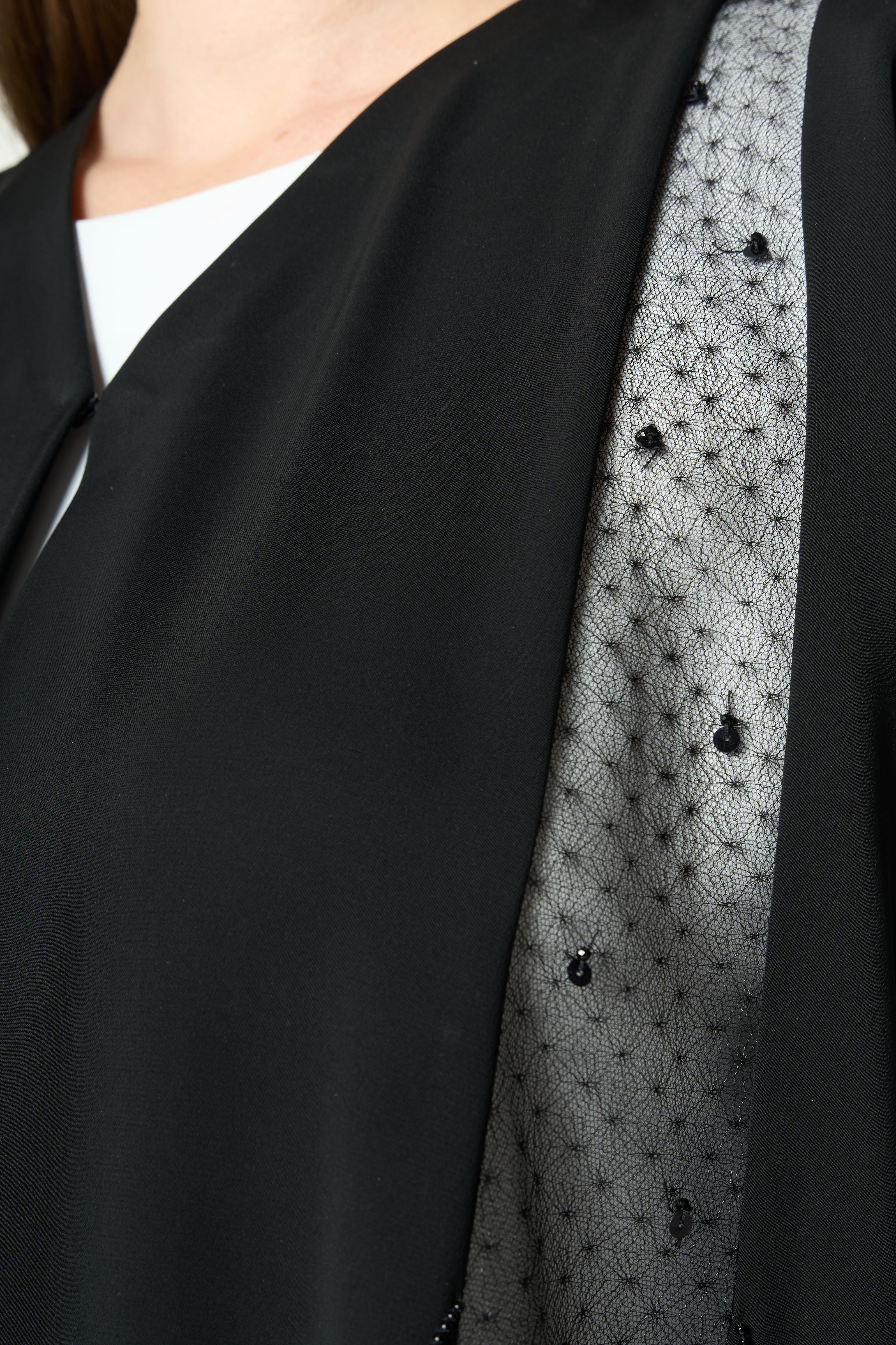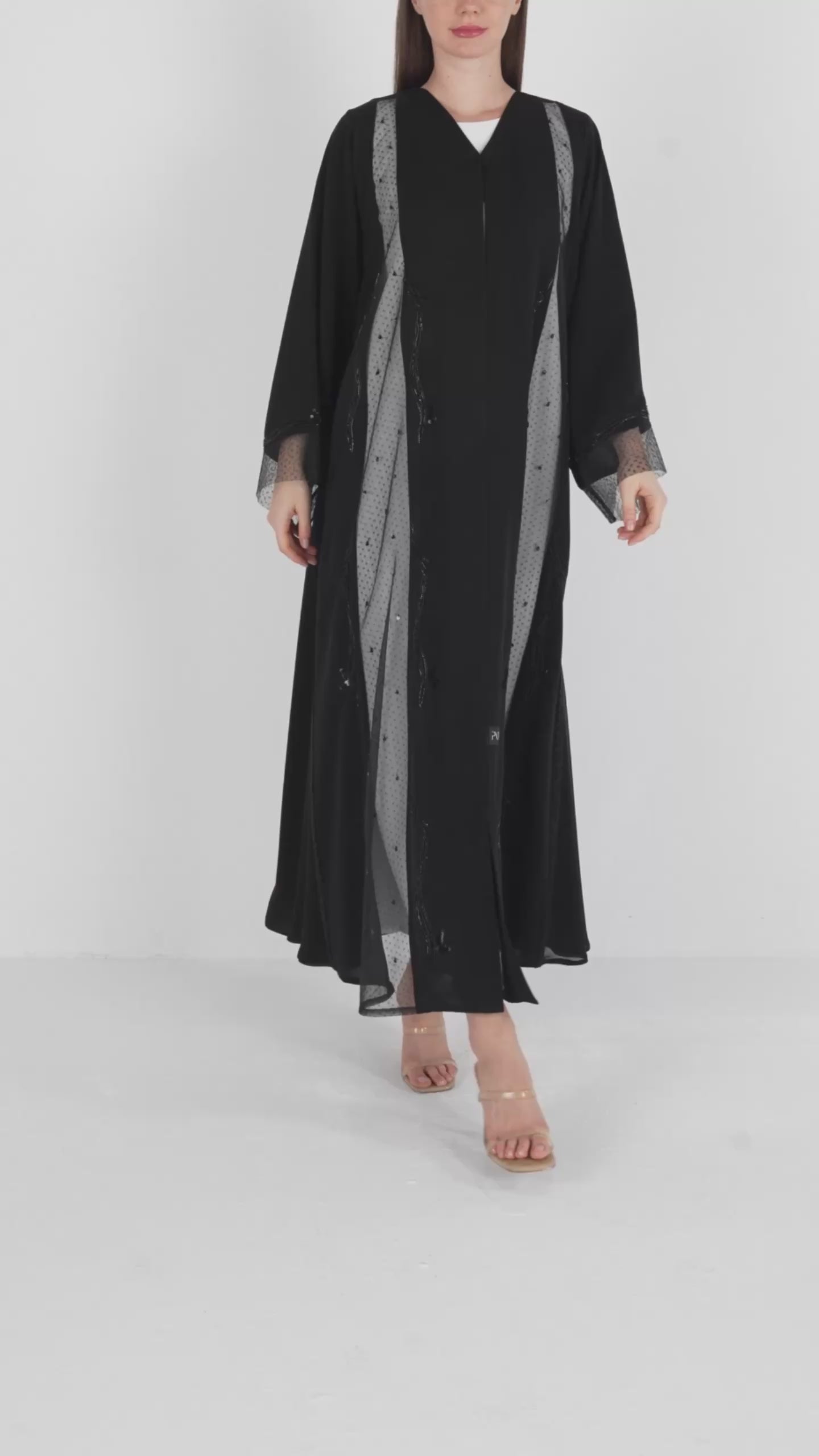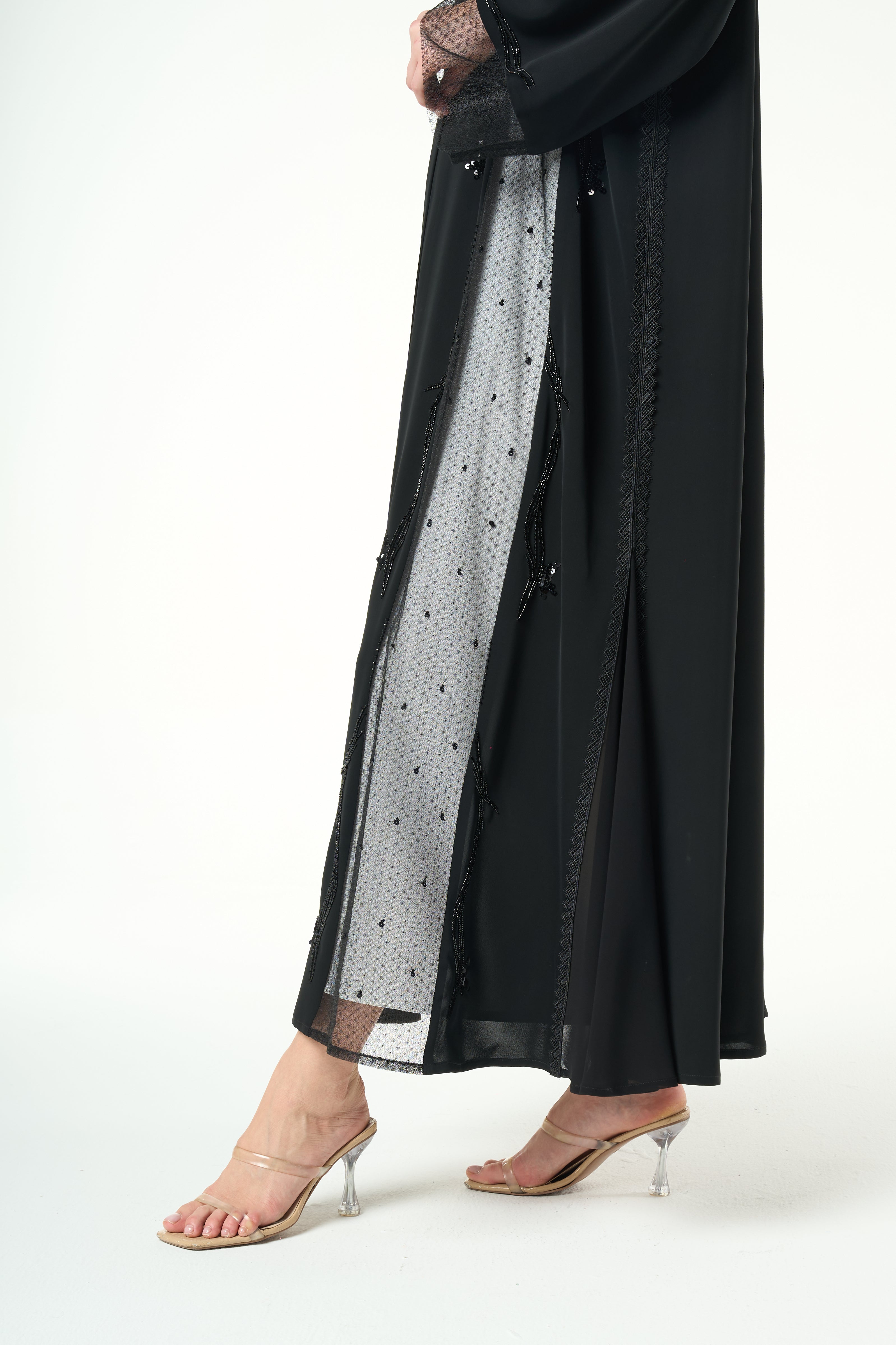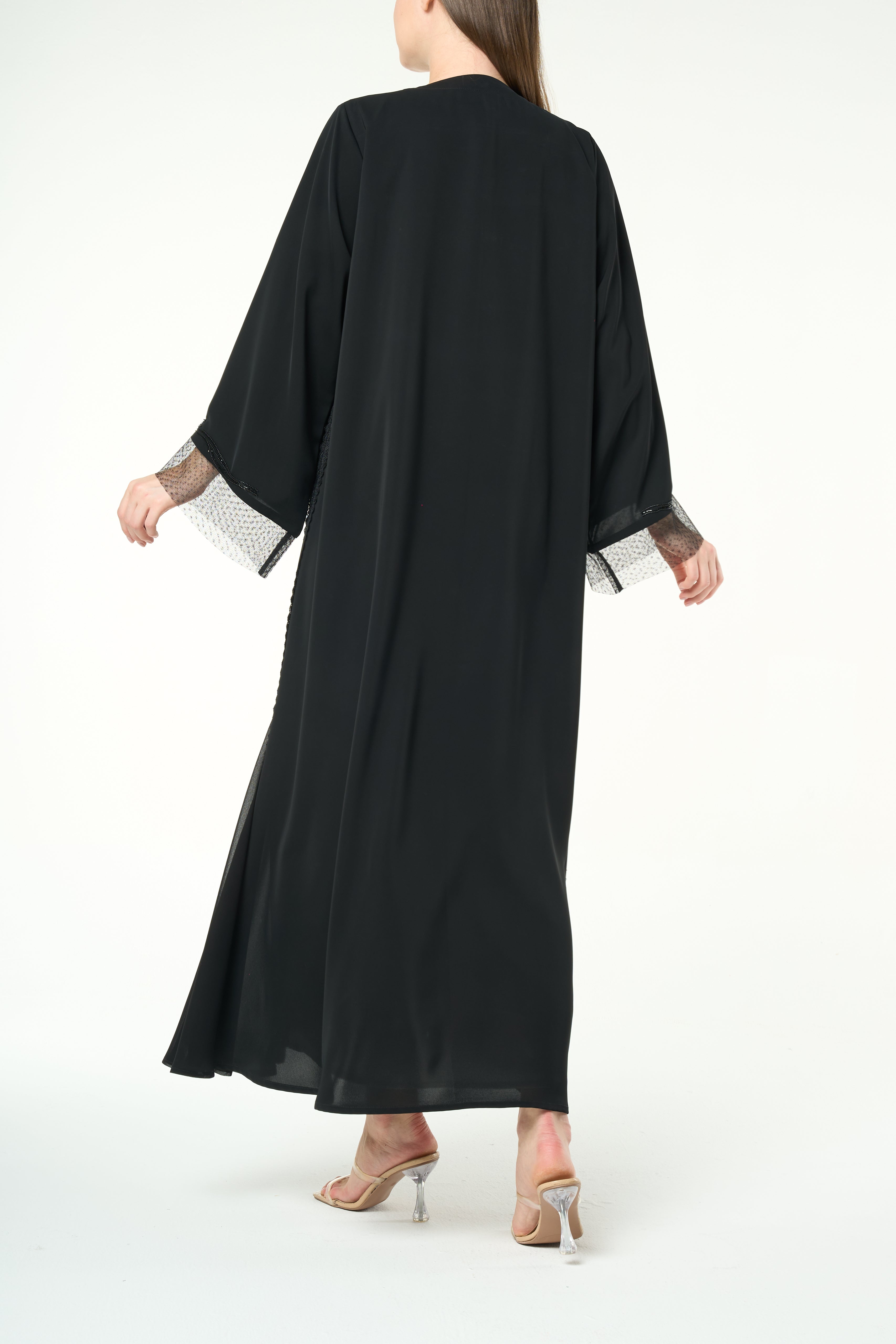The body features long vertical panels with delicate beadwork placed in a repeated linear pattern. The lines run from the shoulder to the hem which adds length and a graceful structured feel to the design. The placement is balanced and subtle which gives the abaya a touch of sparkle without making it heavy. The sleeves carry matching beadwork and a soft net finish that adds texture and a light layered effect.
