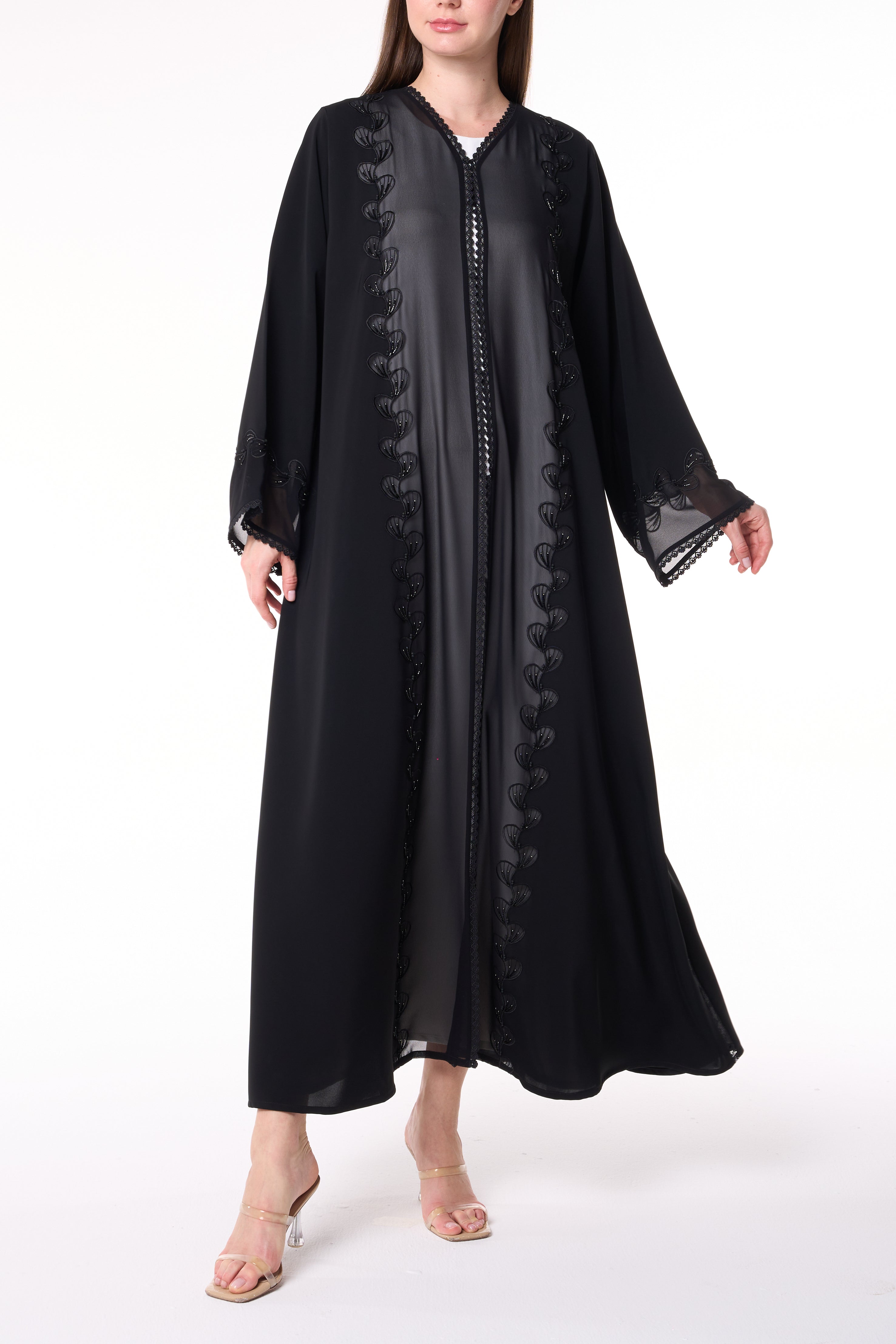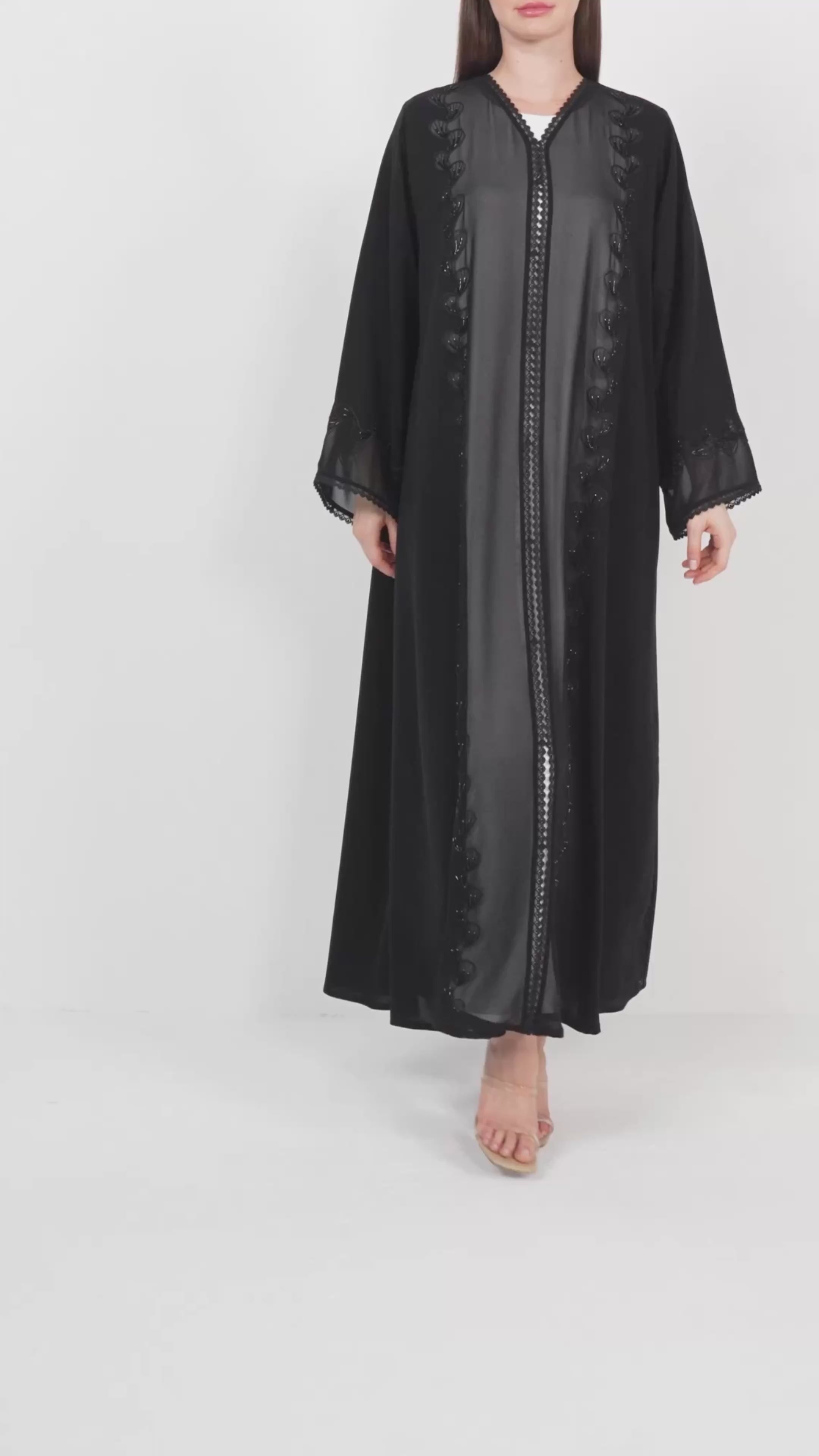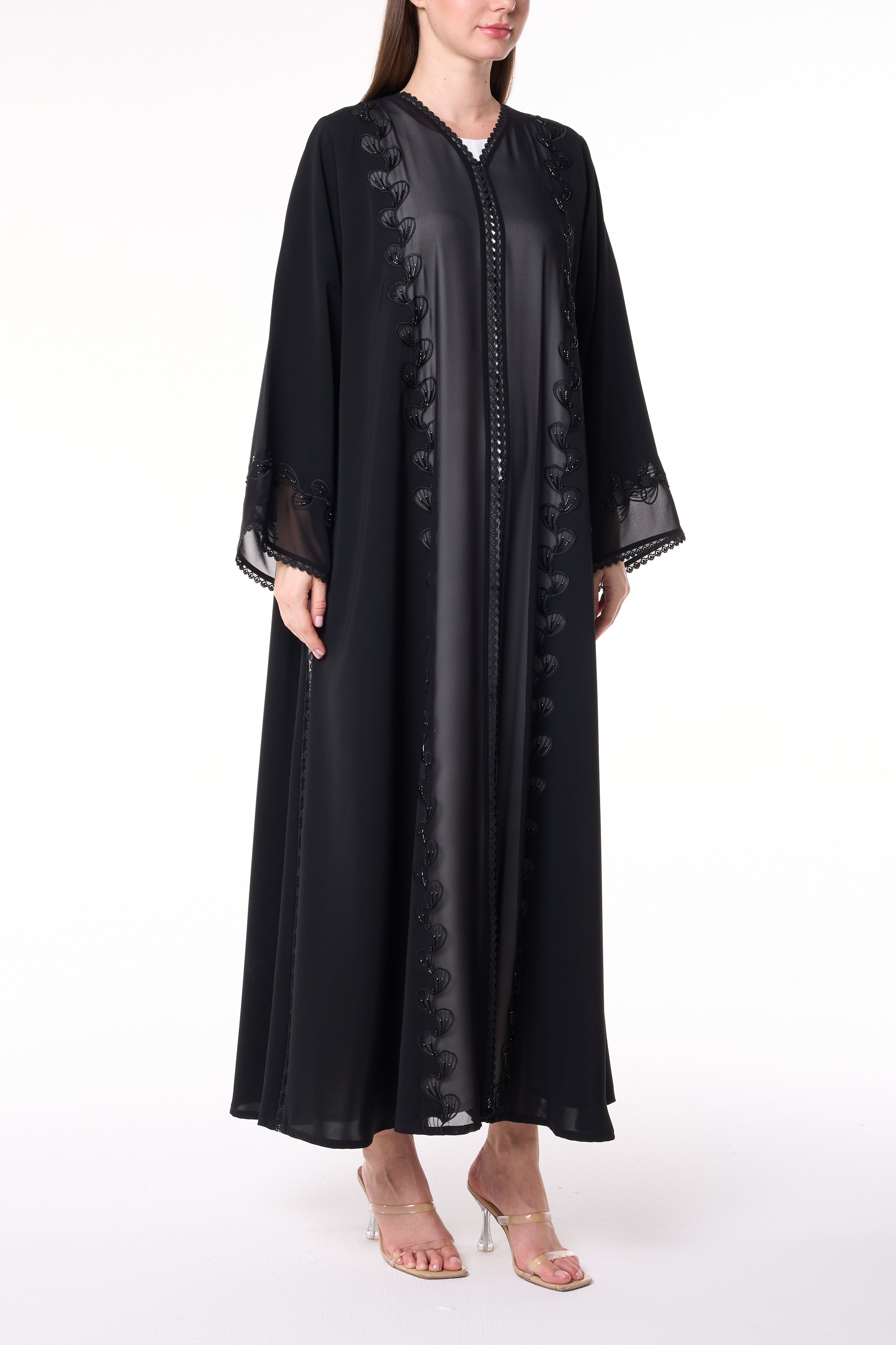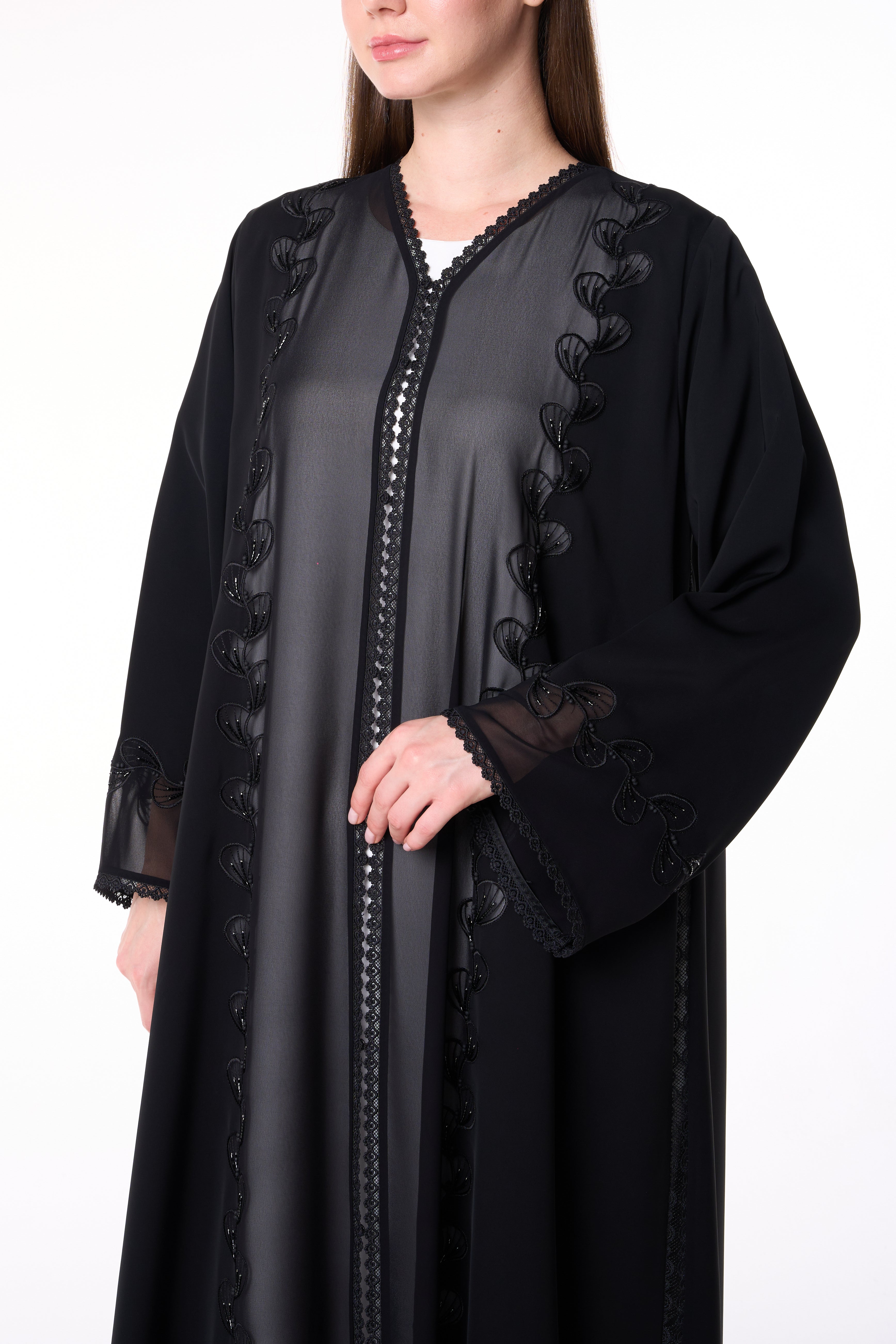Light chiffon is layered subtly within the embroidery lines, enhancing depth and light reflection against the matte texture of the Royal Nada fabric. This abaya blends artisanal precision with modern refinement — perfect for Ramadan gatherings, Eid occasions, or elegant evening wear.