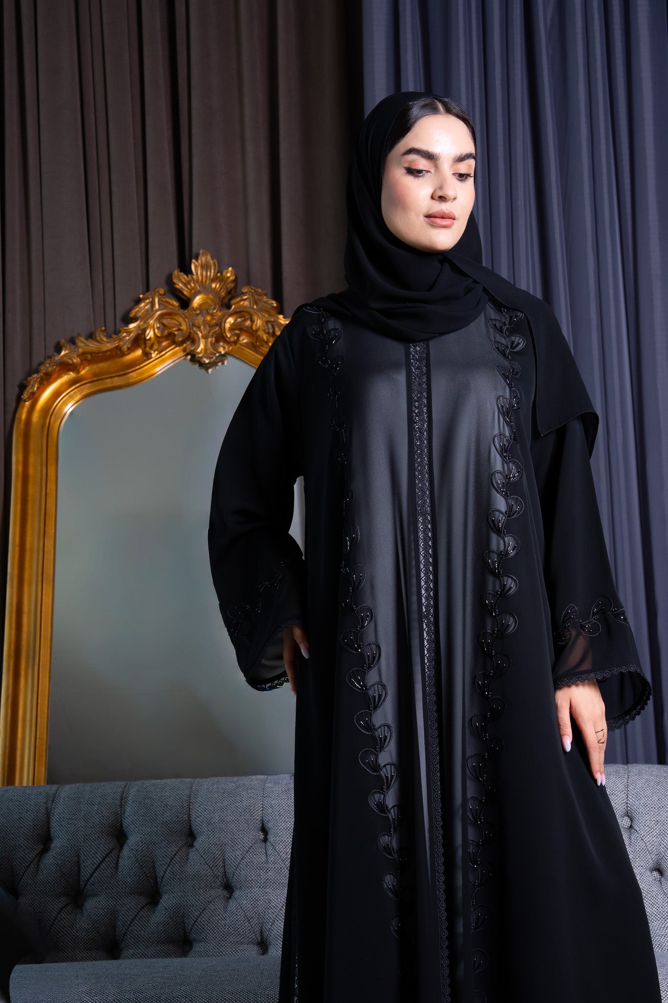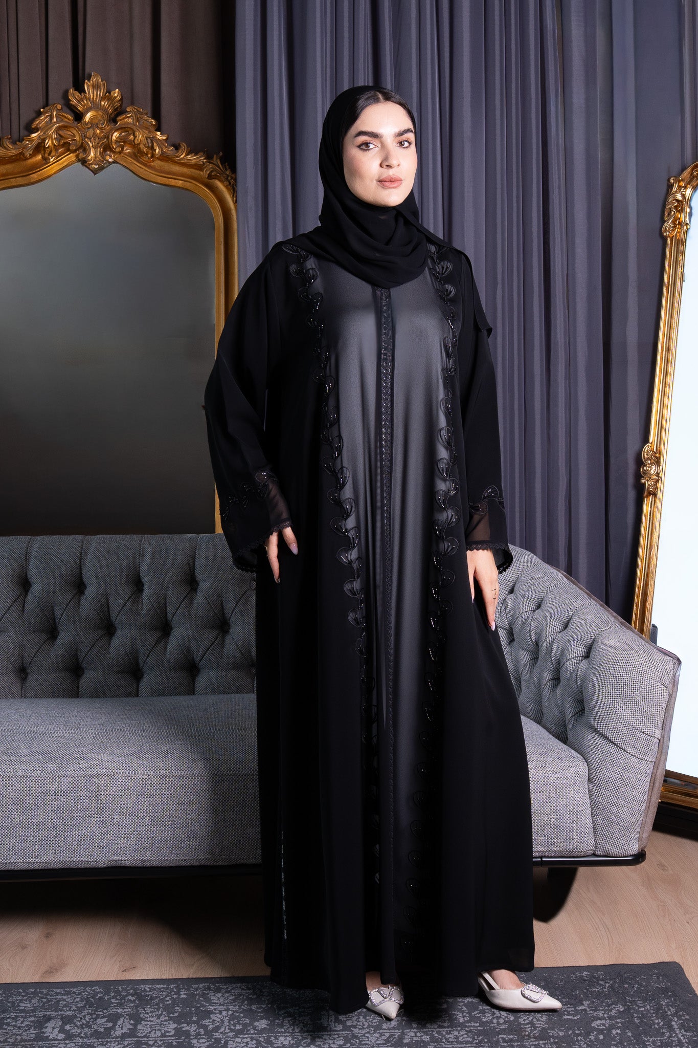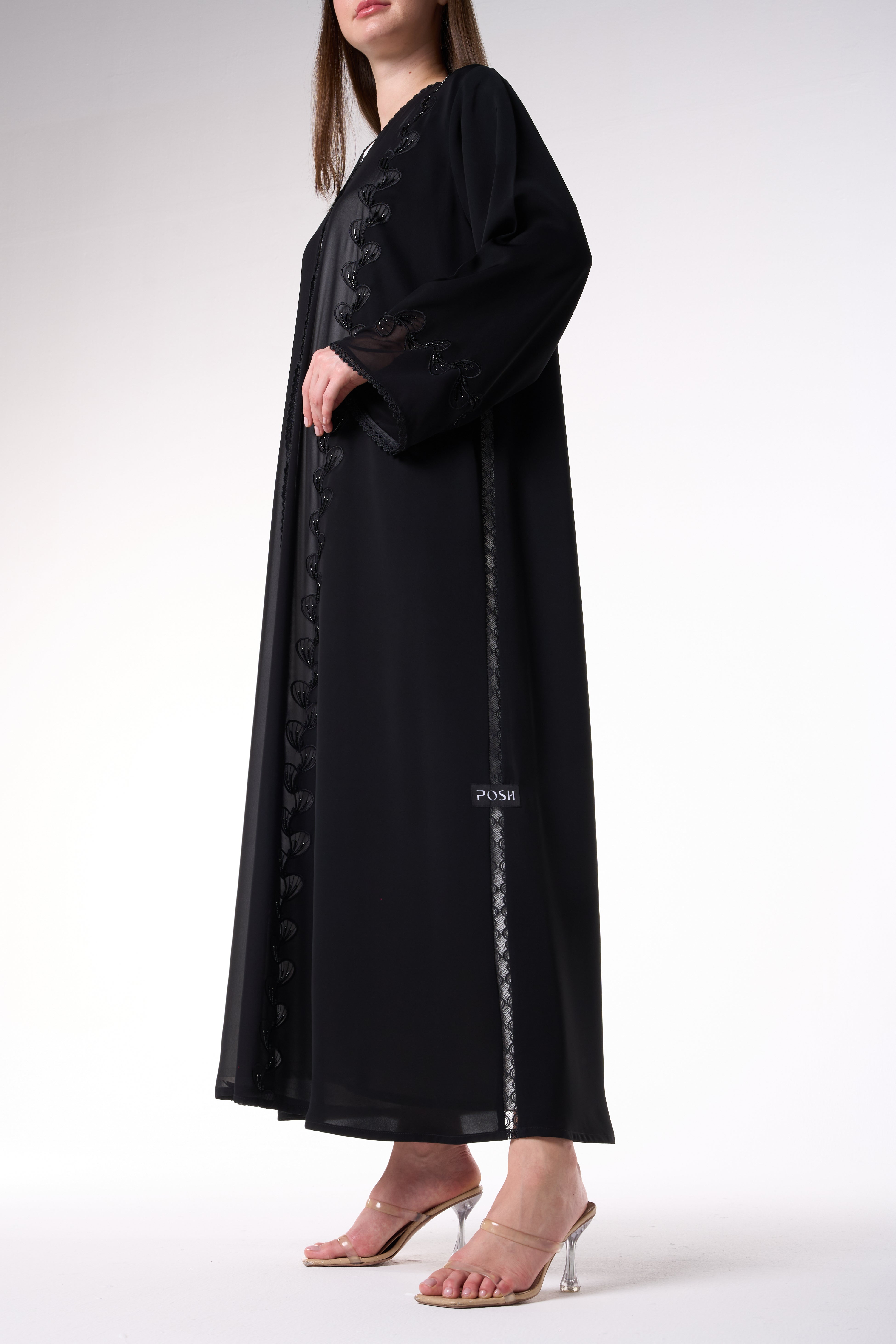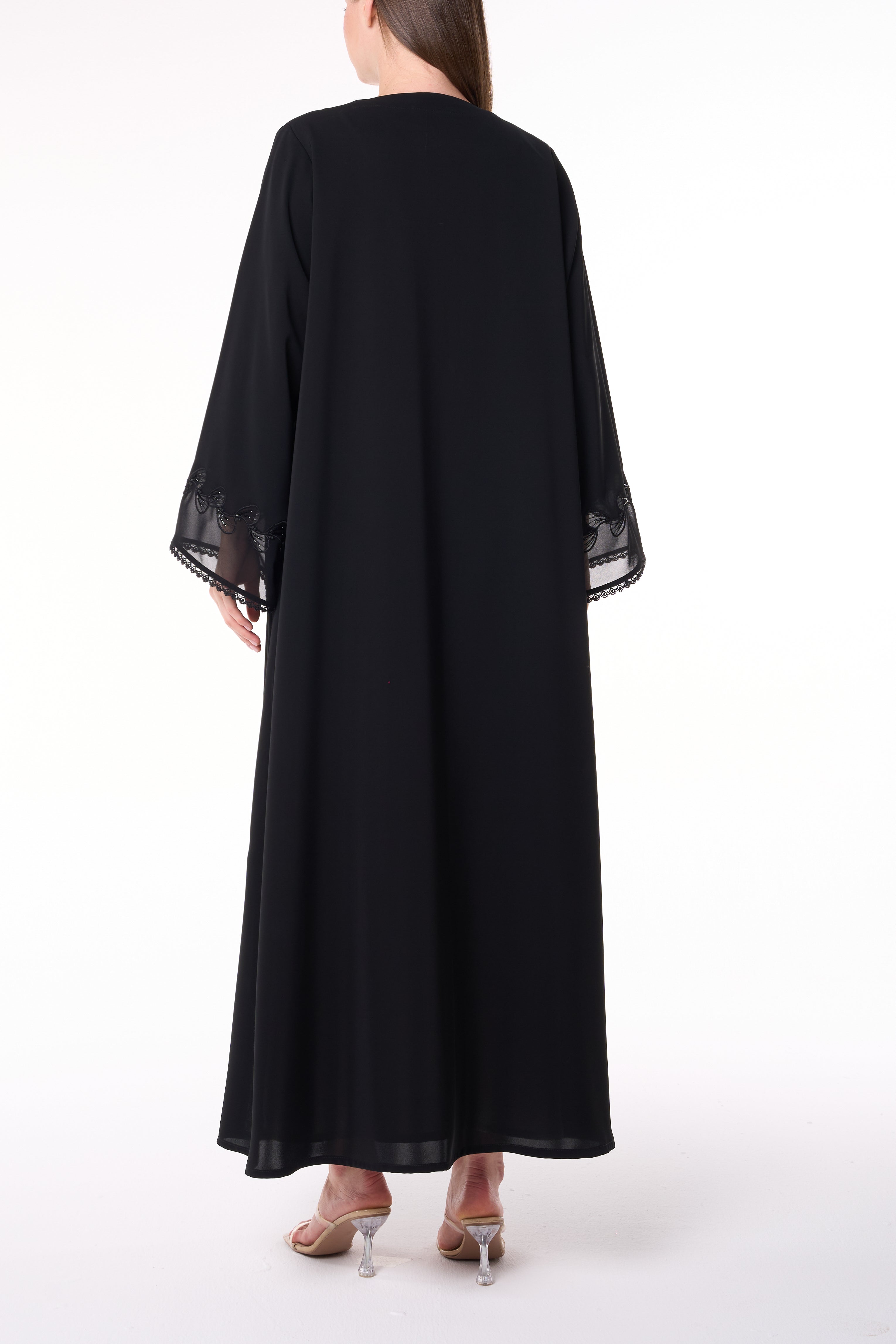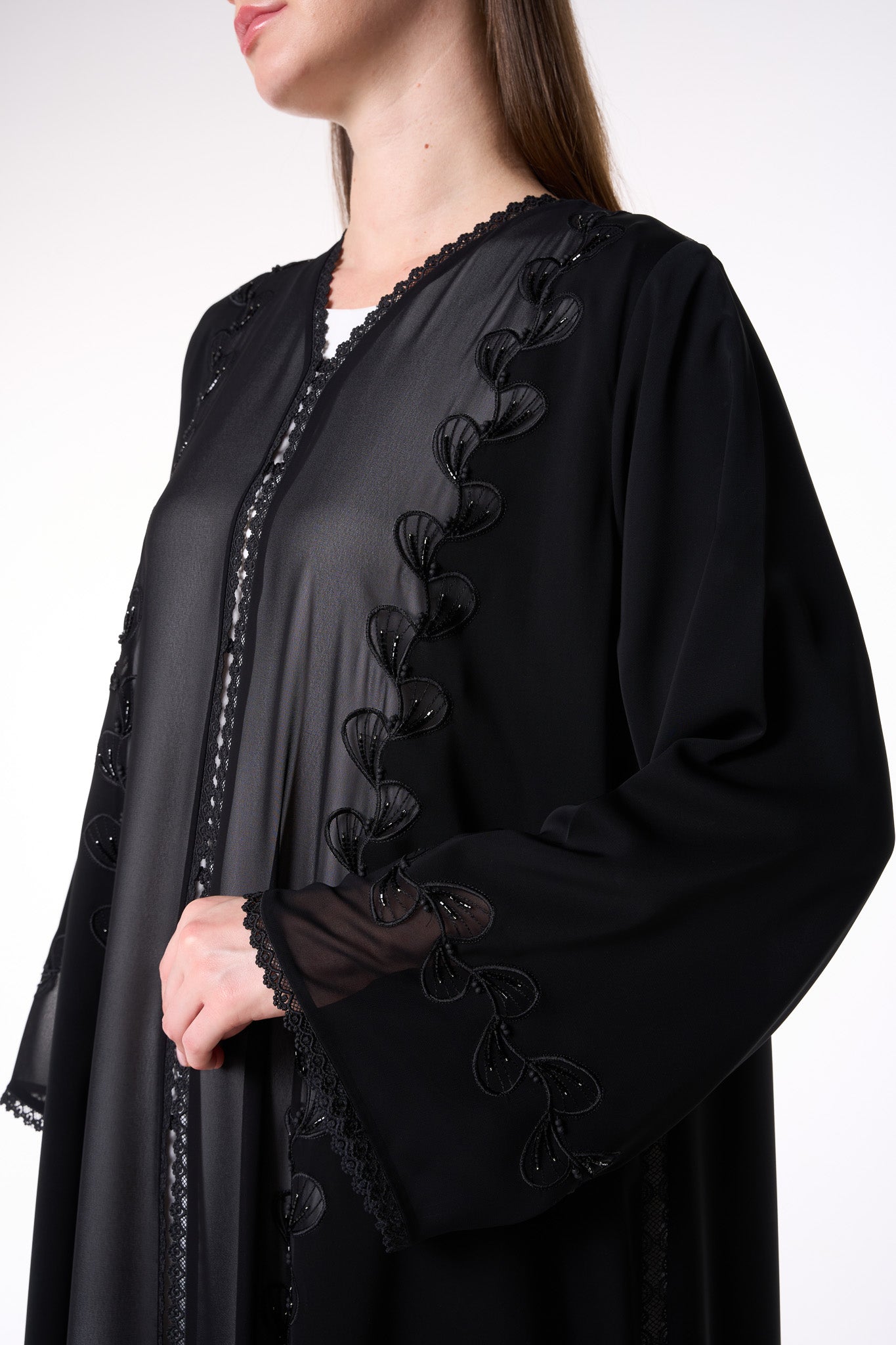 Light chiffon is layered subtly within the embroidery lines, enhancing depth and light reflection against the matte texture of the Royal Nada fabric. This abaya blends artisanal precision with modern refinement — perfect for Ramadan gatherings, Eid occasions, or elegant evening wear.
