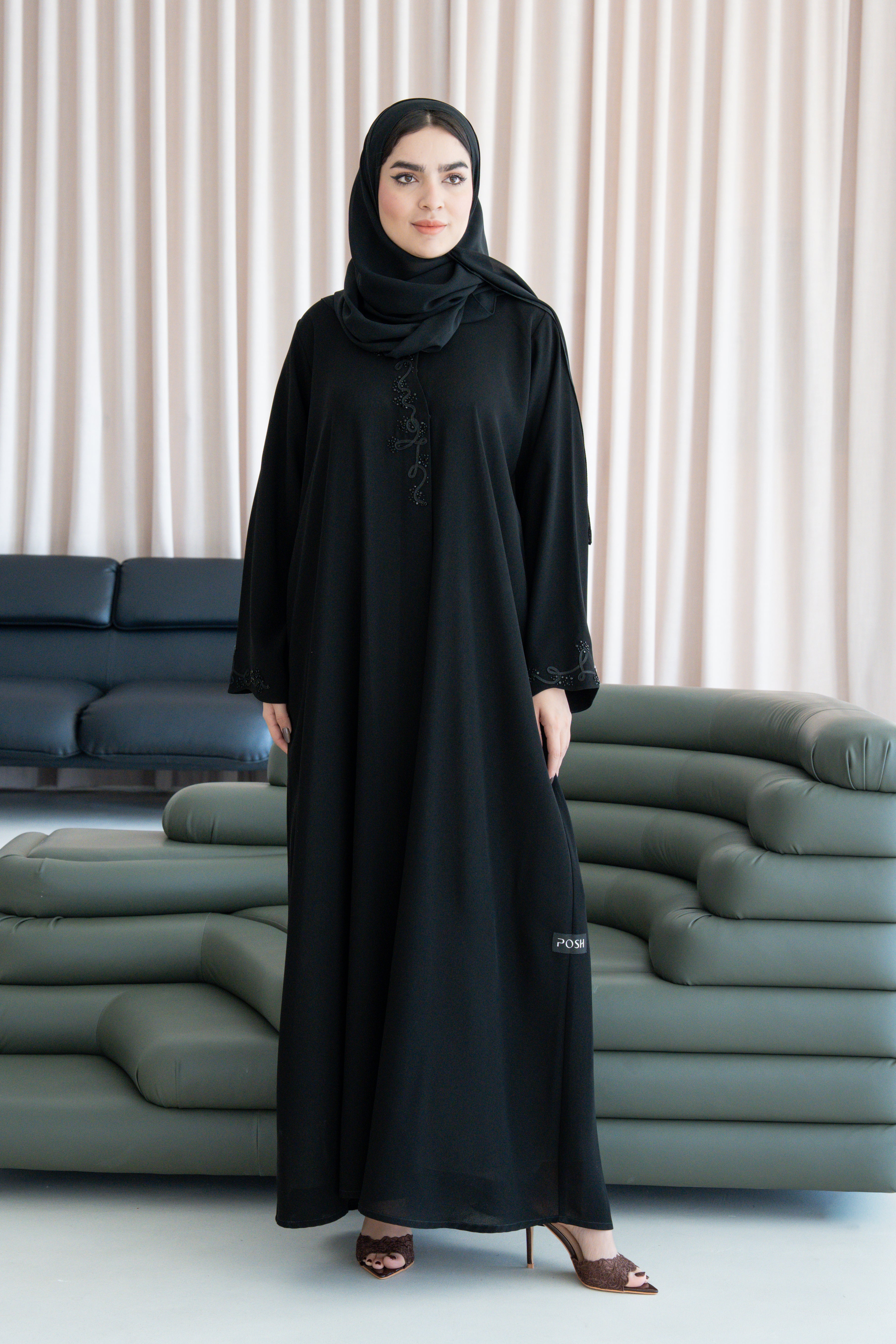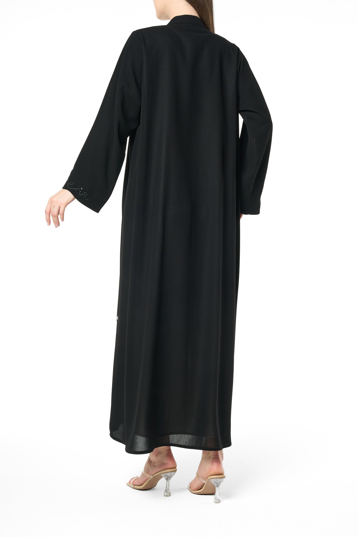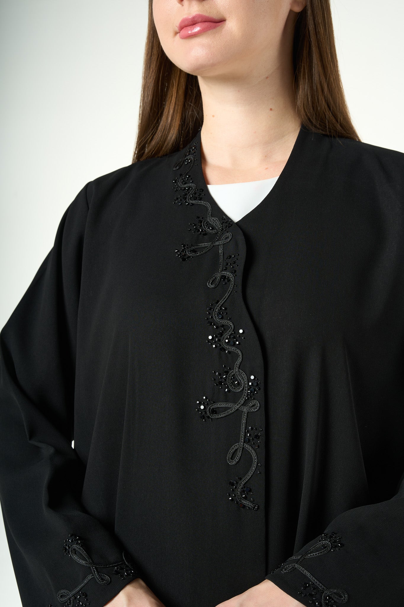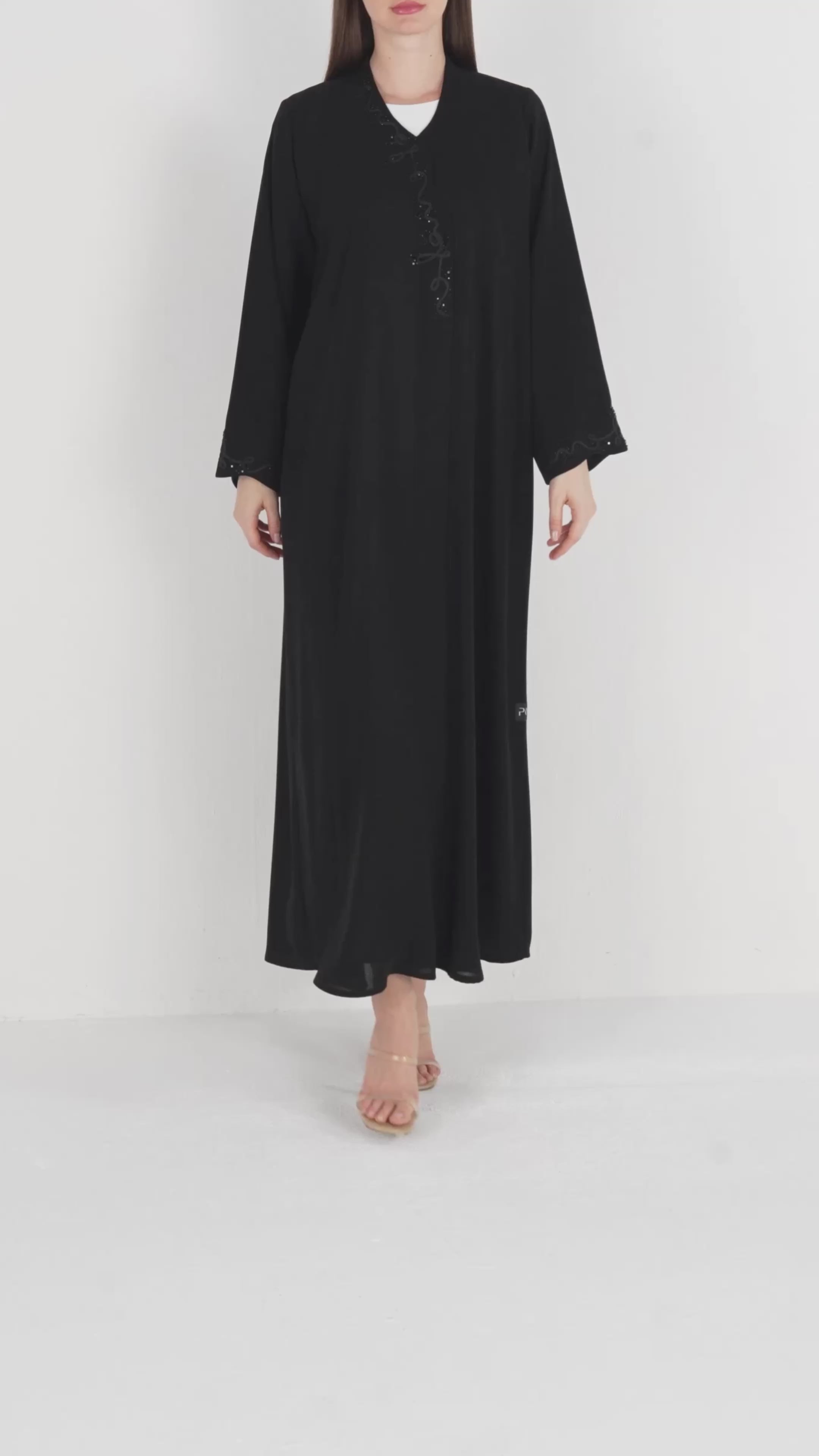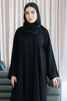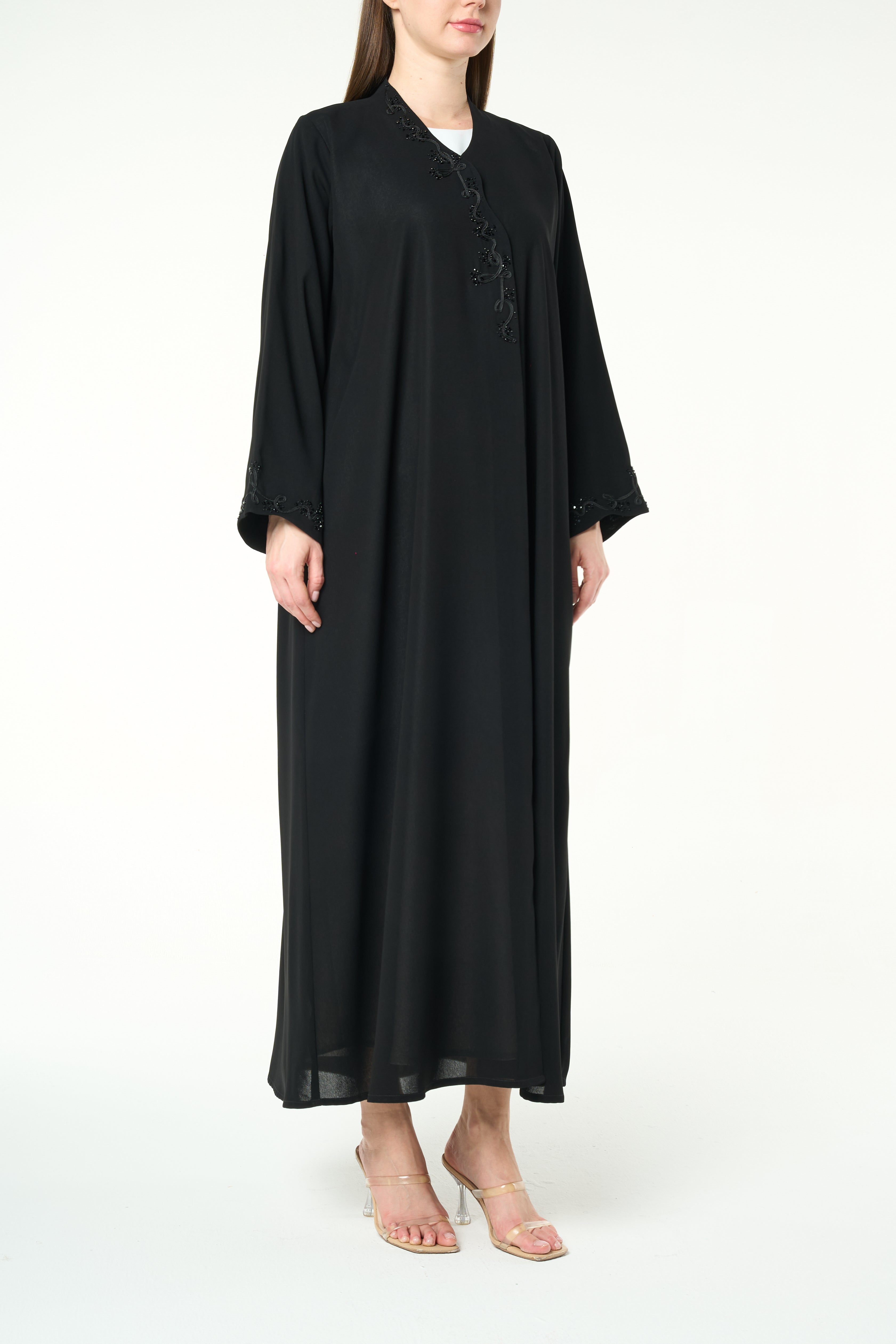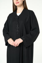 The standout feature of this design is the delicate beaded vine artwork placed along the front opening and at the sleeve hems. The beadwork forms an organic, swirling pattern that adds texture, depth and a touch of graceful shimmer without overpowering the simplicity of the abaya. This balance of minimal structure and fine detailing makes the piece ideal for both everyday wear and polished social gatherings.