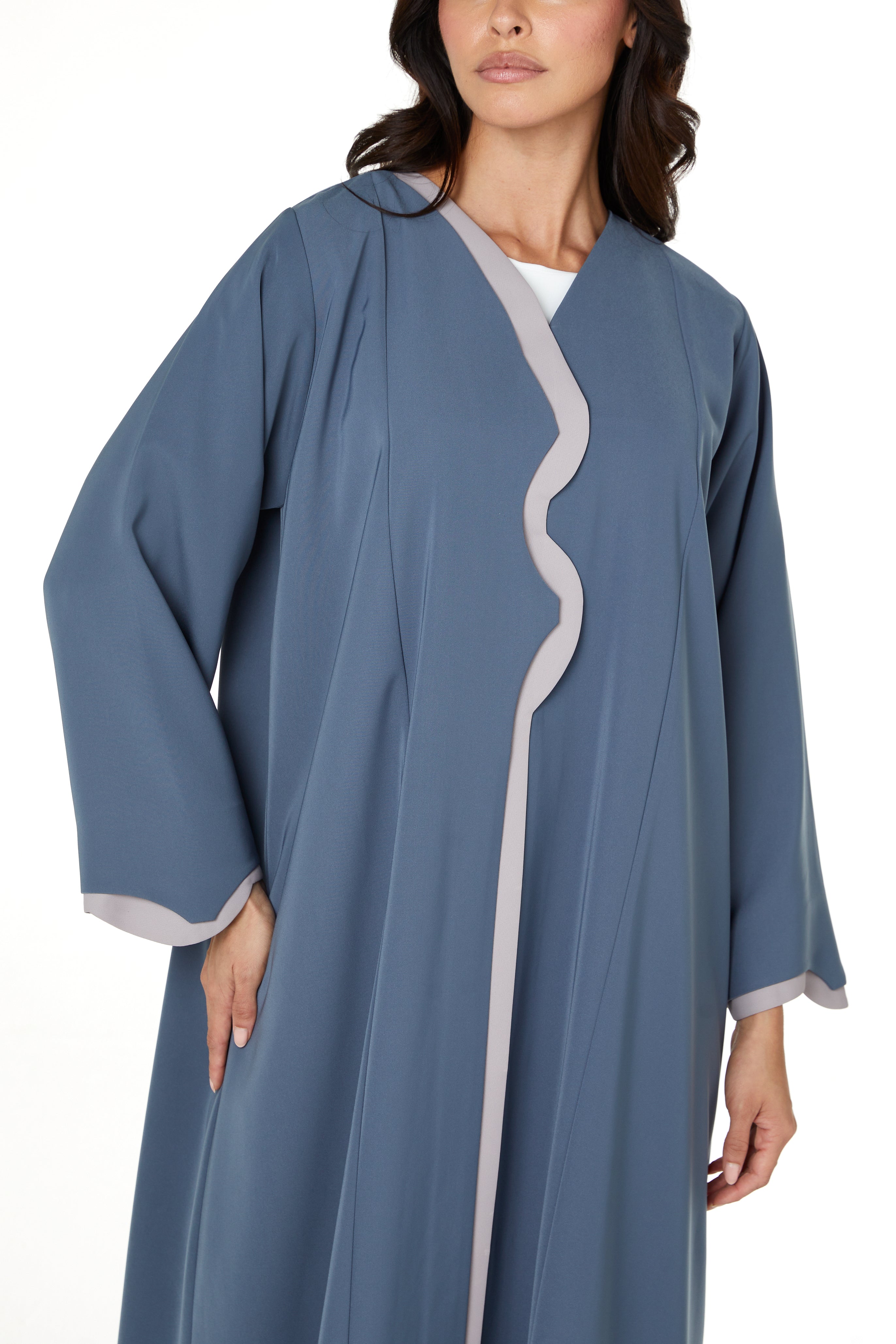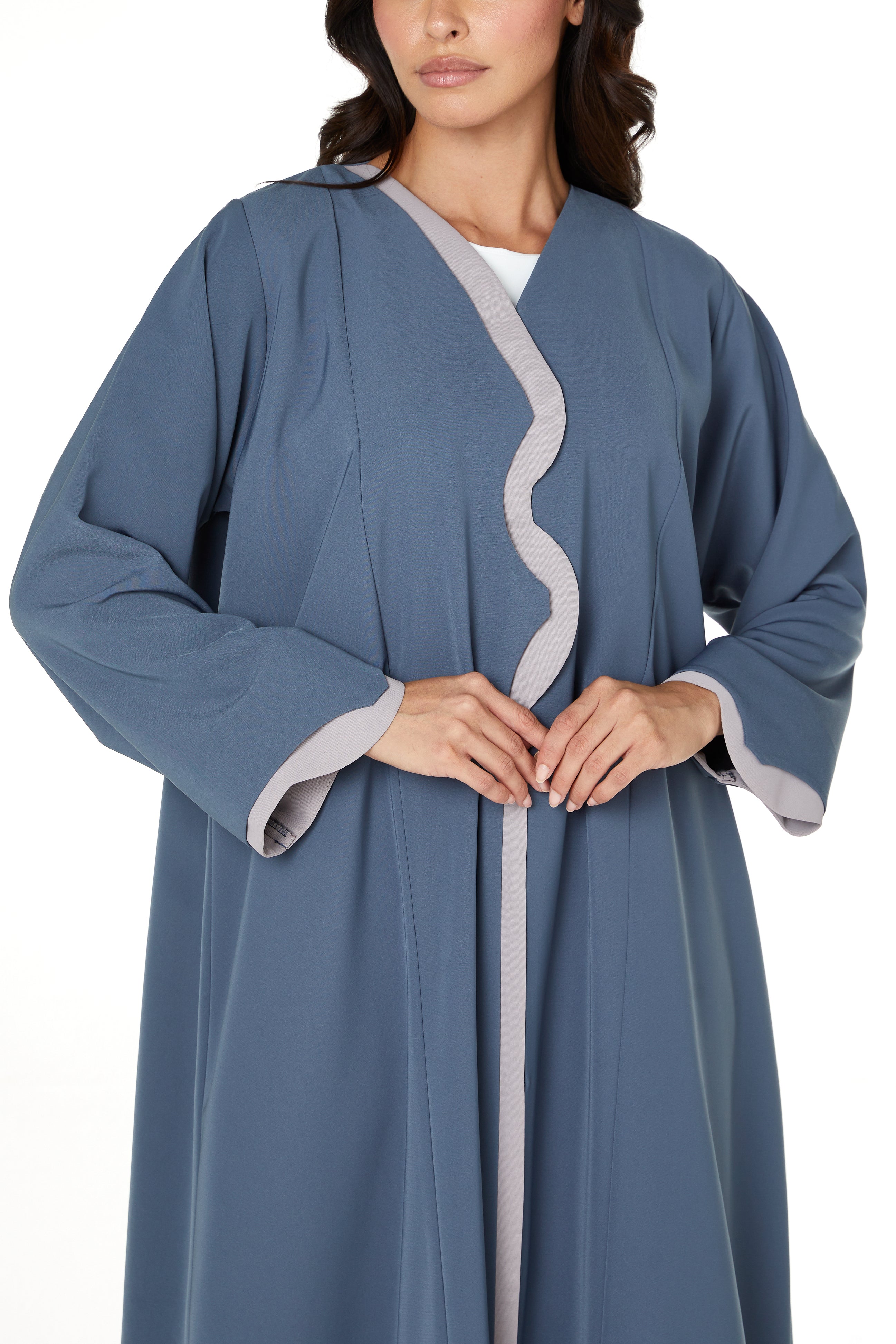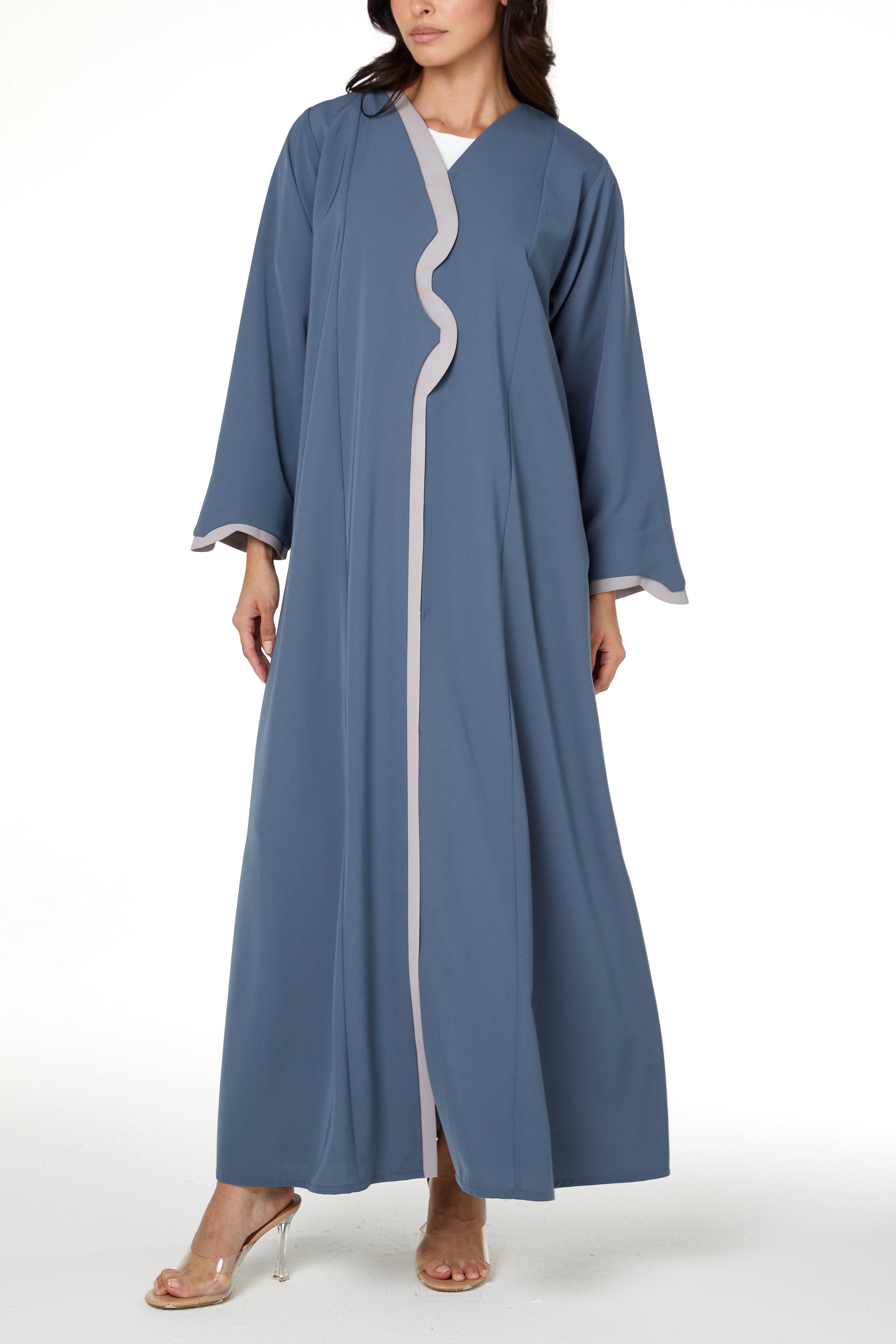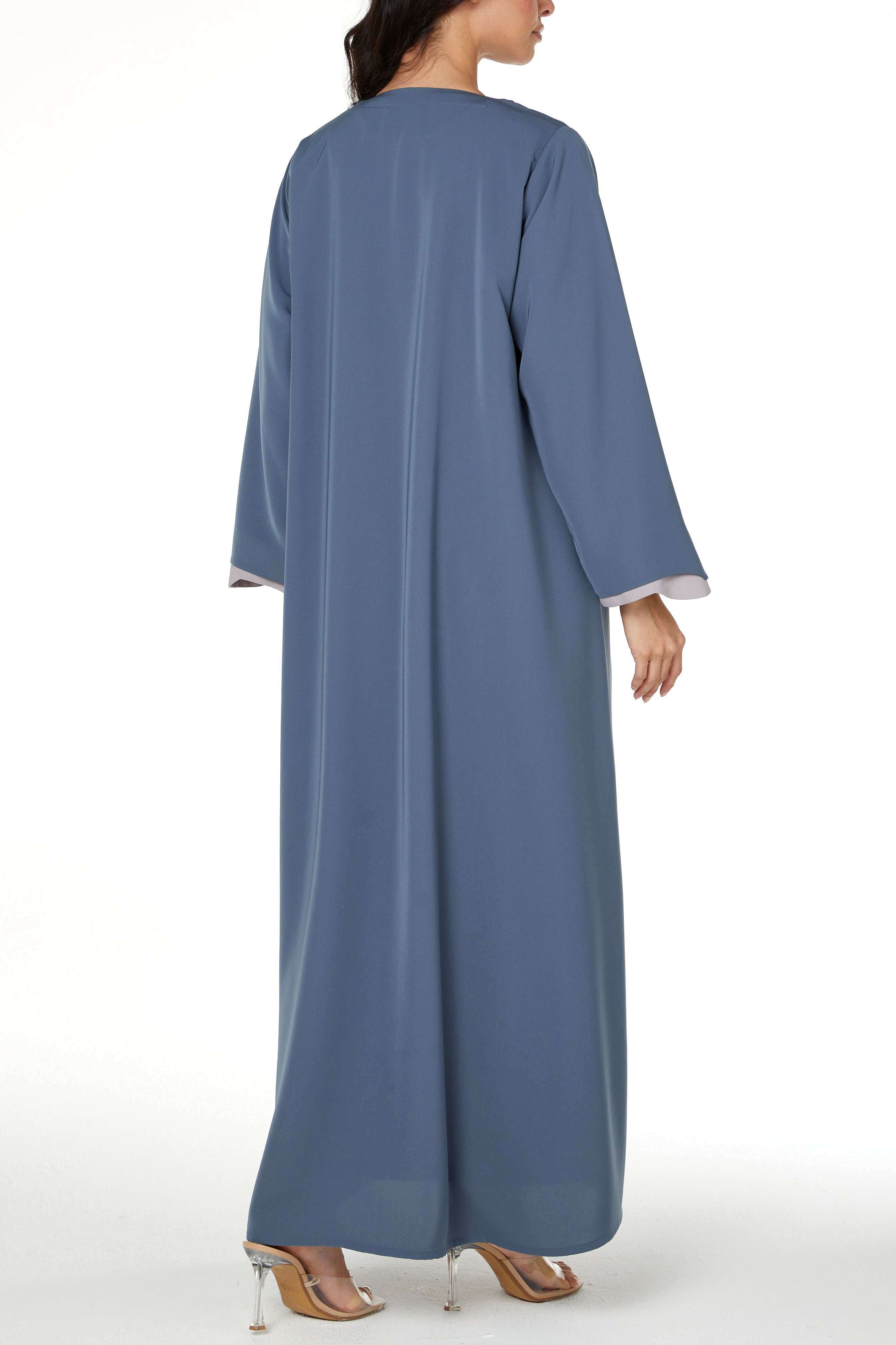 Lio Crepe gives this blue abaya a smooth surface with a neat and structured feel. The fabric is lightweight and comfortable, making it suitable for extended daily wear across seasons. The blue color adds a calm and polished look while remaining easy to style.